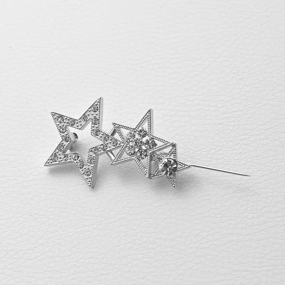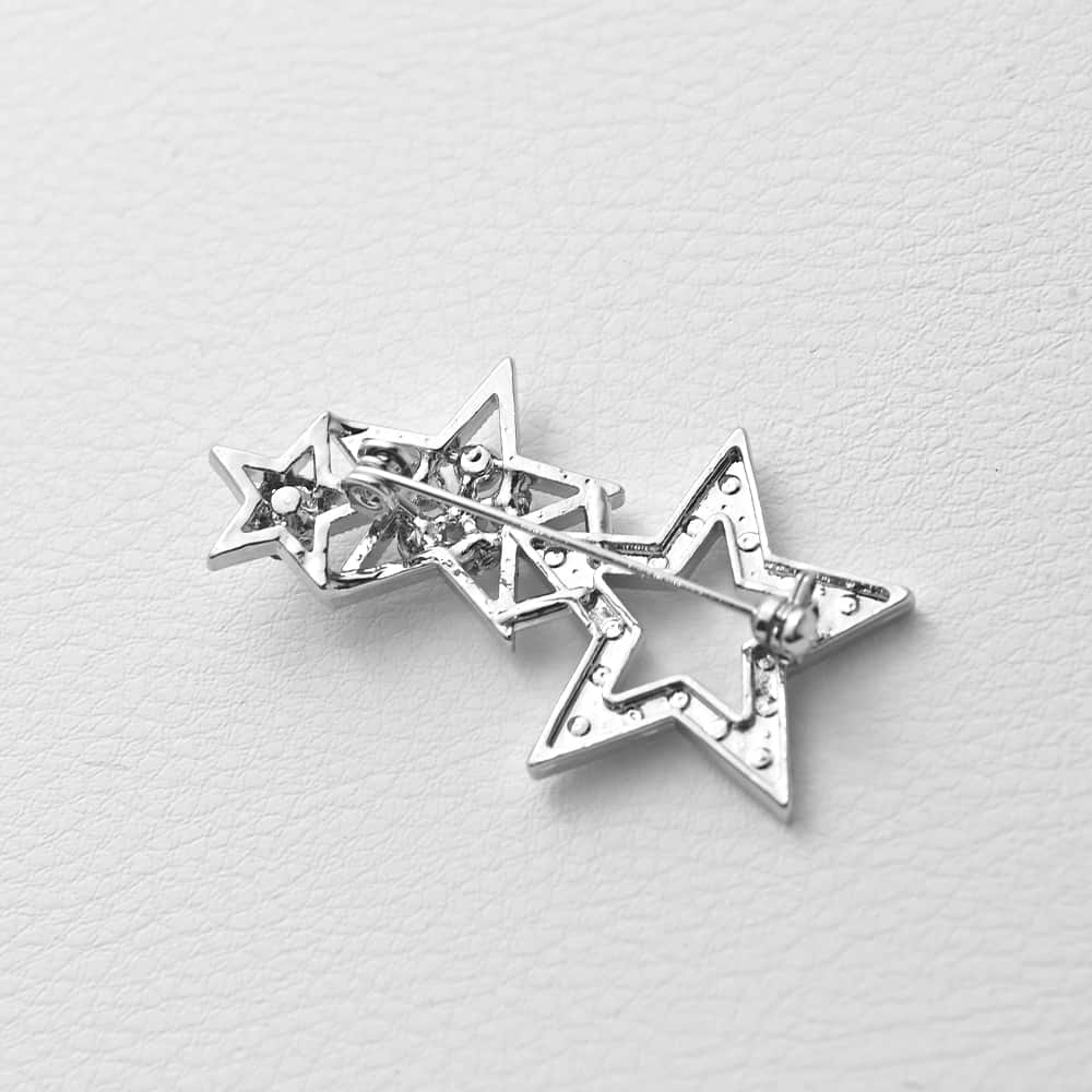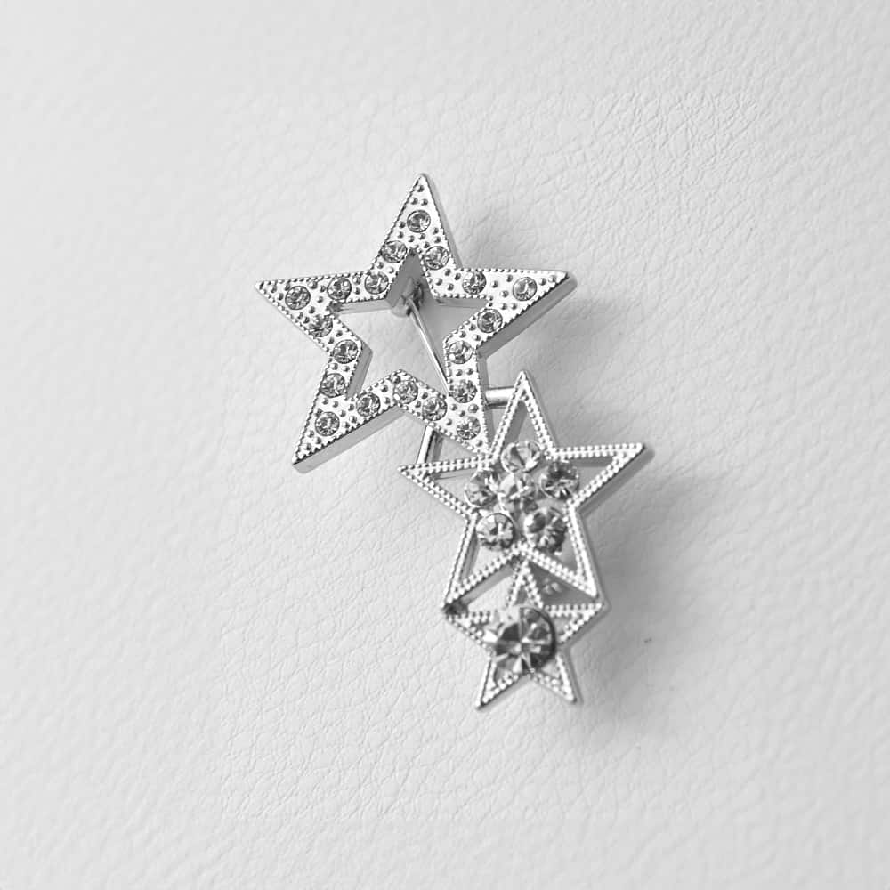 星だけどコドモっぽくならず、ストーンだけど古臭くならないその絶妙なさじ加減が素晴らしい、サラッと使える星型ブローチ◆11/13インスタライブご紹介商品◆アーカイブのご視聴はこちらから→【11/13ライブ】大きさの異なる星を並べた、透明ストーン入りのブローチ。それぞれの星はストーンの配置にも変化があり、さりげなく凝ったデザインになっています。キラキラ系のブローチは間違えると古臭い印象になりがちですが、星というカジュアルなモチーフや空間を利用した軽さの演出、変化を付けたストーン使いの総合効果で『これならオシャレ!』というデザインに。キレイめなコーデにもカジュアルな格好にも使える、絶妙なさじ加減が秀逸でとてもカワイイです。ブローチというとエレガントになってしまうデザインが多いなか、アソビの効いたカジュアルな印象を持つところがかなり珍しいタイプ。『マダムにならない今っぽさのあるブローチ』にこだわりご用意をした、当店お薦めのデザインになっています。【こちらのブローチは】ブローチの中では大きくも小さくもないタイプで、クセが無くサラッと使えるサイズ感。ニットなどのトップスにもさりげなく着けれてポイントにできる、使い勝手の良い大きさです。【SNS用ハッシュタグ】#236034threestarsブローチ(このハッシュタグでInstagramなどSNS内で検索をしますと、こちらをお持ちのお客様のご投稿があれば、簡単に見つけてご覧いただくことができます)