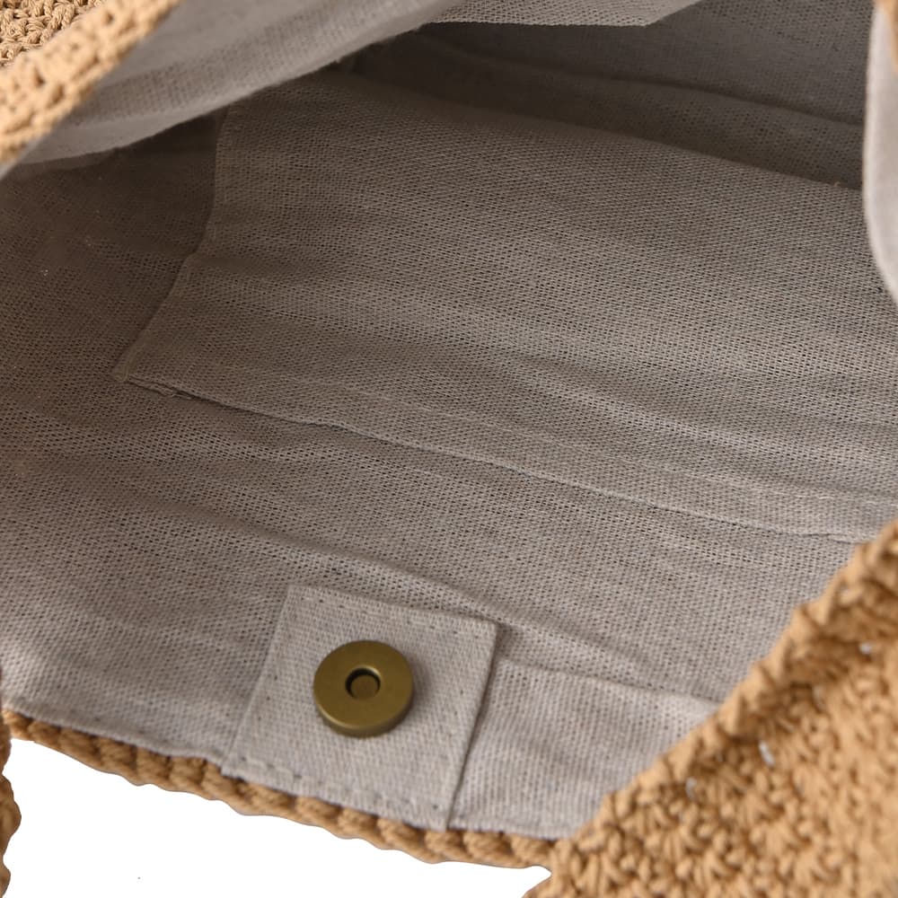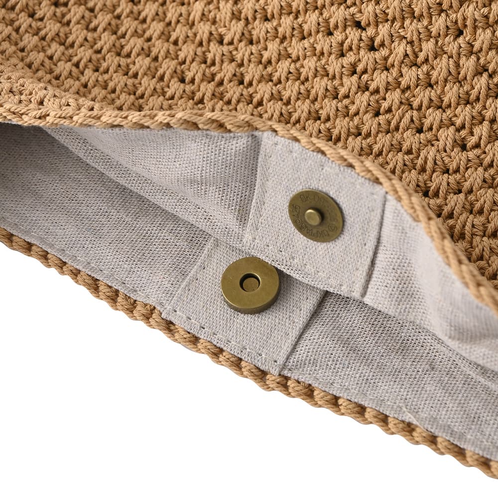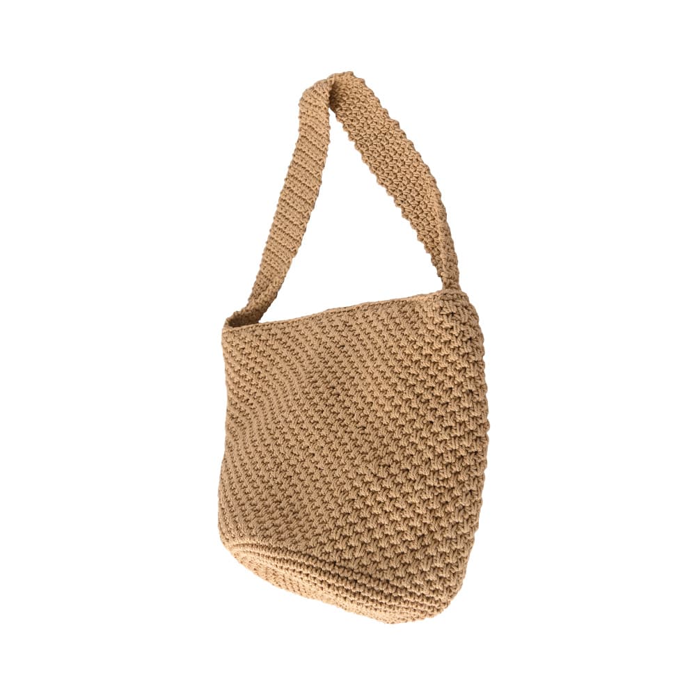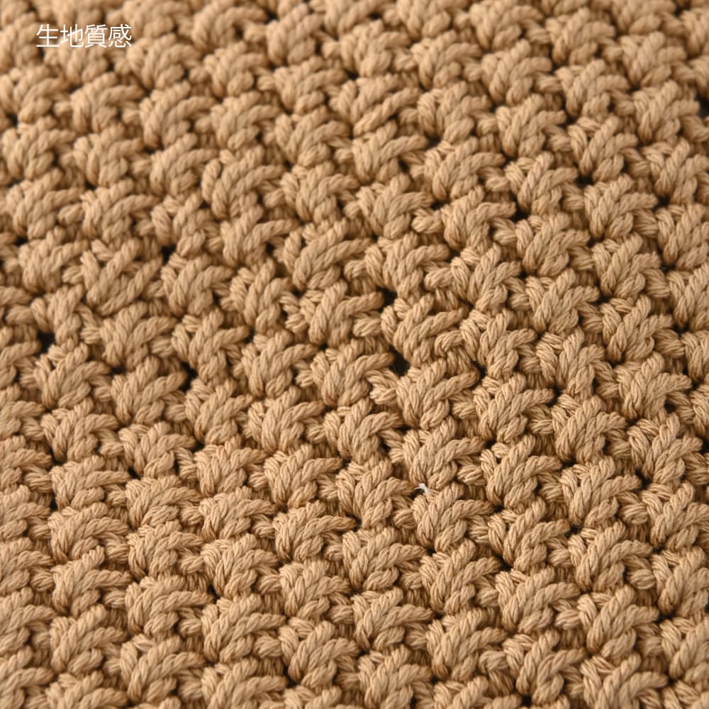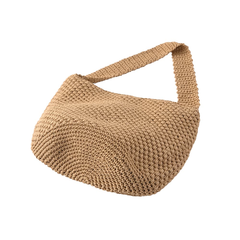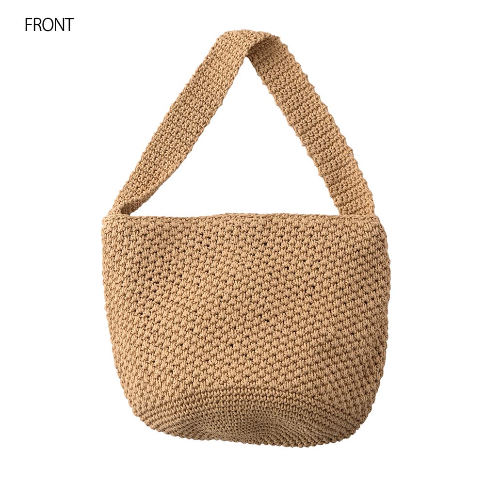 かごバッグとは違った魅力で夏にイイ小ぶりでも大ぶりでもないサイズ感けっこう入るコットン素材編みバッグ【このバッグの概要】かごバッグとは異なる夏っぽい質感がカワイイ、コットン素材の編みバッグ。小脇にちょうど良いサイズ感ながらも、丸底なのでけっこうな容量があります。コットンならではのしっかり感はありつつ、どこかクッタリとした形状なのがポイント。例えばかごバッグの場合はカジュアルな格好には合わないときがありますが、これはかなりラフなコーデにもマッチするヌケ感があります。かごバッグと比べての利点は、◆柔らかさがあるため、かごバッグのように保管時にかさばらない◆硬度&ささくれ的な素材の飛び出しがないので、肌の弱い方や小さなお子様がいる方にも優しい◆かごバッグよりもこなれたリラックス感が出せる◆肌にくいこまないので肩が痛くならない◆丸底(=鍋敷き程度の大きさ)なのでお弁当箱などの幅があるものをキレイに収納できるなどが挙げられます。【仕様や機能について】◆サイズ感:500mlペットボトルOK/A4サイズ×/長財布OK/たたんだデニムシャツを入れて持ち運べるくらいの、けっこうな収納力があります。◆重さ:350グラム程度のストレスにならない重さです。◆質感:太いコットン糸をギュッと詰めて編んだ形状。縄やモップの先端のようなサッパリとした肌触りです。◆生地の厚みや硬さ:よくある(こういう質感の)バスマットくらいです。◆収納:底を倒して、軽くたたんだ状態で収納・保管ができます。◆撥水機能:とくに撥水効果のある素材ではありません。◆内側:白無地/編みが粗めで、糊がきいた布巾(ふきん)みたいなハリ感のある生地張りです(※こちらには糊は付いていません)。◆開閉:間口上部にマグネットボタンがあります。◆マチ:構造的にはありませんが、丸底なのでその役割を果たす厚み(または奥行き)がある形状です。◆ポケット:内側に、ケースを外したiphone17proが入るくらいの大きさがあるポケットが1つあります。◆肩掛け:可能/ななめ掛けはできません。◆肩紐:しなやかで4.5cmの太さがあるため、重みが分散されて肩が痛くなりません。ここには裏生地がないので本体よりも薄く・柔らかさがあります。◆肩紐の長さ調節:不可/固定式です。◆その他:肩紐の長さが割と長く、袖幅の太い服でも肩掛けがしやすいです。長さ:64-65cm程度【その他の情報】◆お手入れ:日常的には水をしぼった布で拭くか、(自己責任にはなりますが)手洗いをしても良いと思います。コットンの場合は水を吸うと硬くなりますので、柔軟剤も使った方がベターです。◆お知らせ事項:手編み製品ですので、寸法や重さには多少のバラつきがあります。予めご理解をお願いいたします。【お色について】◆ココナッツ:ココナッツの表皮みたいなお色。ベージュよりも濃く、ブラウンまではいかない色味です。◆アイボリー:無染色のエコバッグのような、生成り色系の白っぽいナチュラルなお色です。【SNS用ハッシュタグ】#236256丸底コットンショルダーバッグ(このハッシュタグでInstagramなどSNS内で検索をしますと、こちらをお持ちのお客様のご投稿があれば、簡単に見つけてご覧いただくことができます)