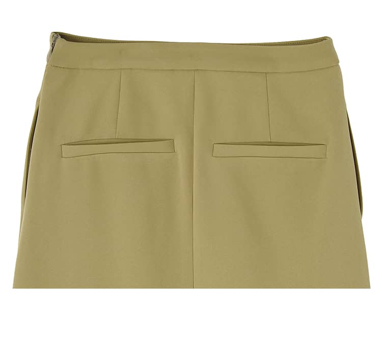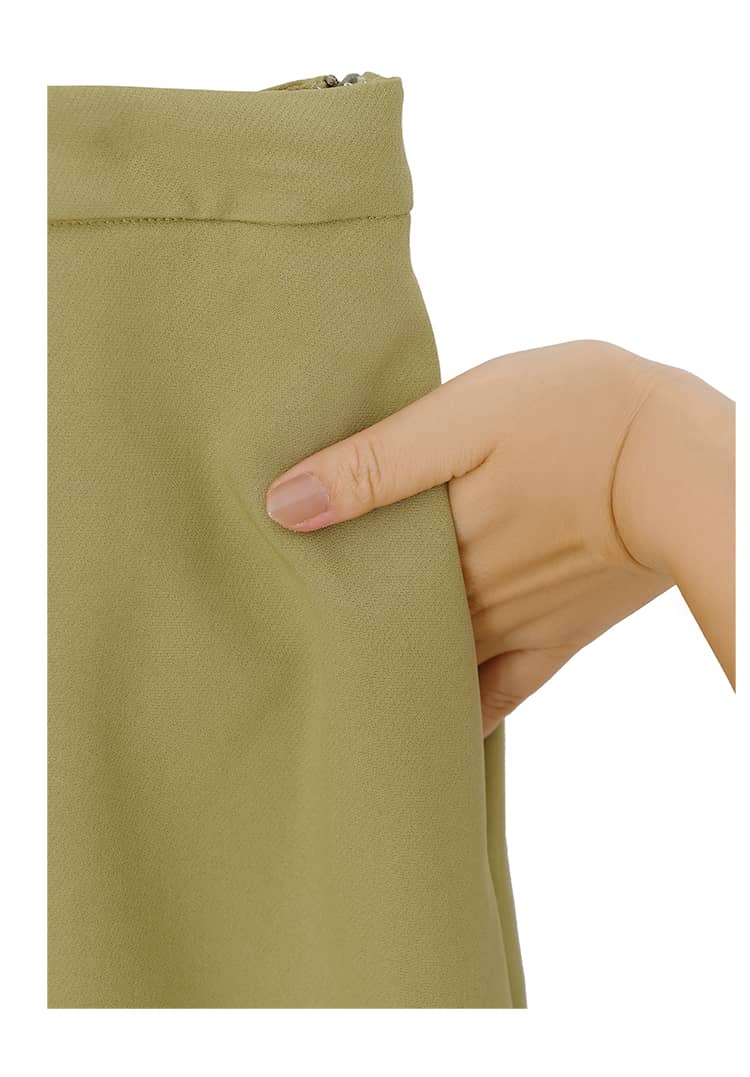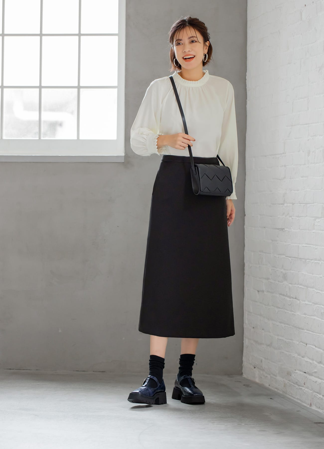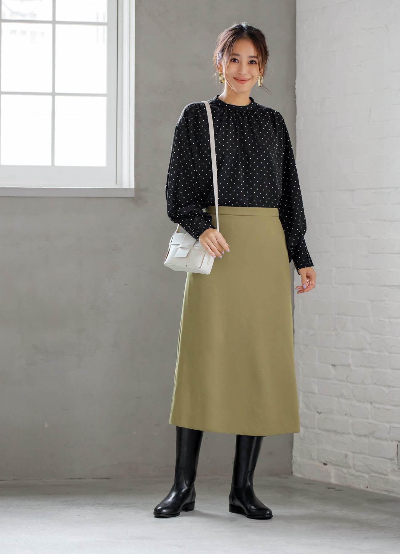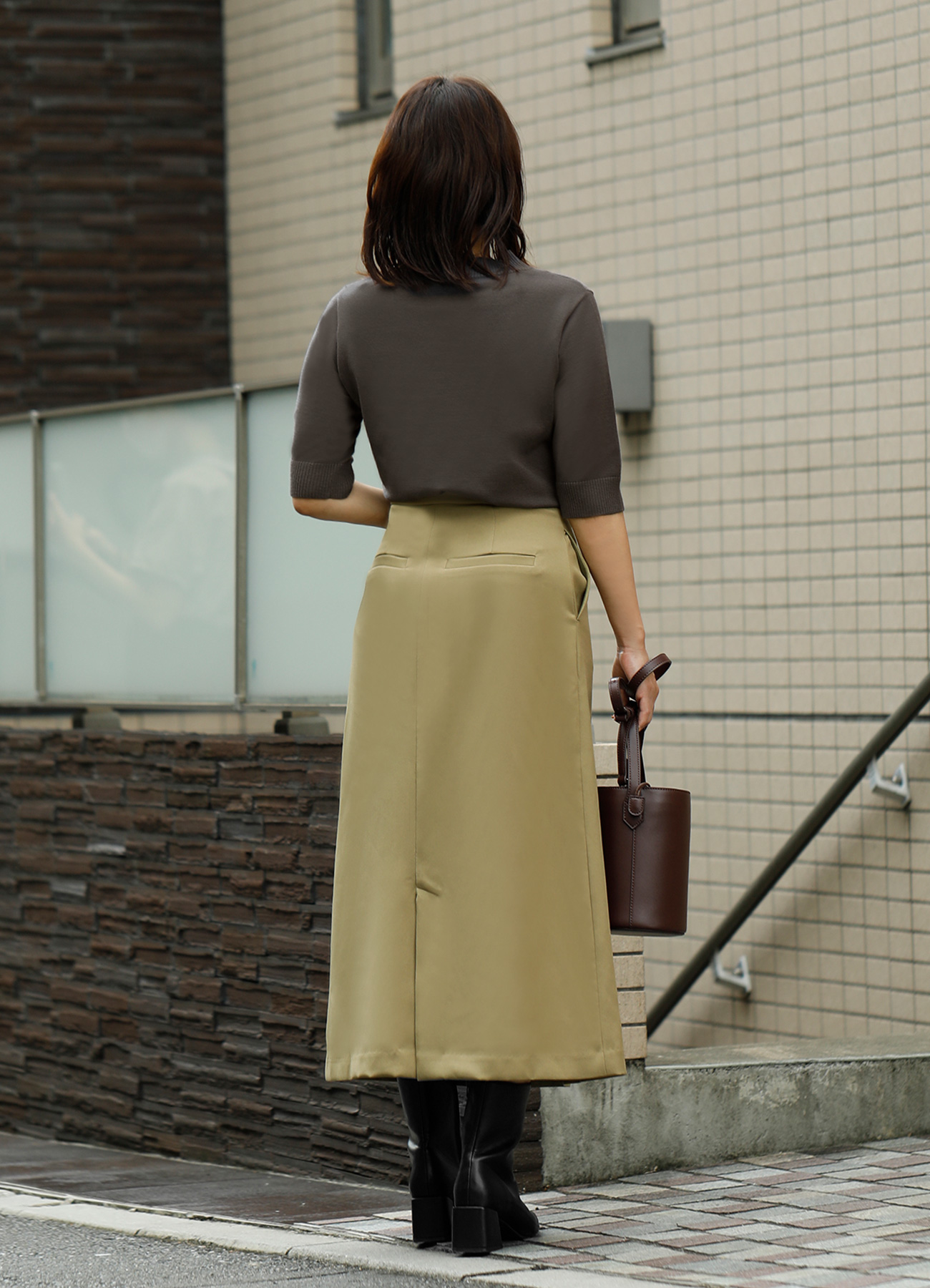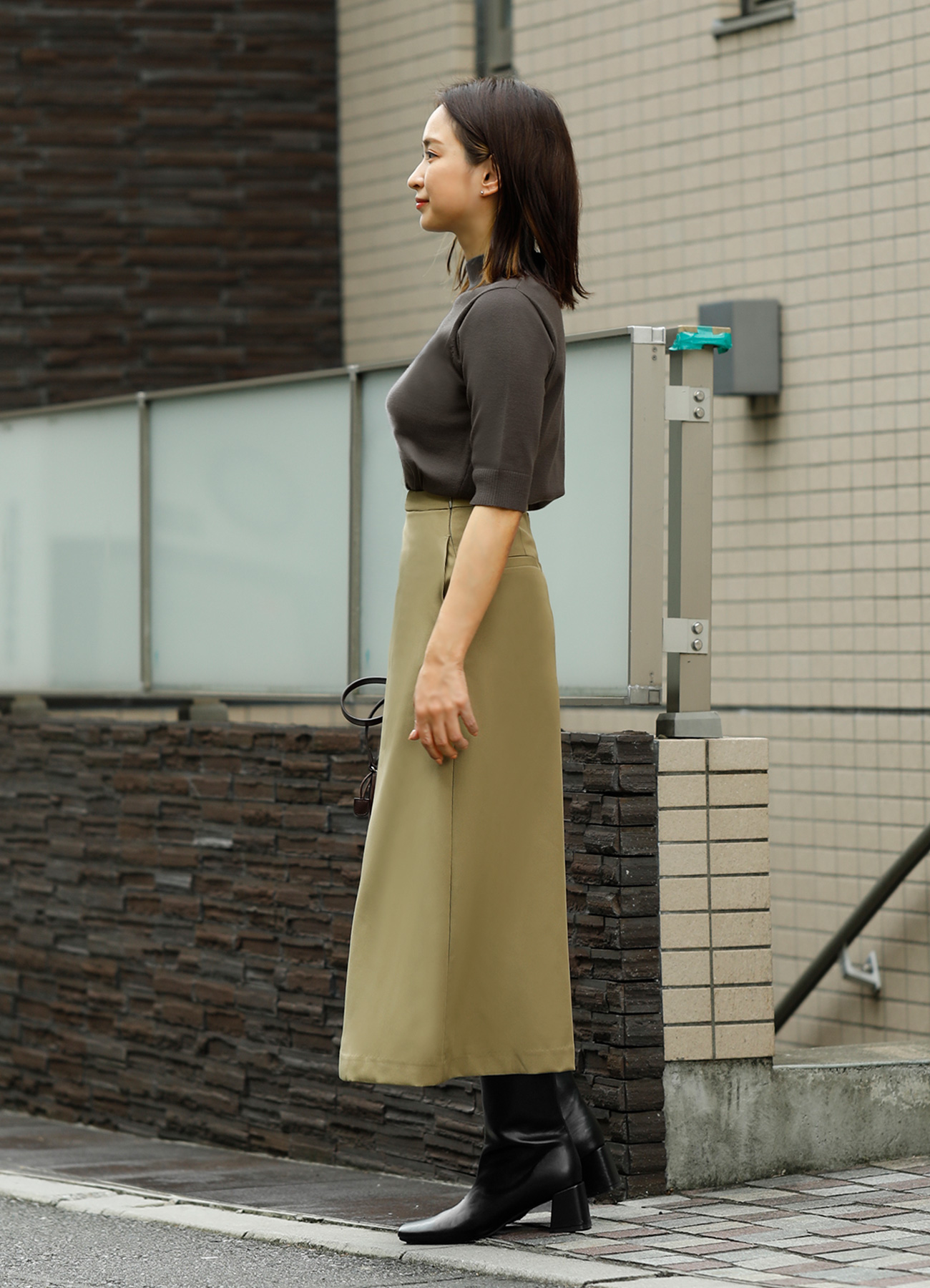裾イン不要でニットと相性◎ハンサムな表情のスッキリAラインスカート適度にハリ感のある生地がキレイなシルエットを作る、ミディ丈のAラインスカート。ペンシルとAラインの間に位置する控えめな広がり具合で、スッキリとしたフォルムが特徴です。ボリュームニットやオーバーシルエットなトップス・アウター・ベスト等と合わせて、裾インせずに好バランスが作れるようデザインしたスカート。もちろん普通シルエットのトップス類と合わせても素敵ですし、裾をインしてもキレイにキマります(その他ジャケット合わせなども◎)。こちらの場合は甘さを含まないシンプルな雰囲気になっており、オフィス系ファッションやきちんとしたシーンでもOKな上品さと端正な感じがポイント。半面、シンプルなのでスニーカーやメンズライクシューズと合わせたキレイめカジュアルにも使うことができ、振り幅の広いデザインとなっています。【サイズの展開について】こちらは流行りに関わりのないシンプルなデザインであることから、幅広い方にご着用いただけるようXSサイズもご用意しています。その為、普段は01サイズ・02サイズで展開をする身長別対応丈感も同じ品番に加えることが難しく、普段は01サイズに当たる短い方の丈感を、別品番で販売しております。◆着用モデルは166cmおよび170cmで、82cm丈タイプを着用しております。◆普通身長以下の方は76cmタイプを穿くと、大体モデル着用のようなバランスになります。Pサイズ(155cm以下)の方は、もう少し長い感じになりますが、まったくおかしいことなくご着用いただけます。―こちらは普段の02サイズに当たる、82cm丈タイプの販売ページです―【デザインや仕様について】◆控えめなAラインのスッキリ・シンプルスカート。◆季節感を問わず、流行りにも関わりなく長く使えるデザイン。◆ウエストにゴムがないスタイリッシュなヴィジュアル。◆両サイドにポケットあり。◆ヒップに飾りポケットあり。◆左サイドにファスナーあり。◆背面裾にベンツタイプのスリットあり。◆裏地あり◆手洗い可能【生地について】◆しっかりめの中肉厚ポリエステル素材で、適度なハリ感と落ち感で美しいシルエットが出せる生地です。◆とくにシワができやすいわけではありませんが、スーツにも使用することのある生地なので、あんな感じの自然なシワは若干できます(ただしスチーマーで伸ばしやすいです)。◆基本的にはキレイめな印象の生地ですが、スウェット等のカジュアルアイテム合わせにも馴染める、クセのない質感をしています。◆秋冬を中心に春を合わせて3シーズンで使えます(夏はお好みによりますので、ご自身の判断で暑くなければOkです)。◆伸縮性:あり(ウエストは構造上、そこまでの伸縮性はありません/少しだけあり)◆光沢感:僅かにあり◆透け感:なし【お色について】◆ブラック:通常の定番ブラックです。◆オリーブベージュ:主張を持たない程度に、ほんのりとオリーブ色がかったオシャレな色合いのベージュ。少しメンズライクな感じの発色が格好良く、スタイリッシュな印象です。【SNS用ハッシュタグ】#23416582cm丈ダブルクロスAラインスカート(このハッシュタグでInstagramなどSNS内で検索をしますと、こちらをお持ちのお客様のご投稿があれば、簡単に見つけてご覧いただくことができます)