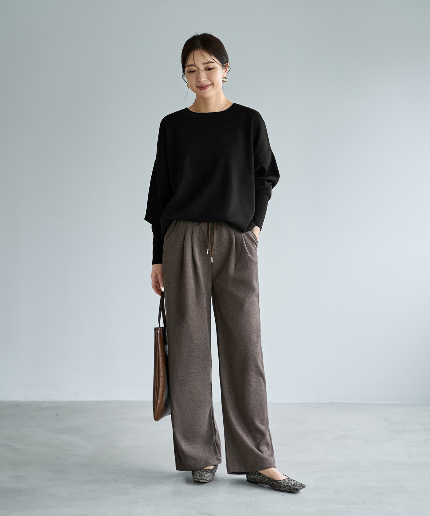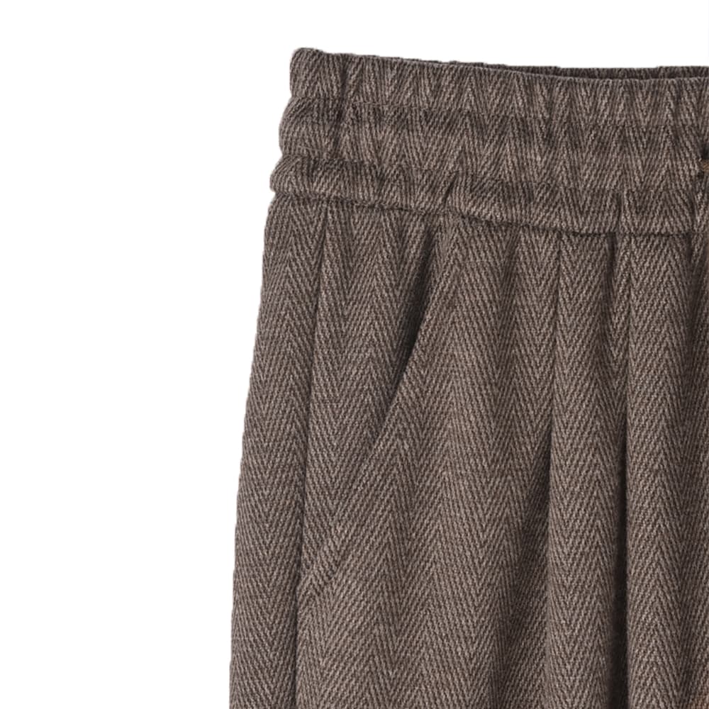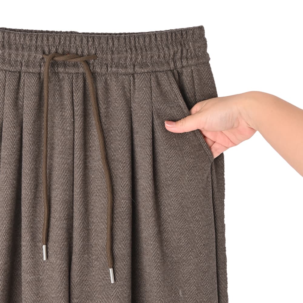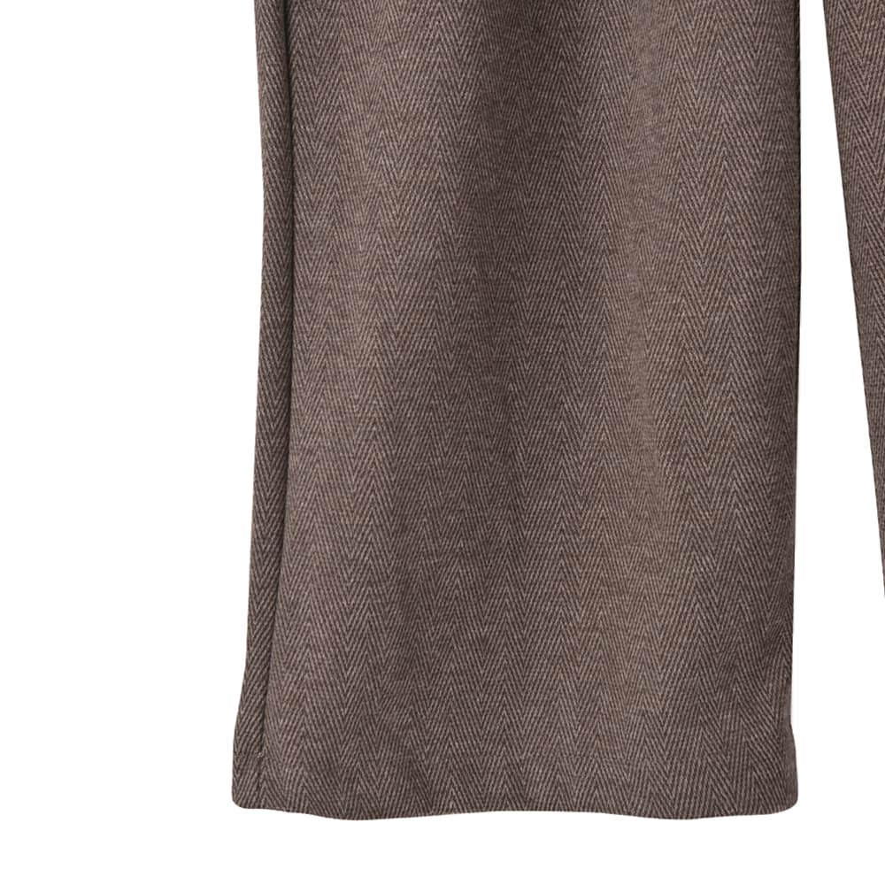 見た目はキレイめ、穿き心地はリラックス裏面がジャージータッチでチクチクしない、冬用暖か素材のオシャレ柄織りワイドパンツ◆11/13インスタライブご紹介商品◆アーカイブのご視聴はこちらから→【11/13ライブ】【この商品の特徴】◆ヘリンボーン柄の冬素材パンツ◆適度に厚手で暖かな穿き心地◆太過ぎないワイドストレート◆ウエスト全周ゴム仕様◆ひっくり返りがおきないゴム◆裏側がジャージー生地タッチ◆チクチクしないスムースな肌触り◆手洗い可能でアイロン不要【さらにプラス情報】◆裏側:裏側はジャージー生地系の質感。そのためタイツを穿いても滑りが良く、生地が噛みません。さらにチクチクしない肌触りの良さも備えています。◆腹部タック:腹部に余裕を持たせる2タック入り。上部は縫い留めなのでお腹がポッコリしていてもタックが開いてしまうことがなく、腹部を強調しません。◆アイロン:基本的には不要ですが、かければさらにキレイな見た目になります。スチーマーもお薦めです。◆毛羽立ち:とくにおきやすそうな感じはしませんが、初めて採用する生地なので未知数ではあります。着用頻度や摩擦具合、お手入れの仕方などによりできることもあるかもしれませんが、おそらくそんなに気にならないかな、と思います(もしもできた場合は毛玉取りクリーナー等でご対処ください)。【その他の仕様などの情報】◆着用時期:11-3月中旬頃が目安◆サイズ感:ゆとりのあるサイズ感(Lサイズ体型にも対応)◆丈感:一般的なフルレングス◆シルエット:太過ぎないワイドなストレート◆ウエスト:全周ゴム仕様◆締め具合調節:ウエスト紐あり◆ベルトループ:なし◆厚み:厚手◆柔らかさ:柔らかさとハリ感が共存◆肌触り:サラッとしつつ温かみのある感じ◆着用ジワ:できにくい◆伸縮性:あり◆光沢感:なし◆透け感:なし◆スリット:なし◆ボタンやファスナー:なし(下から穿き上げタイプ)◆ポケット:両サイドにあり◆裏地:なし◆手洗い:可能◆裾上げ:お直しに出していただけます◆アイロン:不要◆スチーマー:使用OK【お色について】◆チャコール:深みのあるグレー系ダークカラー。黒に近いチャコールグレーの糸とライトグレーの糸が混ざっています。◆ブラウン:赤味の少ないセピア系ブラウン。ダークなブラウンと白っぽい感じの明るい糸が混ざっています。◆ライトベージュ:ダークなベージュとエクリュ色っぽい糸が混ざっています。オートミール色のような印象になる、明るい発色の軽いベージュです。目立つ赤味やイエロー味はありません。【SNS用ハッシュタグ】#236006あったかヘリンボーンリラックスパンツ(このハッシュタグでInstagramなどSNS内で検索をしますと、こちらをお持ちのお客様のご投稿があれば、簡単に見つけてご覧いただくことができます)