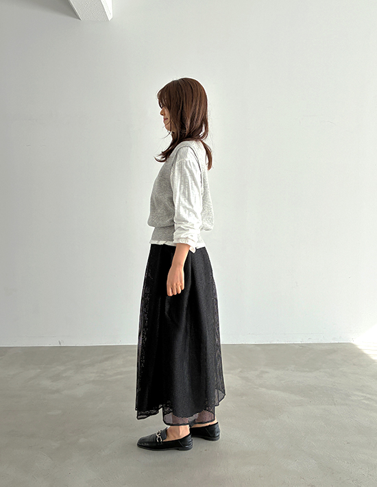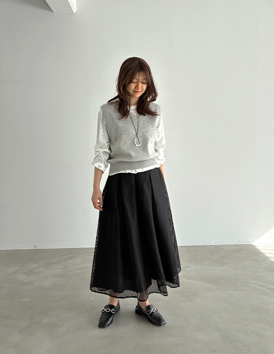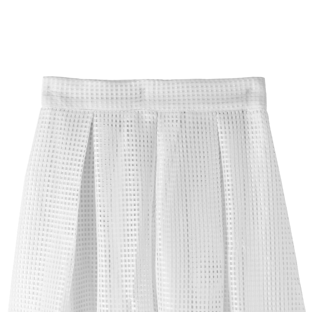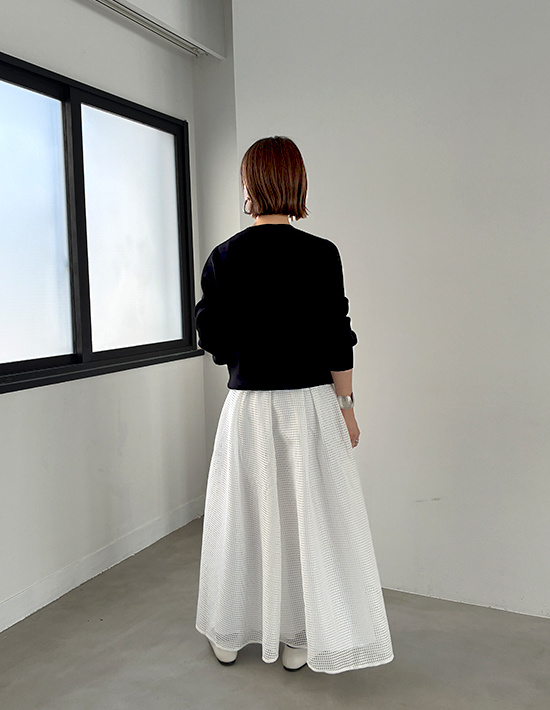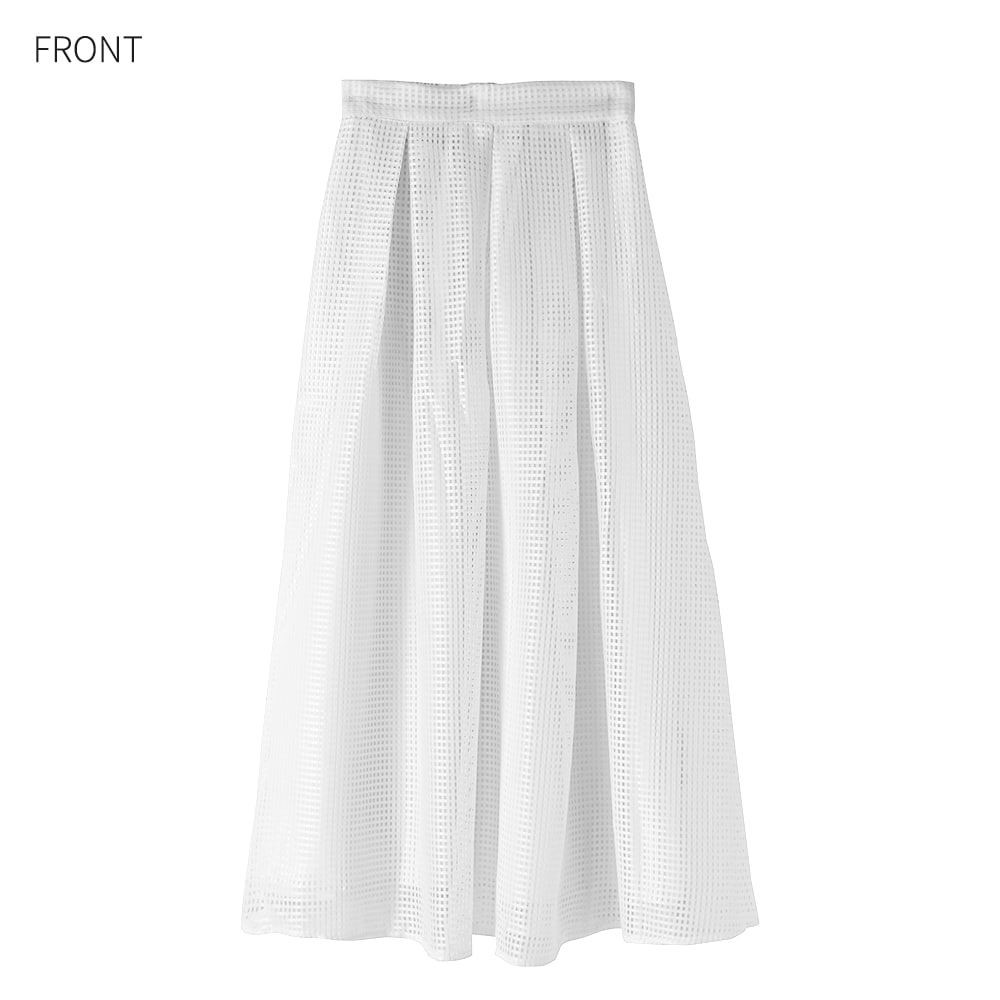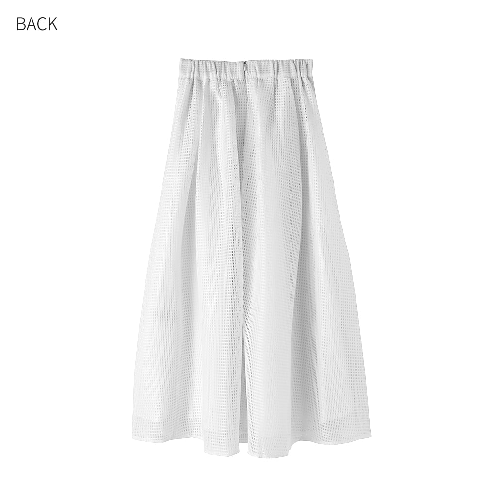 軽やかな素材感が楽しめる、メッシュ状生地を重ねたフレアスカート。メッシュとはいってもスポーツ系や網のような素材ではなく、レース用リボンを格子状に重ねたようなメッシュなので、大人らしさやキレイめ感を持つところが特徴です。