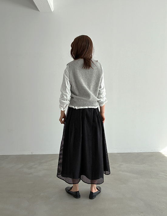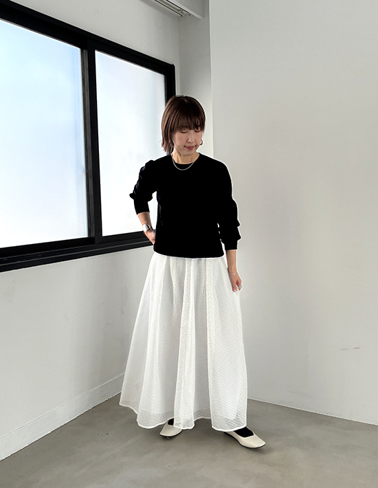 ◆シアー素材が軽やかで春夏の季節感が楽しめる質感。裏地を裾近くまで入れているため、脚はきちんと隠すことができます。