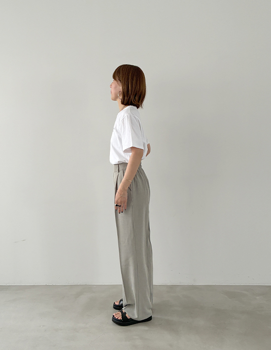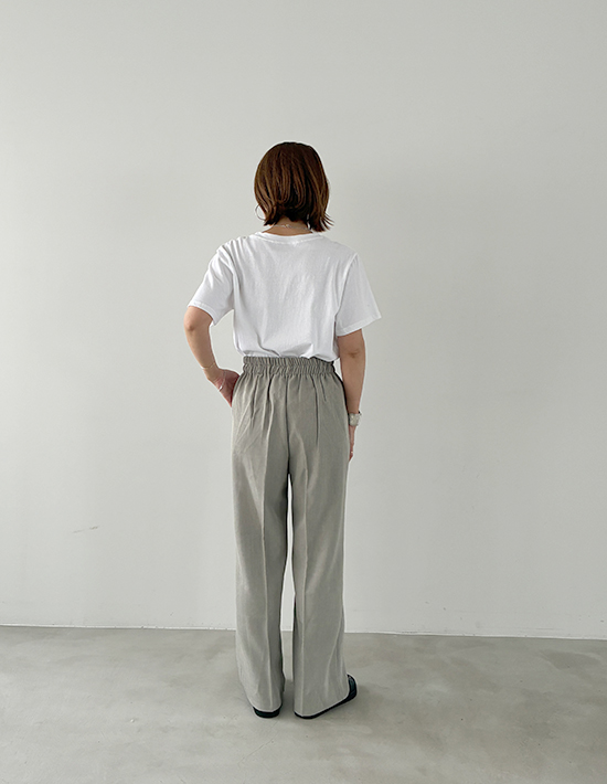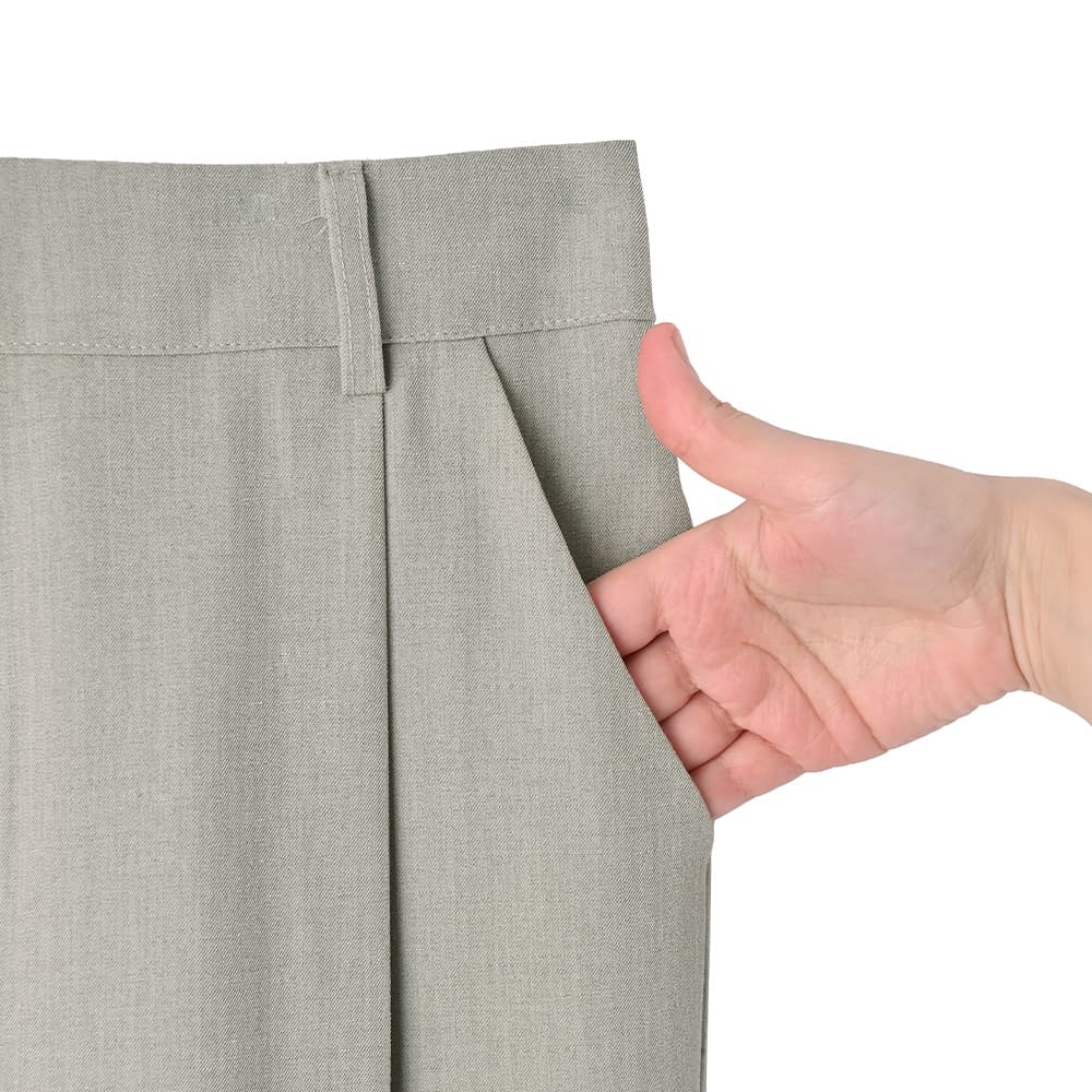 【便利な2レングス展開+Lサイズもあり】薄手なシャリ感キレイめストレッチ素材細くないけどワイドほど太くもない、涼しい穿き心地の夏用ストレートパンツ【このパンツの特徴】◆細くはないけどワイドでもないパンツ◆テーパードと異なるストレート型◆程よくゆったりした形◆夏に良い薄手の涼しい生地◆汗をかいてもサラッとした肌触り◆キレイめ感のあるベーシック◆カジュアルコーデにも使える◆2レングスから選べるシリーズ◆飽きのこない普遍的なデザイン◆ウエスト背面ゴム仕様◆手洗い可能/アイロン不要※68cm=股下のレングスです。【このパンツの詳細】ゆとりはありつつワイドパンツみたいには太くない、絶妙なシルエットのストレートパンツ。テーパードよりはゆったりとしており、テーパードが裾すぼまりなフォルムなのに対して『裾までストレート(=同じ太さ)』なのが特徴です。この感じは欲しくても探すのがなかなか大変なので、好きな生地感のものがあったときに抑えておくのが得策。ワイドパンツはイマイチ似合わないけれど、細いパンツも嫌、という方にもお薦めです。※体型によってはワイドを穿くよりも、あまり太過ぎないものを穿いた方がスッキリとしてスタイルが良く見える場合があります。それを自覚し当てはまる方の為にご用意しました。◆生地:薄手でキレイめな夏用生地。シャリ感がある素材なので薄くてもハリ感があり、肉感を拾わない安心感があります。サラッと爽やかな穿き心地で、肌離れの良さも◎ ストレッチもきいており、夏の通勤から普段着まで幅広く活躍します。◆丈感:普通身長(160-162cm)でくるぶしが隠れる長さです。同じデザインで丈違いの股下73cmタイプの場合は、裾がちょうど床に着く長さです。身長が低い場合にどの程度の身長までなら丈詰めナシで穿けるかは、(なるべく生地ジャンルが近しい)普段ご着用のパンツの股下丈と比べてご判断ください。※こちらは股下68cm丈です。◆サイズ感:FREEサイズはS-Mサイズの方に対応。それでは小さい方のために、Lサイズもご用意しています。どちらのサイズが良いかは、サイズ採寸表を元にお手持ちのストレッチ入りパンツと比べてご検討ください。とくに小さい・大きいなどのクセは無く、一般的なサイズ感。ゆったりと穿いてもおかしいパンツではなく、ベルトループもありますので、大きいサイズをお選びになるのも良いと思います。◆ヒップ:こちらはボタンなどが無く、下から穿き上げるタイプのパンツになります。FREEサイズは目安としてヒップが95cmを超えると上げるのが大変になります。Lサイズはヒップ98cm程度が穿き上げ上限の目安です。【さらにプラス情報】◆季節感:夏用の涼しいパンツですが、見た目としてはとくに季節を限定しないため、ご自身が体感温度的に許容できればいつでもご使用いただけます。◆センターライン:正しく手洗いをしていただければ消えてしまうことはあまり無いと思います。消えてしまった場合はクリーニング屋さんで『このタックから繋げてセンターラインを入れてください』と言えば入れてもらえます。◆膝伸び:カットソーとは異なり、おきにくい方です。長時間のしゃがみ姿勢を続けるなど、生地に過剰な負担をかけなければおきることは無いと思います。◆シワ:多少はできますが、気になるほどはできません。もしも気になる場合は部分的にスチーマーをかけるか、霧吹きをかけてよく湿らせ→手指でシワを撫で伸ばして→ハンガーに掛けておけばOKです。アイロンは不要ですが、かければ相応にピシッとキレイな表情にはなります。【その他の仕様などの情報】◆着用時期:4-10月頃が目安◆サイズ感:上記参照◆ウエスト:背面ゴム◆ウエスト調節機能:なし◆ベルトループ:あり◆厚み:薄手◆柔らかさ:柔らかさとハリ感が共存◆肌触り:サラサラとしてシャリ感があり、肌離れが良い感じ◆着用ジワ:多少はできるが気にならない程度◆毛羽立ち:できにくい◆伸縮性:あり◆光沢感:サンドは無し/ブラックは微々たる光沢あり◆透け感:なし◆ポケット:フロント左右にあり◆スリット:なし◆タック:あり(1タック)◆ボタンやファスナー:なし(下から穿き上げタイプ)◆裏地:なし◆手洗い:可能◆アイロン:不要◆スチーマー:使用OK【お色について】◆ブラック:定番的な通常のブラックです。◆サンド:グレーの中に少量のベージュを混ぜたお色。グレージュとの違いはグレー寄りな(グレーの分量が多い)ところです。普通のグレーより印象が軽く、柔らかな女性らしさが出るのがポイント。ニュアンスカラー的な要素があり主張がないため、いろいろな色とマッチする合わせやすいカラーです。【SNS用ハッシュタグ】#236250サラッと涼感ストレートタックパンツ68cm(このハッシュタグでInstagramなどSNS内で検索をしますと、こちらをお持ちのお客様のご投稿があれば、簡単に見つけてご覧いただくことができます)