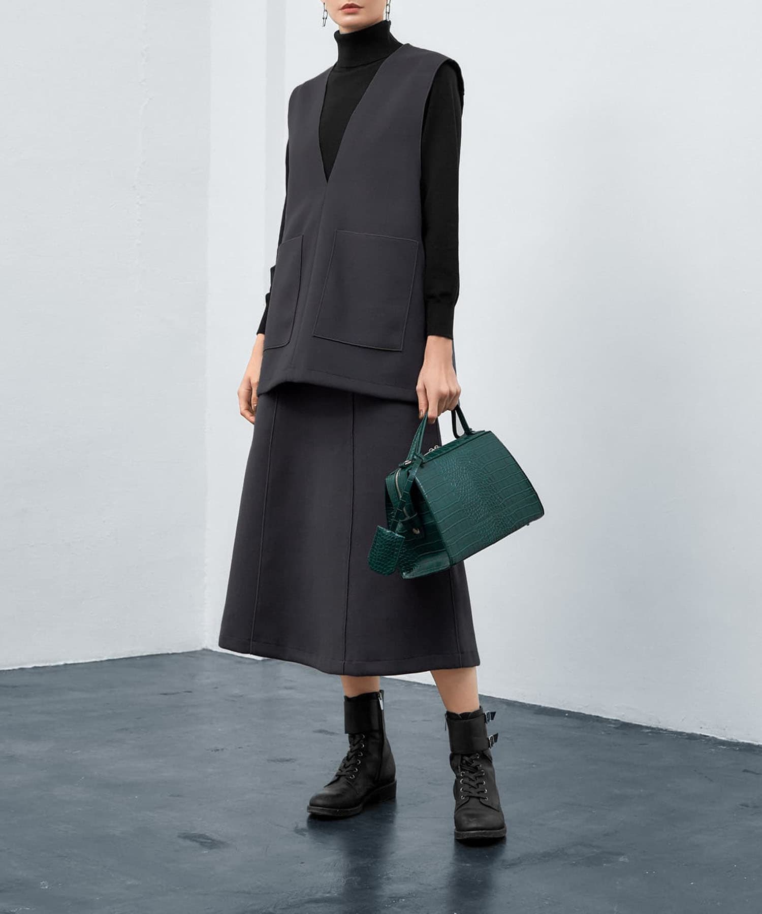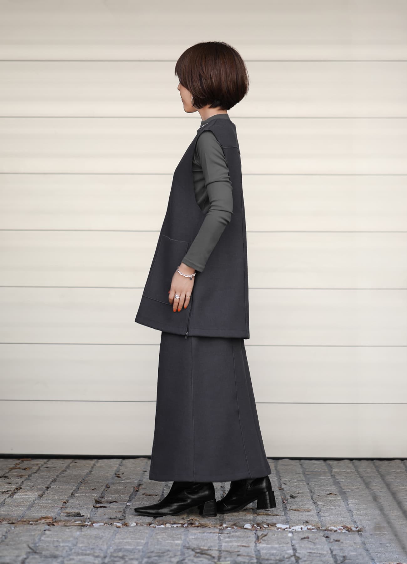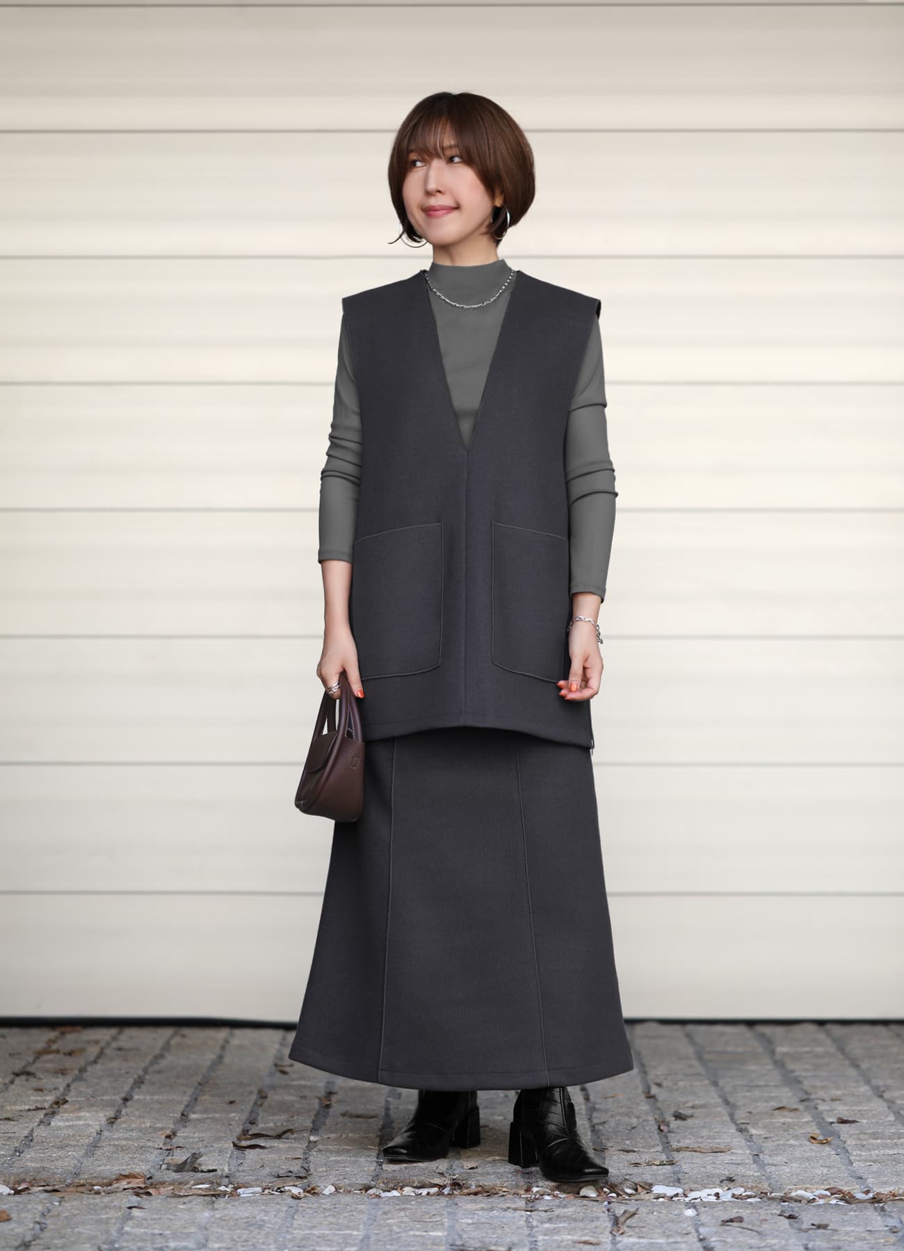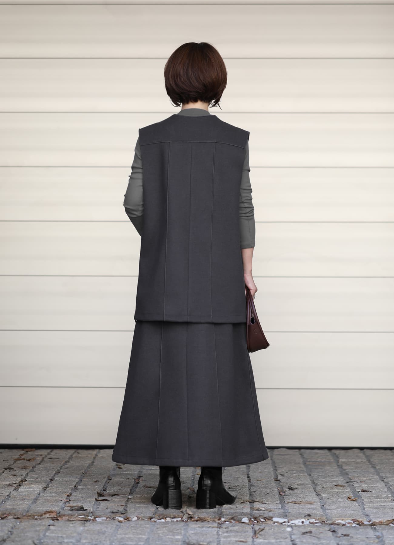 暖かくて、合わせやすい。しっかり生地で肉感カバーも叶う、品の良い台形ラインスカート。圧縮ウール風の暖かみがある素材感が素敵な、台形スカート。縦ラインの強調効果を巧みに使った、スタイリッシュなデザインのスカートです。シンプル系のデザインで、ベスト、ニット、シャツ、ブラウスといった幅広いトップスと好相性。雰囲気も作りやすく、キレイめな上品コーデにも、ちょっとモードなクール系にも使えます。ウエストがきちんとあるデザインなのでトップスの裾インは格好良くキマりますが、ニットで上からパフッと覆ってしまっても可愛くキマるデザインに仕上げています。※こちらは再公開商品になります。過去のインスタライブ紹介は2023年10/11および10/12のアーカイブ動画でご覧いただけます。【デザインや仕様について】◆季節感のあるウォーミィーな生地で作ったロング丈の台形スカート。◆とても暖かな穿き心地。◆適度にゆとりのあるサイズ感。◆ふくらはぎは隠れ、足首上が見える丈感が基準。◆ゴムを入れずにスッキリと仕上げたスタイリッシュなウエストデザイン。◆生地の切り替えやピンタック風の線飾り加工で、縦ライン強調効果をプラスした痩せ見え仕様。◆両サイドポケットあり◆背面にファスナーあり◆裏地:あり◆手洗い:可能【素材について】アウターのような圧縮ウール風の生地なのに、お素材はポリエステルなので手洗いが可能な嬉しいタイプ。シワや毛羽立ちはおきにくく、暖かさもあるし見た目もオシャレ…という、美味しいところどりな生地です。◆厚み:厚ぼったくはありませんが、良い感じに厚みがあり、しっかりとしています。◆ハリ感:強くあり/キレイな形をしっかりとキープできます。◆着用可能シーズン:現在―3月いっぱい程度◆伸縮性:あり◆光沢感、透け感:なし【お色について】◆ライトベージュ:ほんのりと桜色がかった薄いピンクベージュ。イエロー系のベージュではなく、ピンク系のベージュです。◆チャコールグレー:ダークグレーよりも一段深いグレー。僅かに赤味を持つ特殊なグレーで、(メンズ感がなく)女性らしくてオシャレな印象です。【SNS用ハッシュタグ】#234557メルトン調aラインスカート(このハッシュタグでInstagramなどSNS内で検索をしますと、こちらをお持ちのお客様のご投稿があれば、簡単に見つけてご覧いただくことができます)