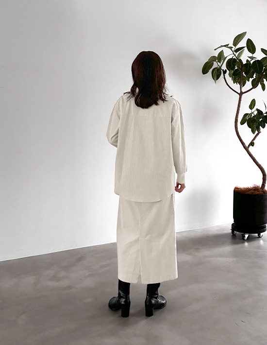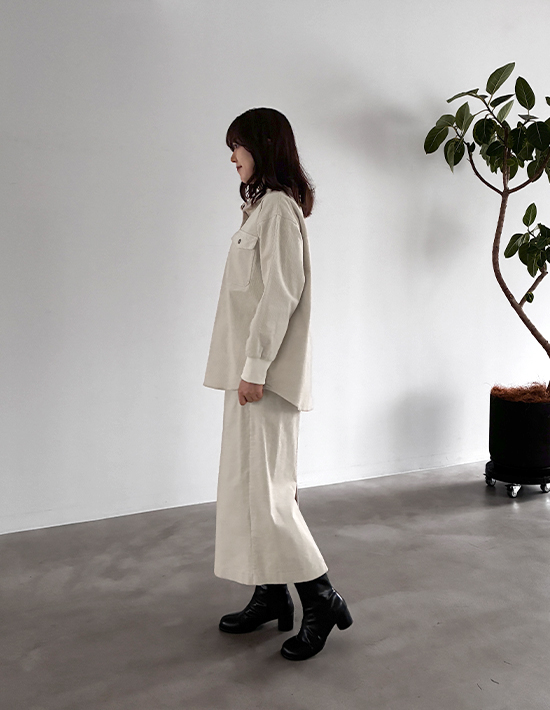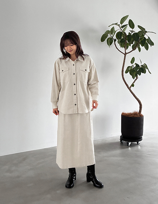 季節感のある素材ってやっぱりオシャレです今っぽい雰囲気のセットアップも作れる、ゆったりフォルムの暖かいIラインスカート◆11/27インスタライブご紹介商品◆【この商品の特徴】ハリ感のあるコーデュロイ生地で作った、ストレートフォルムのロングスカート。身長に応じて丈感は変わりますが、どのような丈感で着ても可愛く、腰に落として長く穿いたり、ウエストを内側に折って短く穿いたりといった調節が自在に可能です。暖かな穿き心地で真冬も頼もしく、ブーツやタイツ、スニーカーとの相性も◎ しっかりとしていて肉感を拾わず、ゆったりとしたフォルムで体型カバーも叶います。※こちらのスカートは、同じ生地で仕立てたシャツ型ジャケット合わせると素敵なセットアップになります。→商品番号236041【セットアップ対応】コーデュロイシャツジャケット【さらにプラス情報】◆裏地はありませんが、しっかりとしているため一枚でキレイに穿くことができます。タイツの着用などで生地の滑りが足りなかったり・引っ掛かりが気になる場合は、お好みでペチコートやペチパンツをプラスするのも良いと思います。◆エクリュの透け感については、生地にそこそこの厚みがあるので気になりませんが、念のため黒などの響きやすいお色は避けるのが良いと思います。【その他の仕様などの情報】◆着用時期:11-3月頃が目安◆サイズ感:ゆったりとしたサイズ感(Lサイズ体型にも対応)◆シルエット:ゆったりとしたストレート◆ウエスト:全周の4分の3がゴム◆ベルトループ:なし◆厚み:厚手寄り◆柔らかさ:柔らかさよりはハリ感が目立つ◆肌触り:内側はサラッとしてハリのあるコットン質感/外側は温かみのあるコーデュロイ質感◆着用ジワ:できにくい◆毛羽立ち:できにくい◆伸縮性:あり◆光沢感:なし◆透け感:なし◆スリット:背面の裾中央にあり(31cm程度)◆ボタンやファスナー:なし(下から穿き上げタイプ)◆ポケット:両サイドにあり◆裏地:なし(しっかりとしているため安心感があります)◆手洗い:可能◆アイロン:不要◆スチーマー:使用OK◆備考:もしもシワが気になる場合は、霧吹きをかけてよく湿らせ→手指で軽くシワを伸ばして→ハンガーに掛けておけばOKです。【お色について】◆エクリュ:ほんのりとクリーム系の色味を持つ、温かみのある白系カラー。顔色が明るく見えて幅広い色と合いやすく、インナーやボトムスの色合わせが簡単という利点があります。今人気のニュアンスホワイト系ワントーンコーデが作れるお色です。◆ジェイド:翡翠(ひすい)をイメージしたニュアンスのあるグリーン。少しカーキっぽさもありつつ、カーキとはまた異なるお色。感じない程度に微量の青味が入っており、明るさと深みのどちらも存在している絶妙な明度がオシャレです。◆ブルー:発色の中に少しグレイッシュな落ち着き感がある、ニュアンスカラー系の特殊なブルー。こちらも明るさと深みが両立されており、明るくもないけど暗くもない、という(良い意味で)曖昧な立ち位置の明度になっていてオシャレな雰囲気があります。【SNS用ハッシュタグ】#236042セットアップ対応コーデュロイストレートスカート(このハッシュタグでInstagramなどSNS内で検索をしますと、こちらをお持ちのお客様のご投稿があれば、簡単に見つけてご覧いただくことができます)