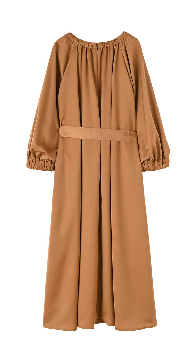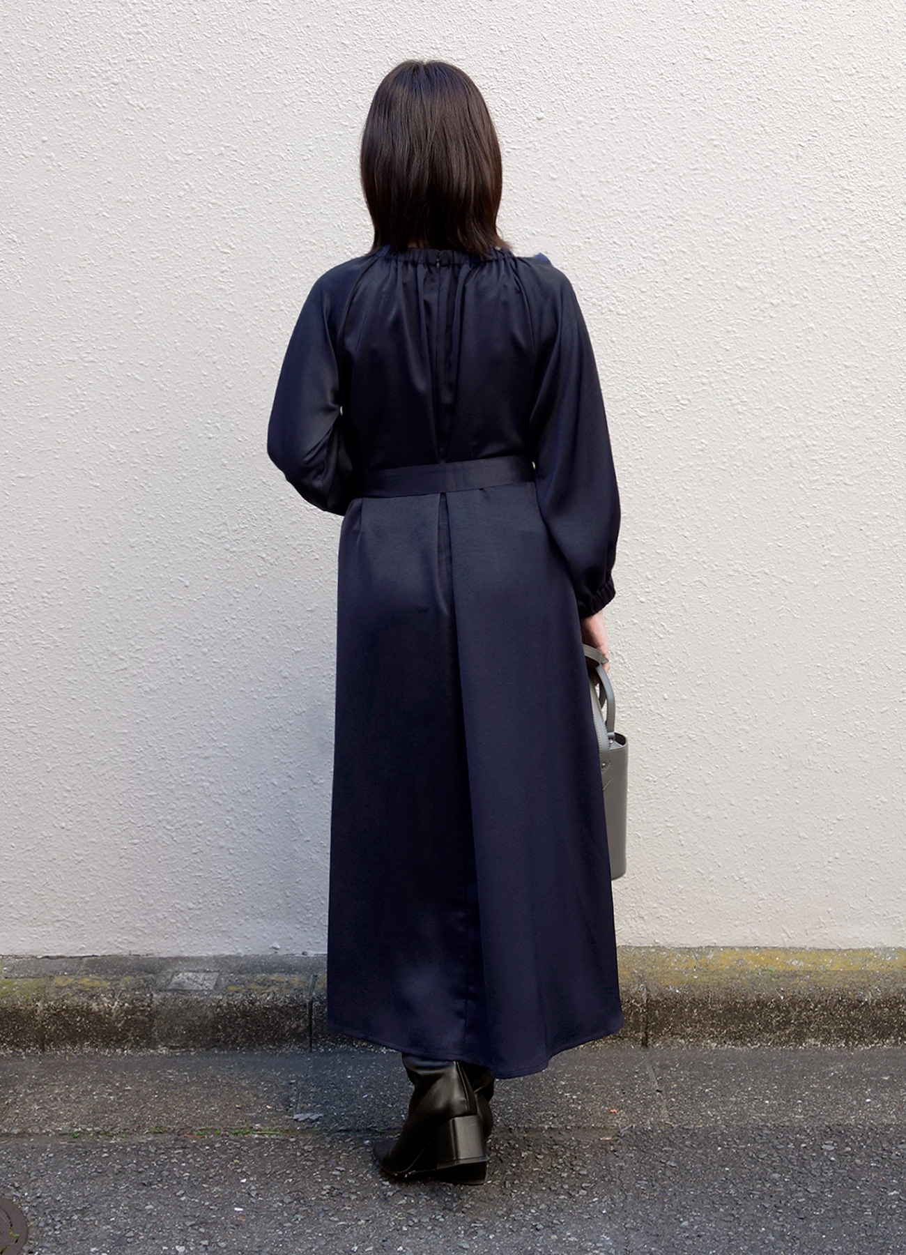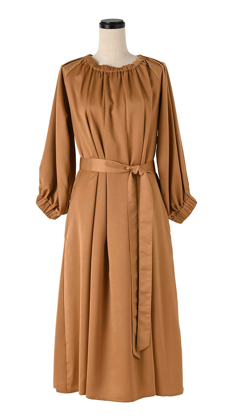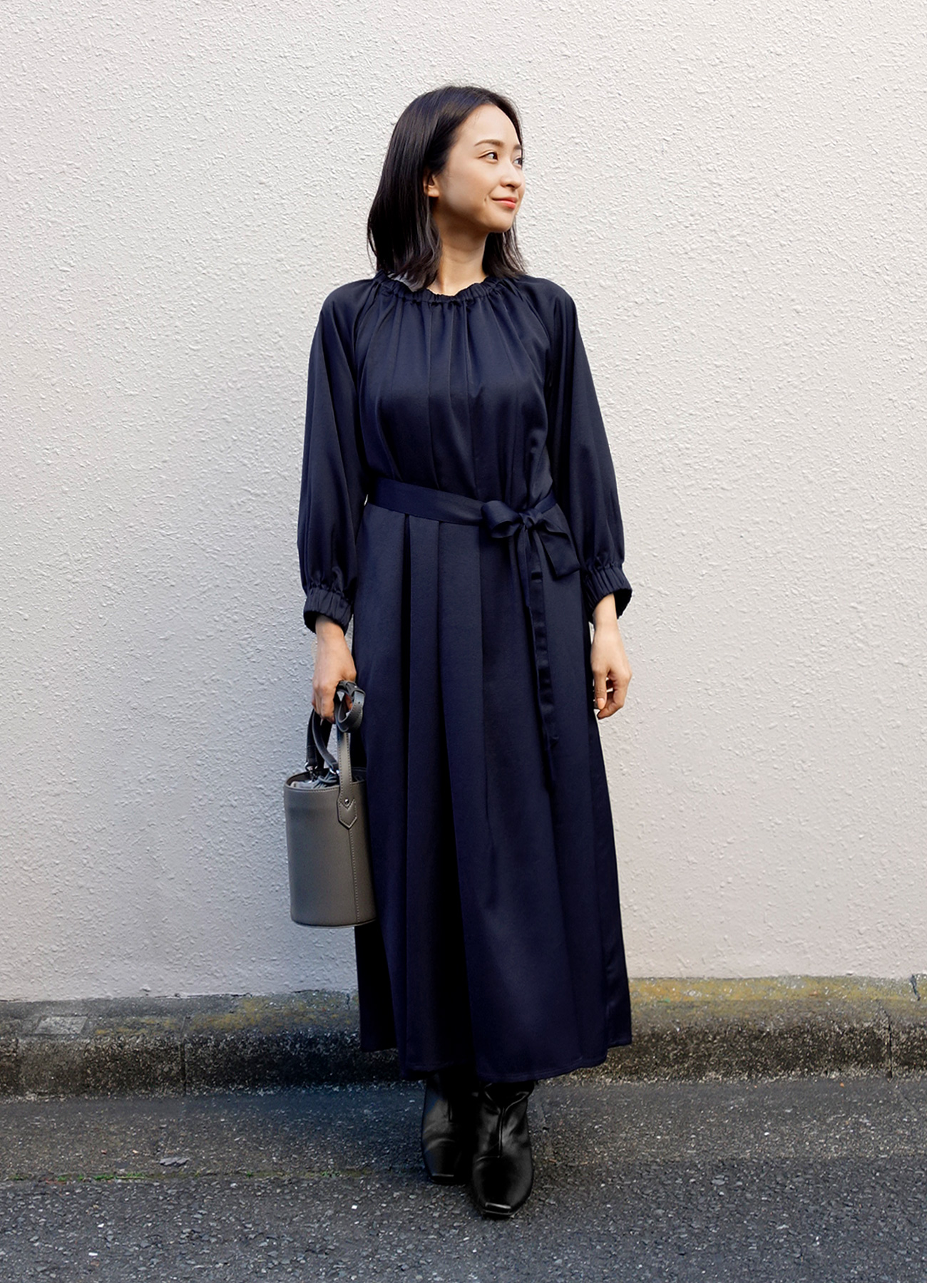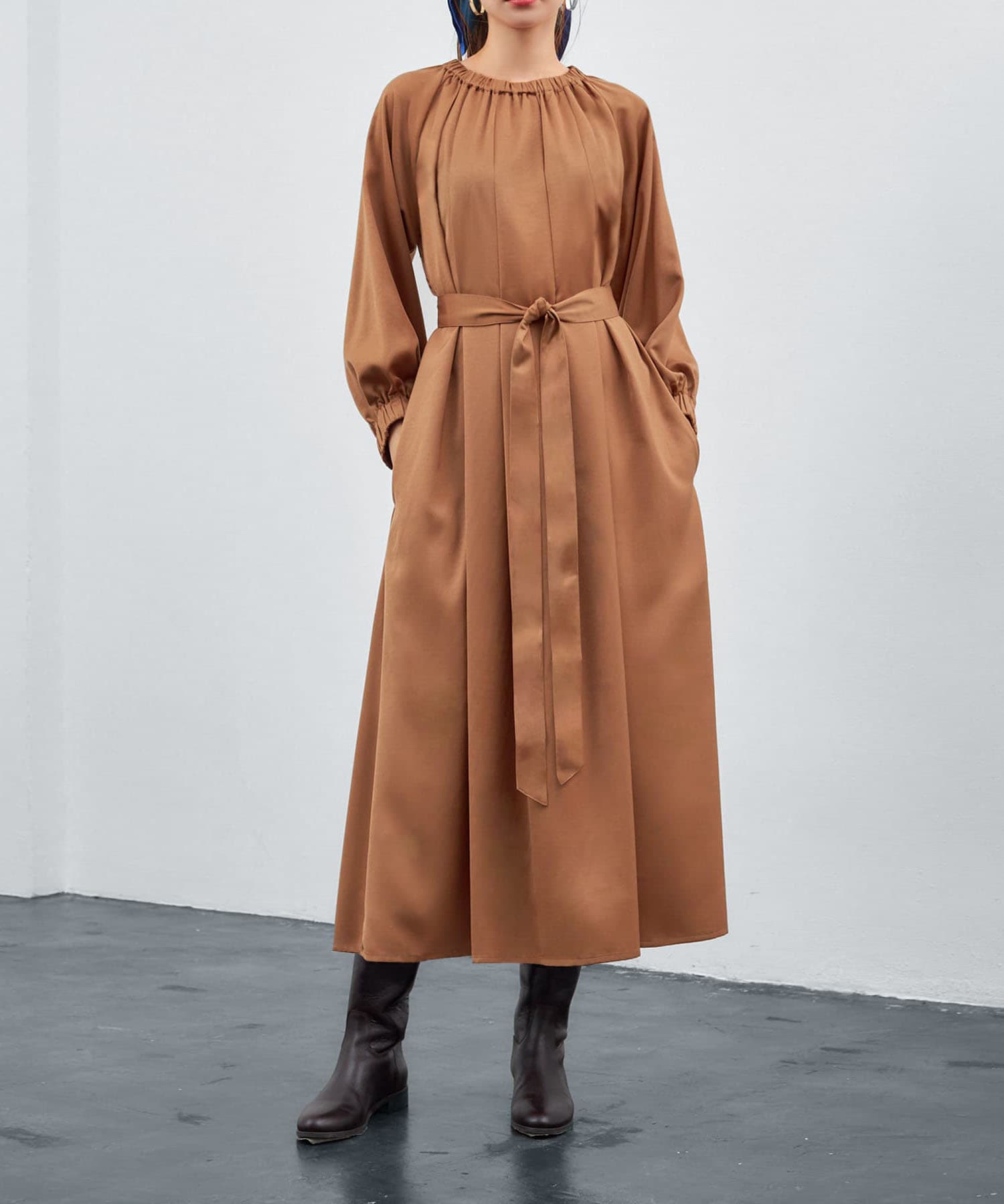 控えめな光沢が日常に使いやすい。高級感のある美ドレープワンピース。【商品の特徴】◆人気の控えめ光沢サテンを使用したワンピース◆共生地のリボンベルト付き◆冬の使用に耐えるしっかりとした生地感◆通常のギャザー&ドレープとは違い、生地をバスト下まで縫い留めることで不要な広がりをストップ。◆ギャザー服の難点である、ボリュームの出過ぎによる膨張やネグリジェ見えを回避。◆たっぷりと使用した生地が生む、美しいドレープ◆サテンの薄いイメージを良い意味で裏切る厚み感。心地良い重みを持ち、高級感のある表情◆透け感/なし◆光沢感/あり◆手洗い可能【お知らせ事項】背面に使用してるコンシールファスナーは、華奢でデザイン性を壊さない良さを持つ反面、生地の切り替え部分(この服ならゴムギャザー部分)で必ずファスナーが『噛む』という特徴がございます。上げるときは一気に上げようとせず、静かに力を込めながら、ゆっくりと上げるようにしてください。生地を片手で抑えながら、ファスナーの持ち手を進行方向に倒すようにして上げるのがコツです。