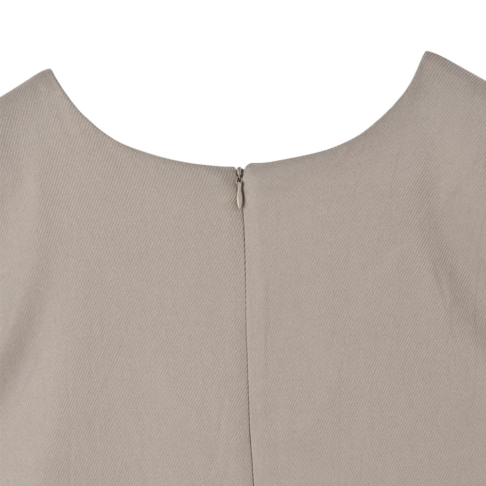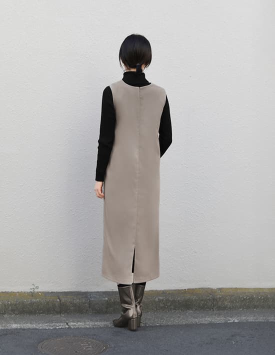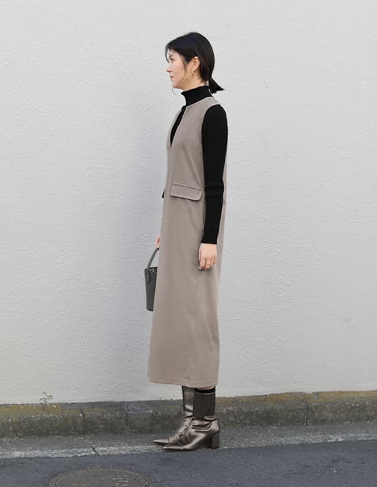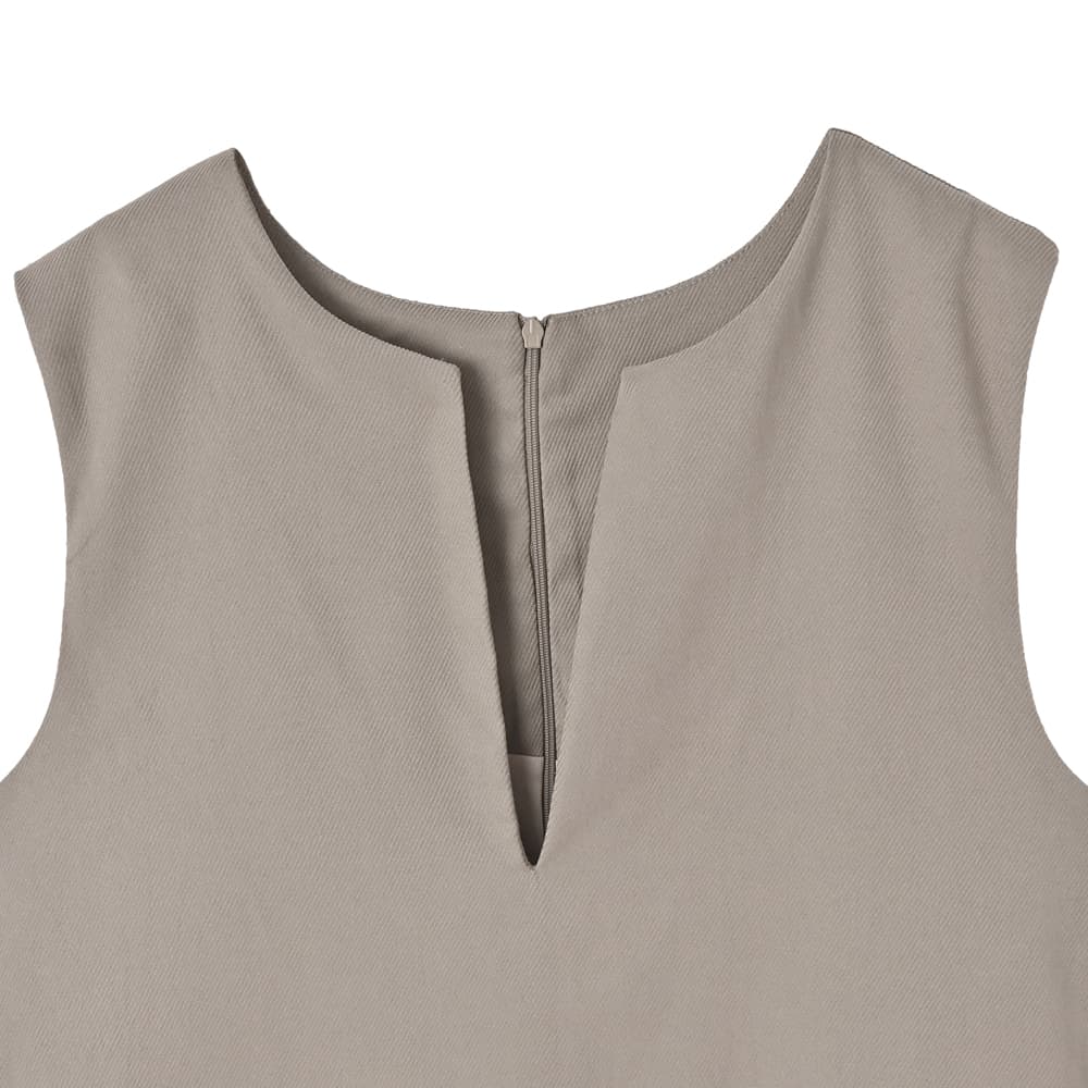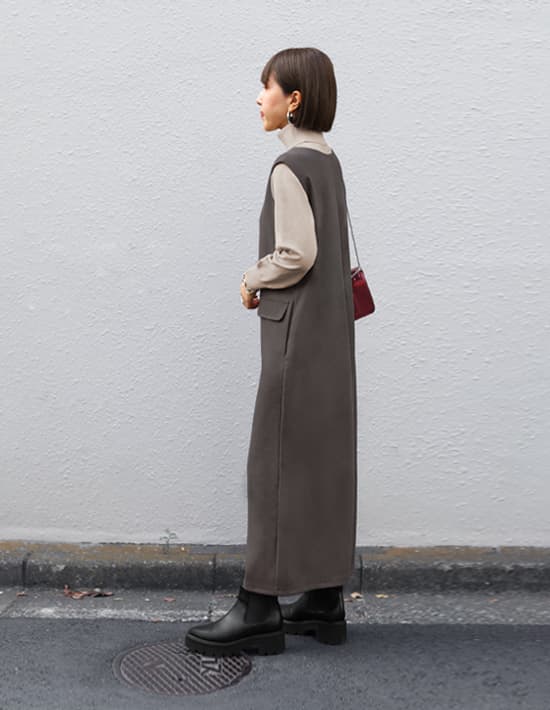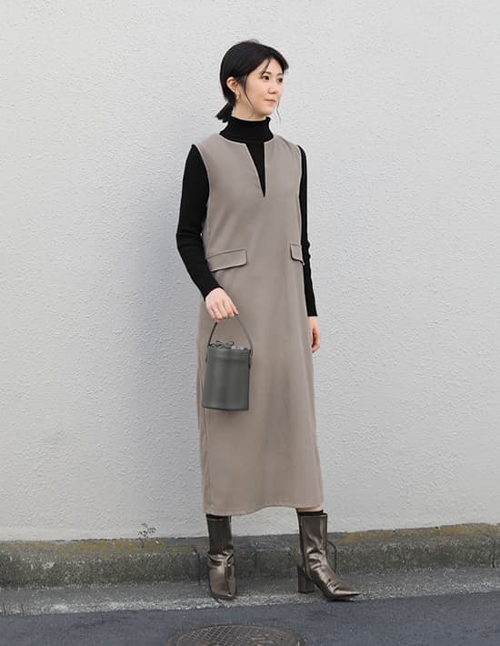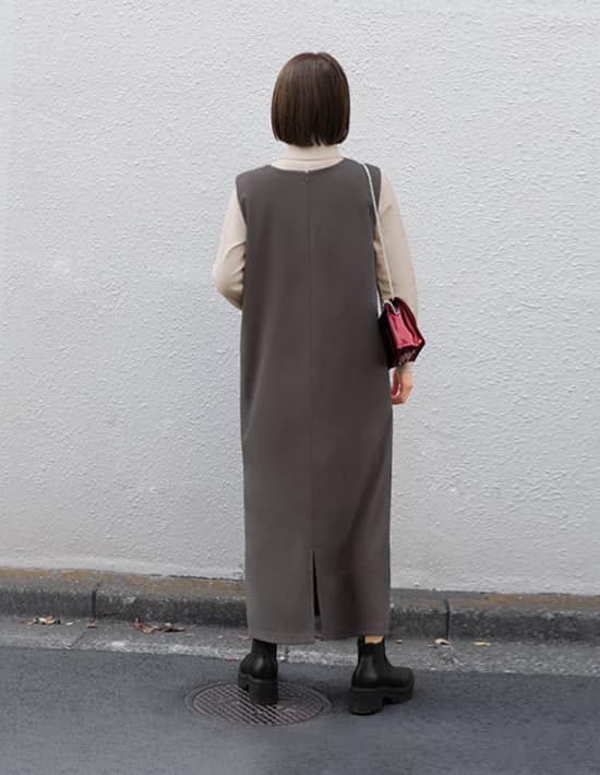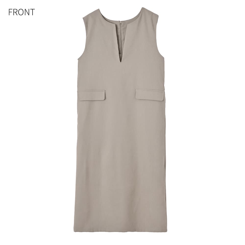 【冬を通して春まで着れる素材感】肌色を問わない明るめニュアンスカラースッキリと洗練シンプルな大人デザインキレイなIラインのジャンパースカート【このアイテムの特徴】◆大人に合う洗練シンプルなスッキリデザイン◆身体のラインを出さないIラインシルエット◆スリムに見える計算のパターン(実はゆとりあり)◆肌タイプを問わないカラー対応力のある色◆膨張しない冬の明るめカラー◆真冬もOKの温度感◆手洗いできてアイロン不要◆ブーツと合い、スニーカー合わせもカワイイ◆カッチリとしない適度なキレイめ感◆とくにトレンドの影響は受けないデザイン◆どこにでも着て行ける汎用性の高い雰囲気【このアイテムの詳細】◆フロントのスリットネックデザインがポイントの、ストンとしたIラインのジャンパースカート。優れたパターンによりスッキリと細身に見えますが、実際はゆとりのあるサイズ感。ボディラインを出さずに、カバーしながらキレイなラインを作ります。◆生地は表面凹凸のあるツイル生地。ポリエステル素材ですがそうは見えないコットンタッチの手触りになっており、厚地のコットンウエアのような風合いがあります。◆その為どことなく気楽な感じもあり、デザイン自体は大人っぽいものの、カッチリとした印象にはならないのが日常に使いやすいポイント。例えばこれをスーツ生地などで作るとカタい印象になってしまいますが、質感に程よいカジュアル感が入ることでスニーカー合わせ等もカワイイ汎用性が生まれます。◆コットン風ポリエステル素材の利点として、実際のコットン生地のようには深いシワができないところが扱いやすくて便利。適度にしっかりとしてハリ感もありますが、『冬限定』といった雰囲気の厚ぼったさは無く、冬を通して春先まで素敵にお使いいただけます。◆色は明度と落ち着きがバランス良く共存した、グレー系ニュアンスカラー。ベーシックカラーから個性的なカラー物まで幅広く合わせられる色なので、肌色タイプに関わらずご着用いただけます(=インナーを自分に合う色にすれば、顔写りは問題なし)。生地の特性により、やや明るめながらも膨張はせず、むしろスッキリと見えると好評です。【さらにプラス情報】◆温度感:生地がしっかりとしているためそれなりに暖かく、真冬も普通に活躍します。◆インナー:タートルネックやハイネックのほか、首開きのあるものやスクエアネックで少し肌を見せるのも素敵。Vネック合わせやブラウス類、シャツ系も合わせることができます。◆靴:ブーツとの相性が良い丈感。革靴系やスニーカー、フラットシューズなども合います。ソックスコーデも◎◆ディテール:フロントの左右にはフラップ付きのポケット風ディテールをプラス。ココにこれを付けることで全体の印象が引き締まり、腹部やバストへの視線を飛ばして目立たなくする効果があります。さらに見た目的にもウエスト位置が高く見えて、体型バランスが良く見えます(このポケットは飾りですが、本物のポケットも両サイドにちゃんとあります)。◆シワ:とくにシワができやすい生地ではなく、もしも気になる場合はササッとスチーマーをかければOK。霧吹きをかけてよく湿らせ、手指でシワを伸ばして掛けておくのも良いと思います。◆重さ:重さが気になる生地ではありません。◆静電気:とくにおきやすい生地ではなく、比較的影響も受けにくい素材です。とはいえその方の帯電体質具合や合わせアイテムとの相性にもよりますし、冬は乾燥でどうしても…というところはありますので、もしも気になる場合はエレガードなどの静電気防止スプレーでご対処ください。【その他仕様などの情報】◆着用時期:10-3月が目安◆サイズ感:普通体型で適度なゆとりがあるサイズ感◆丈感:足首が見える感じのロング丈◆シルエット:Iライン◆肩幅:問わないタイプ◆アームホール:やや広め◆厚み:やや厚め◆柔らかさ:ハリ感の中にしなやかさが共存◆着用ジワ:できにくい◆毛羽立ち:できにくい◆伸縮性:ややあり◆光沢感:なし◆透け感:なし◆着脱:背面ファスナー(上部ホックなし)◆ベルトループ:なし◆スリット:胸元&背面にあり(胸元:約20㎝、背面:約22㎝)◆ポケット:両サイドにあり◆裏地:あり◆手洗い:可能◆裾上げ:可能◆アイロン:不要◆スチーマー:使用OK【お色について】◆グレージュ:グレーとベージュをブレンドした明るめのニュアンスカラー。赤味・イエロー味ともに感じないアッサリとした発色です。【SNS用ハッシュタグ】#235177スリットネックジャンパースカート(このハッシュタグでInstagramなどSNS内んで検索をしますと、こちらをお持ちのお客様のご投稿があれば、簡単に見つけてご覧いただくことができます)