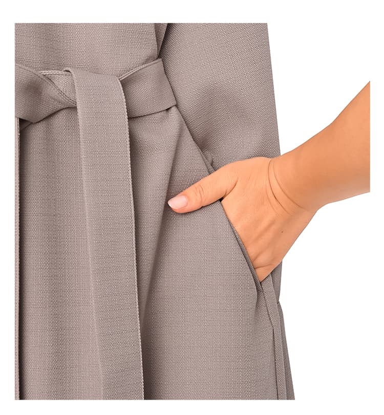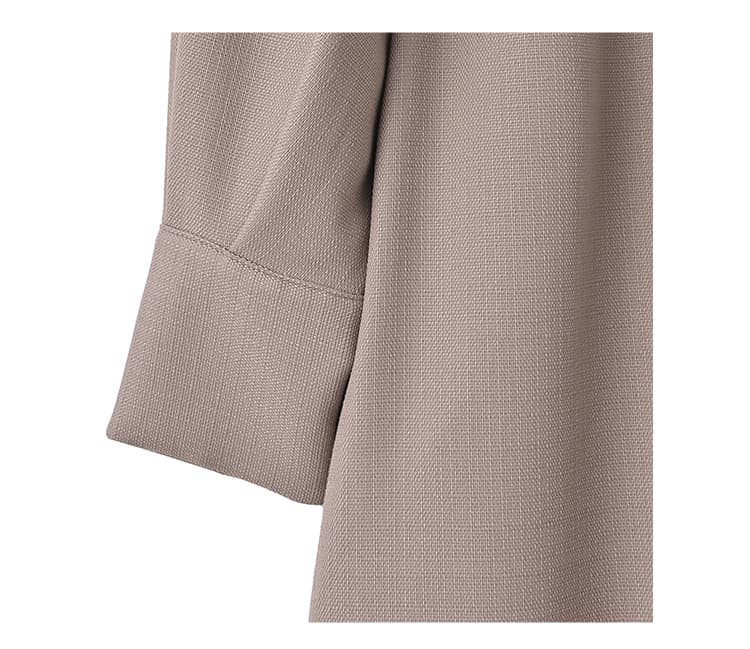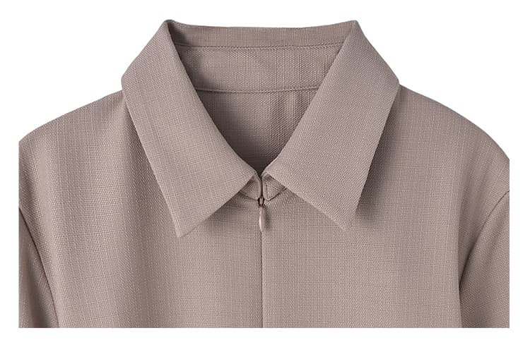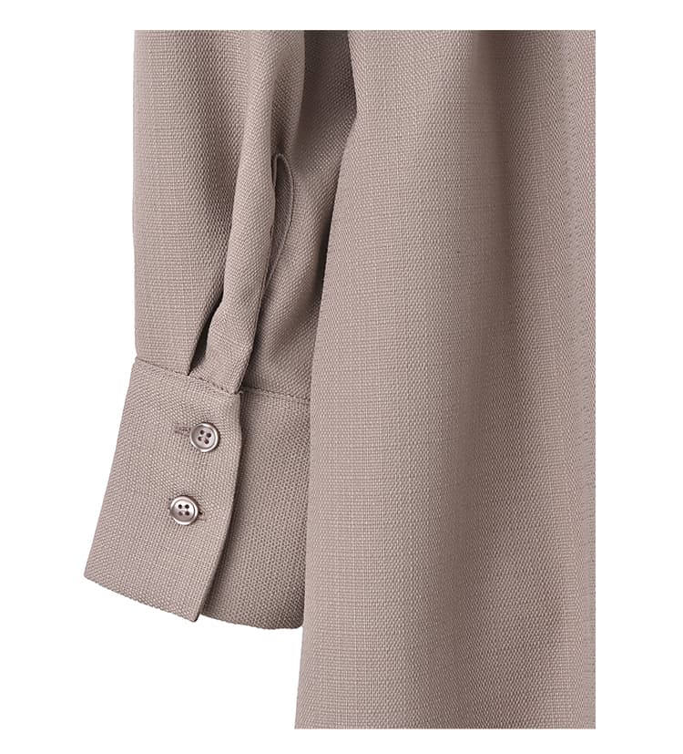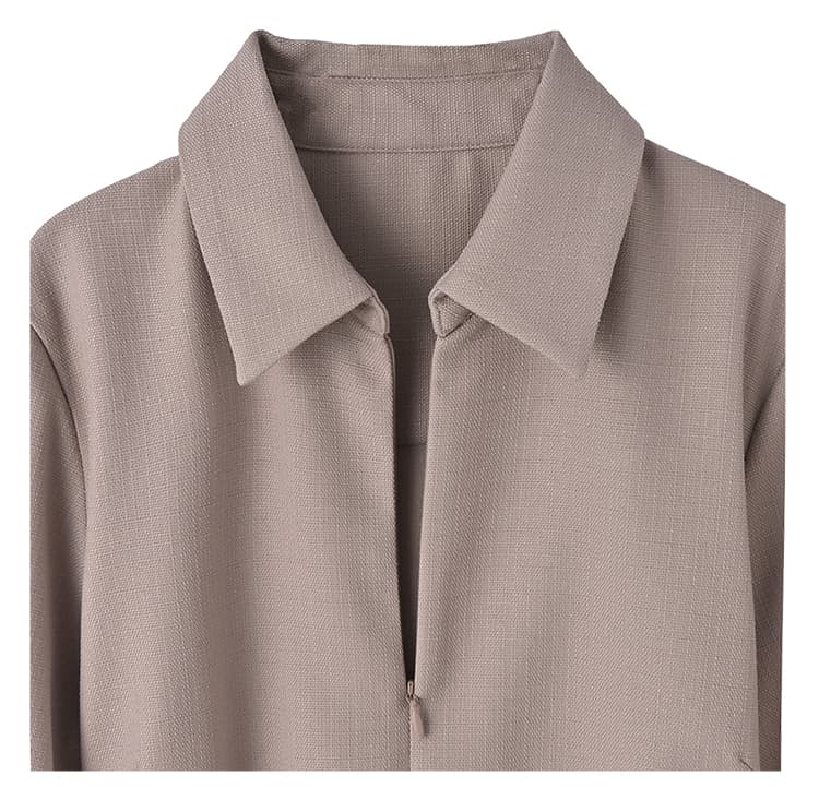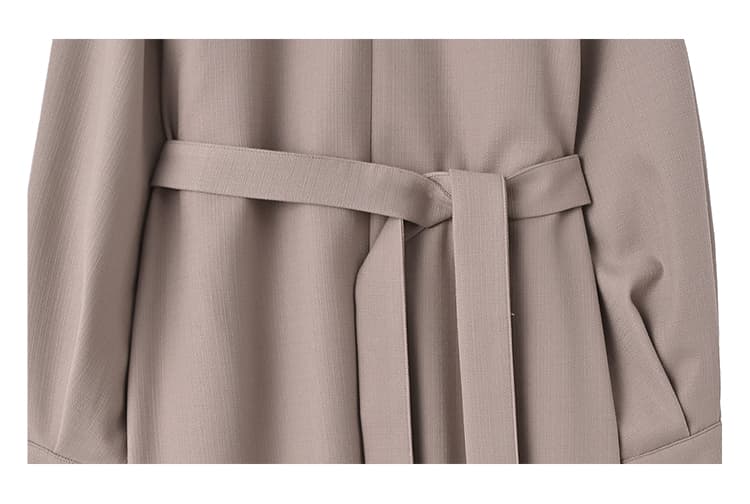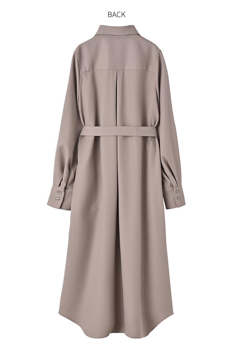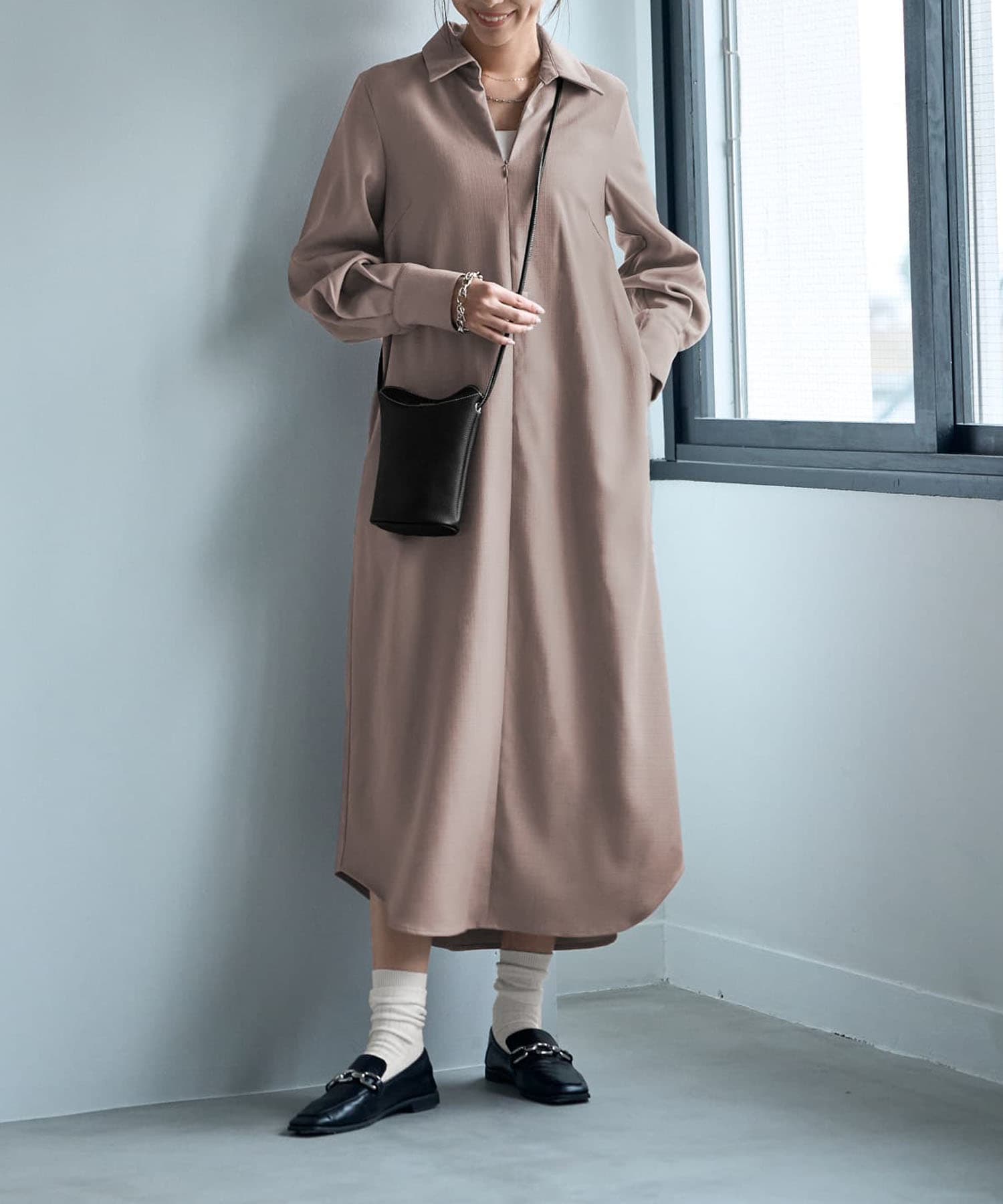 【真冬もOK◆スニーカー合わせもカワイイ】凹凸のある表面感が素敵なしっかりハリ感生地スッキリ系デザインでスタイリッシュな感じのウエストマークも可能なシャツ型ワンピース【このワンピースの概要】◆首元のファスナーでヌケ感を作ることができる、共生地ベルト付きのキレイめワンピース。Vネックのような開きを作れることで、シャツ襟が苦手な方にも着やすさが生まれます。◆バスト位置までファスナーが開けられるので、その空間からインナーを見せる着こなしも可能。下にハイネックやタートルネックのインナーを入れたり、スカーフ合わせやネックレス見せなども楽しめます。◆そのままストンとしたシルエットでゆったりと着ても素敵ですし、共生地の付属ベルトでウエストマークもできます。お好みでお手持ちのベルトをしても◎◆ボタンを使用していないシャツワンピースなので、スッキリとしてスタイリッシュな印象。ファスナーも生地と同色染めで目立たず、アウターなど他アイテムとのコーディネートがしやすくなっています。◆裏地はありませんが生地がしっかりとしているため、一枚でキレイに着用が可能です。◆基本的にはキレイめな雰囲気ですが、そこまでカッチリとはしないためスニーカー合わせやブルゾン合わせなども楽しめます。【生地について】◆凹凸のある織り柄がオシャレな、しっかり感のある生地。良い意味でクロス(壁紙)のような凹凸柄でのっぺりとせず、表情があります。◆シワはそこまで気にならない生地。アイロンをかけるほどの必要はなく、気になった際は霧吹きでよく湿らせて指でシワを伸ばし吊るしておくか、スチーマーでお手入れOKです。◆生地にはハリ感がしっかりとあり、ボディの肉感を自然にカバーします。ワンピースの形もキレイに・しっかりと出るタイプ。布帛のワンピースとしては暖かさもある方です。◆暖かさ:真冬でも安心して着ることができるしっかり感があります。◆静電気:比較的、影響を受けにくい生地です。【その他仕様などの情報】◆着用時期:10-4月が目安◆サイズ感:ゆったりめのサイズ感(Lサイズ体型にも対応)◆丈感:普通身長で足首が出る丈感◆シルエット:Aライン◆ウエスト:ベルトでウエストマークが可能◆ベルトループ:なし◆肩幅:普通◆アームホール:普通◆袖幅:やや広め◆袖丈:長袖(手の甲が隠れるくらい)◆袖口:カフス+ボタン◆ボタン:生地と同色染め◆ファスナー:生地と同色染め(約15cm)◆厚み:やや厚めでしっかりとしている感じ◆柔らかさ:ハリ感の方が強く、その後にしなやかさがくる◆着用ジワ:できにくい◆毛羽立ち:できにくい◆伸縮性:なし◆光沢感:なし◆透け感:なし◆ポケット:両サイドにあり◆タック:背面にタックあり◆ギャザー:なし◆スリット:なし◆裏地:なし◆手洗い:可能◆裾上げ:お直しに出していただけます(裾のデザインがラウンドになっておりますのでお店とご相談の上お直しを行ってください)。◆アイロン:不要◆スチーマー:使用OK◆付属品:共生地ベルト◆ご注意事項:付属ベルトのみのご用意はできかねますので、失くされないようにご注意ください。【お色について】◆サンドベージュ:ベージュの中でもイエロー味や赤味を持たない、クールな感じの非ホッコリ発色。少しグレイッシュな感じがあるお色です。【SNS用ハッシュタグ】#235179フロントファスナーシャツワンピース(このハッシュタグでInstagramなどSNS内で検索をしますと、こちらをお持ちのお客様のご投稿があれば、簡単に見つけてご覧いただくことができます)