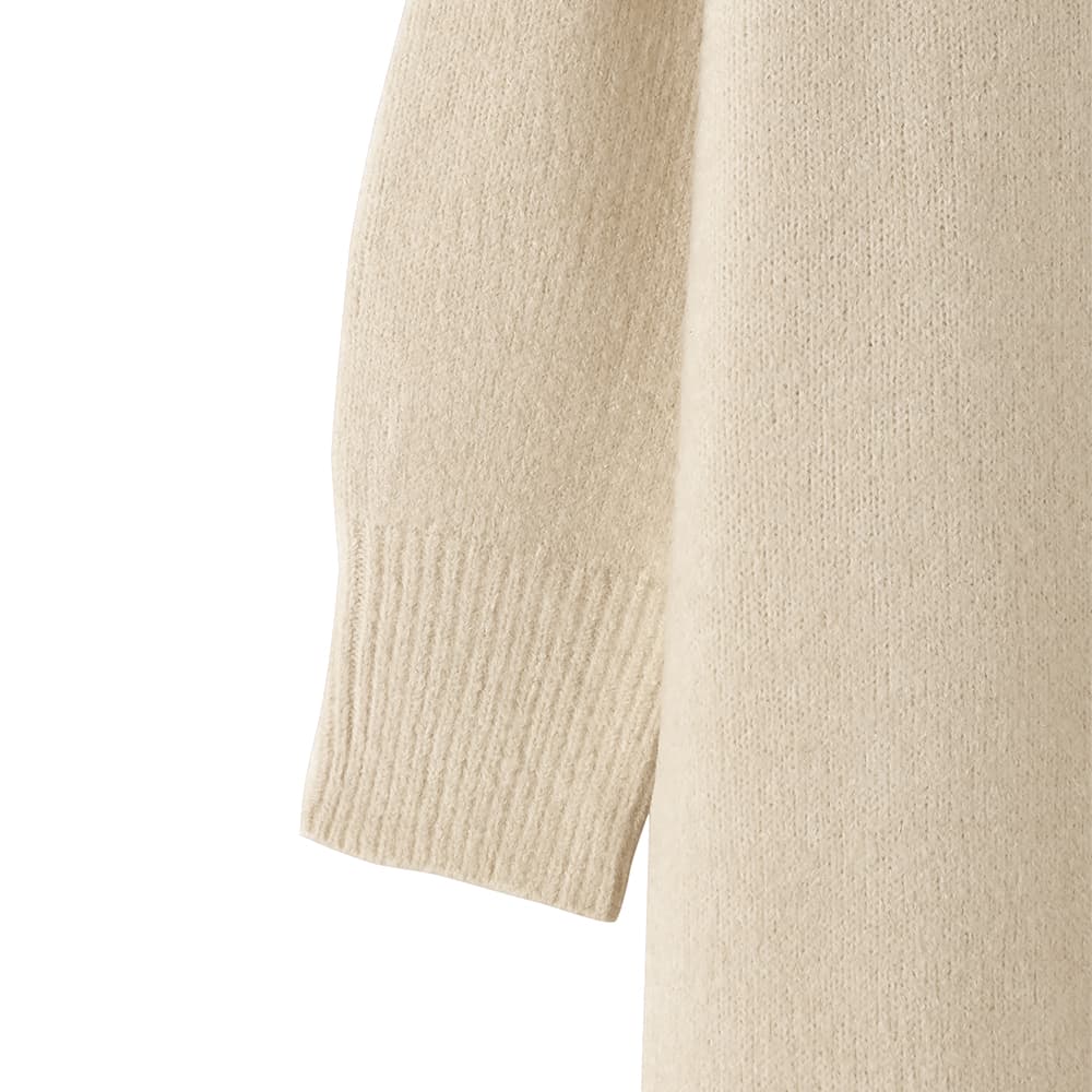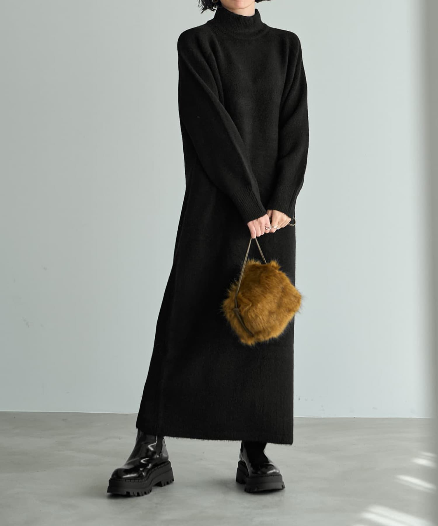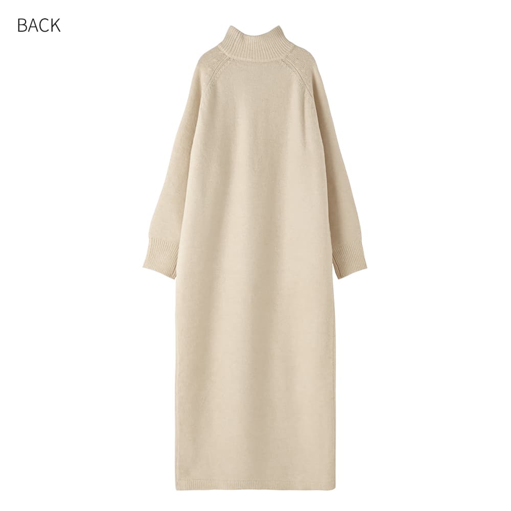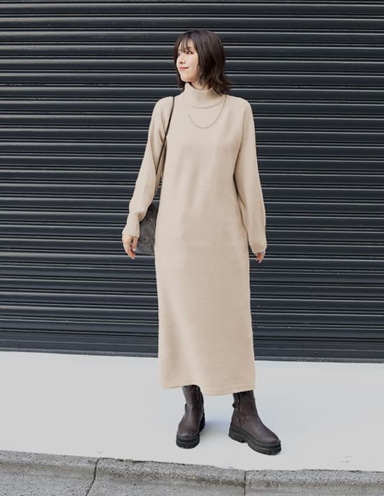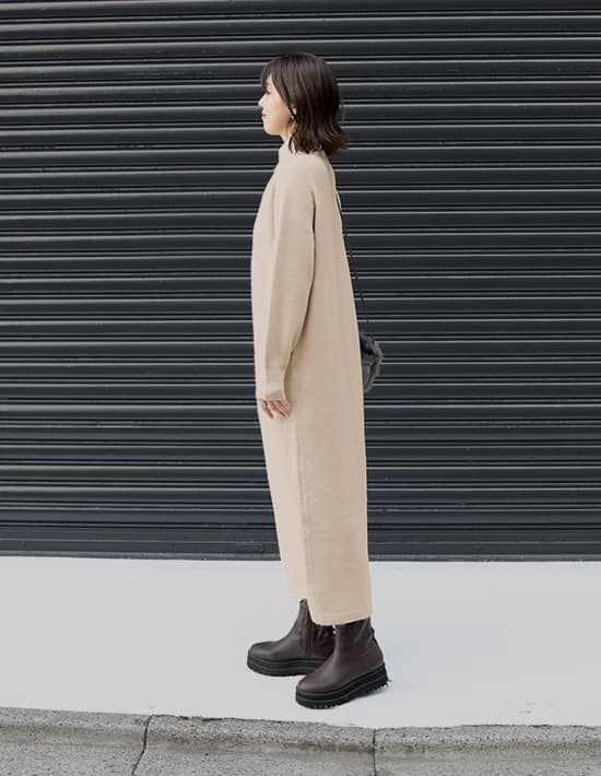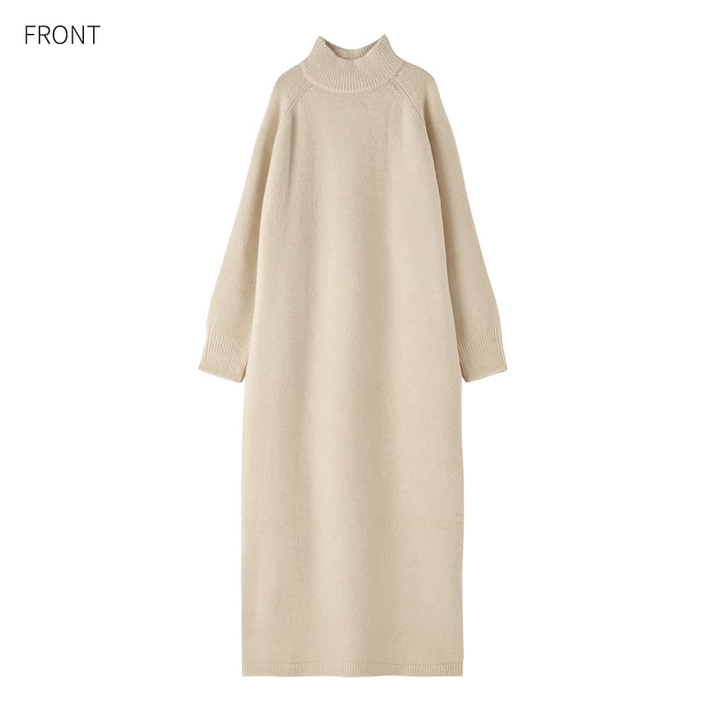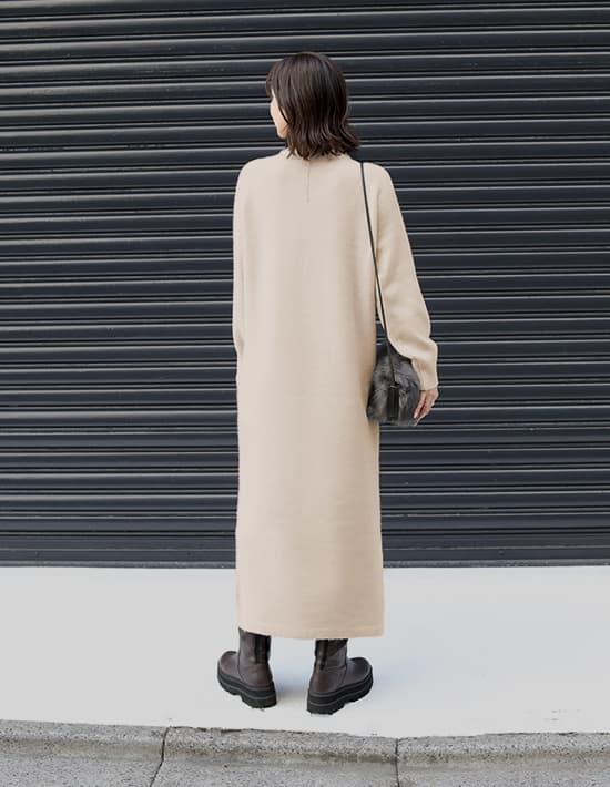 ふんわりと暖かな質感が可愛くて軽量シンプルで誰からも愛される超人気者ロングセラーのヤクニット風シリーズ◆10/23インスタライブご紹介商品◆アーカイブのご視聴はこちらから→【10/23ライブ】【このワンピースの概要】ヤクニット風のフワッと暖かな感じを表現した、質感が可愛いニットシリーズ。見た目通りに着心地も暖かく、シンプルで日常的に・誰にでも着やすいデザインが高いご支持をいただいているロングセラーシリーズです。こちらを含むワンピース2型は年末の『帰省・イベント用ワンピース』としても毎年大人気。今年は生産がありませんので、ストック分のみの販売で終了となります。―暖かな着心地とぬくもりのある質感が魅力のお素材:ヤクを、最新技術によるブレンド糸で表現したニット。実際のヤクは高級お素材ですが、その似寄りの質感をお気軽価格で楽しめるようになっています。【このワンピースの特徴】◆身体のラインを拾わない、ゆとりのあるストンとしたIラインフォルム。丈感はけっこう長く、01サイズでも着丈128cm見えくらいの長さがあります。※お届け時はそれよりは短いですが、重力でそのくらいまでになります。◆実際のところはタートルではなく、キレイに立ちあがるように編んだ、幅が広いスタンドネック。高さも控えめで首の上部は見えるため、首が細く・長く見えるのがポイント。首が窮屈な感じも皆無の、ストレスが無いネックデザインが人気です。◆ネックに高さが無いのは、襟ぐりの位置を下げているから。というのが当店のお家芸。通常のタートルよりも襟ぐりの位置を下げることで、首が長いように見せるテクニックです。デザイン(見た目)的にはネックの高さがあるのに、着ると高さが無いという不思議現象。「首が短くてタートルが似合わないけど着てみたい」というお客様のご希望を叶えたくて編み出した、オープン初期からの伝統ワザです。◆クセの無いシンプルなデザインで雰囲気調節は自在。キレイめな小物を合わせて通勤仕様にすることもできますし、ニット帽やスニーカー等を合わせてカジュアルに着ることもできます。◆ヤク風のふんわりと暖かな質感を出した、温かみのあるお素材。見た目も着心地も暖かく、寒い真冬のメインアイテムとなること間違いナシの着心地です。厚手というよりはふんわり感による厚みがあり、そのため軽量なのも人気のヒミツです。【さらにプラス情報】◆肌触り:柔らかめでふんわりとしています。チクチク感はありませんが、稀に過敏な方は感じる方もいらっしゃるのかもしれません。ただし当店にも敏感肌のスタッフが複数おりますが皆問題はなく、お客様からもそのようなお声は挙がらないため大多数の方には大丈夫かと思います。◆着用可能シーズン:真冬用ですので3月上旬くらいまでが目安となります。寒ければもう少し先までOKです。◆お手入れ:質感の良さを維持するにはクリーニングがお薦めです。洗う場合も頻度は最低限に抑えることで、ふんわり感が維持され毛羽立ちの発生も軽減されます。日常的なお手入れはスチーマーで消臭・殺菌をするのが良く、かける際は丈伸びを増長しないよう縦方向ではなく横方向にスチーマーを当てます。◆毛羽立ち:とくに毛玉になりやすい生地ではありませんが、お使い頻度や摩擦、洗い頻度や帯電具合などにより毛羽立ちがおこる可能性もあります。できた場合は毛玉取りクリーナー等でご対処ください(毛玉未満の毛羽立ちまで取ることができる、テスコムの毛玉クリーナーはお薦めです)。 ◆シワ:着用ジワはできません。たたみジワは多少はできるので、なるべくシワができないたたみ方を工夫して手間を省いています。◆静電気:その方の帯電体質具合や合わせアイテムなどに加え、ニットなので冬場は乾燥でどうしても…というところはありますので、もしも気になる場合はエレガードなどの静電気防止スプレー等でご対処ください。ペチコート類を入れるのも脚へのはり付き防止に有効です。◆保管:ハンガー掛けでの保管は丈伸びの原因となります。掛ける場合は丈・肩・袖が伸びないように配慮した掛け方をしてください。たたんでそんなにシワになる素材でもないため、スタッフはたたみ保管をしている者が多いです(そして着る前に軽くスチーマーをかけています)。◆羽織りもの:ジャストサイズのものはモコモコしたり窮屈さが出そうですが、ゆったり感のあるジャケットやシャツ、ブルゾンやニットガウン等は羽織ることができます。【丈感について】◆ニットワンピースですので、実際に着ると平置きの寸法から10-12cm程度をプラスした長さになります。見え感はその方の体型(身体の薄さや肩の骨格など)により異なります。◆お届け時はそこまで長くありませんが、重力で徐々にそのような長さになります。◆伸び感は染料の特性により多少のカラー差や個体差が生じます(ニットワンピース全般に共通)。◆稀に丈が成長し過ぎてしまうこ