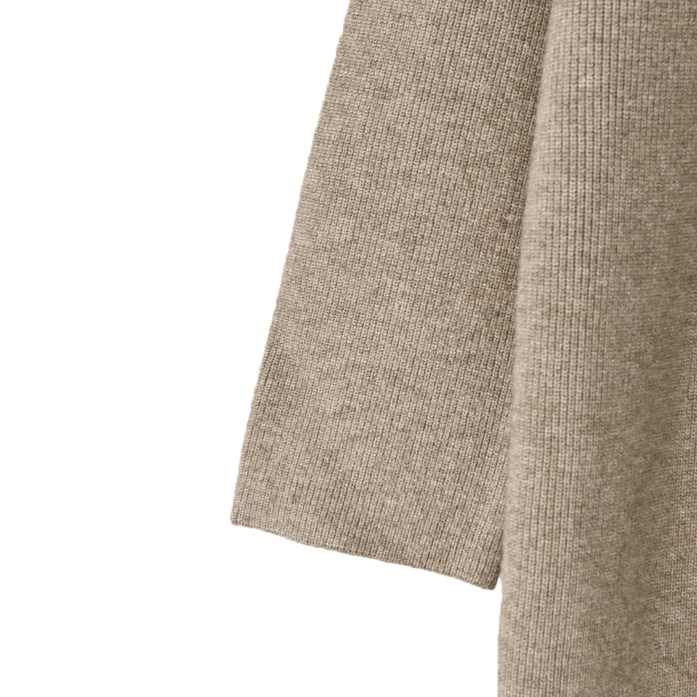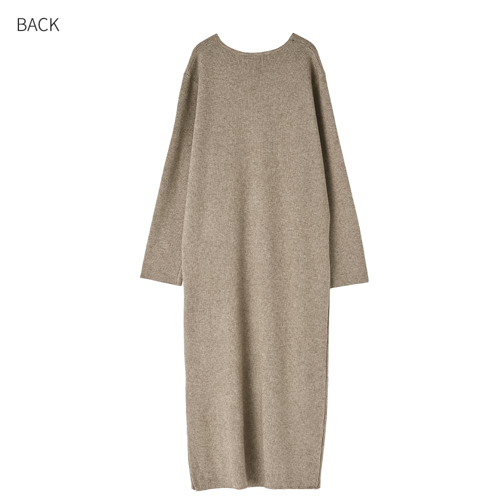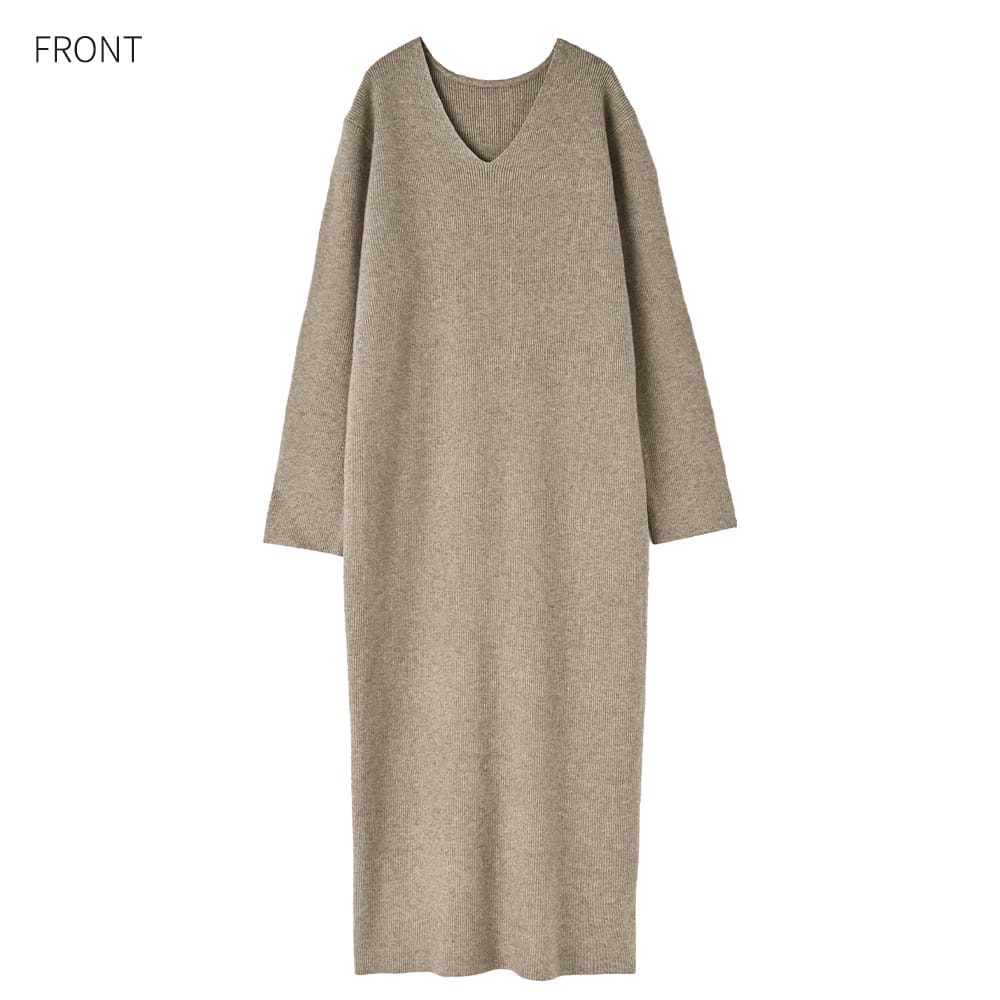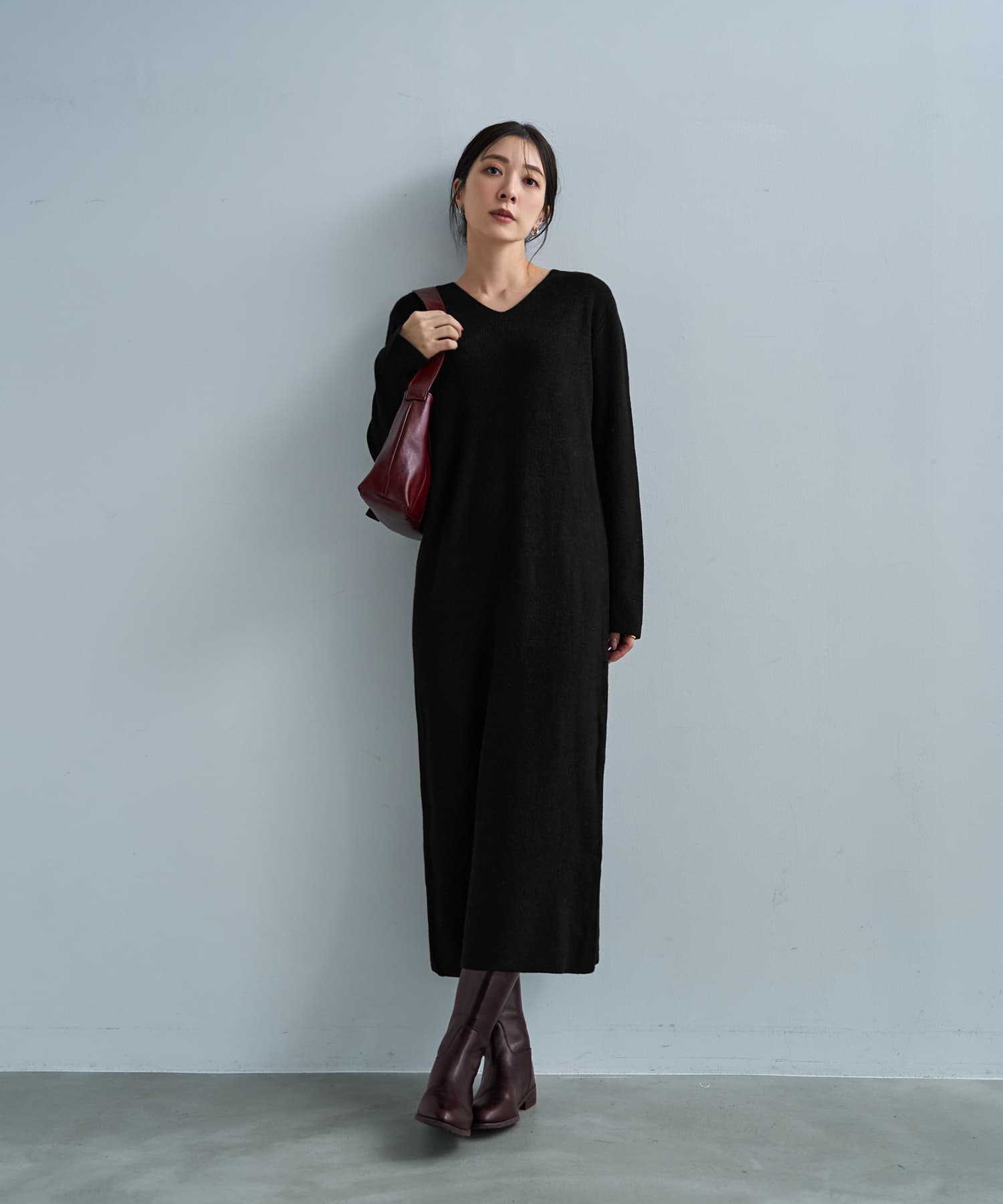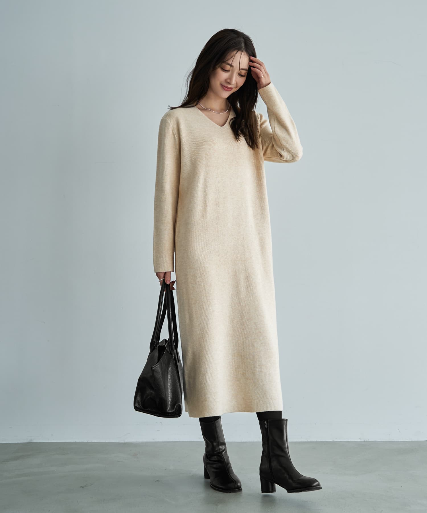 今までのVネックワンピとは少しずつ違う表面の質感や端処理、形や丈感が今っぽい気持ち良い肌触りの洗練ニットワンピース◆12/25インスタライブご紹介商品◆アーカイブのご視聴はこちらから→【2025/12/25ライブ】【このワンピースの特徴】その名の通りに肌当たりがしっとりとしてモッチリ感のある、とても気持ちが良いニット素材のVネックワンピース。ハイゲージ編みの中では少し編み目が大きく、キレイめ過ぎないキレイめ感が今っぽい感じの一枚です。◆首元、裾、袖口にリブが無く、スッキリとした印象のデザインになっています。◆袖口はストレートですぼまりが無いタイプ。下にシャツなどの重ね着をした際も袖口からインナーを出しやすい形状です。◆そんなに長くない丈感も今(最新)っぽいポイント。当店で言えば『本革ミドル丈サイドゴアブーツ』のような筒高が長めのものを合わせたり、ロングブーツを合わせても素敵です。春先なら素足にスニーカー合わせやローファー合わせ、ソックスコーデなどもカワイイ丈感です。◆長さが足りない場合はハンガーに掛けておけば、表記サイズの着丈から最大8-10cm程度は伸ばせることが予測できます。様子を見ながらお好みで行なってください。※肩や袖が伸びないようにハンガーの形や掛け方にはご配慮ください。細いハンガーを使うと肩がその形に飛び出てしまいます。【さらにプラス情報】◆暖かさ:ハイゲージ編みのニットワンピースとしてはそこそこの厚みがあり、暖かい方です。ただし厚ぼったい感じはないため、春先でも違和感は無くご着用いただけます。◆丈伸び:こちらはニットワンピースですので、表記の着丈寸法(平置き採寸時の長さ)に対して、着用時は重力により5-7cm程度長いイメージになります(着丈123-125cm程度のワンピースと同等イメージ)。着ているうちにどんどん・どこまでも長くなってしまう感じではありません。◆肌触り:とても気持ちの良い素材でチクチク感はありません。※最終的な感じ方には個人差がありますので、その点はご理解をお願いいたします。◆静電気:程度の差はその方の帯電体質具合や合わせアイテムなどによりますが、冬場は乾燥でどうしても…というところはありますので、もしも気になる場合はエレガードなどの静電気防止スプレー等でご対処ください。脚全体をしっかりと保湿したり、ペチコート類を入れるのも脚へのはり付き防止に有効です。◆毛羽立ち:とくにできやすい生地ではありませんが、その方の動作グセやバッグとの摩擦具合、着用頻度やお洗濯方法などにより個人差がありますので、できることもあるかもしれません。できた場合は毛玉取りクリーナー等でお手入れをしてください。◆保管:丈感を変えたくない場合はたたみ保管がお薦めです。とくにシワが気になる素材ではないので、たたんでいてもそのまま着用することができます。◆備考:こちらはニットワンピースですので、表記寸法はあくまで目安となります。丈感については前後2cm程度の個体差が標準として生じますので、予めご理解をお願いいたします。【その他の仕様などの情報】◆着用時期:10-4月頃が目安◆サイズ感:ゆとりのあるサイズ感(Lサイズ体型にも対応)◆丈感:(普通身長で)ふくらはぎは完全に隠れて足首は出る長さ◆シルエット:ストレート◆首元:Vネック◆肩幅:問わないタイプ(ドロップショルダー)◆アームホール:やや広め◆袖幅:やや広め◆袖丈:長袖(手の甲が隠れる長さ)◆袖口:何もなし◆袖のたくし上げ:可能(腕が細いと落ちる可能性もあり)◆厚み:きもち厚め◆重み:気にならない程度に心地良くあり◆柔らかさ:柔らかさの中にハリ感が共存◆肌触り:しっとり・ふんわり・もっちり・なめらか◆着用ジワ:できにくい◆伸縮性:あり◆光沢感:なし◆透け感:なし◆スリット:なし◆ボタンやファスナー:なし(かぶり着タイプ)◆ポケット:なし◆裏地:なし◆手洗い:可能◆アイロン:不要◆スチーマー:使用OK【お色について】◆ブラック:定番的な通常のブラックです。◆ブラウン:雑穀のようなナチュラル感を持つ、赤味が無いアッサリとした感じのブラウン。濃淡の糸色が混ざったメランジ編みになっています。一部のライ麦パンや茶系のほうじ茶プリンで見るようなお色でオシャレです。◆アイボリー:少し深みのある色味感を持つ、温かみのある発色のホワイト。よく見ると微妙に濃淡のメランジ編みで、人からみたときの印象は『白っぽいワンピース』になります。色味感=僅かなベージュ色素を入れたような感じで、クリーム色感や赤味とは少し異なります。【SNS用ハッシュタグ】#236065しっとりもっちりvネックニットワンピース(このハッシュタグでInstagramなどSNS内で検索をしますと、こちらをお持ちのお客様のご投稿があれば、簡単に見つけてご覧いただくことができます)