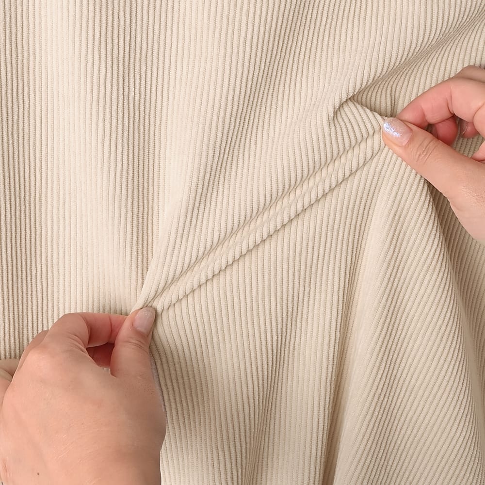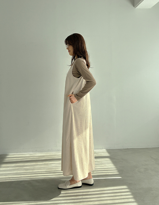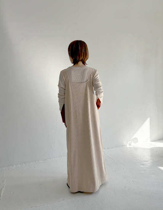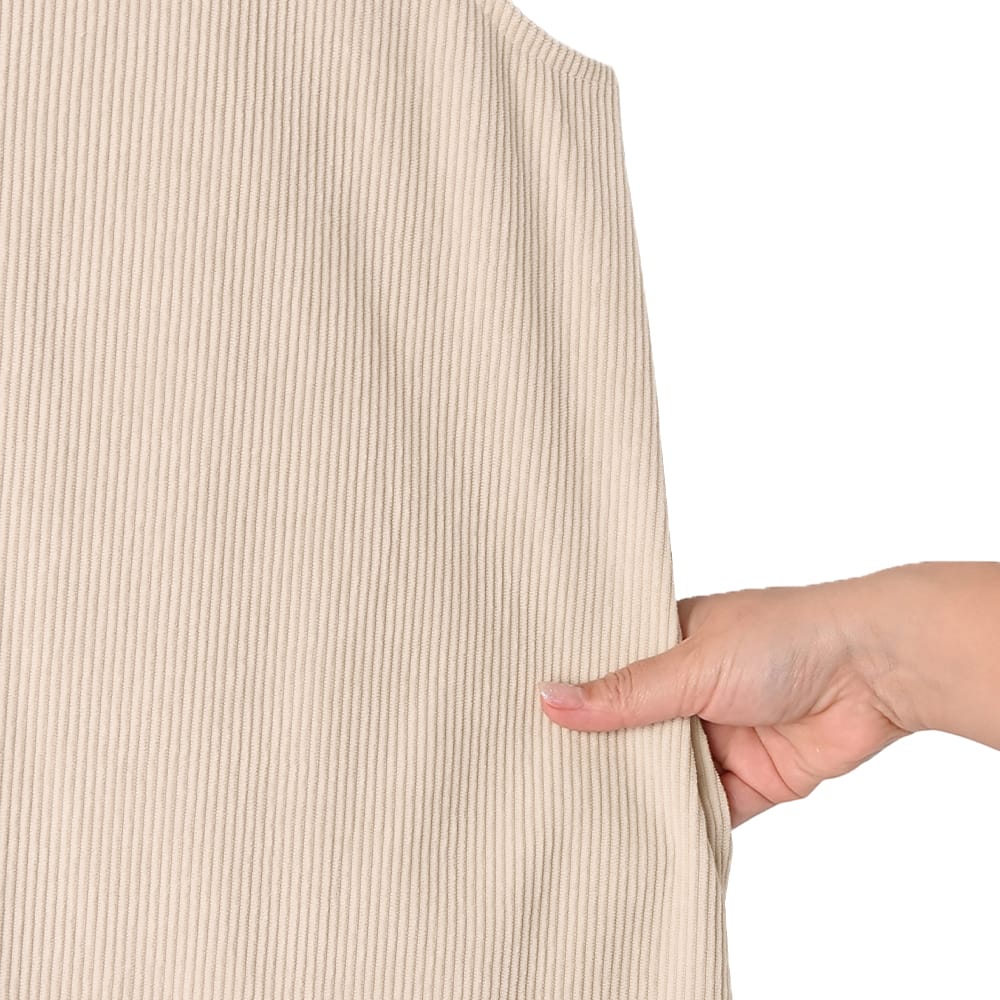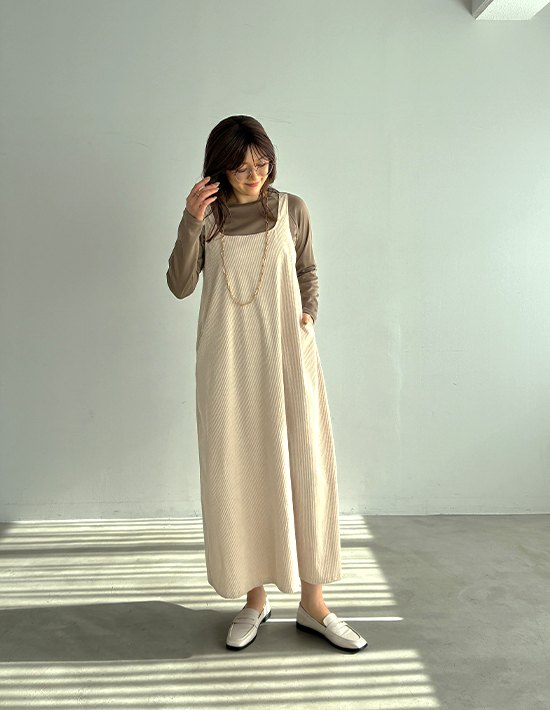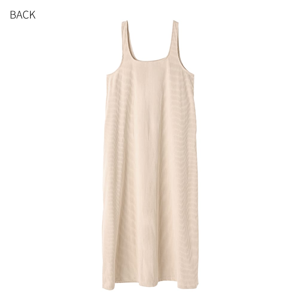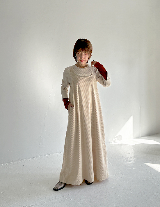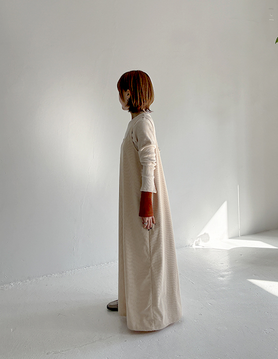 気取りの無いラフさが春夏にカワイイストンとラクに着れるゆったりフォルム旬なエクリュ色のジャンパースカート◆2/5インスタライブご紹介商品◆【このアイテムについて】その名の通りに薄くて柔らかな春夏用コーデュロイ生地を使用した、色と質感のカワイさが主役のジャンパースカート。大きな身幅を落ち感でボリュームダウンするタイプのゆったりとしたデザインで、体型を問わずにお楽しみいただけます。見た目の質感も冬っぽい感じではなく、サラッと軽い感じのコーデュロイ。真夏の炎天下ではちょっと暑いかもしれませんが、イメージとして28度以下程度であれば、多くの方は着用できそうなサラッと感です。◆少しラフな雰囲気が気取らない日常にピッタリな一枚。身体を締め付ける要素がどこにも無い、ラクちんな着心地です。◆丈感は長め。高身長な方が足首を出し、スニーカーで着るのもバランス的にカワイイです。お好みで丈詰めも行っていただける仕様です。◆スリット無しで脚を見せたくない方にも◎ 身幅が大きいため、スリット無しでも脚さばきにまったく支障はありません。◆基本的には長袖や半袖のインナーを合わせて着ますが、ノースリーブで着用するのも可愛くてお薦め。ノースリーブで着てカーディガンやジャケットなどを羽織るか・中にタンクトップ等を着て一枚で着るかの二通りがあります。◆エクリュの中でも色味が濃いめで、それによりインナーに白を合わせることができるのが便利(=同化しない)。白Tシャツや白カットソーを合わせるだけでも素敵なので、コーディネートが手軽に済みます。【さらにプラス情報】◆お薦めの着こなし:質感と色味に十分な存在感があるため、シンプルに白や黒のTシャツやカットソーを合わせるのが1番カワイイと思います。◆透け感:とくに気になりませんが、念のため黒などの下着は避けるのが良いと思います。◆シワ:多少はできますが、ラフさのある雰囲気に溶け込みあまり気になりません。もしも気になる場合はアイロンやスチーマーをかけても良いですし、霧吹きをかけておくだけでもOKです。◆重さ:軽量で、重さが気になることは無いと思います。肩紐が割と外側なので肩への負荷も少なく、肩凝りへの影響も感じることは無さそうです。◆肩紐のずり落ち:構造的に落ちやすい形状ではなく、多くの方には気になることが無さそうなタイプです。◆羽織り:羽織りものやアウターは長さやカタチをさほど問わず、お好きなものを羽織っていただければ、という感じです。【その他の仕様などの情報】◆着用時期:10-6月頃が目安(お好みで夏もOK)◆サイズ感:ゆったりとしたサイズ感(Lサイズ体型にも対応)◆丈感:普通身長でくるぶし程度◆シルエット:着ると僅かにAライン見えするIライン◆ウエスト調節機能:なし◆肩紐の調節機能:なし◆首元:スクエアオフ◆アームホール:やや広め◆厚み:コーデュロイとしては薄い春夏用◆柔らかさ:柔らかい+ハリ感も共存◆肌触り:表面はしっとり・なめらかコーデュロイ/裏面はサラッとして肌離れの良い感じ◆毛羽立ち:基本的にできない◆伸縮性:あり◆光沢感:なし◆透け感:なし◆スリット:なし◆着脱:かぶり着タイプ◆ボタンやファスナー:なし◆ポケット:両サイドにあり◆裏地:なし(通常この生地には付けません)◆丈詰め:行っていただけます◆手洗い:可能◆アイロン:基本的には不要(必要に応じてお好みで)◆スチーマー:使用OK【お色について】◆エクリュ:濃いめのバタークリームのようなこっくりとしたホワイト系カラー。ベージュとまでは言えない程度に色味感があり、クリーム色感も赤味も両方を含みます。【SNS用ハッシュタグ】#236134薄めコーデュロイスクエアオフジャンパースカート(このハッシュタグでInstagramなどSNS内で検索をしますと、こちらをお持ちのお客様のご投稿があれば、簡単に見つけてご覧いただくことができます)