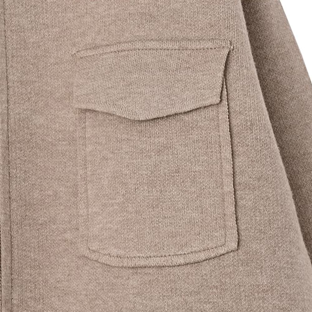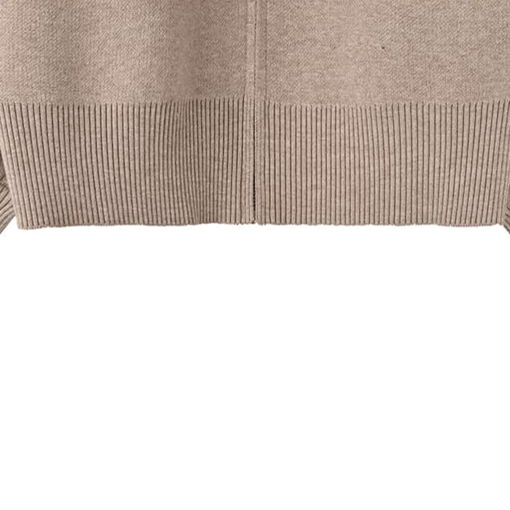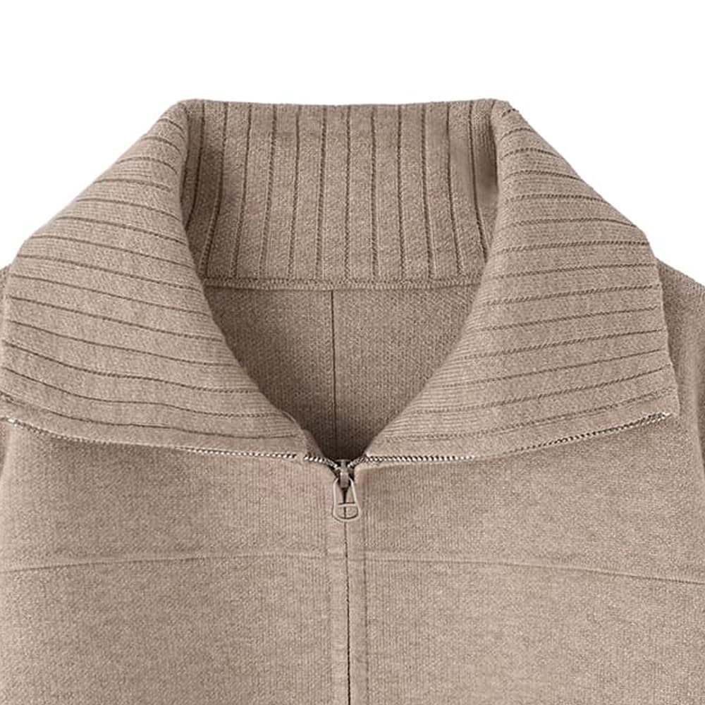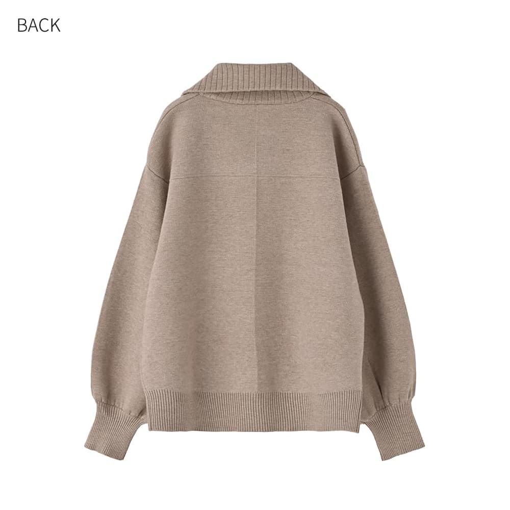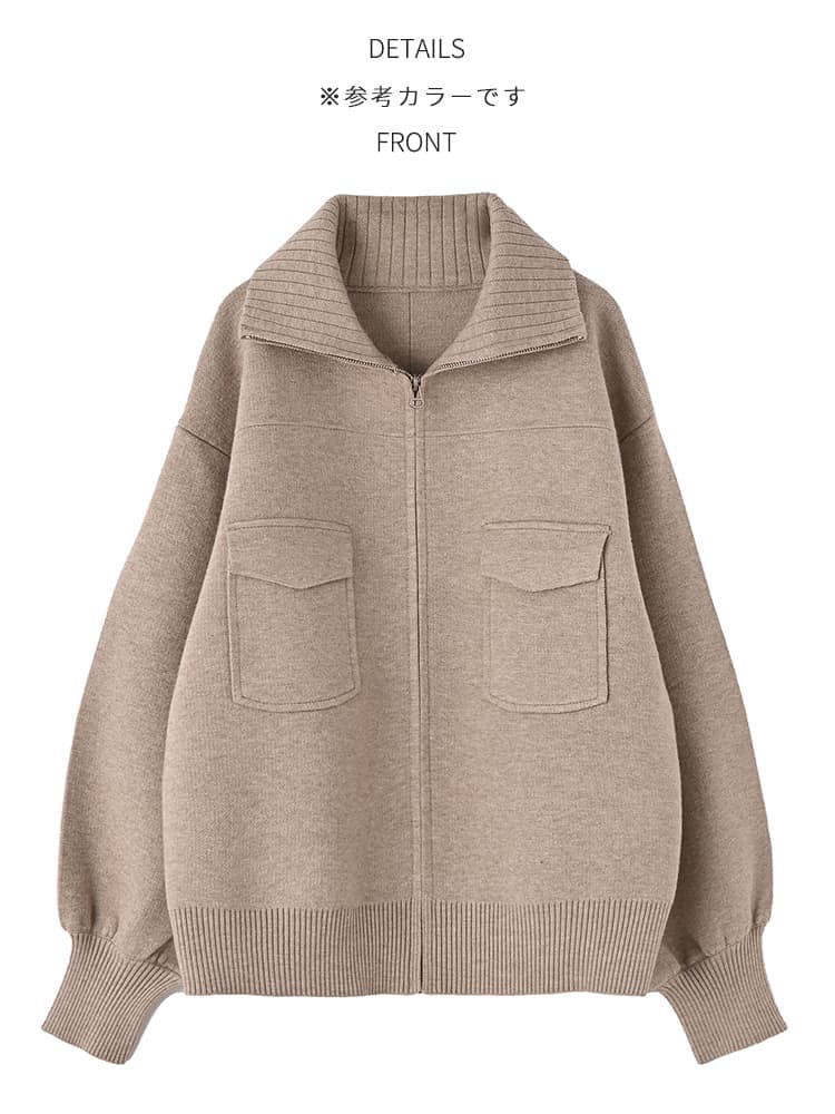 アウター代わりになる暖かさ。ギュッと詰まった編み目がカワイイ しっかりニットジャケット編み目を強く詰めて暖かさとしっかり感を出した、圧縮系ニット生地のフロントジップジャケット。ただし厚過ぎたり重さが気になることはなく、着やすい感じに仕上がっています。表面はスベスベとして滑らかで、チクチク感は無し。その奥にモチモチとした弾力性があり、暖かくて毛玉もできにくい快適なお素材です。冬はこの上からコートを着れば暖かさ倍増。秋口や春先にはアウターとて利用できるタイプの、キレイめカジュアルなジャケットです。 ◆ジップは上まで閉めることができ、タートルネックのようにして着るのも可愛い。ジップの色はマット(ツヤ消し)なシルバーです。◆胸元のフラップ付きポケットが効いた、メリハリのあるデザイン。このポケットは実際に使用することができます。◆首元リブは袖口&裾のリブよりもピッチが太くなっており、強弱を付けた単調ではない感じがオシャレです。◆全体的にに適度なゆとり感。ビックシルエットではないため小柄な方でもバランスがとりやすく、スカート合わせもキレイにまとまる丈感です。◆上品さのあるキレイめカジュアルな雰囲気。オフィスでも浮かない品の良さはありつつ、気取らない感じが素敵です。【プラス情報】ー過去商品『圧縮素材裏ニットパーカー』との違い◆あちらは表面がメルトンのようなコート調の圧縮生地で、裏側がニットというウラオモテ異素材の特殊生地でした。対してこちらは両面ともに編み目が詰まったニットになっています。◆あちらの方が厚くしっかりとしており、ハリ感が強い感じ。こちらの方が柔らかさとしなやかさがあります。暖かさはあまり変わりませんが、ほんの少しだけあちらの方が暖かいかも?ただしコートを重ねてキレイなのはこちらの方が勝ります。◆あちらはフード付きタイプで、こちらはハイネックまたはオープンカラーの2wayタイプ。デザインの雰囲気がけっこう異なります。【お手入れについて】こちらの商品はレーヨンを50%含有した圧縮系ニット生地を使用しておりますため、手洗いOK表示を付けておりません。ただし着用にはインナーが必要であることからそこまで汚れるアイテムでもないため、1シーズンに1回クリーニングに出せば十分です。日頃の消臭・殺菌・質感の美しさなどのお手入れはスチーマーで事足りますので、シーズンオフにクリーニングをご利用ください。もしもどうしてもご自宅でお手入れを行いたい場合は、『レーヨン ニット 手洗い』などで検索していただき、自己責任で行っていただきますようお願いいたします。※お手入れに関するトラブルは事実確認が困難なことから、免責とさせていただきます。予めご了承をお願いいたします。【商品の特徴】◆着用時期:夏以外◆サイズ感:適度なゆとりのあるサイズ感◆丈感:下腹が隠れる程度の丈感◆シルエット:スカートにもパンツにも似合うシルエット◆スリット:なし◆厚み:安心感のあるしっかりめの厚み◆柔らかさ:モチモチとした柔らかさ◆着用ジワ:できにくい◆毛羽立ち:摩擦の集中や着用頻度等により、おきる可能性もあります(できた場合は毛玉取りクリーナー等でご対処ください)◆伸縮性:あり◆光沢感:なし◆透け感:なし◆ボタン:なし◆ファスナー:フロントファスナーあり◆ポケット:両胸ポケットあり◆裏地:なし◆手洗い:家庭洗濯不可◆アイロン:不可◆重量:約700g◆撥水加工:なし【お色について】◆ネイビー:ブルー味が控えめの深く落ち着いたネイビーです。【SNS用ハッシュタグ】#235248圧縮ニットジップジャケット(このハッシュタグでInstagramなどSNS内で検索をしますと、こちらをお持ちのお客様のご投稿があれば、簡単に見つけてご覧いただくことができます)
