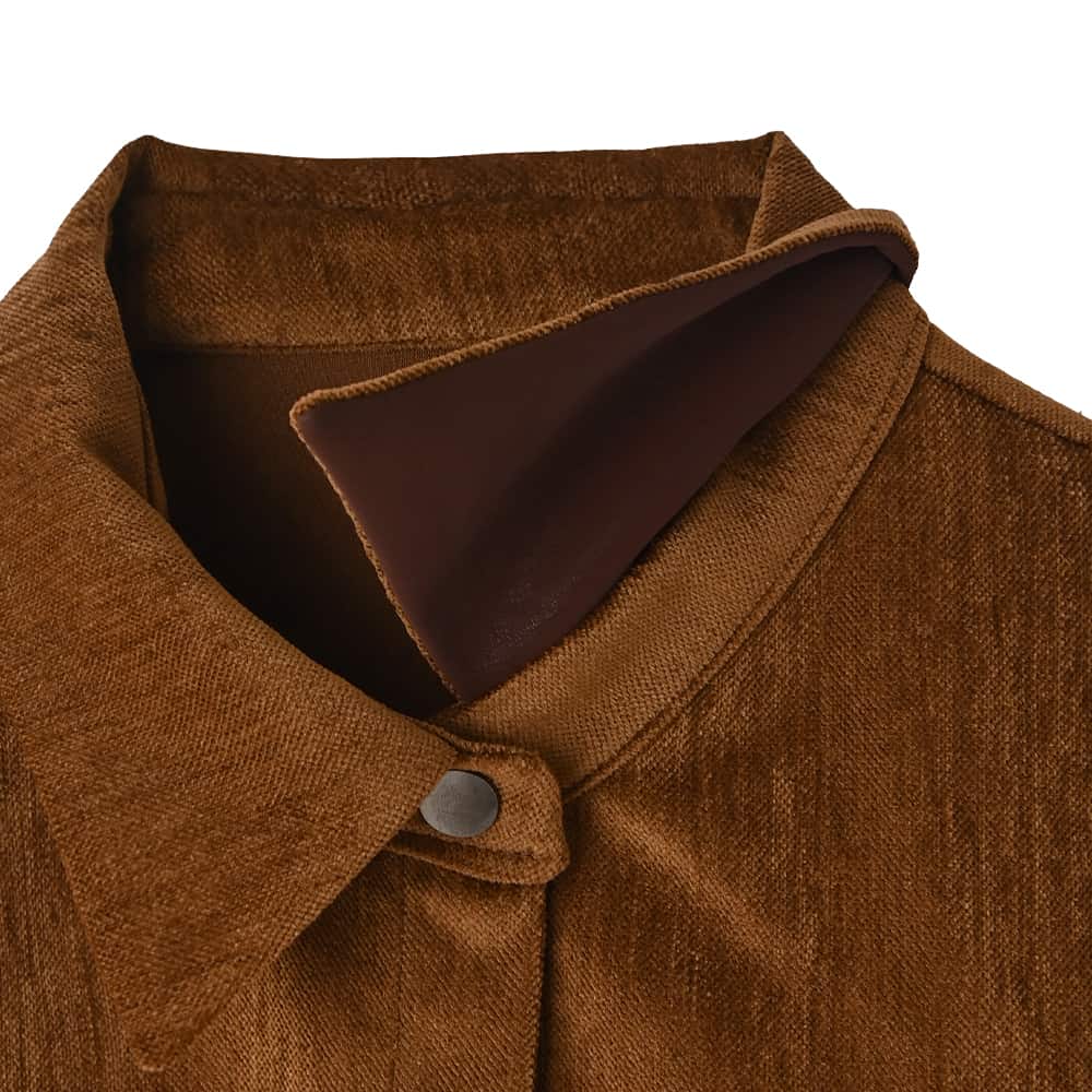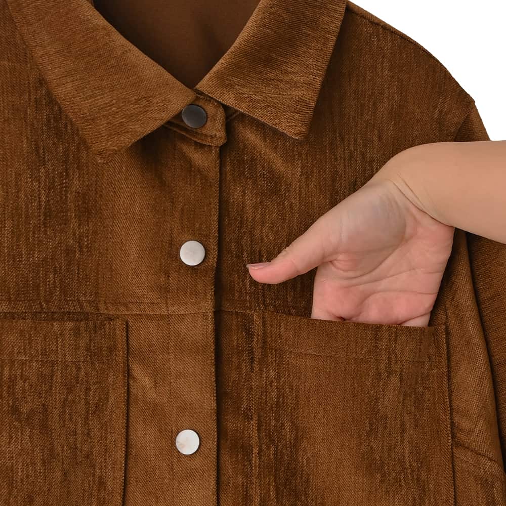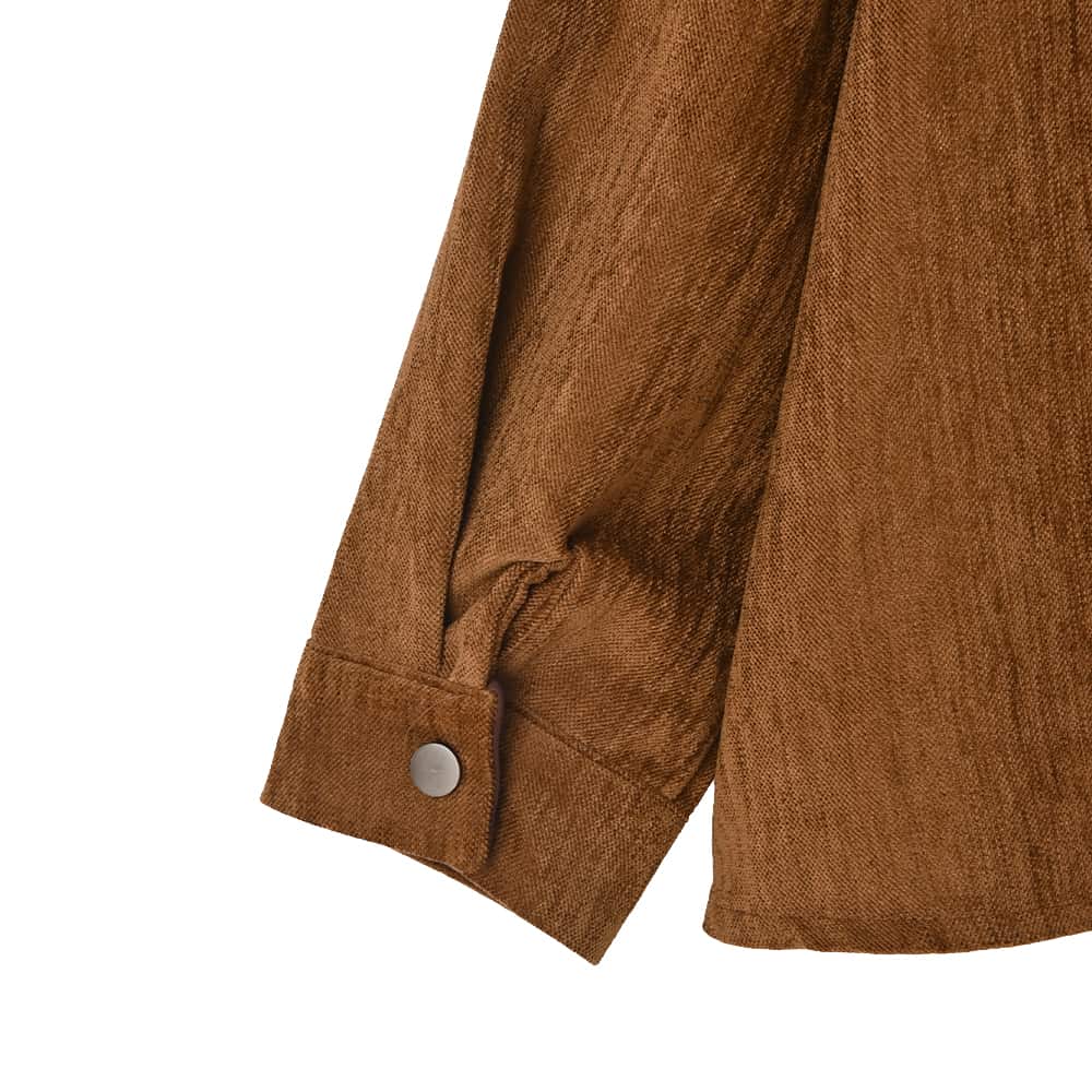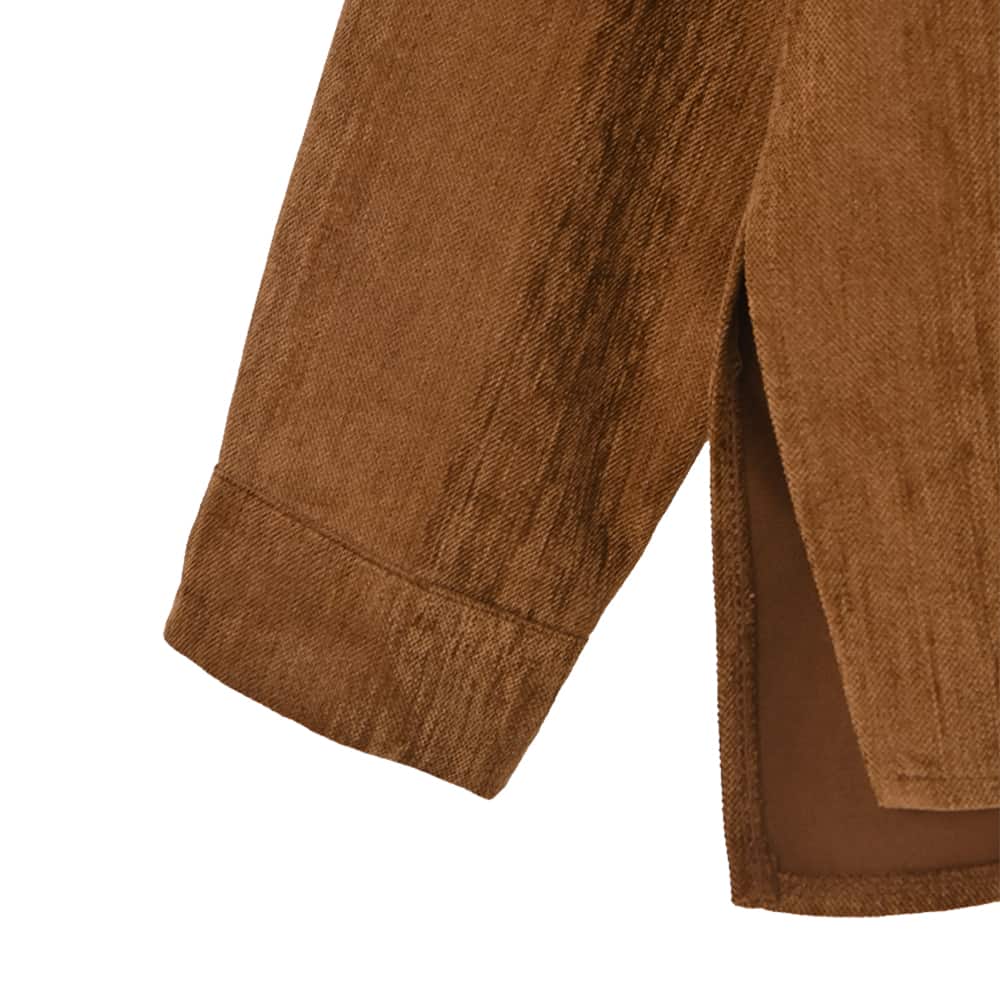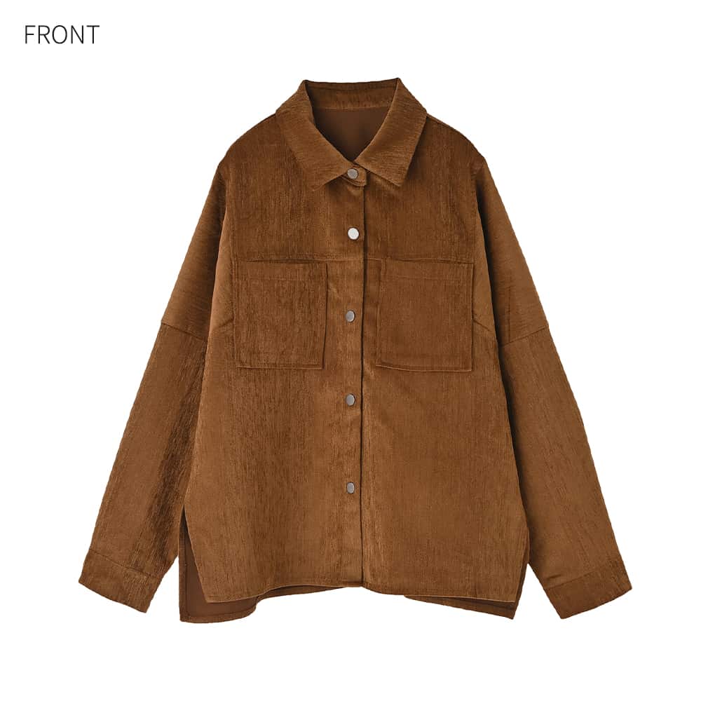 冬トップスのバリエーションを広げるベルベット調のオシャレ生地を使用したキレイめカジュアルな羽織りトップス◆11/27インスタライブご紹介商品◆アーカイブのご視聴はこちらから→【11/27ライブ】ーいつものデリより生地やデザインに凝った、ワンランク上のLUXE(ラグゼ)ライン。【このアイテムの特徴】◆今季はとくに気になるベロアやベルベット系の質感を持つ、オシャレな風合いのシャツ型ジャケットです。◆中にタートルネックカットソーやハイゲージニットなどを着て、トップスのように使用。前を開けてワンピースやサロペット、ジャンパースカートに羽織るのも素敵です。本質的な用途としては、大ヒット商品『厚地ジョーゼットブルゾンジャケット』みたいな存在です。◆比較的薄手のアイテムを真冬に着こなす為に、あると便利な暖かさ&オシャレ度UPアイテム。これを足すことで体型カバーも叶います。◆適度な厚みを持ちながらも厚ぼったさは無く、コートの下でもスッキリと着こなせる生地感。ウォーミィーな素材で暖かさもあり、快適な冬コーデが作れます。◆軽量で肩の凝らない着心地。シワにもなりにくくお手入れ面のストレスも感じないアイテムです。◆身幅がゆったりとした今っぽいスクエア系フォルム。合わせるボトムスはとくに選ばず、流行りのワイドパンツやロングスカートとも好相性です。◆縦方向に起毛ムラのような柄感を持つ、オシャレな雰囲気のベルベット調生地。当店の『ベルベット調テーラードジャケット』に質感が似ており、あれをシャツ用に薄くしたような生地です。◆暖かさは薄手のブルゾン程度。普通のシャツよりはだいぶ暖かいしっかり感があります。【その他の仕様などの情報】◆着用時期:10-4月頃が目安◆サイズ感:ゆったりめのサイズ感(Lサイズ体型にも対応)◆丈感:前は脚の付け根程度の丈感/背面はヒップが半分隠れるくらいの長さ◆シルエット:ゆったり身幅のストレート◆首元:シャツ襟◆肩幅:問わないタイプ(ドロップショルダー)◆アームホール:やや広め◆袖幅:やや広め◆袖丈:長袖(手の甲が隠れる長さ)◆袖口:スナップボタン開き◆袖のたくし上げ:可能◆厚み:普通-やや厚手◆伸縮性:なし◆光沢感:微光沢あり◆透け感:なし◆スリット:なし◆ポケット:左胸にあり(使用可能)◆着脱:フロントボタン開き◆ボタン:マットなシルバーのスナップボタン◆裏地:なし◆手洗い:可能◆アイロン:不要◆スチーマー:使用OK 【お色について】どちらのお色もオシャレな質感が加わることで、普通よりも魅力的な発色になっています。◆ネイビー:深みがあり、適度に青味を持つネイビー。人から見た時の印象は『普通のネイビー』で、とくに大きな個性的特徴はありません。◆キャメル:普通のキャメルよりも若干マスタード色のようなニュアンスを持つ、適度な明るさが出るオシャレなブラウン系カラー。赤味やオレンジ味を感じない発色です。【SNS用ハッシュタグ】#236052ベルベット調シャツ型ジャケット(このハッシュタグでInstagramなどSNS内で検索をしますと、こちらをお持ちのお客様のご投稿があれば、簡単に見つけてご覧いただくことができます)