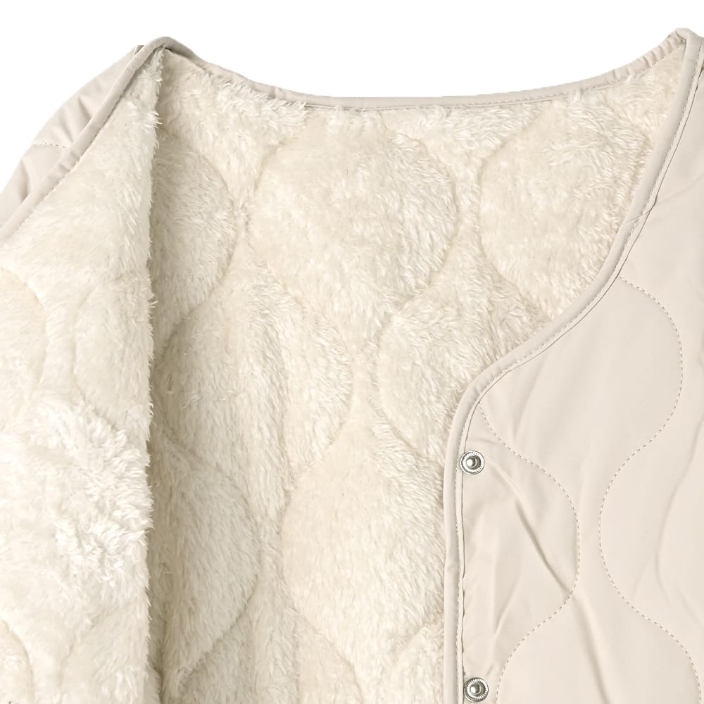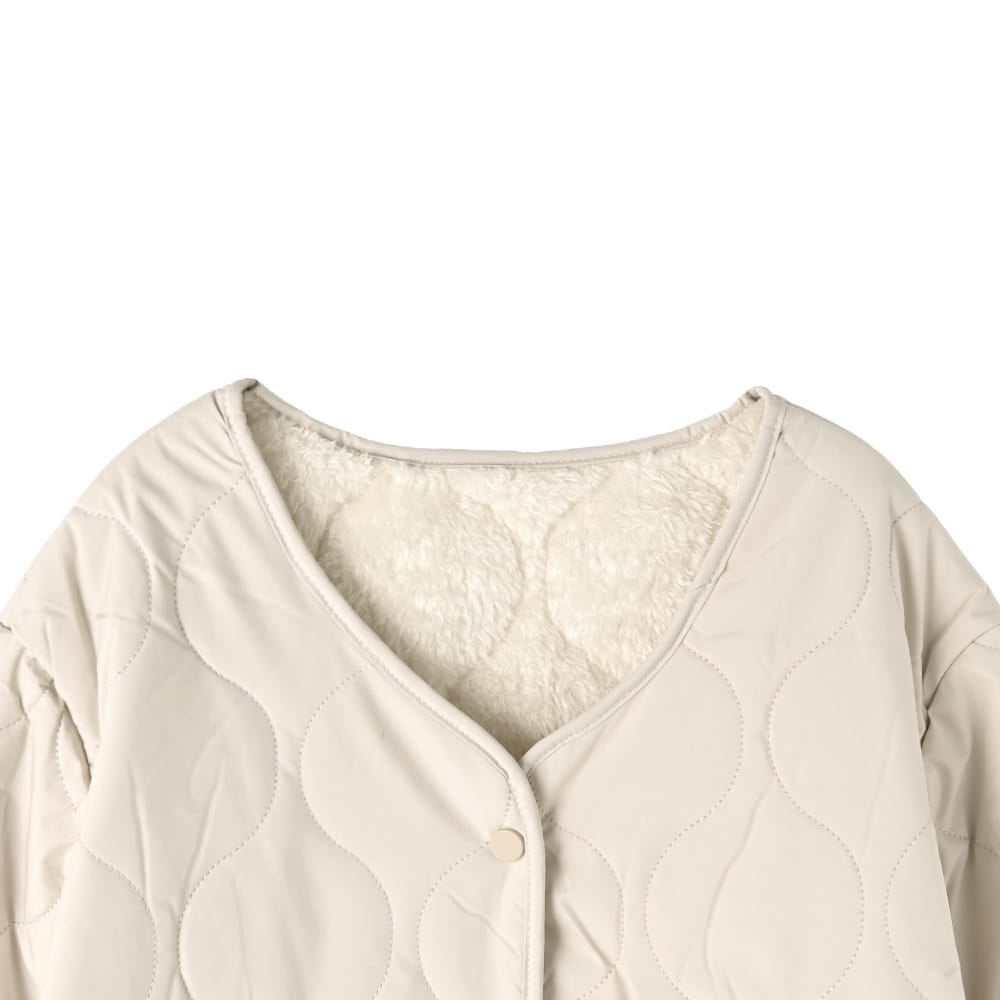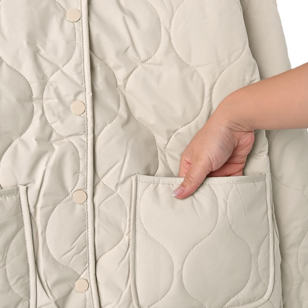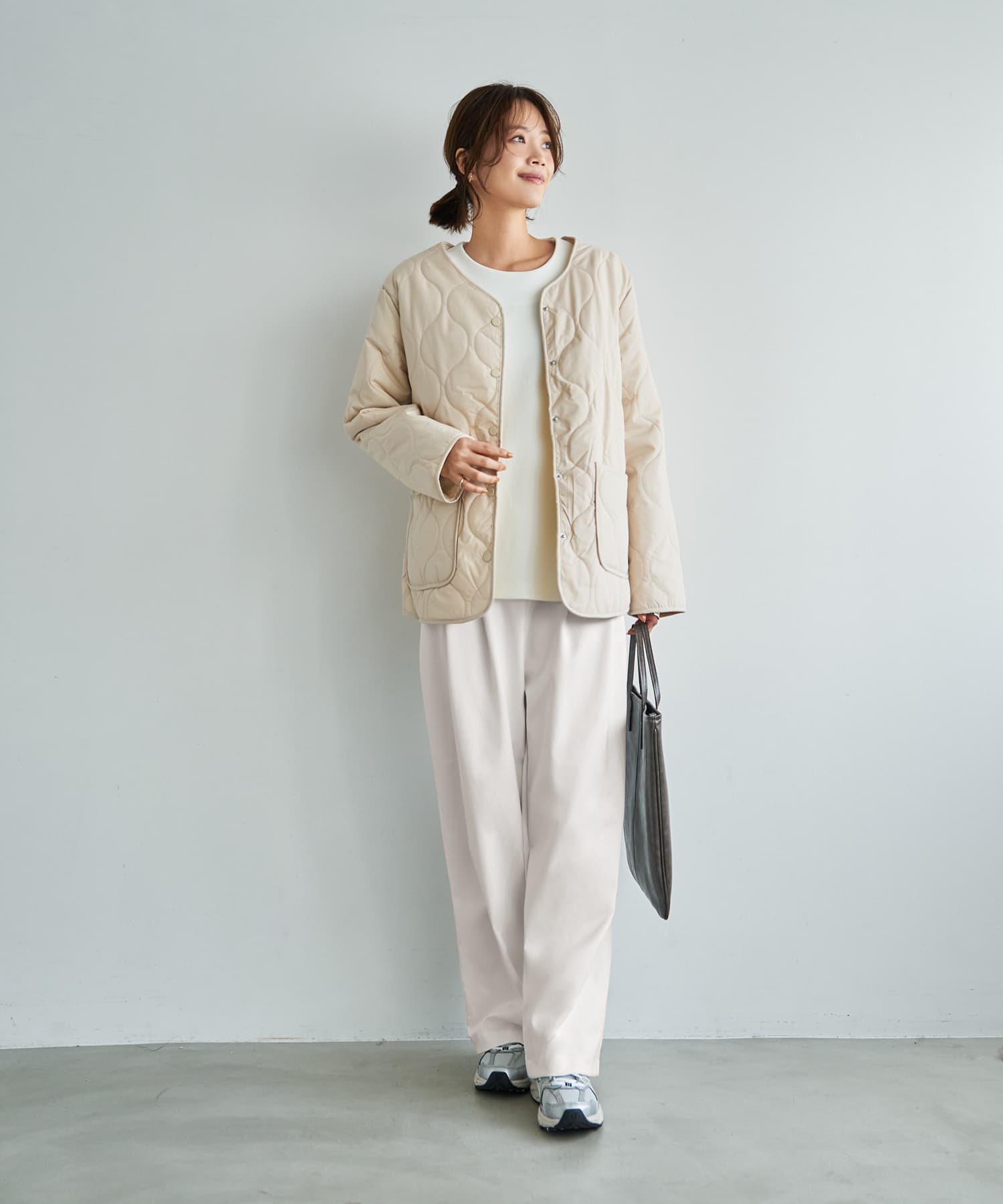 とっても軽くて、スッキリ見えて暖かい買ったけど着る時期がなかった!を防止見た目も可愛く実用&現実的な春コート◆1/8インスタライブご紹介商品◆アーカイブのご視聴はこちらから→【2026/1/8ライブ】【このコートの特徴】◆厚みが無くスッキリとした軽量仕上げ◆内ボアで暖かな着心地◆冬コートの下にも着れる◆インナーダウンより見た目がオシャレ◆膨張しないデザイン◆トレンドのショート丈◆暖かなトップスとしても着れる◆ラフだけど程よくキレイめ感もあり◆かさばらない省スペースアウター◆顔周りがスッキリと見えるVネック◆合わせるボトムスを問わず着回し力◎◆着る人の年代や系統を問わない【このコートの詳細】ひょうたんのような、びいどろのようなステッチが可愛い、スッキリとしたフォルムの中綿ジャケットコート。厚みは控えめで膨張せず、内側がボア張りで暖かさがあります。春になると冬コートは見た目に重くなり、かといって薄手の春コートでは寒い。というのが実際の気候の現実。そうこうしているうちに気温が上がり、せっかく買った春アウターを着るタイミングが少ない、というのは昨今の「あるある」です。ところがこのジャケットコートなら、このように長期間でフレキシブルに使えるため無駄になることがありません。↓◆スッキリとして冬コートの下にも着れるため、かなり寒い1/20~2/20頃の極寒期にも活躍。インナーダウンのような役割を、インナーダウンよりもオシャレなヴィジュアルで果たします。◆アウターとしてだけではなく、前を閉じてトップスのように着るのもカワイイ。室内で着ていてもおかしさの無いスッキリ感なので、寒い時期のお洋服としても活躍します。◆職場や庭での作業時など、肌寒さを回避しながら軽快に動きたいシーンにもお薦め。キレイめコーデにもカジュアルな格好にも合うデザインです。◆(実際にはけっこう寒い)春先になったら、いよいよ本来の役割であるアウターとして活躍。トレンドのショート丈でファッション性もバッチリです。【さらにプラス情報】◆暖かさ:春用の軽アウターとしてはかなり暖かさがある方。真冬のアウターとしては少し役不足。ただしインナーダウン的な存在としてはかなり優秀。車移動の方や暖かい地方にお住みの方ならこれで冬も越せると思います。◆サイズ感:イイ感じにゆったりとしており、11号体型までの方に対応。バストが大きい方でもパツパツになることはありません。アームホールや袖幅にもゆとりがあります。◆重ね着:中に厚手のニットを着込んだり、ジャケットの上に羽織ったりする程度のゆとりはあります。意外と何を着ていても羽織れます。◆軽さ:アウターとしてはかなり軽量です(480グラム程度)。◆膨張:こういった系統のアイテムの中では、かなりスッキリと見える方です。不要にボリュームアップしてしまうようなことはありません。◆お手入れ:中綿アイテムなので一応は手洗い不可ですが、最近は何でも家で洗う方も多いので、行いたい場合はネットで「中綿コート 手洗い」などのワードを検索してやり方を見て、自分で行うのも良いと思います(ただし恐れ入りますがトラブルの際は免責とさせていただきますので、自己責任でお願いいたします)。◆静電気:とくに発生しやすい生地ではありませんが、程度の差はその方の帯電体質具合や合わせアイテムなどによりますのと、冬場は乾燥でどうしても…というところはありますので、もしも気になる場合はエレガードなどの静電気防止スプレー等でご対処ください。【その他の仕様などの情報】◆着用時期:11-4月頃が目安◆サイズ感:ゆとりのあるサイズ感(Lサイズ体型にも対応)◆丈感:前は脚の付け根が隠れる丈感/背面はヒップの大部分が隠れる長さ◆シルエット:ストレート◆首元:カーブがかったVネック◆肩幅:広め◆アームホール:普通(とくに狭くも広くもない一般的な開き加減)◆袖幅:普通◆袖丈:長袖(手の甲が隠れる長さ)◆袖口:何もなし◆厚み:中綿アウターとしてはスッキリめ◆重さ:軽量(480グラム程度)◆柔らかさ:ハリ感の中に柔軟性もあり◆肌触り(表):サラッとしてハリっとした感じ◆肌触り(裏)細かくなめらかな毛布や起毛ブランケットのような感じ◆着用ジワ:できにくい◆毛羽立ち:できにくい◆伸縮性:ややあり◆光沢感:ほぼなし◆透け感:なし◆スリット:なし◆着脱:フロントスナップボタン開き◆ボタン:生地と同色染め◆ポケット:フロント左右にあり◆裏地:なし(裏ボア仕上げ)◆手洗い:一応は不可(説明文参照)◆アイロン:不要◆スチーマー:使用OK【お色について】◆ブラック:定番的な通常のブラックです。◆ブライトベージュ:ごく明るいイエロー系ベージュ。着ているとベージュという印象はあまり無く、「白っぽい感じのアウターを着ている人」という印象になります。【お知らせ事項】一般的に内ボア製品は、使い始めに繊維のカスが若干落ちるため、黒のニットなどに多少付着します。そんなに沢山付