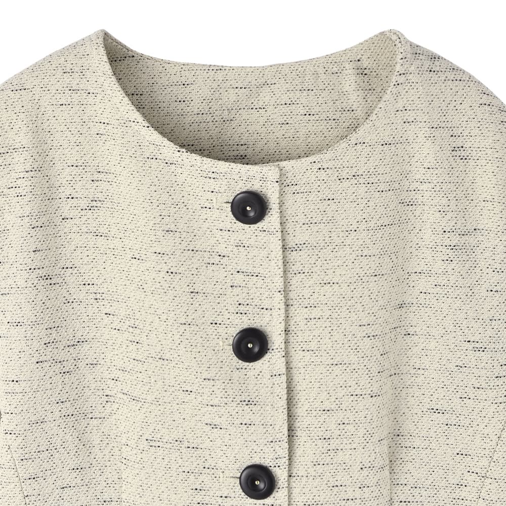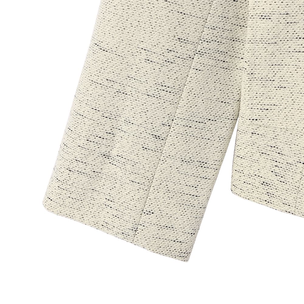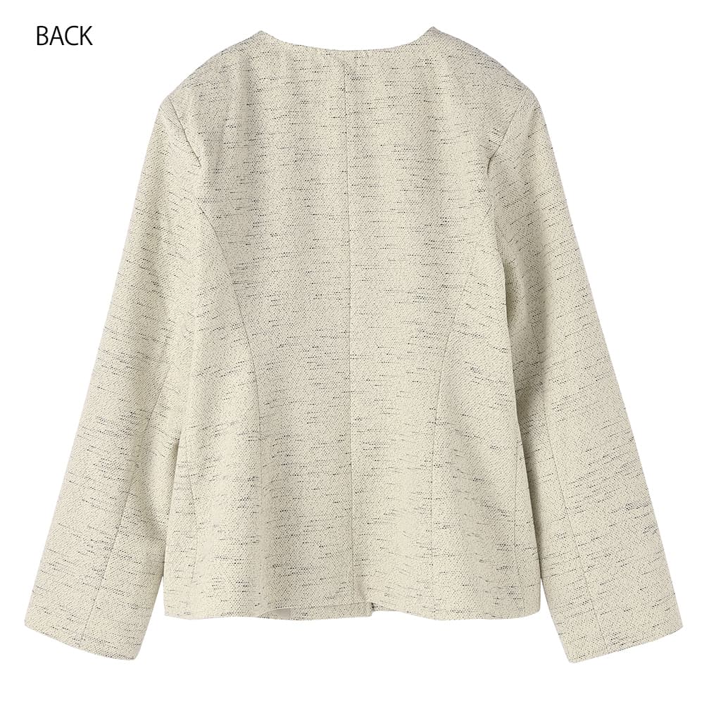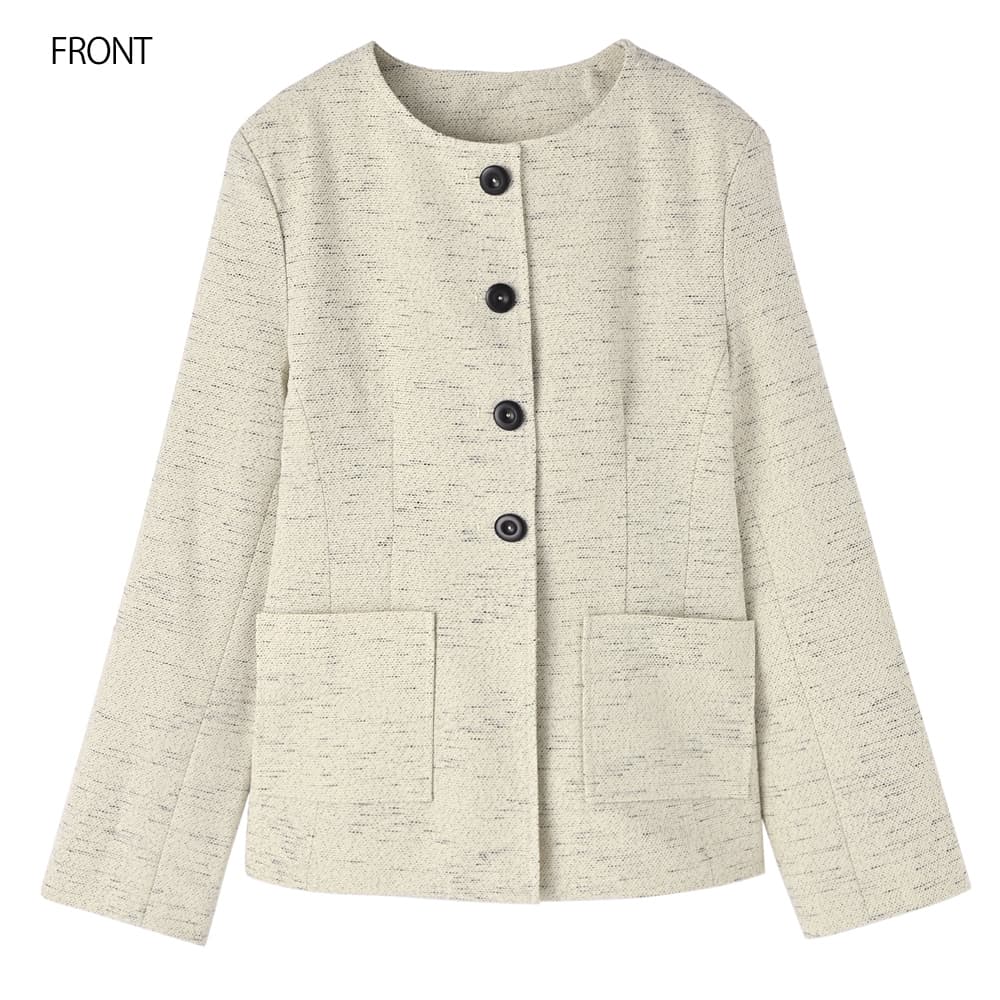 セレモニー対応/その他お仕事などにもオシャレな生地と立体フォルムが素敵な珍しい『スタイル抜群見え』ジャケット◆2/19インスタライブご紹介商品◆アーカイブのご視聴はこちらから→【2026/2/19ライブ】【このジャケットの特徴】別色の糸を飛ばし飛ばしで表に出し、柄のような表情を付けたとてもオシャレな生地のノーカラージャケット。ウエストがくびれたフォルムでスタイルがとてもよく見え、とくに後ろ姿のシルエットの美しさが際立ちます。◆胸囲部分(サイズ表記上は「身幅」)のみタイトめなお作り。下着を着けた状態でバストサイズ92cm以下の方にキレイにご着用いただけます。◆しっかりとしていますが厚みは無く、スッキリとして着心地は軽め。適度なハリ感でボディラインを美しく整えてくれます。◆基本的には前を閉じて着るジャケット。インナーの組み合わせを考えなくて良いため、着こなしが簡単というちょっと嬉しいポイントもあります。◆一見するとカッチリ感があるように見えて、フロントのパッチポケットが微量のカジュアル感をプラス。堅苦しさのないキレイめ感、という着やすい雰囲気を作っています。◆ほど良く華のあるジャケットですが、イベント感が強くないところも『使える』ポイント。コーディネート次第でセレモニー風、お仕事風、お食事用や観劇などの日常イベント、普段使い…と幅広く対応できます。◆ボタンのオシャレさもさりげないアクセント。内側がすり鉢状に凹んだ中央に、ゴールドの粒がちょこんと付いた可愛いデザインのボタンです。※色はマットなブラックです。【着こなしについて】◆ボトムス:パンツ全般と好相性。スカートの場合はフレア系がお薦め。チュール系スカートやバルーンスカートなど、少しデザイン性や華やかさのあるスカートと合わせるのも素敵です。◆アウター:トレンチコートなど、春アウターや冬コートは普通に着ることができます。◆重ね着:首元が詰まっていないため、ハイネックのレースインナーを首元から出したり、チラ見せ用の首詰まりインナーを見せたりという着こなしも楽しめます。◆前開け着用:前を開けて着用することもできますが、構造上インナーがほとんど見えない開き方をするため、いっそのこと閉じた方がまとまりが良く、ご自身的にもスッキリするかと思います。閉じたときのオシャレさ・素敵さが素晴らしいジャケットです。◆雰囲気:キレイめなボトムスやパンプスなどを合わせて華のある上品なスタイルを作ることもできますし、シンプルな黒パンツ合わせ+ローファーやスニーカーで、気取りの無い日常的なお仕事スタイルなどもOK。デニム合わせも素敵なので、少し崩したキレイめスタイルなども作れます。◆小物:上からロングネックレスをしたり、スカーフをプラスするのも今っぽくて◎ お好みでブローチや、セレモニーコーデならコサージュを付けても良いと思います。【さらにプラス情報】◆暖かさ:総裏地入りで春に暑過ぎない程度に暖かく、まだ肌寒い3-4月のイベント会場などにも◎ この上にトレンチコートや冬コートを着ることもでき、真夏以外に着用できます。◆サイズ感:身体にジャストサイズ(+動きやすさをキープするために必要なゆとり)というフォルムで着痩せ効果やスタイルUP感、スタイリッシュさを出しているジャケットなので、中に着るものはスッキリとしたカットソーや薄手のものが良く、中厚地以上のニットなどは向きません。◆肩パッド:一般的なジャケットと同様、肩のラインをキレイに四角く成形するためのパッドが内蔵されていて、取り外しはできません。ジャケットは肩がカクッとしている方がカッコいいため入れておくのがお薦めですが、いかり肩などで抜きたい方の場合は、洋裁の得意な方であれば裏地の縫い目をほどき→パッドを取って→また裏地を縫う。ということをすれば抜くことは可能です。◆お手入れ:ジャケットなので型崩れ防止の観点から、一応は手洗い不可としています。ただし最近ではジャケットもご自宅で手洗いをする方が増えてきておりますので、慣れている方であればセルフお手入れもできると思います(行う場合は自己責任の範囲内でお願いいたします/トラブルがおきた場合、恐れ入りますが免責とさせていただきます)。【その他の仕様などの情報】◆着用時期:夏以外◆サイズ感:Mサイズのジャストフィット系◆丈感:前は脚の付け根程度の丈感/背面はヒップが半分隠れる程度の長さ◆シルエット:Xライン◆首元:詰まっていないクルーネック◆肩幅:広め◆アームホール:普通(とくに狭くも広くもない一般的な開き加減)◆袖幅:普通◆袖丈:長袖(指の付け根が隠れる長さ)◆袖口:何も無し◆袖のたくし上げ:可能◆厚み:(ジャケットとして)普通◆柔らかさ:柔らかさよりはハリ感が目立ち、ハリ感の中にしなやかさがある感じ◆肌触り:表面はハリ感がありサラっとした感じ/裏面(裏地)は滑りが良い感じ◆着用ジワ:できにくい◆毛羽立ち:でき