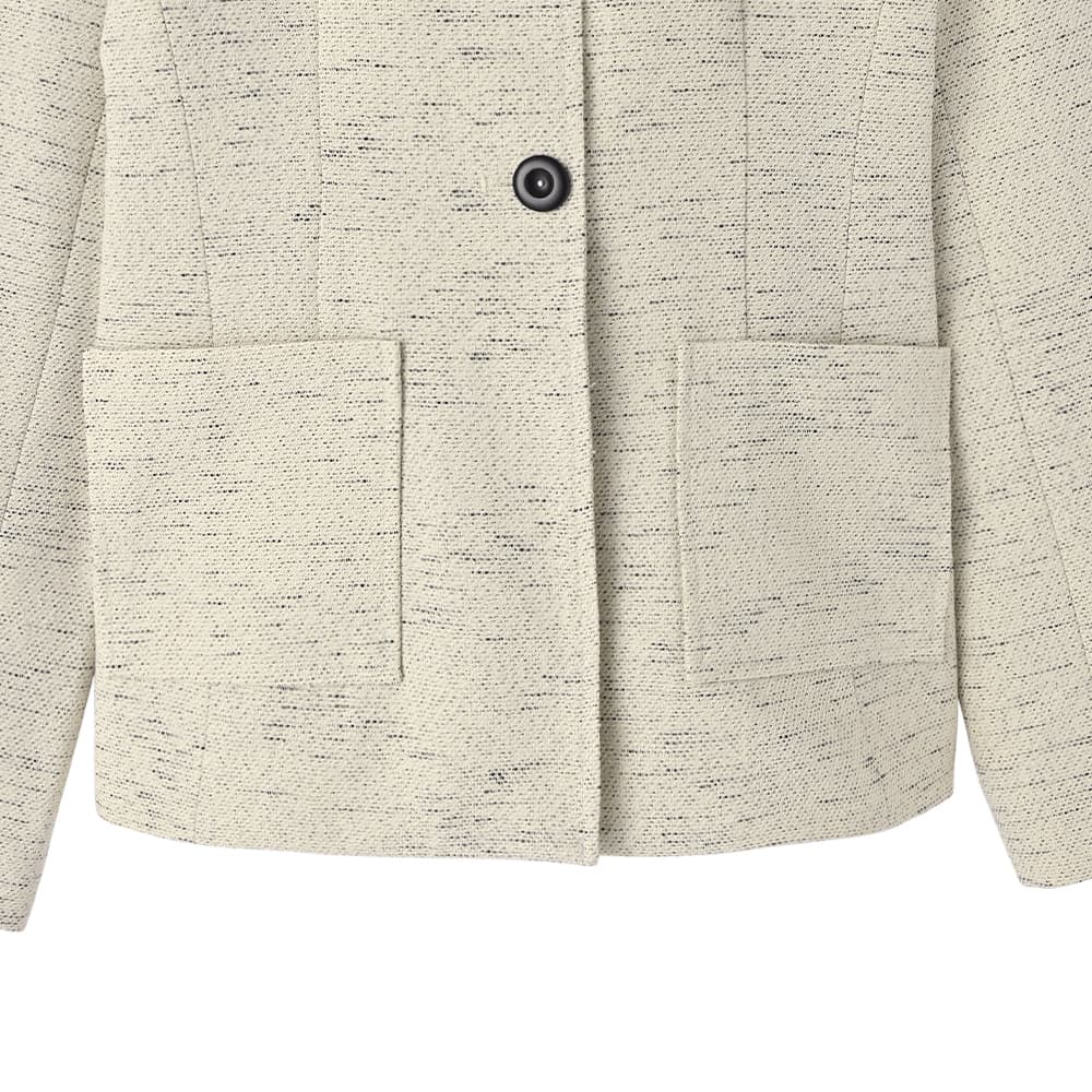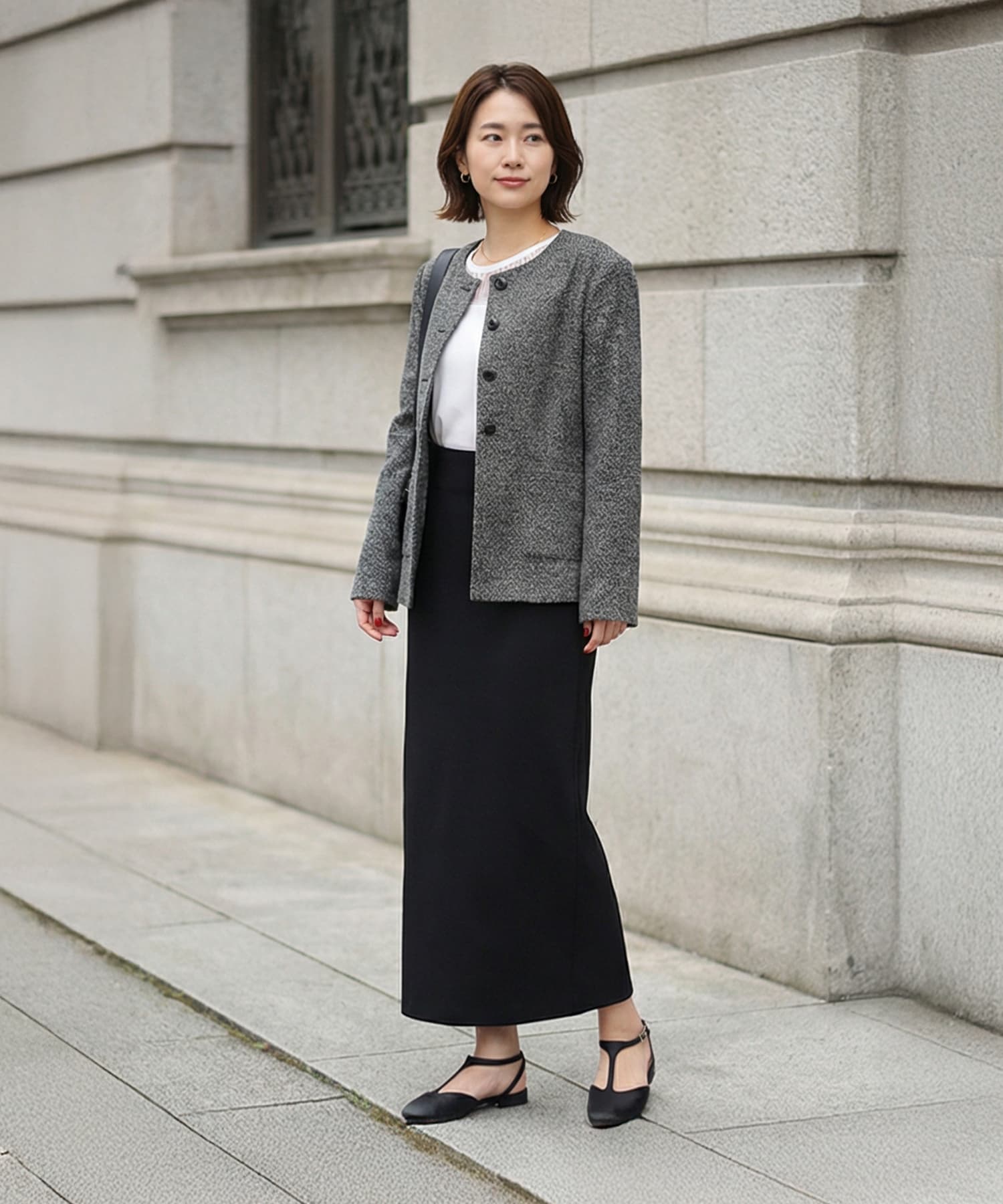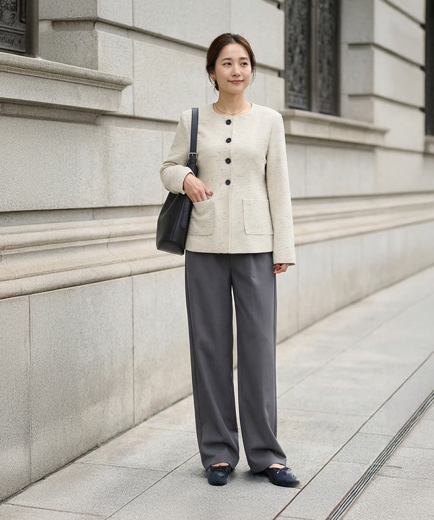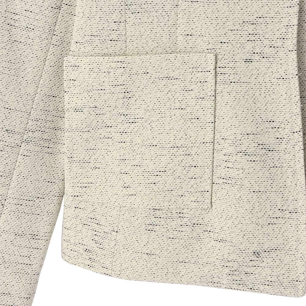 セレモニー対応/その他お仕事などにもオシャレな生地と立体フォルムが素敵な珍しい『スタイル抜群見え』ジャケット◆2/19インスタライブご紹介商品◆アーカイブのご視聴はこちらから→【2026/2/19ライブ】【このジャケットの特徴】別色の糸を飛ばし飛ばしで表に出し、柄のような表情を付けたとてもオシャレな生地のノーカラージャケット。ウエストがくびれたフォルムでスタイルがとてもよく見え、とくに後ろ姿のシルエットの美しさが際立ちます。◆胸囲部分(サイズ表記上は「身幅」)のみタイトめなお作り。下着を着けた状態でバストサイズ92cm以下の方にキレイにご着用いただけます。◆しっかりとしていますが厚みは無く、スッキリとして着心地は軽め。適度なハリ感でボディラインを美しく整えてくれます。◆基本的には前を閉じて着るジャケット。インナーの組み合わせを考えなくて良いため、着こなしが簡単というちょっと嬉しいポイントもあります。◆一見するとカッチリ感があるように見えて、フロントのパッチポケットが微量のカジュアル感をプラス。堅苦しさのないキレイめ感、という着やすい雰囲気を作っています。◆ほど良く華のあるジャケットですが、イベント感が強くないところも『使える』ポイント。コーディネート次第でセレモニー風、お仕事風、お食事用や観劇などの日常イベント、普段使い…と幅広く対応できます。◆ボタンのオシャレさもさりげないアクセント。内側がすり鉢状に凹んだ中央に、ゴールドの粒がちょこんと付いた可愛いデザインのボタンです。※色はマットなブラックです。【着こなしについて】◆ボトムス:パンツ全般と好相性。スカートの場合はフレア系がお薦め。チュール系スカートやバルーンスカートなど、少しデザイン性や華やかさのあるスカートと合わせるのも素敵です。◆アウター:トレンチコートなど、春アウターや冬コートは普通に着ることができます。◆重ね着:首元が詰まっていないため、ハイネックのレースインナーを首元から出したり、チラ見せ用の首詰まりインナーを見せたりという着こなしも楽しめます。◆前開け着用:前を開けて着用することもできますが、構造上インナーがほとんど見えない開き方をするため、いっそのこと閉じた方がまとまりが良く、ご自身的にもスッキリするかと思います。閉じたときのオシャレさ・素敵さが素晴らしいジャケットです。◆雰囲気:キレイめなボトムスやパンプスなどを合わせて華のある上品なスタイルを作ることもできますし、シンプルな黒パンツ合わせ+ローファーやスニーカーで、気取りの無い日常的なお仕事スタイルなどもOK。デニム合わせも素敵なので、少し崩したキレイめスタイルなども作れます。◆小物:上からロングネックレスをしたり、スカーフをプラスするのも今っぽくて◎ お好みでブローチや、セレモニーコーデならコサージュを付けても良いと思います。【さらにプラス情報】◆暖かさ:総裏地入りで春に暑過ぎない程度に暖かく、まだ肌寒い3-4月のイベント会場などにも◎ この上にトレンチコートや冬コートを着ることもでき、真夏以外に着用できます。◆サイズ感:身体にジャストサイズ(+動きやすさをキープするために必要なゆとり)というフォルムで着痩せ効果やスタイルUP感、スタイリッシュさを出しているジャケットなので、中に着るものはスッキリとしたカットソーや薄手のものが良く、中厚地以上のニットなどは向きません。◆肩パッド:一般的なジャケットと同様、肩のラインをキレイに四角く成形するためのパッドが内蔵されていて、取り外しはできません。ジャケットは肩がカクッとしている方がカッコいいため入れておくのがお薦めですが、いかり肩などで抜きたい方の場合は、洋裁の得意な方であれば裏地の縫い目をほどき→パッドを取って→また裏地を縫う。ということをすれば抜くことは可能です。◆お手入れ:ジャケットなので型崩れ防止の観点から、一応は手洗い不可としています。ただし最近ではジャケットもご自宅で手洗いをする方が増えてきておりますので、慣れている方であればセルフお手入れもできると思います(行う場合は自己責任の範囲内でお願いいたします/トラブルがおきた場合、恐れ入りますが免責とさせていただきます)。【その他の仕様などの情報】◆着用時期:夏以外◆サイズ感:Mサイズのジャストフィット系◆丈感:前は脚の付け根程度の丈感/背面はヒップが半分隠れる程度の長さ◆シルエット:Xライン◆首元:詰まっていないクルーネック◆肩幅:広め◆アームホール:普通(とくに狭くも広くもない一般的な開き加減)◆袖幅:普通◆袖丈:長袖(指の付け根が隠れる長さ)◆袖口:何も無し◆袖のたくし上げ:可能◆厚み:(ジャケットとして)普通◆柔らかさ:柔らかさよりはハリ感が目立ち、ハリ感の中にしなやかさがある感じ◆肌触り:表面はハリ感がありサラっとした感じ/裏面(裏地)は滑りが良い感じ◆着用ジワ:できにくい◆毛羽立ち:でき