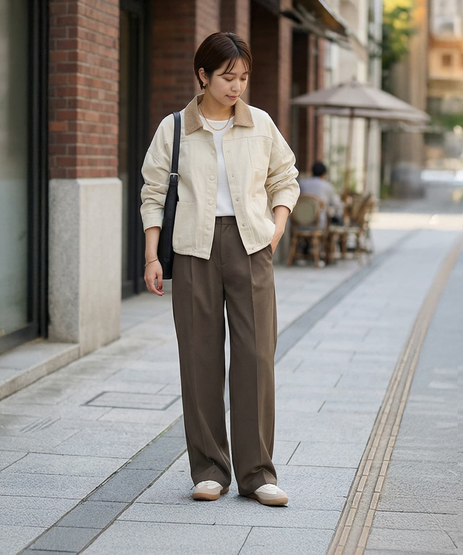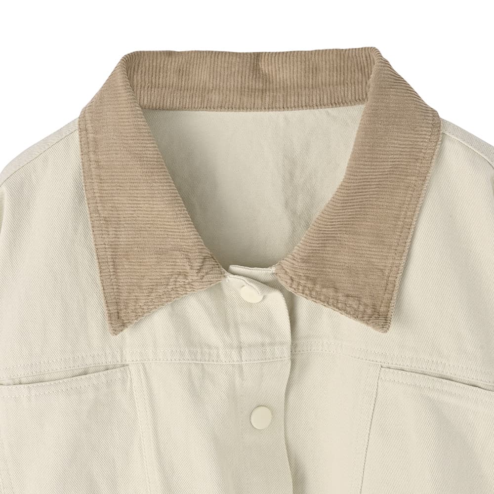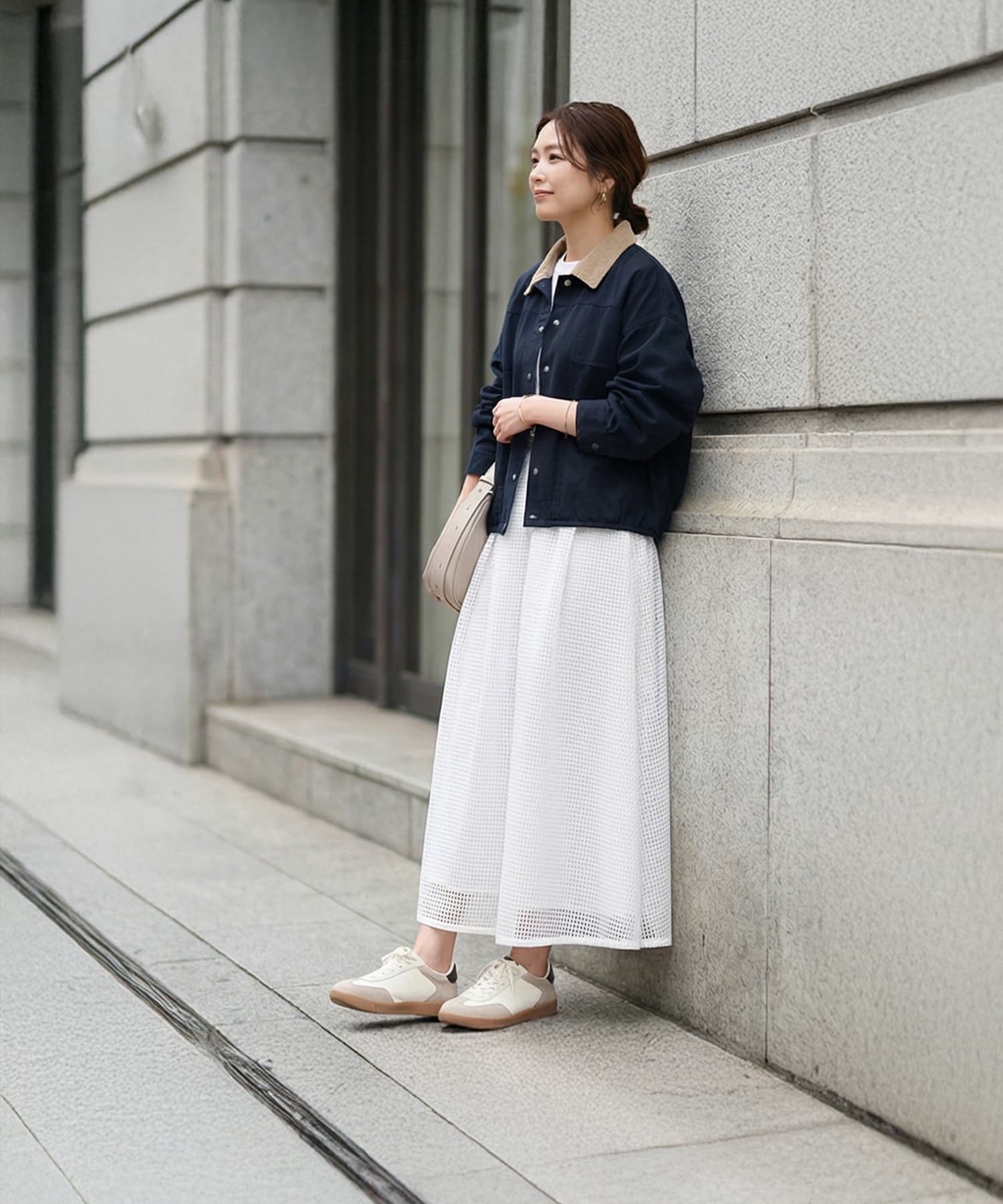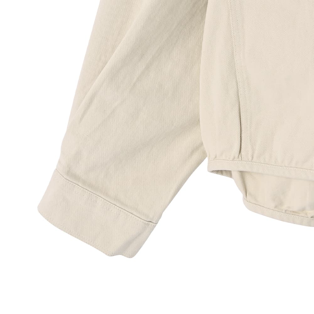 スカートやワイドパンツが多い方に◎肩凝りとは無縁の軽やかない着心地コットン素材の旬ディテールアウター◆2/19インスタライブご紹介商品◆アーカイブのご視聴はこちらから→【2026/2/19ライブ】【このアウターの特徴】◆旬な雰囲気を持つ春・秋用アウタージャケット◆カジュアル感やメンズ感が控えめで女性らしい◆若過ぎる感じに見えない大人仕様◆最近人気のショート丈感アウター◆綿100%素材で軽やかな着心地◆意外と何にでも合う、高い着回し力◆丸みを出した裾処理がカワイイ◆今どきボトムスやスカートとの相性◎◆老け見えしない洗練デザイン◆体型を強調しないゆったりめのサイズ感【このアウターの詳細】◆寒さの山を超えた時期から活躍する、軽く羽織れる中間シーズン用アウター。Gジャンのような気軽な感覚で羽織れるブルゾンです。◆ゴワつきが心配なコットンアウターですが、これは適度に柔らかく・スッキリとした感じで着れるタイプ。動きづらい硬さなども無く快適です。◆厚みが控えめなので真冬の時期はこの上に冬コートを着るのもOK。室内で着ていても違和感の無い軽さがあり、シャツジャケットやカーディガン的な使い方もできます。◆旬なフィールドコートの雰囲気を取り入れたデザイン。素材もコットンですが何故か女性らしさがあり、強いカジュアル感やメンズライクなテイストが苦手な方にもお薦めです。◆最近のトレンドである短めアウターですが、極端に短いわけでもない大人仕様。フレアスカートなどの広がるボトムスやワイドパンツなどと相性の良い丈感で、今っぽい雰囲気になります。 ◆自然な丸み立体感が出る、斜め後ろや背面から見たシルエットがとてもカワイイ。背中の厚みや肉感をカバーし、年齢感の無い後ろ姿を作ってくれます。◆裾はトリミング状に生地を挟み込みギャザーを付けた、凝っていて珍しいデザイン。シルエットの可愛さや女性らしさはここから生まれています。◆配色襟の色は両色で共通。ミルクキャラメルを少し薄くしたような明るいベージュで、冬っぽさの無いタイプのコーデュロイ生地です。→この明るいベージュが着回しにくさや似合う人の肌色を問うかと言えばNOで、それがこのジャケットの秀逸ポイント。いわば人間の肌のような役割りをするため馴染みが良く、色として主張してくることがありません。襟としての主張も控えめになります。=襟付きデザインやベージュが苦手な方にもその影響を与えず、お薦めできます。【さらにプラス情報】◆暖かさ:Gジャンよりも若干涼しい感じ。春先の軽いアウターとしては及第点。ゆったりとしているため、中に着込んでもっと暖かく着ることもできます。◆重さ:アウターとしては超軽量の部類に入る軽さ。シャツジャケット的な感じの軽やかな着心地です。◆ボタン:スナップボタンの表面が平らでスッキリとしており、オシャレなところもポイント。これがカジュアル感やコドモっぽさを軽減するのに大きな役割を果たしています。◆着用ジワ:肘の内側などのシワが心配、というイメージがコットンにはありますが、これはさほど気にならないタイプ。Gジャンもコットンですが気にならないのと同じ感じで、これもシワが(完全にゼロではないけど)気にならない、というイメージです。◆お手入れ:もしも気になるシワができた場合は、霧吹きをたっぷりとかけてやや大袈裟気味に湿らせ、手指でシワを撫で伸ばして→ハンガーに掛けておくと良いと思います。アイロンは不要ですが、お好みでかけてもOKです。◆手洗い:素材的に手洗いは可能ですが、洗う頻度は極力抑えて最低限にするのが良いと思います。柔軟剤を省くと繊維がギュッと縮み、生地が硬くなりますのでご注意ください。※アウターですので、日常的な殺菌や消臭、花粉などの対策はスチーマーで行い、シーズンオフに1回クリーニングに出すだけでも十分です。【その他の仕様などの情報】◆着用時期:春先と秋口/冬はこの上にコートを着てもOK◆サイズ感:ゆったりとしたサイズ感(LLサイズ体型にも対応)◆丈感:前は脚の付け根程度の丈感/背面は腰が隠れる長さ◆シルエット:丸み立体感系(前から見るとストレートっぽい)◆首元:ステンカラー◆肩幅:問わないタイプ(ドロップショルダー)◆アームホール:広い◆袖幅:広い◆袖丈:長袖(指が半分出る長さ)◆袖口:カフス+スナップボタン1個あり◆袖のたくし上げ:可能◆厚み:アウターとしてはやや薄手◆柔らかさ:柔らかさよりはハリ感が勝る◆肌触り:サラッとしたコットン生地の肌触り◆着用ジワ:気にならない◆毛羽立ち:できにくい◆伸縮性:なし◆光沢感:なし◆透け感:なし◆スリット:なし◆着脱:フロントボタン開き◆ボタン:スナップボタン◆ポケット:フロントの左右および上下に計4つあり◆裏地:なし◆手洗い:可能◆アイロン:不要◆スチーマー:使用OK【お色について】◆ネイビー:明度は暗めでブルーの色素が控えめのネイビーです。◆ブライトベージュ:エクリュと