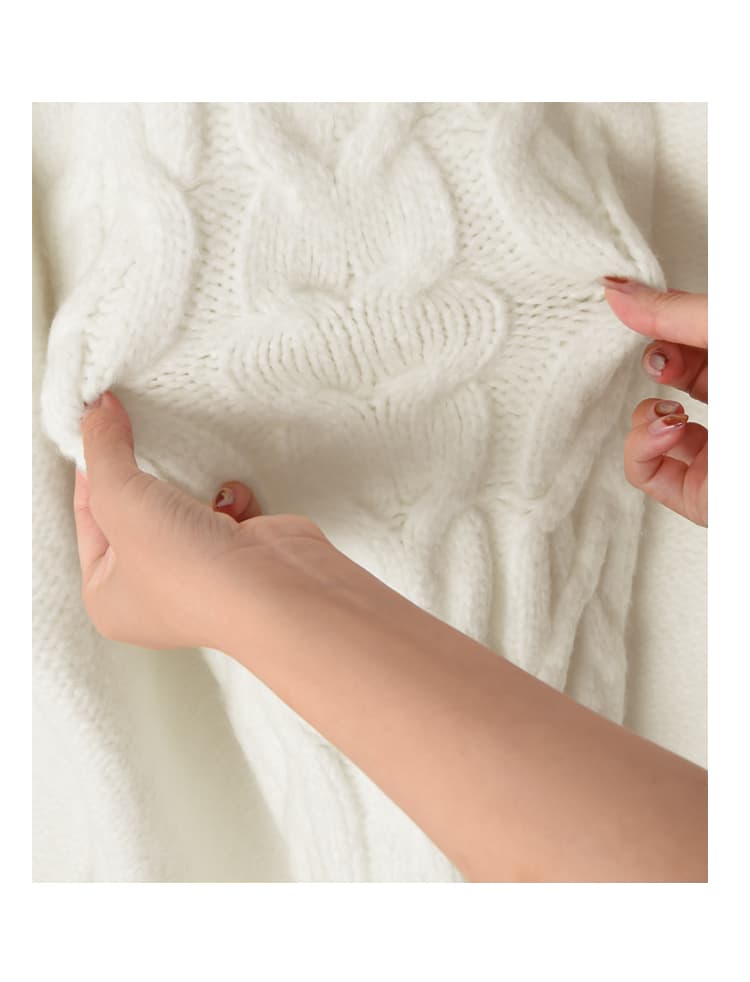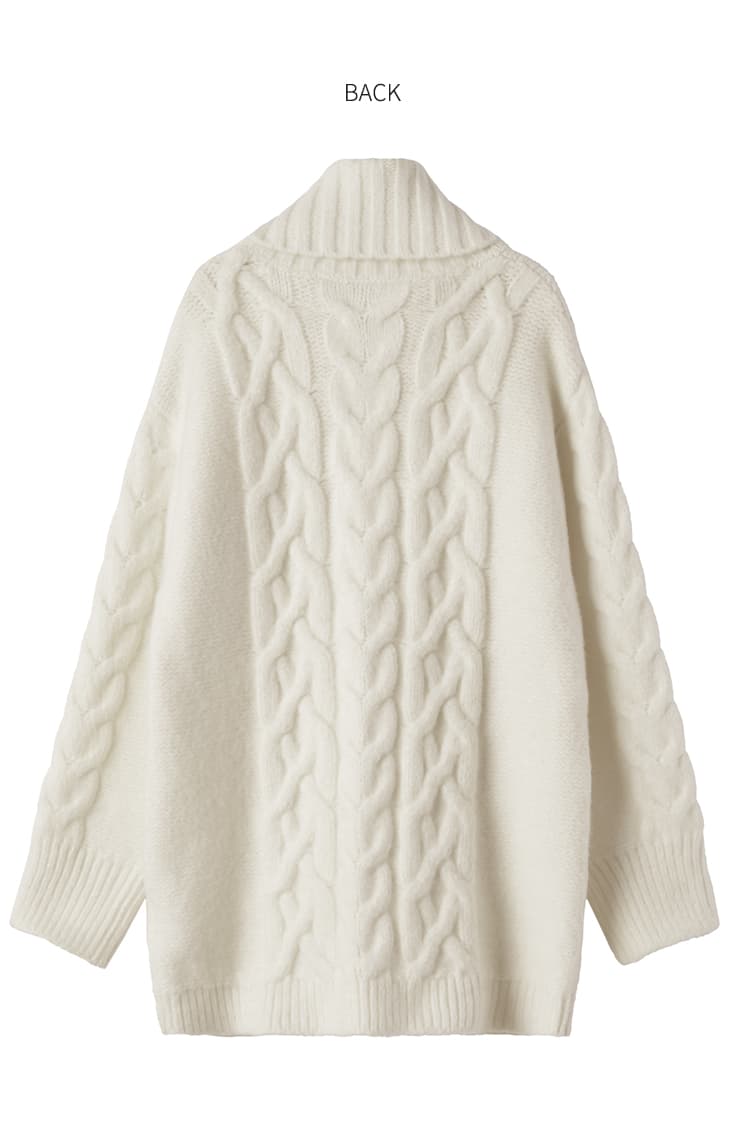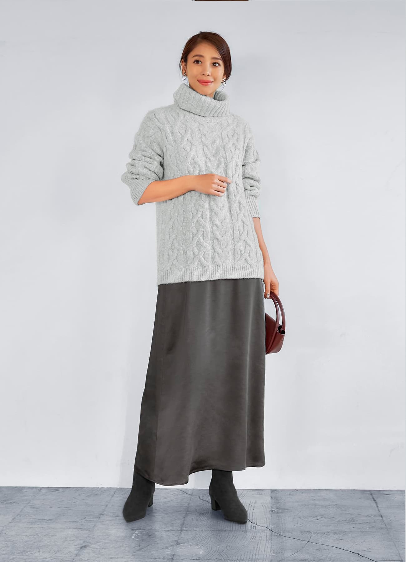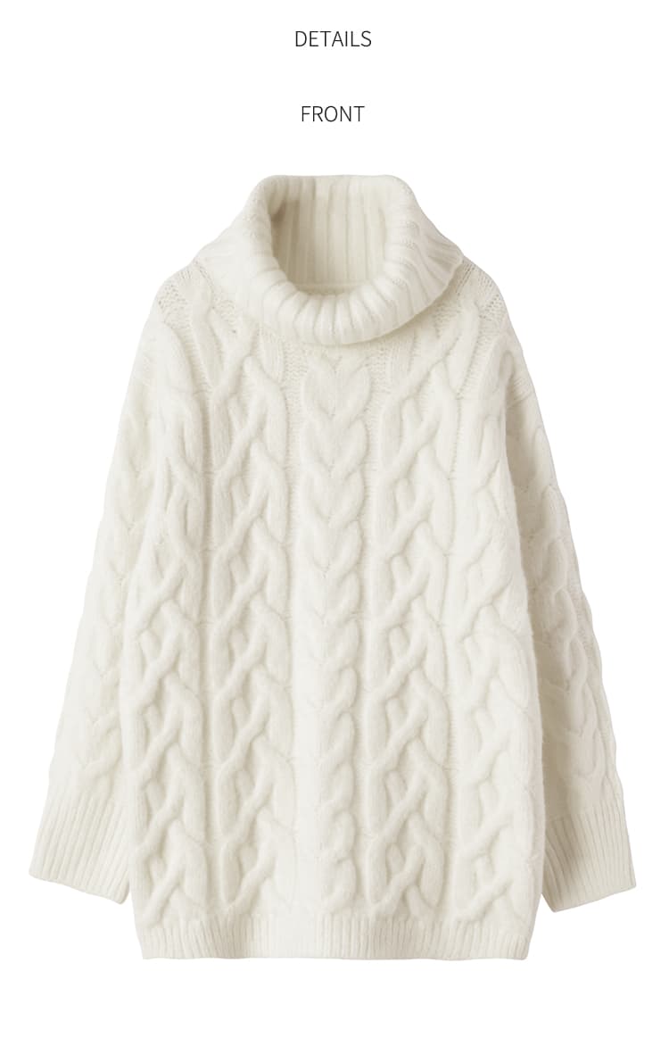 着るだけで雰囲気が出るニット。暖かさもピカ一な冬の本命アイテム。バルキーな質感がカワイイ、ケーブル模様編みのタートルネックニット。見た目通りにとても暖かく、凍える寒い日の味方になってくれそうなニットです。ボディ前側部分は全面にケーブルを入れ、背面側は中央寄せ、袖は部分的にケーブル模様…という具合に場所によって模様の入れ方を変えており、ケーブルニットにつきまとう『着太り』や『腕がゴツく見える』問題を極力解決すべく設計されています。ネックのタートル部分は、首から少し離れる感じにゆとりを付けた、スタンドネックに近いサイズ感。首が窮屈にならず、顔も大きく見せないようにしつつ、化粧崩れの心配もしなくて済むよう考えられています。全体的にデザイン性があり、完成度の高いニットトップス。着るだけで絵になりサマになる、簡単にオシャレさが出せる一枚です。【デザインや仕様について】◆ケーブル編みのバルキーなタートルネックニット。◆昔から続く普遍的なデザインで、褪せない可愛さが持続するタイプ(長く愛用できます)。◆模様部分の立体感にもこだわった、ホンモノ志向な大人クオリティデザイン。◆タートルネックのストレス要素を解決すべく考えられたネック設計。◆裾はリブでキュッと締めず、ストレートに落とした今っぽいライン。ボトムスの形を潰さず、腹部のカバー効果も◎◆スカートにもパンツにも合わせやすい丈感&シルエット。◆太もも上部にかかる丈感。ヒップは半分隠れるくらいの長さ。◆適度にゆとりのあるサイズ感。◆ボタン等:なし(かぶり着タイプ)◆手洗い可能【生地について】もっちりと弾力感のある、しっかりとした編み地。肌触りはシルキーで柔らかく、ガサつきの無い快適な感じです。本当にこの値段?と感じるほどに高級感があり、他ではなかなか見つからない質感です(※最終的な感じ方には個人差があります)。◆暖かさ:とても暖かい◆チクチク感:基本的に感じません(スタッフ総評の判断です)◆毛羽立ち:おきにくい生地です◆厚み:厚地◆重さ:手に持つとそこそこ重め。こういったニットの中では軽量。着ると重さは気にならず。◆伸縮性:あり◆光沢感:なし◆透け感:なし【お手入れについて】こちらは風合いに高級感があり、何も考えずに洗いますと型崩れや縮みのリスクがありますため、手洗いOK表示は付けておりません。インナーを着用すればそこまで汚れるものでもありませんため、日常的なお手入れはスチーマーで消臭・殺菌をして質感を整えるのがお薦めです。たまにクリーニングに出していただければ十分ですが、どうしてもご自宅でお手入れをなさりたい場合は、高級カシミヤ製品やウール製品を手洗いしている経験の豊富な方でしたら、行っていただける感じではあります。ただし、お手入れに関してはトラブルが起きましても免責とさせていただきますので、あくまで自己責任の範囲内において行うようお願いいたします。【お色について】◆アイボリー:真っ白ではなく、肌馴染みの良さを入れた優しいホワイト。とくにクリーム色っぽかったりはしない、白ニットとしては定番的なホワイトの単色編みです。◆ライトグレー:明るいグレーとアイボリー色の糸が混ざったMIX糸の優しいグレー。ライトグレーの中でも明るめの色合いです。【SNS用ハッシュタグ】#234501ケーブル編みボリュームニット(このハッシュタグでInstagramなどSNS内で検索をしますと、こちらをお持ちのお客様のご投稿があれば、簡単に見つけてご覧いただくことができます)