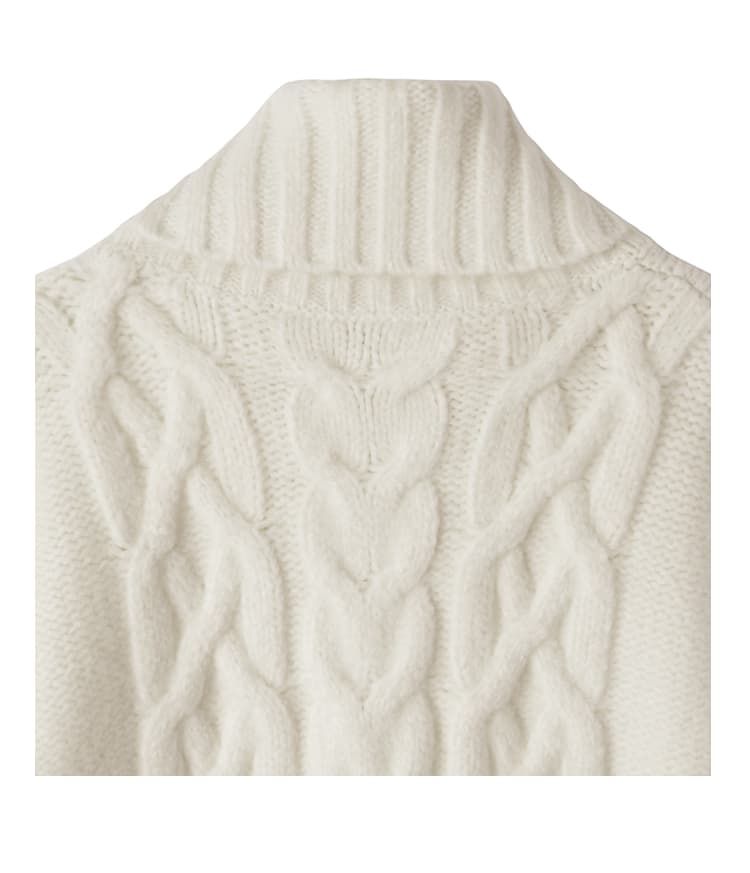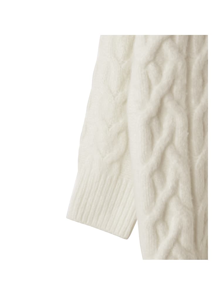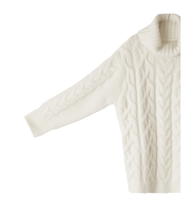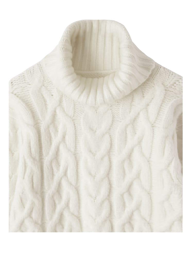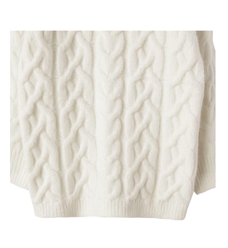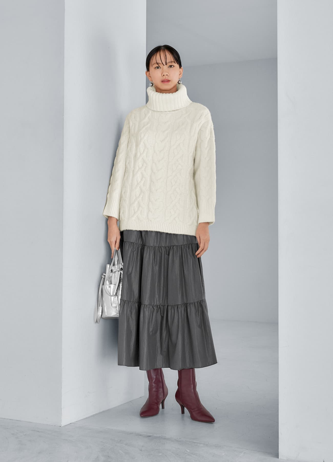 着るだけで雰囲気が出るニット。暖かさもピカ一な冬の本命アイテム。バルキーな質感がカワイイ、ケーブル模様編みのタートルネックニット。見た目通りにとても暖かく、凍える寒い日の味方になってくれそうなニットです。ボディ前側部分は全面にケーブルを入れ、背面側は中央寄せ、袖は部分的にケーブル模様…という具合に場所によって模様の入れ方を変えており、ケーブルニットにつきまとう『着太り』や『腕がゴツく見える』問題を極力解決すべく設計されています。ネックのタートル部分は、首から少し離れる感じにゆとりを付けた、スタンドネックに近いサイズ感。首が窮屈にならず、顔も大きく見せないようにしつつ、化粧崩れの心配もしなくて済むよう考えられています。全体的にデザイン性があり、完成度の高いニットトップス。着るだけで絵になりサマになる、簡単にオシャレさが出せる一枚です。【デザインや仕様について】◆ケーブル編みのバルキーなタートルネックニット。◆昔から続く普遍的なデザインで、褪せない可愛さが持続するタイプ(長く愛用できます)。◆模様部分の立体感にもこだわった、ホンモノ志向な大人クオリティデザイン。◆タートルネックのストレス要素を解決すべく考えられたネック設計。◆裾はリブでキュッと締めず、ストレートに落とした今っぽいライン。ボトムスの形を潰さず、腹部のカバー効果も◎◆スカートにもパンツにも合わせやすい丈感&シルエット。◆太もも上部にかかる丈感。ヒップは半分隠れるくらいの長さ。◆適度にゆとりのあるサイズ感。◆ボタン等:なし(かぶり着タイプ)◆手洗い可能【生地について】もっちりと弾力感のある、しっかりとした編み地。肌触りはシルキーで柔らかく、ガサつきの無い快適な感じです。本当にこの値段?と感じるほどに高級感があり、他ではなかなか見つからない質感です(※最終的な感じ方には個人差があります)。◆暖かさ:とても暖かい◆チクチク感:基本的に感じません(スタッフ総評の判断です)◆毛羽立ち:おきにくい生地です◆厚み:厚地◆重さ:手に持つとそこそこ重め。こういったニットの中では軽量。着ると重さは気にならず。◆伸縮性:あり◆光沢感:なし◆透け感:なし【お手入れについて】こちらは風合いに高級感があり、何も考えずに洗いますと型崩れや縮みのリスクがありますため、手洗いOK表示は付けておりません。インナーを着用すればそこまで汚れるものでもありませんため、日常的なお手入れはスチーマーで消臭・殺菌をして質感を整えるのがお薦めです。たまにクリーニングに出していただければ十分ですが、どうしてもご自宅でお手入れをなさりたい場合は、高級カシミヤ製品やウール製品を手洗いしている経験の豊富な方でしたら、行っていただける感じではあります。ただし、お手入れに関してはトラブルが起きましても免責とさせていただきますので、あくまで自己責任の範囲内において行うようお願いいたします。【お色について】◆アイボリー:真っ白ではなく、肌馴染みの良さを入れた優しいホワイト。とくにクリーム色っぽかったりはしない、白ニットとしては定番的なホワイトの単色編みです。◆ライトグレー:明るいグレーとアイボリー色の糸が混ざったMIX糸の優しいグレー。ライトグレーの中でも明るめの色合いです。【SNS用ハッシュタグ】#234501ケーブル編みボリュームニット(このハッシュタグでInstagramなどSNS内で検索をしますと、こちらをお持ちのお客様のご投稿があれば、簡単に見つけてご覧いただくことができます)
