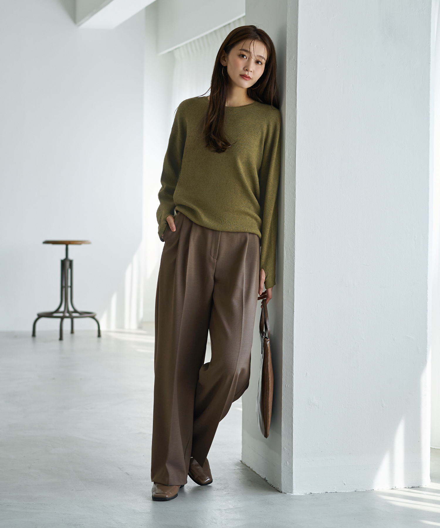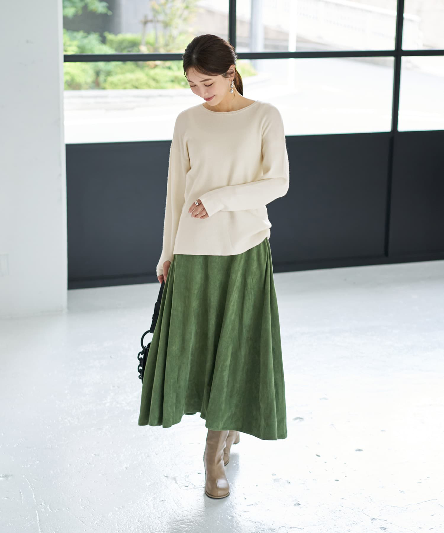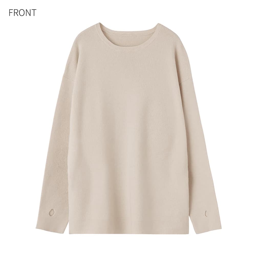 柔らかな空気感が魅力の『ソフトタッチ』-指あきタイプの長袖T型ニット-ほんわりとエアリーな質感で軽い着心地。毛羽立ちしにくくチクチク感もない、柔らかな『ソフトタッチ』ニットシリーズです。このシリーズは弊社社長が早期に大量の糸を買い付けることで、お買い求めしやすい価格を実現したニットたち。いつもよりお気軽にお楽しみいただけるお薦めのシリーズですので、ぜひ毎日のオシャレにご活用いただければと思います。【こちらのデザインは】一見するとピッタリ系のシンプルニットに見えますが、実は絶妙なゆとりで秀逸なシルエットを出せる一枚。まるで長袖Tシャツを着ているような、『身体に沿わないあの感じ』が出せる珍しい形のニットです。二の腕や下腹部にはり付くことなく、ほんわりと『身体から浮く』ような着心地。かといってゆったり大きいわけでもなく、ピッタリとは異なる『準コンパクト』系なシルエットにまとめてくれます。裾を内側に折り返せば、ウエストに裾インしなくても好みの長さにして着用OK。もちろんウエストにインしても良く、モタつきを気にせずに着こなしが作れます。一枚で着るのはもちろん、ジャンパースカート等のインナーとしても活躍。フィット系のコンパクトニットだとピチピチしてしまうから今まで着れなかった…という体型の方にも向いています。※親指が出せる穴が袖口に開いた、少しカジュアル感のあるデザインになっています。【商品の特徴】◆着用時期:秋冬◆サイズ感:ピッタリし過ぎないサイズ感◆丈感:下腹部が隠れる程度の丈感◆シルエット:ボトムスとのバランスが取りやすいシルエット◆首元のデザイン:空きすぎていないクルーネック◆厚み:薄手◆柔らかさ:柔らかい◆着用ジワ:できにくい◆毛羽立ち:摩擦の集中と着用頻度により、たまにおきることがあります(できた場合は毛玉取りクリーナー等でご対処ください)◆伸縮性:あり◆光沢感:なし◆透け感:なし(ホワイトはそれなりに下着にご配慮ください)◆ボタン:なし◆ファスナー:なし◆ポケット:なし◆裏地:なし◆手洗い:可能◆アイロン:可能(低アイロン)【お色について】◆カーキ:イエロー系のカーキ。◆グレー:薄いグレーと濃いグレーの糸が混ざった明るい発色のグレー。◆ホワイト:真っ白ではなく、暖かみのある優しさを入れた柔らかなホワイト。◆エクリュ:ホワイト系のニュアンスカラー。ベージュよりは薄く明るめなお色です。【SNS用ハッシュタグ】#235007ソフトタッチ指あきクルーネックプルオーバー(このハッシュタグでInstagramなどSNS内で検索をしますと、こちらをお持ちのお客様のご投稿があれば、簡単に見つけてご覧いただくことができます)