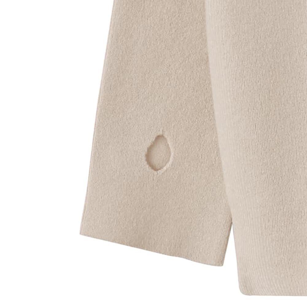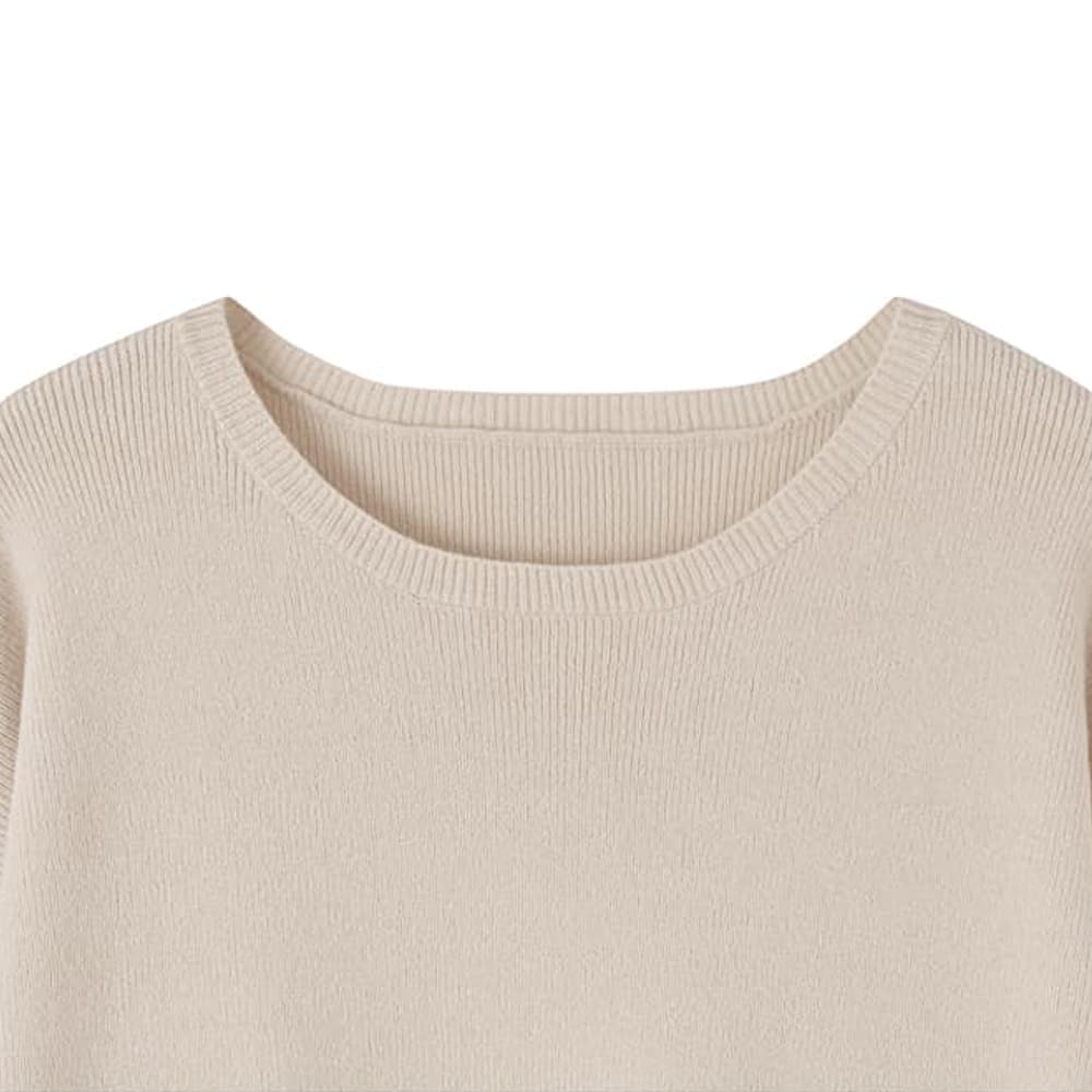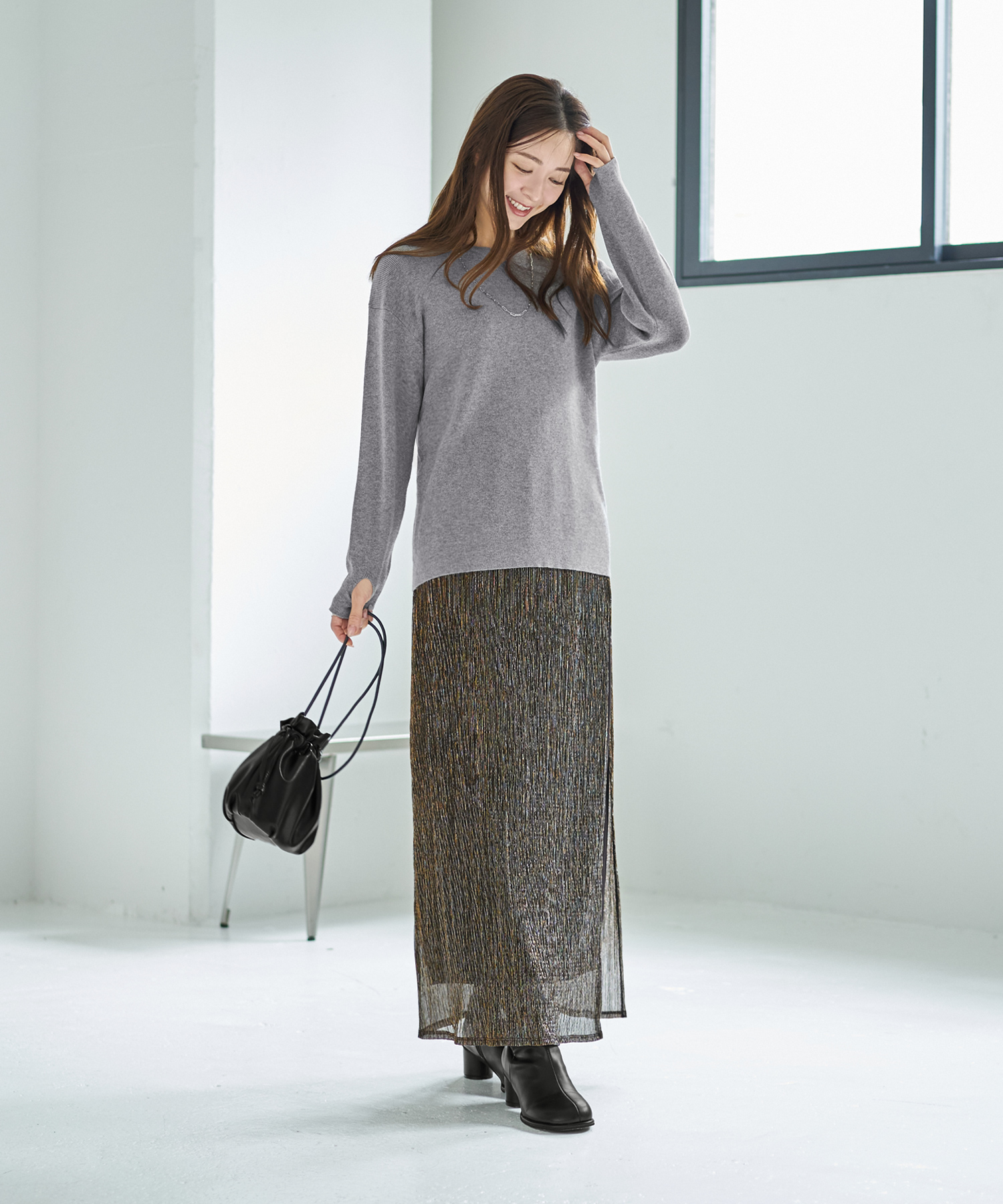 柔らかな空気感が魅力の『ソフトタッチ』-指あきタイプの長袖T型ニット-ほんわりとエアリーな質感で軽い着心地。毛羽立ちしにくくチクチク感もない、柔らかな『ソフトタッチ』ニットシリーズです。このシリーズは弊社社長が早期に大量の糸を買い付けることで、お買い求めしやすい価格を実現したニットたち。いつもよりお気軽にお楽しみいただけるお薦めのシリーズですので、ぜひ毎日のオシャレにご活用いただければと思います。【こちらのデザインは】一見するとピッタリ系のシンプルニットに見えますが、実は絶妙なゆとりで秀逸なシルエットを出せる一枚。まるで長袖Tシャツを着ているような、『身体に沿わないあの感じ』が出せる珍しい形のニットです。二の腕や下腹部にはり付くことなく、ほんわりと『身体から浮く』ような着心地。かといってゆったり大きいわけでもなく、ピッタリとは異なる『準コンパクト』系なシルエットにまとめてくれます。裾を内側に折り返せば、ウエストに裾インしなくても好みの長さにして着用OK。もちろんウエストにインしても良く、モタつきを気にせずに着こなしが作れます。一枚で着るのはもちろん、ジャンパースカート等のインナーとしても活躍。フィット系のコンパクトニットだとピチピチしてしまうから今まで着れなかった…という体型の方にも向いています。※親指が出せる穴が袖口に開いた、少しカジュアル感のあるデザインになっています。【商品の特徴】◆着用時期:秋冬◆サイズ感:ピッタリし過ぎないサイズ感◆丈感:下腹部が隠れる程度の丈感◆シルエット:ボトムスとのバランスが取りやすいシルエット◆首元のデザイン:空きすぎていないクルーネック◆厚み:薄手◆柔らかさ:柔らかい◆着用ジワ:できにくい◆毛羽立ち:摩擦の集中と着用頻度により、たまにおきることがあります(できた場合は毛玉取りクリーナー等でご対処ください)◆伸縮性:あり◆光沢感:なし◆透け感:なし(ホワイトはそれなりに下着にご配慮ください)◆ボタン:なし◆ファスナー:なし◆ポケット:なし◆裏地:なし◆手洗い:可能◆アイロン:可能(低アイロン)【お色について】◆カーキ:イエロー系のカーキ。◆グレー:薄いグレーと濃いグレーの糸が混ざった明るい発色のグレー。◆ホワイト:真っ白ではなく、暖かみのある優しさを入れた柔らかなホワイト。◆エクリュ:ホワイト系のニュアンスカラー。ベージュよりは薄く明るめなお色です。【SNS用ハッシュタグ】#235007ソフトタッチ指あきクルーネックプルオーバー(このハッシュタグでInstagramなどSNS内で検索をしますと、こちらをお持ちのお客様のご投稿があれば、簡単に見つけてご覧いただくことができます)