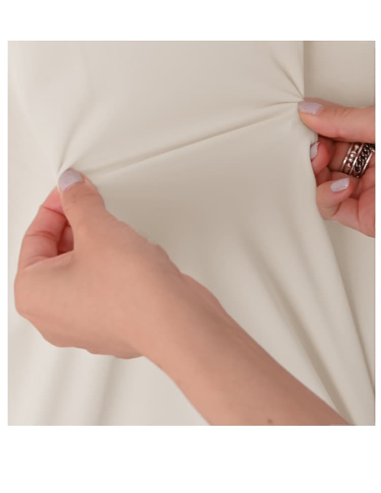 数あるシアートップスの中でもこちらの生地の特徴は、なめらかなタイツにもう少しハリ感をプラスしたような、薄くスムースな肌当たり。過去のものはもう少しネット生地っぽい編みの粗さや硬さがありましたが、今回はもっと繊細でキメ細かく、柔らかな組織になっています。