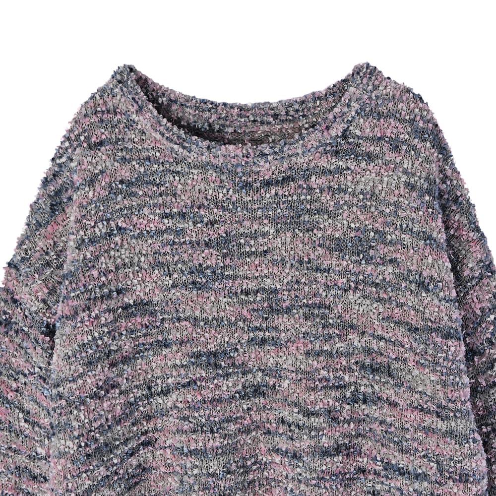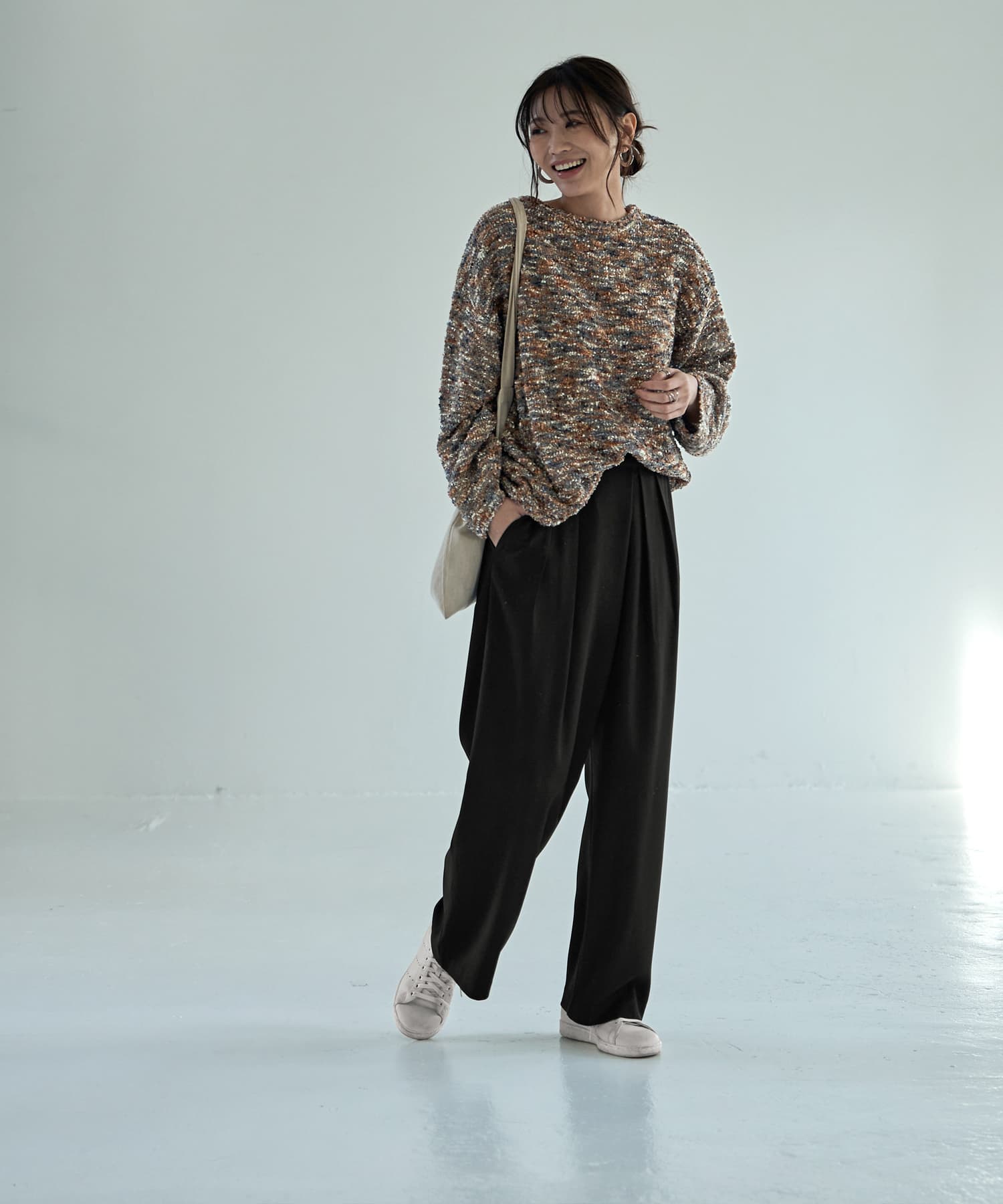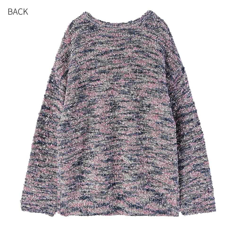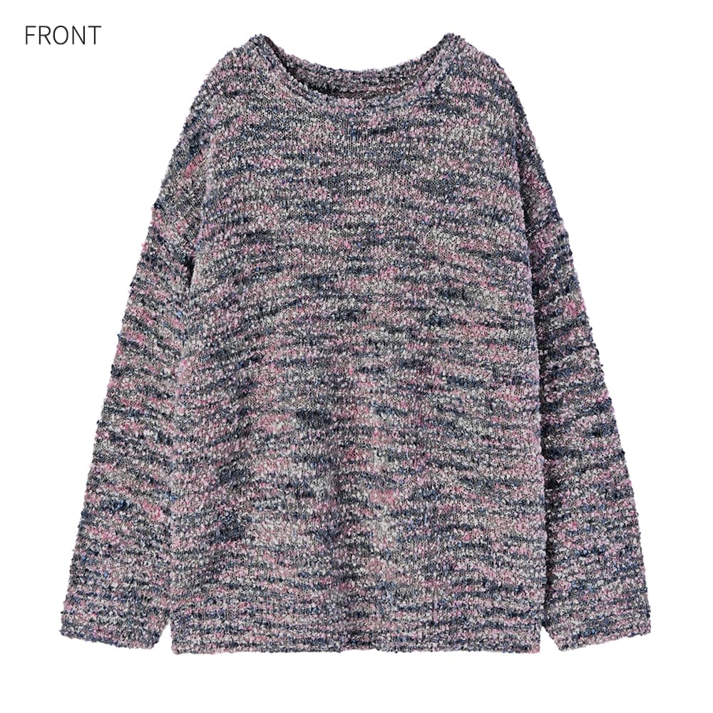 明るいカラーMIXでHAPPYに♪リボンのような質感が楽しい、軽量で柔らかなニットのプルオーバー【このニットの特徴】◆質感がカワイイ『リボンヤーン』を使用したニット◆複数カラーのMIX糸で様々な色に合わせやすい◆軽量で柔らかな質感◆厚ぼったさの無い素材◆チクチク感や毛羽立ちやすさはナシ◆スカートにもパンツにも合う◆シャツやカットソーとの重ね着も可能◆ボトムスを選ばず着回し力あり◆春先まで使える【このニットの概要】◆服飾業界では『リボンヤーン』と呼ばれる、リボンの先端のようなデザイン糸が散らばっている、質感が可愛いニットトップス。色の折り合いが楽しめる複数カラーMIXで、カラーを多用することによる『コーディネートの簡単さ』も推しポイントになっています。◆ミントMIXの場合は『濃淡でまとめた同系色使い』ですが、こちらも黒系、ベージュ系、ホワイト系、ブラウン系、ネイビー系、グレー系、デニム系…と幅広いお色と合わせられる着やすいカラー。どのお色もボトムスの色合わせに困らない発色になっています。【生地について】◆リボンの端っこの、フサフサと糸が割れている部分のようなパーツが編み込まれた糸=リボンヤーンを使用したニットです。◆ユル編みで軽量、ふんわりとした柔らかな質感。糸の編み間は緩めですが、着用時の透け感はナシ。とくに引っ掛けやすい編み地ではありません。◆素材の立体感による厚みはありますが、編み地自体は軽やかでサラッとしており、厚ぼったい感じはありません。◆チクチク感は無く、柔らかくてサラッとした肌触り。毛羽立ちやピリング、シワは基本的にできません。◆リボンヤーンは一般的に、使い始めは繊維落ちがあり、黒などの濃い色のお洋服に繊維カスが付く傾向があります。全体的に優しくコロコロをかけて、余分な繊維を取っていただくことで軽減されます。また、時間の経過と共に落ち着いていきます。【さらにプラス情報】◆暖かさ:ニットとしては普通で、そこそこの暖かさがあります。中に着るインナーで暖かさを調節します。もちろん真冬も使用OKです。◆首元:開きの狭さはなく、縦よりも横幅が広めに開いたクルーネックです。カットソーやタートル、シャツなどとの重ね着もできます。◆袖:袖幅はゆったりめで、肘下は『たゆん』としたカワイイ形。袖丈は長めで指の先端が出るくらい。袖口が広めなので袖のたくし上げはできませんが、折り返すことが可能です。◆裾:締め付けがないストレートタイプで、そのままストンと下に落ちます。お腹周りにフィットはせず、下腹や腰のカバー効果がある形です。◆合わせアイテム:スカートでもパンツでも似合います。ワンピースの上に着るのもOK。キレイめジャケットのインナーには向かないサイズ感ですが、アウターは普通に着用できます。【その他仕様などの情報】◆着用時期:10-4月が目安◆サイズ感:ゆったりめのサイズ感(Lサイズ体型にも対応)◆丈感:前は脚の付け根程度の丈感/背面はヒップがギリギリ隠れるくらいの長さ◆肩幅:問わないタイプ(ドロップショルダー)◆アームホール:広め◆袖幅:広め◆袖口:リブなしのストレート◆着用ジワ:できにくい◆毛羽立ち:できにくい◆伸縮性:あり◆光沢感:なし◆透け感:なし◆手洗い:可能◆アイロン:不要◆スチーマー:使用OK【お色について】◆ブラウンミックス:明るいブラウンと濃いブルーグレー、サンドベージュと白っぽいベージュ、グレージュ、白っぽい色が混ざった、落ち着きのあるカラーMIXです。◆グレーミックス:淡めなライトグレー、グレー系ブルー、明るいピンク、淡いピンク、白っぽい色が混ざった、明るめな寒色トーンのお色です。◆ミントミックス:非パステル系のミントで、明るいセージ系のミントカラー。青味は無く、少し暗めから淡いものまで、4段階グラデーションの濃淡同色をミックスしています。ただの単色よりも奥行きと立体感が出て、色の影響が強くならない点が着やすさとオシャレさを生みます。【SNS用ハッシュタグ】#235604カラーmixリボンヤーンプルオーバー(このハッシュタグでInstagramなどSNS内で検索をしますと、こちらをお持ちのお客様のご投稿があれば、簡単に見つけてご覧いただくことができます)