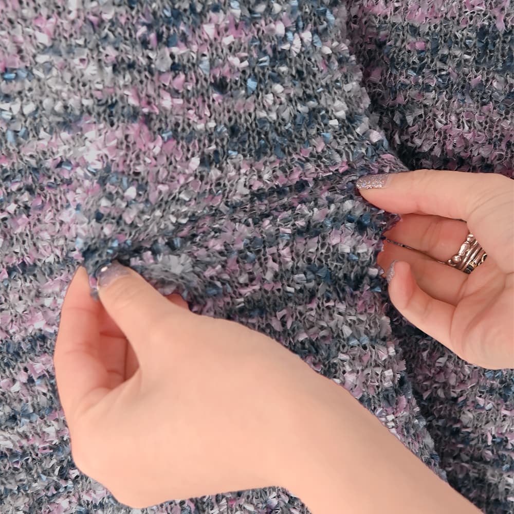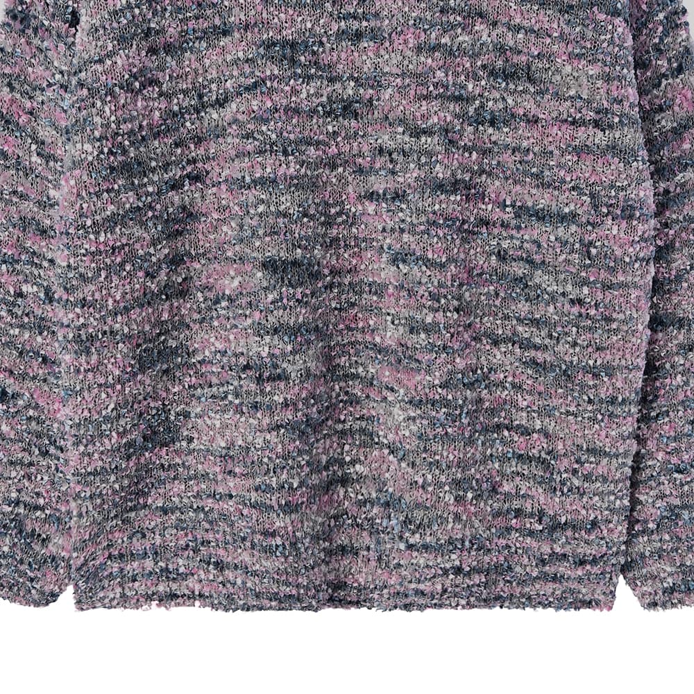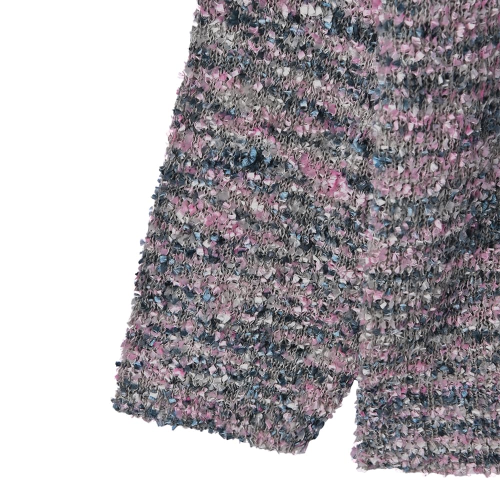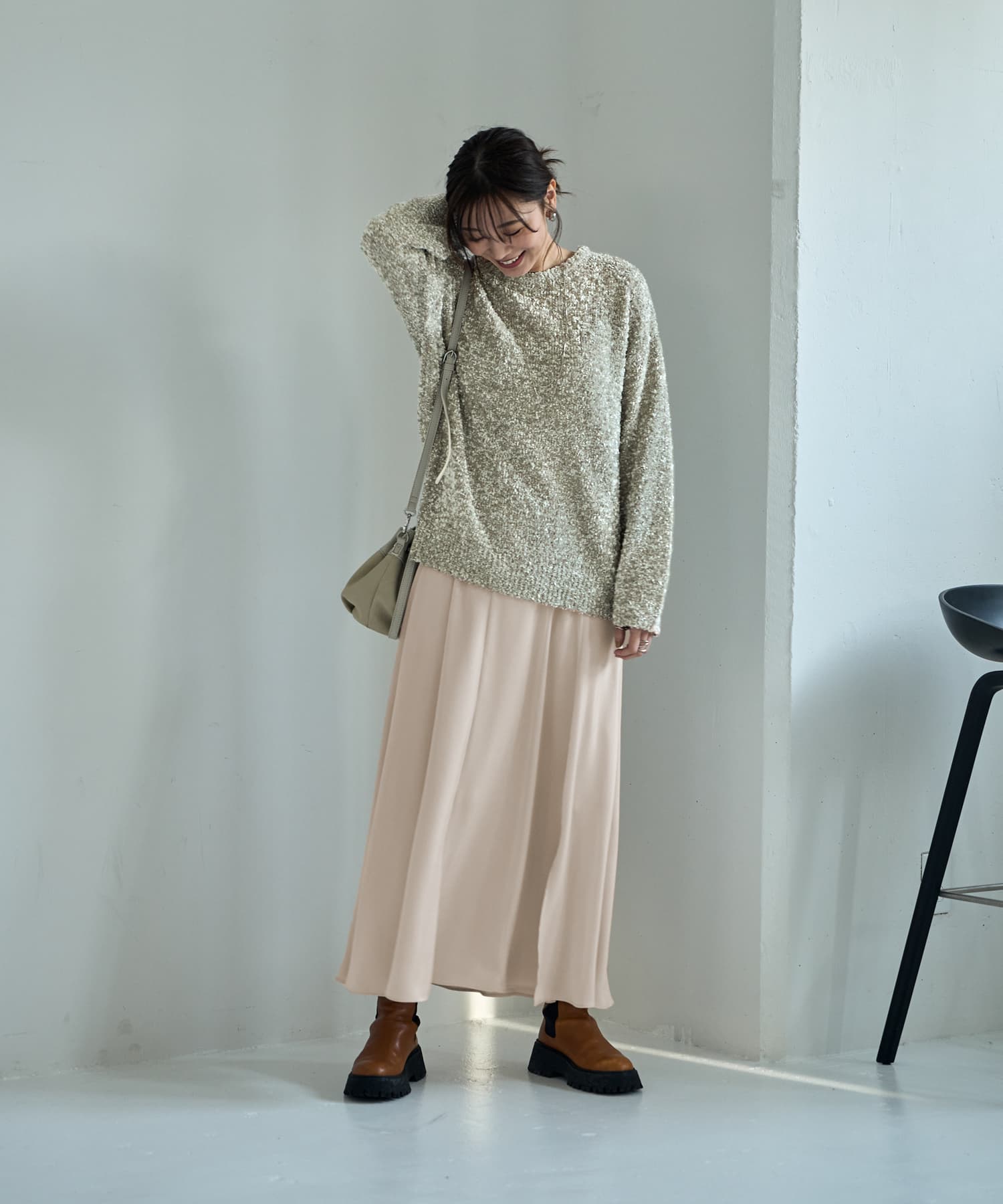 明るいカラーMIXでHAPPYに♪リボンのような質感が楽しい、軽量で柔らかなニットのプルオーバー【このニットの特徴】◆質感がカワイイ『リボンヤーン』を使用したニット◆複数カラーのMIX糸で様々な色に合わせやすい◆軽量で柔らかな質感◆厚ぼったさの無い素材◆チクチク感や毛羽立ちやすさはナシ◆スカートにもパンツにも合う◆シャツやカットソーとの重ね着も可能◆ボトムスを選ばず着回し力あり◆春先まで使える【このニットの概要】◆服飾業界では『リボンヤーン』と呼ばれる、リボンの先端のようなデザイン糸が散らばっている、質感が可愛いニットトップス。色の折り合いが楽しめる複数カラーMIXで、カラーを多用することによる『コーディネートの簡単さ』も推しポイントになっています。◆ミントMIXの場合は『濃淡でまとめた同系色使い』ですが、こちらも黒系、ベージュ系、ホワイト系、ブラウン系、ネイビー系、グレー系、デニム系…と幅広いお色と合わせられる着やすいカラー。どのお色もボトムスの色合わせに困らない発色になっています。【生地について】◆リボンの端っこの、フサフサと糸が割れている部分のようなパーツが編み込まれた糸=リボンヤーンを使用したニットです。◆ユル編みで軽量、ふんわりとした柔らかな質感。糸の編み間は緩めですが、着用時の透け感はナシ。とくに引っ掛けやすい編み地ではありません。◆素材の立体感による厚みはありますが、編み地自体は軽やかでサラッとしており、厚ぼったい感じはありません。◆チクチク感は無く、柔らかくてサラッとした肌触り。毛羽立ちやピリング、シワは基本的にできません。◆リボンヤーンは一般的に、使い始めは繊維落ちがあり、黒などの濃い色のお洋服に繊維カスが付く傾向があります。全体的に優しくコロコロをかけて、余分な繊維を取っていただくことで軽減されます。また、時間の経過と共に落ち着いていきます。【さらにプラス情報】◆暖かさ:ニットとしては普通で、そこそこの暖かさがあります。中に着るインナーで暖かさを調節します。もちろん真冬も使用OKです。◆首元:開きの狭さはなく、縦よりも横幅が広めに開いたクルーネックです。カットソーやタートル、シャツなどとの重ね着もできます。◆袖:袖幅はゆったりめで、肘下は『たゆん』としたカワイイ形。袖丈は長めで指の先端が出るくらい。袖口が広めなので袖のたくし上げはできませんが、折り返すことが可能です。◆裾:締め付けがないストレートタイプで、そのままストンと下に落ちます。お腹周りにフィットはせず、下腹や腰のカバー効果がある形です。◆合わせアイテム:スカートでもパンツでも似合います。ワンピースの上に着るのもOK。キレイめジャケットのインナーには向かないサイズ感ですが、アウターは普通に着用できます。【その他仕様などの情報】◆着用時期:10-4月が目安◆サイズ感:ゆったりめのサイズ感(Lサイズ体型にも対応)◆丈感:前は脚の付け根程度の丈感/背面はヒップがギリギリ隠れるくらいの長さ◆肩幅:問わないタイプ(ドロップショルダー)◆アームホール:広め◆袖幅:広め◆袖口:リブなしのストレート◆着用ジワ:できにくい◆毛羽立ち:できにくい◆伸縮性:あり◆光沢感:なし◆透け感:なし◆手洗い:可能◆アイロン:不要◆スチーマー:使用OK【お色について】◆ブラウンミックス:明るいブラウンと濃いブルーグレー、サンドベージュと白っぽいベージュ、グレージュ、白っぽい色が混ざった、落ち着きのあるカラーMIXです。◆グレーミックス:淡めなライトグレー、グレー系ブルー、明るいピンク、淡いピンク、白っぽい色が混ざった、明るめな寒色トーンのお色です。◆ミントミックス:非パステル系のミントで、明るいセージ系のミントカラー。青味は無く、少し暗めから淡いものまで、4段階グラデーションの濃淡同色をミックスしています。ただの単色よりも奥行きと立体感が出て、色の影響が強くならない点が着やすさとオシャレさを生みます。【SNS用ハッシュタグ】#235604カラーmixリボンヤーンプルオーバー(このハッシュタグでInstagramなどSNS内で検索をしますと、こちらをお持ちのお客様のご投稿があれば、簡単に見つけてご覧いただくことができます)