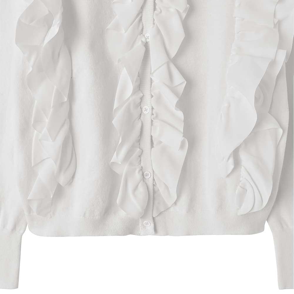 【トップスにもなる2wayタイプ】甘過ぎない大人仕様のフリルが◎顔周りが華やかになるカーディガン【このアイテムについて】◆サラッとしたニット生地に、ジョーゼットシフォン生地のフリルをあしらったカーディガン。一見すると甘さが心配なデザイン要素ですが、そうならないよう計算された大人仕様に仕上げています(着ると意外にも平気なので、ぜひ着てみていただきたいです)。◆フリルのボリュームによるシルエットの膨張なども、予め影響がないよう計算済み。身体の厚みや横幅を助長することなく、普通に着こなすことができます。◆一枚でVネックニットのように着ても、前を開けて羽織りとしても素敵に着用可能。あるいはジャケットを合わせると中にブラウスを着ているような見え感になりそれも素敵なので、お仕事スタイルにもお薦めです。◆首元はデコルテが開くVネック。一枚で着ても女性らしくて素敵ですし、中にタートルネックやハイネック、クルーネック等のインナーを入れての重ね着もキレイにキマります。【さらに魅力を解剖】◆映える華やかデザイン美しい立体感にこだわったフリルが、お店の顔周りを華やかに。シンプルなボトムスに合わせるだけで『しっかりとオシャレをしている』ように見える時短要素もあり、テク要らずで華のあるコーデが完成します。◆縦ラインを強調フリルの生地がエアリーなためボリュームが出過ぎず、膨張見えや肩幅を強調するなどの心配はありません。むしろ縦方向に配置されたフリルが縦ラインを強調し、スッキリと見せてくれます。◆気楽な着心地身体にフィットはしない、適度なゆとりのサイズ感。生地は良く伸び、7-11号体型までに対応できる感じです。裾はストレートな形状で裾リブに締め付けはなく、ストンと下に落ちるのも◎ ボトムスの形を潰しませんし、腹部を強調せずに自然なカバーを叶えます。◆安心の肌触り生地は薄手でふんわりとした肌触りのハイゲージニット。暖かさ重視の冬っぽい季節限定素材ではなく、春先まで着ていただける素材感です。チクチク感や毛羽立ちやすさはとくにありません。 【さらに追加情報】◆暖かさ:真冬(12-2月)には一枚だと寒いかな、という感じの素材です。寒い場合は中にヒートテック的な防寒インナーを着たり重ね着をして(または何かを羽織って)ご着用ください。春は4月頃まで着れるイメージです。◆開き加減:前を閉じてトップスとして着た際、胸元や中に着たインナーを見せずに(素肌にVネックニットを着ているかのように)着れるか否かは、その方の骨格や肉付き、開きに対する許容範囲による個人差があります。◆ボトムス:スカートにもパンツにも似合います。スカートの場合はフリルと合わせてくどくならないような、スッキリとした表面感のものが好相性です。【その他仕様などの情報】◆着用時期:10-4月が目安◆サイズ感:適度なゆとりのあるサイズ感(Lサイズ体型にも対応)◆丈感:脚の付け根程度の丈感/背面は腰が隠れる長さ◆肩幅:普通(伸びるので肩幅は問わず)◆アームホール:やや広め◆袖幅:普通◆袖丈:長袖(手の甲が隠れる長さ)◆厚み:普通(とくに薄くも厚くもない)◆柔らかさ:柔らかい◆着用ジワ:できにくい◆毛羽立ち:できにくい◆伸縮性:あり◆光沢感:なし◆透け感:なし(ホワイトは多少あり)◆着脱:フロントボタン開き◆ボタン:ボディと同色染め◆ファスナー: なし◆ポケット:なし◆裏地:なし◆手洗い:可能◆アイロン:可能(当て布使用。低アイロン)【お色について】◆ブラック:通常の定番的なブラックです。◆ホワイト:優しく柔らかな肌馴染みの良いホワイト。【SNS用ハッシュタグ】#235619シフォンフリルニットカーディガン(このハッシュタグでInstagramなどSNS内で検索をしますと、こちらをお持ちのお客様のご投稿があれば、簡単に見つけてご覧いただくことができます)