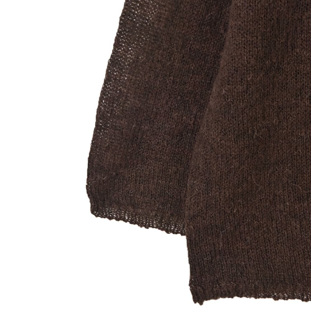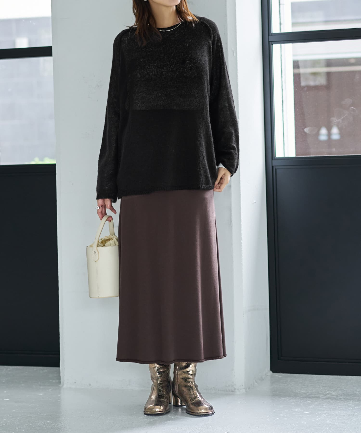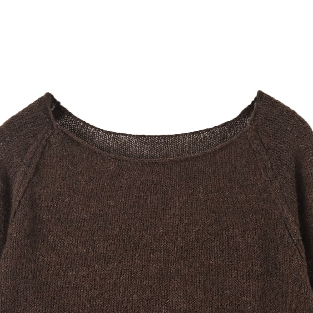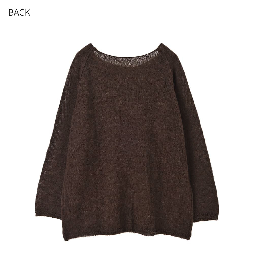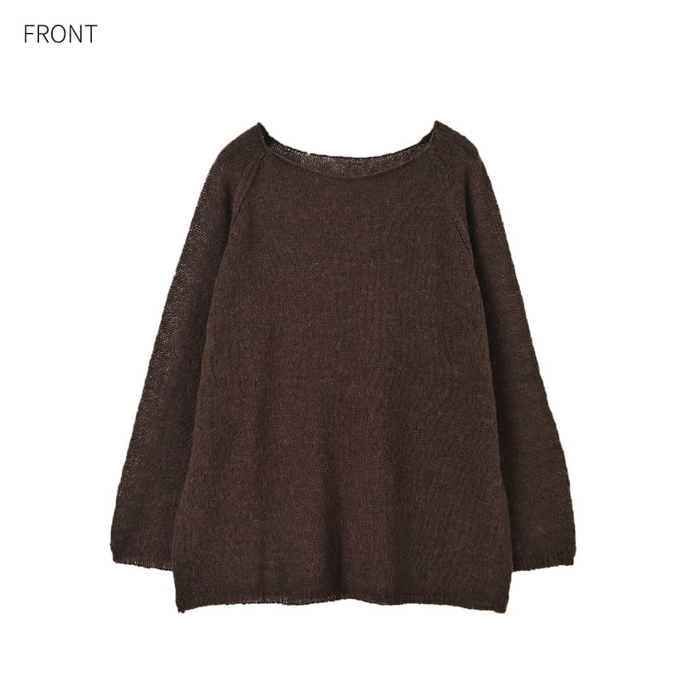 ほわん、と柔らかく軽やかな質感どことなくこなれた雰囲気がイイ、女性らしさのあるリラックスニット◆10/9インスタライブご紹介商品◆アーカイブのご視聴はこちらから→【10/9ライブ】【このニットの特徴】◆ふんわりとエアリーな超軽量・薄手素材◆自然な感じのシアー感あり◆中に好きなものを着て温度感を調節◆ボートネック風のネックライン◆少しカジュアルなラグランスリーブ◆こなれた感じの雰囲気◆ラグラン線を盛り上げて強調したデザイン◆前後のどちらを前に着ても成立◆裾のアレンジがしやすい素材◆少し長めの丈感◆手洗い可能でアイロン不要【このニットの詳細】◆アルパカ混ならではのふんわり感が女性ならではの質感でカワイイ、少しルーズなフォルムのニットトップス。なんとなくこなれた雰囲気で今っぽいテイストが楽しめる一枚です。ラグランスリーブの切替線を盛り上げ、目立つように編み上げているのもデザインのポイントになっています。◆編み地はゆる編みで薄くて軽く、柔らかな質感。丈はやや長めですが透け感があるため重たい印象にならず、裾の一部をボトムスにインしたりなどのアレンジがしやすく、全身バランスが簡単にとれます。◆なんとなく透け感のある今っぽい見た目。透け感は中にニットと同系色のインナーを着れば目立たず、反対色など(例:ブラックに白のインナー)を着ると強調されて、お好みにより調節できます。◆ボートネック系で鎖骨が見える、女性らしい首元。インナーを重ねてチラ見せする場合は同じボートネック系が良く、当店のもので言えば『下に着るリブテレコ長袖カットソートップス』や『とろみワイドリブボートネックトップス』をお薦めしています。ボートネック以外ならタートルネックやハイネックが適しています。◆首元からのチラ見せをしない場合は、デコルテが大きく開いた防寒インナーやカットソー(当店では該当商品なし)を入れて着用します。◆袖口がすぼまっておらず、ストレートに終わるところも今っぽい要素。袖口や裾のリブ処理もカワイイです(短くて間隔の空いたデザインリブ編みです)。袖をたくし上げたい場合は袖口を1回5cm程度折り、そこからたくし上げると留まります。中に長袖インナーを着ている場合は、その固定力に絡めて(=利用して)たくし上げ&位置固定が可能です。◆パンツは全般的に相性が良く、ワンピースの上から着たりするのも素敵だと思います。スカートの場合はスッキリとしたフォルム・質感のものが合いそうです。【さらにプラス情報】◆暖かさ:薄めなシアーニットなのでものすごく暖かいわけではありませんが、『なんかほんわりと暖かい』という感じです。長袖インナーと重ねることで暖かいニット同様の温度感となります。◆チクチク感:スタッフはとくに感じませんが、獣毛混製品ですので一部敏感な方には気になることもあるかもしれません。肌が弱めなスタッフや敏感肌のライブメンバーは大丈夫でしたので、大多数の方は大丈夫だと思います。◆丈伸び:ゆる編みなのでハンガー掛けをすると丈伸びが予測されます。ハンガーに掛ける場合は裾をハンガーに引っ掛けて重力の影響を軽減させるのが◎ たたみ保管もお薦めです(シワはできません)。◆毛羽立ち:とくにおきやすそうな生地ではないものの、ニットなのでその方の動作グセや摩擦度合い、着用頻度やお手入れ方法によりできないとも限りません。もしできるとしたら大きな塊でできそうなタイプなので、指で優しく取り除いてください。◆静電気:その方の帯電体質具合や合わせアイテムなどに左右されます。ただ冬場は乾燥でどうしても…というところはありますので、もしも気になる場合はエレガードなどの静電気防止スプレー等でご対処ください。【その他の仕様などの情報】◆着用時期:10-3月が目安◆サイズ感:ゆったりとしたサイズ感(Lサイズ体型にも対応)◆丈感:前は太もも上部くらいの丈感/背面はヒップが隠れる長さ◆シルエット:ストレート◆首元:ボートネック系◆肩幅:問わないタイプ(ラグランスリーブ)◆アームホール:広め◆袖幅:広め◆袖丈:長袖(指が半分くらい出る長さ)◆袖口:ストレート◆厚み:ニットとしては薄手◆柔らかさ:柔らかくふんわりとしている◆肌触り:ほわっと軽い感じ◆着用ジワ:できにくい◆毛羽立ち:できにくい◆伸縮性:あり◆光沢感:なし◆透け感:あり◆スリット:なし◆ボタンやファスナー:なし(かぶり着タイプ)◆手洗い:可能◆アイロン:不要◆スチーマー:使用OK【お色について】◆ブラック:定番的な通常のブラックです。◆ブラウン:これこそ『茶色』という感じの基本的なブラウン。赤味は強くなく、明るさ・暗さも中間的な感じです。◆ライトベージュ:生成り(キナリ)色を若干濃くしたような感じのナチュラルなお色。一般的にイメージされるベージュ感はほぼ無く、エクリュを着るような感覚で着用することができます。イエロー味も赤味もごく僅かにありますが、僅か過ぎるの