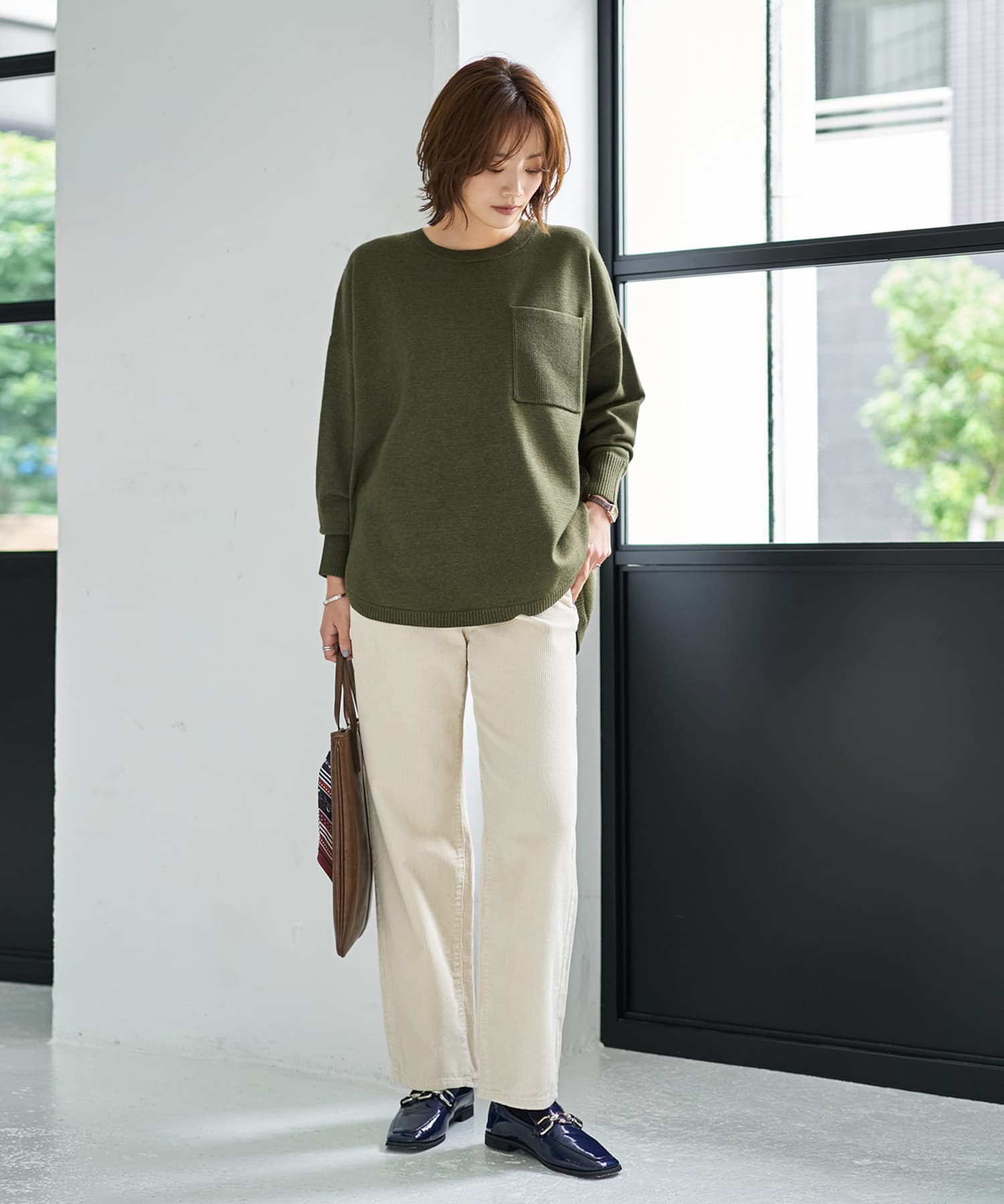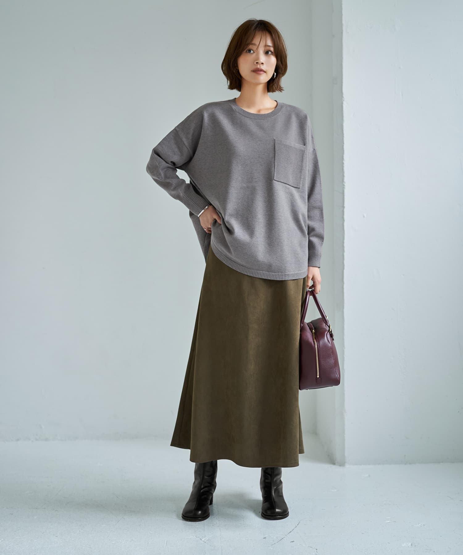 やっぱりこのニットはカワイイんだよなぁ、ということで再現にチャレンジした復刻版手洗い可能でチクチク無しの快適な肌触りラフなのに垢抜けたオシャレ感を持つニット◆11/6インスタライブご紹介商品◆アーカイブのご視聴はこちらから→【11/6ライブ】【この商品の特徴】◆とても気持ちの良い肌触り◆チクチクしない素材◆ゆったりとしたサイズ感◆体型カバーシルエット◆キレイめカジュアルな雰囲気◆気張っていないオシャレ感◆あまり見かけないデザイン◆胸ポケットはリブ編み◆手洗い可能◆毛羽立ちにくい生地◆スカートにもパンツにも合う◆着回し力がある【このトップスの詳細】◆気張っていない自然な雰囲気なのに、着ると『なんだかオシャレ』に見えるプルオーバーニット。過去に販売していたものが今見てもやっぱり可愛く、似たように再現してみたリバイバルデザインになります。◆しっとり・もっちりとした前回の優れた肌触りに、ふんわりとした空気感もプラス。チクチクなどを感じさせない気持ちの良い着心地です。イメージ的に似ている質感系統のアイテム→『スムースハイゲージ』シリーズ◆一見するとシンプルですが、実は細部が凝っているのもこのトップスの特徴。着ると可愛いカタチに形成される独特なパターンや、胸ポケットの編み地がリブ編みに切り替わっていたり、裾リブがボディサイドでデザイン化されていたり、オシャレに見える工夫と手間が詰まっています。◆裾は控えめなラウンドラインで、サイドの裾がスリット状になったデザイン。正面のみならず横やナナメ後ろから見ても可愛いフォルムが出るよう設計されています。【さらにプラス情報】◆暖かさ:一般的な冬用ニット同等に暖かいです。中にシャツやカットソーを重ね着すれば、かなり暖かく過ごせます。◆厚み:薄くはありませんが、厚いと感じるほどの厚みも無く、しっかりとしつつ・スッキリしています。◆重み:軽量とまではいきませんが、まあまあ軽めだと思います。◆毛抜け・毛飛び:ありません。◆静電気:程度の差はその方の帯電体質具合や合わせアイテムなどによりますが、冬場は乾燥でどうしても…というところはありますので、もしも気になる場合はエレガードなどの静電気防止スプレー等でご対処ください。◆毛羽立ち:とくにできやすい素材ではありませんが、その方の動作グセやバッグとの摩擦具合、着用頻度やお洗濯方法により個人差がありますので、できることもあるかもしれません。できた場合は毛玉取りクリーナー等でお手入れをしてください。◆丈伸び:着用時にはありませんが、ハンガーに掛ける場合は肩や袖の伸びに配慮した掛け方をした方が良いです。◆シワ:着用時はできません。洗い上がりはそのままでも着れますが、軽くスチーマーをかけるとさらにキレイになりお薦め。たたみジワは多少できます。◆ボトムス:スカートでもパンツでも、大概のものは合います。◆重ね着:ゆったりとしているためジャケットのインナーなどには向きませんが、この下に何かを着る重ね着には強いです。例:カットソー、シャツ、ワンピースなど【前作との差異】対象商品:商品番号234269『胸ポケットしっとりニットプルオーバー』◆採寸サイズは微妙に異なりますが、ニットでは測り誤差と言える微々たるものなので、同じと見なして良い感じです。袖丈は流行りに合わせて長くしています。◆素材の混率は違いますが、かなり質感を寄せているため大きな違いは無いと思います(=大体似た感じ)。◆サイズ比較(前作/今作)前着丈68/67 後ろ着丈73/72 肩幅64/63 身幅63/64 袖丈36/42 裾幅63/63◆素材比較・前作→レーヨン50%、ナイロン30%、ポリエステル20%・今作→ポリエステル29%、アクリル26%、レーヨン25%、ポリエステル20%【その他の仕様などの情報】◆着用時期:10-3月頃が目安◆サイズ感:ゆったりとしたサイズ感(Lサイズ体型にも対応)◆丈感:前は脚の付け根が隠れる丈感/背面は太もも胸部にかかる程度の長さ◆シルエット:ワイドな身幅のストレート◆首元:適度に開いたクルーネック◆肩幅:問わないタイプ(ドロップショルダー)◆アームホール:広め◆袖幅:広め→袖口に向かって普通になる◆袖丈:長袖(指が半分隠れる長さ)◆袖口:リブ編み◆袖のたくし上げ:可能(固定できます)◆厚み:普通◆柔らかさ:柔らかさの中にハリ感が共存◆肌触り:柔らかで滑らか、しっとりとしてモッチリ感もあり◆着用ジワ:できにくい◆毛羽立ち:できにくい◆伸縮性:あり◆光沢感:なし◆透け感:なし◆スリット:構造的には無いが両サイドがそう見えるデザイン◆ボタンやファスナー:なし(かぶり着タイプ)◆ポケット:左胸にあり◆裏地:なし◆手洗い:可能◆アイロン:不要◆スチーマー:使用OK【お色について】◆グレー:ライトグレーよりも暗く、ダークグレーよりも明るい中間的なミドルグレー。赤味や青味などの発色的なクセはありません。(※濃淡の糸が混ざったメランジ編み)◆ホワイト:普通の白よりも温かみのある