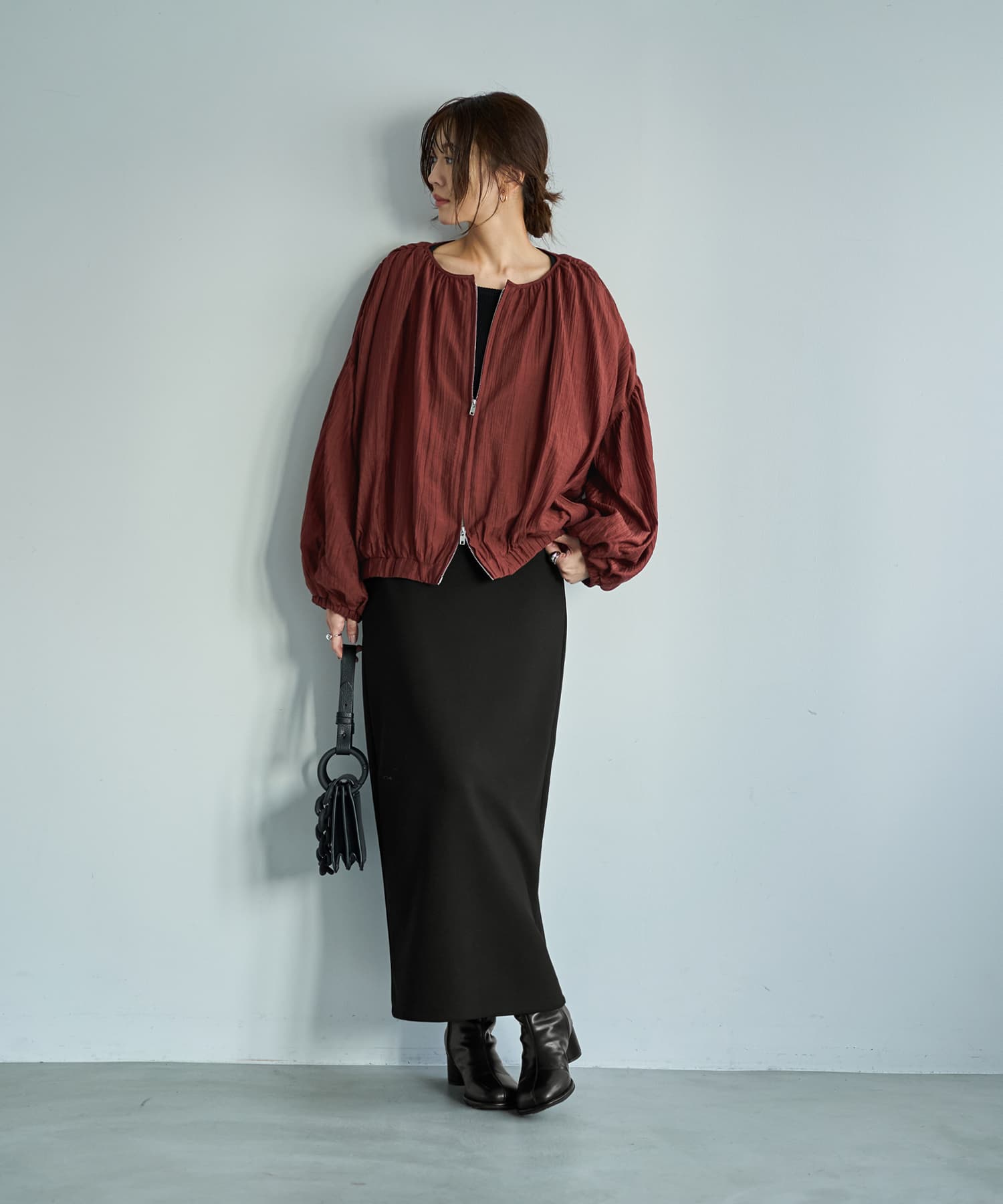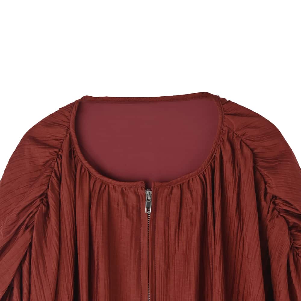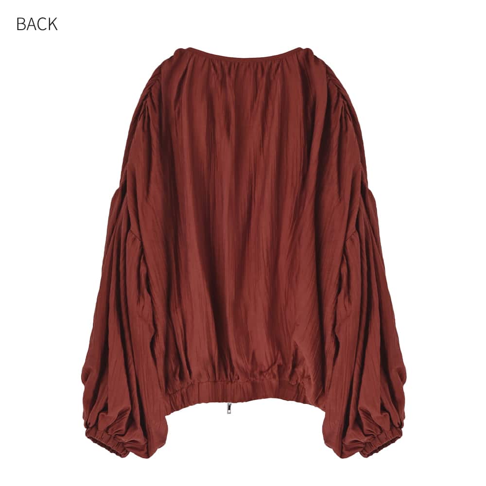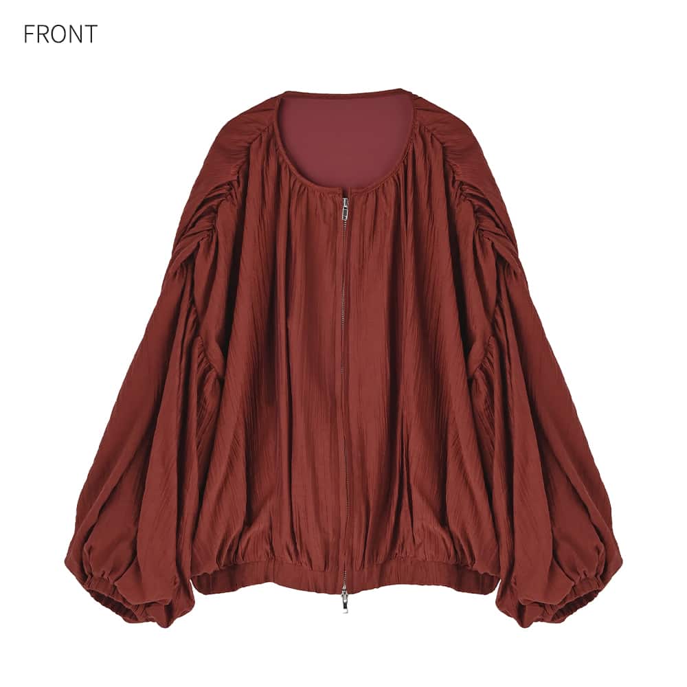 ーアウターではなくトップスなんですーカーディガンのようにコートの下に着る、シュワシュワと軽やかな新感覚アイテム◆11/27インスタライブご紹介商品◆アーカイブのご視聴はこちらから→【11/27ライブ】【この商品の特徴】ニットに偏りがちな冬の着こなしに新鮮さを入れる、ブルゾン型のトップスという新しい発想。使い方はカーディガンのような感じで、中に薄手のニットやカットソーを着たり、ワンピースやサロペットに羽織ったりとお好きなように使えます。生地はシュワシュワとした感じのシワ加工(楊柳系)が可愛い、割と薄手で季節を問わないオシャレ生地。自宅で洗えてシワにならず、お手入れもラクちんです。◆ブラウスを2枚重ねたような薄い生地なので、この上に普通に冬コートを着ることができます。◆暖かい時期はこれを軽アウターとして使うこともできる便利アイテム。夏の冷房除けなどにも使用できます(季節を問わずに一年中着れる質感です)。◆フロントは人気のダブルファスナー。好きな位置で上下を開け閉めできるので、着こなしのバランスが作りやすくなっています。◆ややボリュームのある袖は、たくし上げた際のシルエットも可愛くて◎ 袖口はゴム仕様で簡単にたくし上げができます。◆軽くてシワにならず、たためるので持ち歩きや旅行にも便利。たたみ保管も可能です。【その他の仕様などの情報】◆着用時期:10-4月をメインに通年◆サイズ感:ゆったりめのサイズ感(Lサイズ体型にも対応)◆丈感:前は脚の付け根程度の丈感/背面はヒップが半分隠れる程度の長さ◆シルエット:バルーン系◆首元:詰まっていないクルーネック◆肩幅:問わないタイプ(ドロップショルダー)◆アームホール:広め◆袖幅:広め◆袖丈:長袖(指の付け根が隠れる長さ)◆袖口:ゴム◆袖のたくし上げ:可能◆厚み:普通(アウターとしては薄手)◆重さ:軽量◆柔らかさ:柔らかい◆肌触り:柔らかでサラッとした感じ◆着用ジワ:できにくい◆毛羽立ち:できにくい◆伸縮性:なし◆光沢感:僅かにあり◆透け感:ホワイトは若干あり(濃い色が薄っすらと影響する程度)◆スリット:なし◆着脱:フロントファスナー(ダブルファスナー)◆ファスナーの色:シルバー(質感はマット寄り)◆ポケット:両サイドにあり◆裏地:あり◆手洗い:可能◆アイロン:不要◆スチーマー:使用OK【お色について】◆バーガンディ:赤の中に微量のブラウン色素を入れて、落ち着きのある発色にしたニュアンスレッドです。◆アイボリー:一般的な白いブラウスのお色。イエロー味などの色味感は無いクリアな発色のホワイトです。◆ダークグレー:チャコールグレーよりも一段明るい、深みのあるグレーです。【SNS用ハッシュタグ】#235988便利な楊柳ブラウスブルゾン(このハッシュタグでInstagramなどSNS内で検索をしますと、こちらをお持ちのお客様のご投稿があれば、簡単に見つけてご覧いただくことができます)
