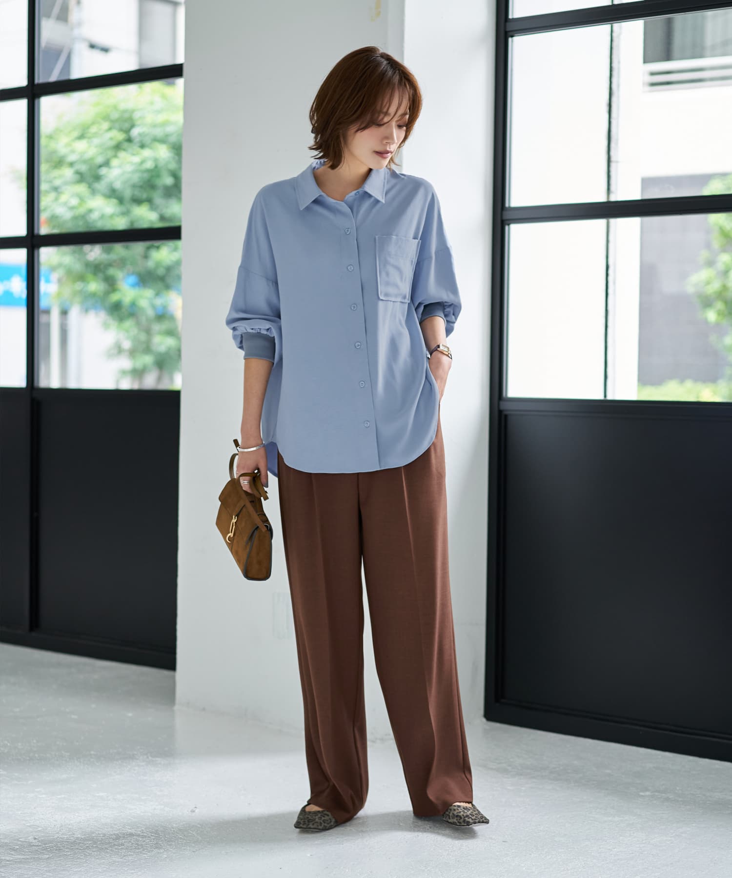 ◆裾をボトムスにインしなくても、バランスがキマる質感とフォルム。ニットなどの裾からチラ見せするのも素敵なカタチです(裾見せのコツは裾のボタンを1、2個外して、裾を広げる感じにするとこなれた感じを出しやすくなります。※シャツ全般に共通)。