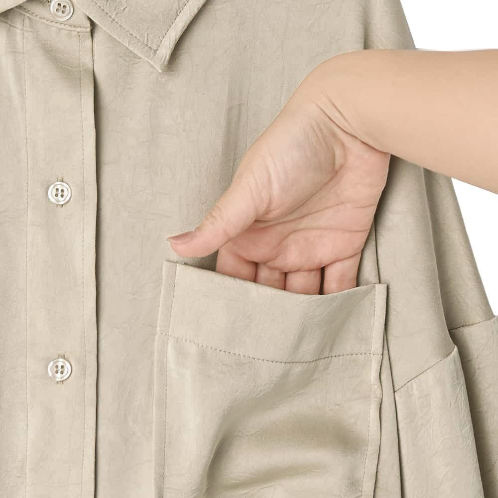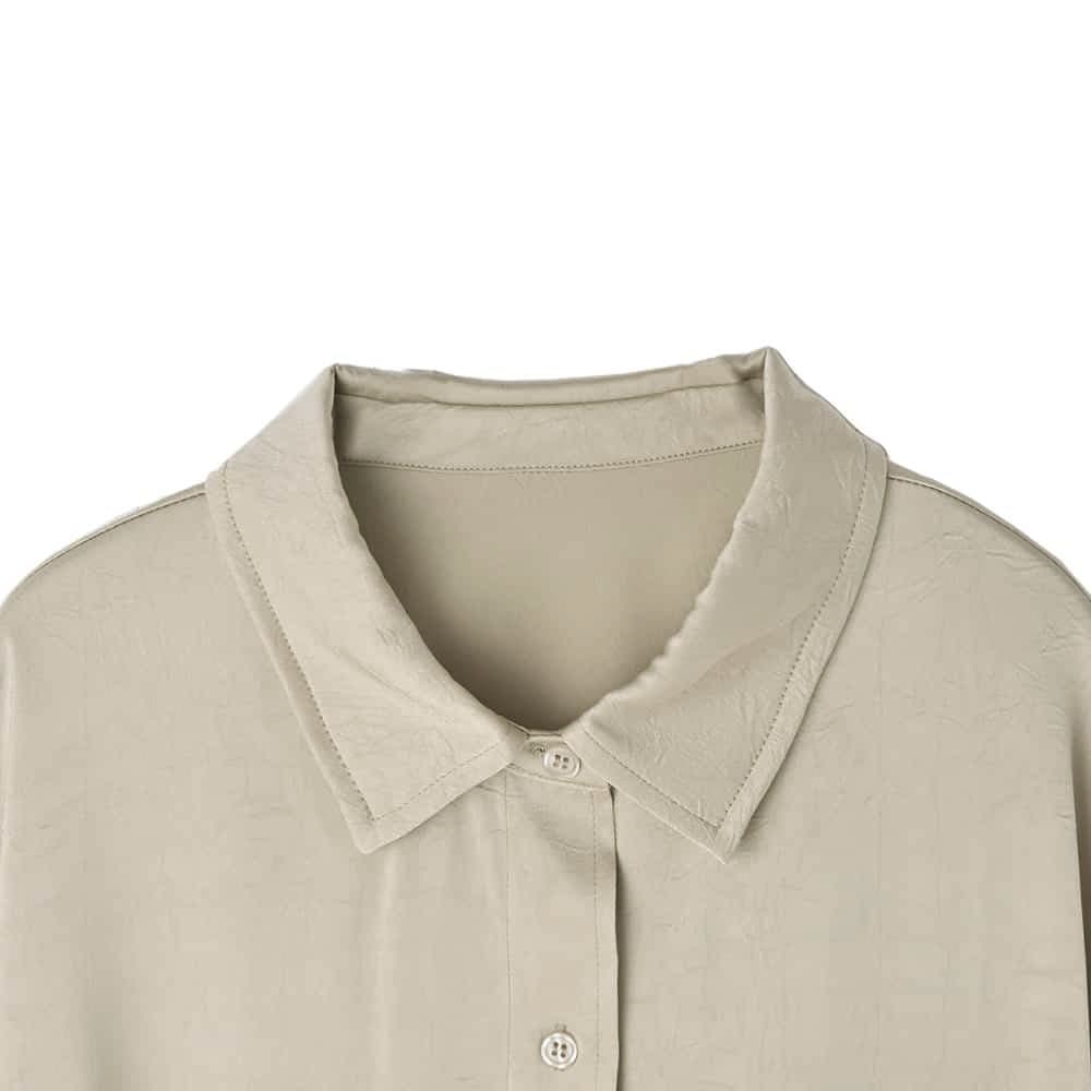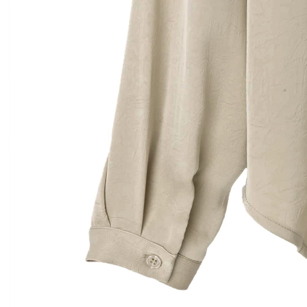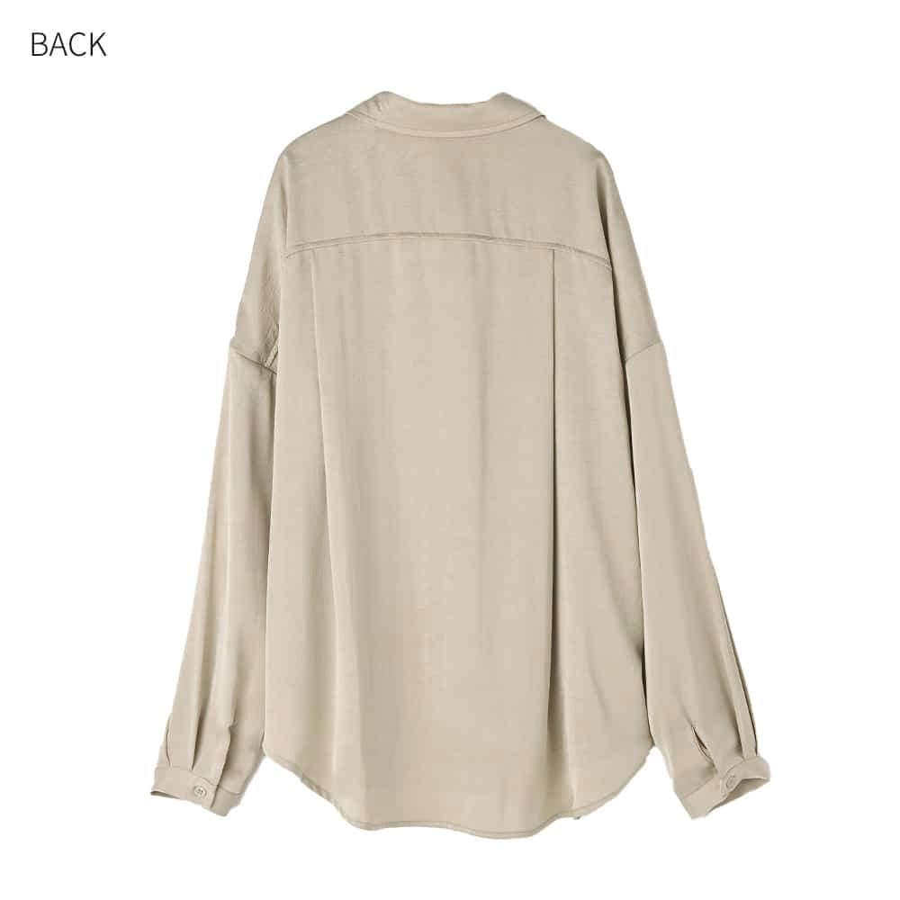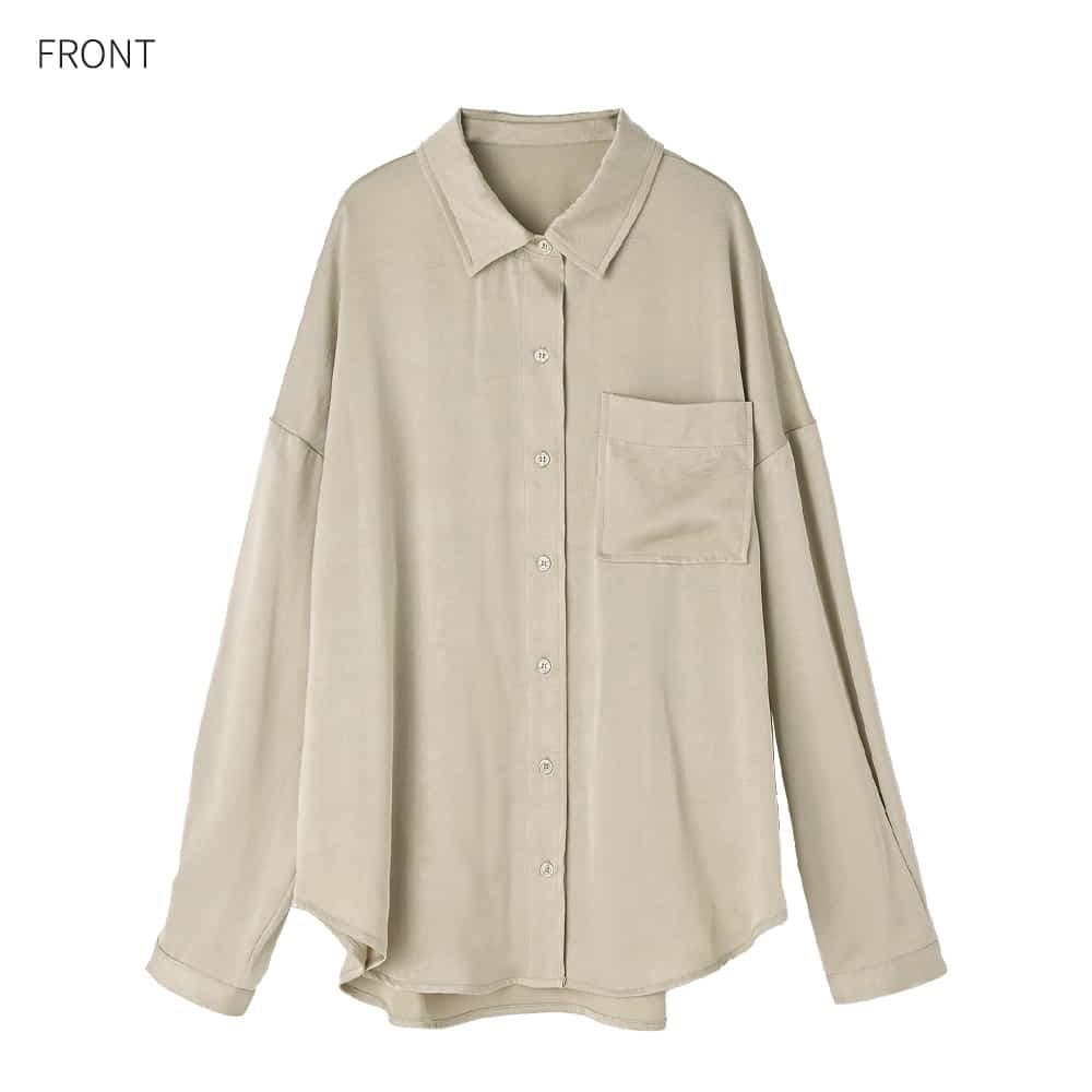 ◆プロデューサー渾身の大HITデザイン◆こなれていて自然な色香とカッコ良さアリ新カラーはさらに雰囲気UPな大人シャツ◆11/13インスタライブご紹介商品◆アーカイブのご視聴はこちらから→【11/13ライブ】―いつものデリより生地やデザインに凝った、ワンランク上のLUXE(ラグゼ)ライン。【このシャツの特徴】◆大HITシャツの新カラーバージョン(グレーは継続)◆とろみ感のあるサテン生地を使用◆嫌味の無い色香、媚びないカッコ良さ◆テカテカし過ぎない自然な光沢◆薄手でかさばらず、普通のシャツより暖かい◆スッキリとしていて冬場は重ね着に重宝◆ニットやジャケットと相性抜群◆春も着れる素材感◆シンプルで着回し力が高い【このシャツの詳細】◆先シーズンに大好評・メガHITをいただいたサテンシャツの第2弾カラー替えバージョン。プロデューサーがどうしても作りたかった、着るだけで雰囲気が出て、嫌味のない色香と媚びないカッコ良さがでる『とろみ感』がキモのサテン生地シャツです。◆テカテカとしたサテンではなく、表面にシボ感加工を入れることでニュアンスを出した特殊サテン。光沢感は控えめで日常使いのしやすいデザインです。◆肌当たりはサラッとしてなめらかな感じで気持ちよく、とろみ感と落ち感があるのが特徴。生地が軽やかなのでボトムスに裾インせずともオシャレに着れて、シャツとしてもニットなどの中に着る重ね着用インナーとしても素敵に活用できます。【着こなしについての情報】◆生地とフォルムで十分な『オシャレさ』を感じる雰囲気を出しているため、シンプルなボトムスを合わせるだけで十分に素敵。デニムやシンプルなワイドパンツ、はたまたペンシルスカートやスウェットパンツやジョガーパンツなど、普通のボトムスを合わせるだけでカッコ良くキマります。◆首元・胸元はご自分の許容範囲内で、ボタンを外して肌を見せ、ヌケ感を出して着るのがお薦め。そこに華奢なネックレスをすれば女性らしく、ゴツめなネックレスをすればカッコ良さが出せます。◆当店の『とろみ薄リブタートル』シリーズのような、薄手のハイネック系カットソーやニットを中に入れるのも素敵です。◆着こなしによっては首まできっちりとボタンを留めて、端正に着るのもまたオシャレです。◆裾はインしても可愛いですが、裾出しで少しルーズに着るのがデザイン想定の基本となっています。◆ボトムスには光沢感のないものを合わせるのがお薦めです。◆ニットやスウェットの中に着たり、ジャケットやカーディガン、ブルゾン合わせなどと重ね着をしたり、幅広く楽しめます。◆ボタンをラフに開けて、肩を出したり後ろに抜いたり、着崩す着こなしをしても素敵です。【生地・素材系の情報】◆どちらかといえば薄手のサテン生地で軽やかな着心地。かといって透けるほどに薄いわけではなく、夏以外の3シーズンで着やすく・重ね着もしやすい厚み感です。◆着用ジワができにくく、お手入れは比較的ラクな生地。もしも洗い上り後にシワが気になる場合も、スチーマーでサッと伸ばせる扱いやすさのある生地です。◆光沢感はさほど強くなく、自然な感じの艶感が肌を美しく見せてくれます。◆強い落ち感があるため身体を薄く見せてくれます(着痩せ効果あり)。◆暖かさ:サテン生地は風を通しにくく体温の伝導性があるため、通常のブラウス生地に比べると若干暖かさがあります。◆静電気:程度の差はその方の帯電体質具合や合わせアイテムなどによりますが、冬場は乾燥でどうしても…というところはありますので、もしも気になる場合はエレガードなどの静電気防止スプレー等でご対処ください。◆毛羽立ち:とくにできやすい生地ではありませんが、その方の動作グセやバッグとの摩擦具合、着用頻度やお洗濯方法により個人差がありますので、できることもあるかもしれません。できた場合は毛玉取りクリーナー等でお手入れをしてください。【その他の仕様などの情報】◆着用時期:10-4月頃が目安(暑くなるまで)◆サイズ感:ゆったりめのサイズ感(Lサイズ体型にも対応)◆丈感:前は太もも上部程度の丈感/背面はヒップが余裕に隠れ、太もも上部に至る程度の長さ/サイドの短い部分は脚の付け根が隠れる程度(前後差あり)◆シルエット:ストレート◆首元:シャツ襟◆背面ディテール:タックあり◆裾の形状:ラウンドライン◆肩幅:問わないタイプ(ドロップショルダー)◆アームホール:広め◆袖幅:広め◆袖丈:長袖(手の指にかかる長さ)◆袖口:極細カフス+ボタン1個あり◆袖のたくし上げ:肘下の1番太いところまでは可能◆厚み:やや薄手◆柔らかさ:柔らかく・なめらかでしなやかな感じ◆肌触り:とろんとしながら微かにハリ感もある心地良い触感◆伸縮性:なし◆光沢感:あり◆透け感:なし◆スリット:なし◆着脱:フロントボタン開き◆ボタン:本体と同色染め◆ポケット:左胸にあり◆裏地:なし◆手洗い:可能◆アイロン:不要◆スチーマー:使用OK◆前作からのデザイ