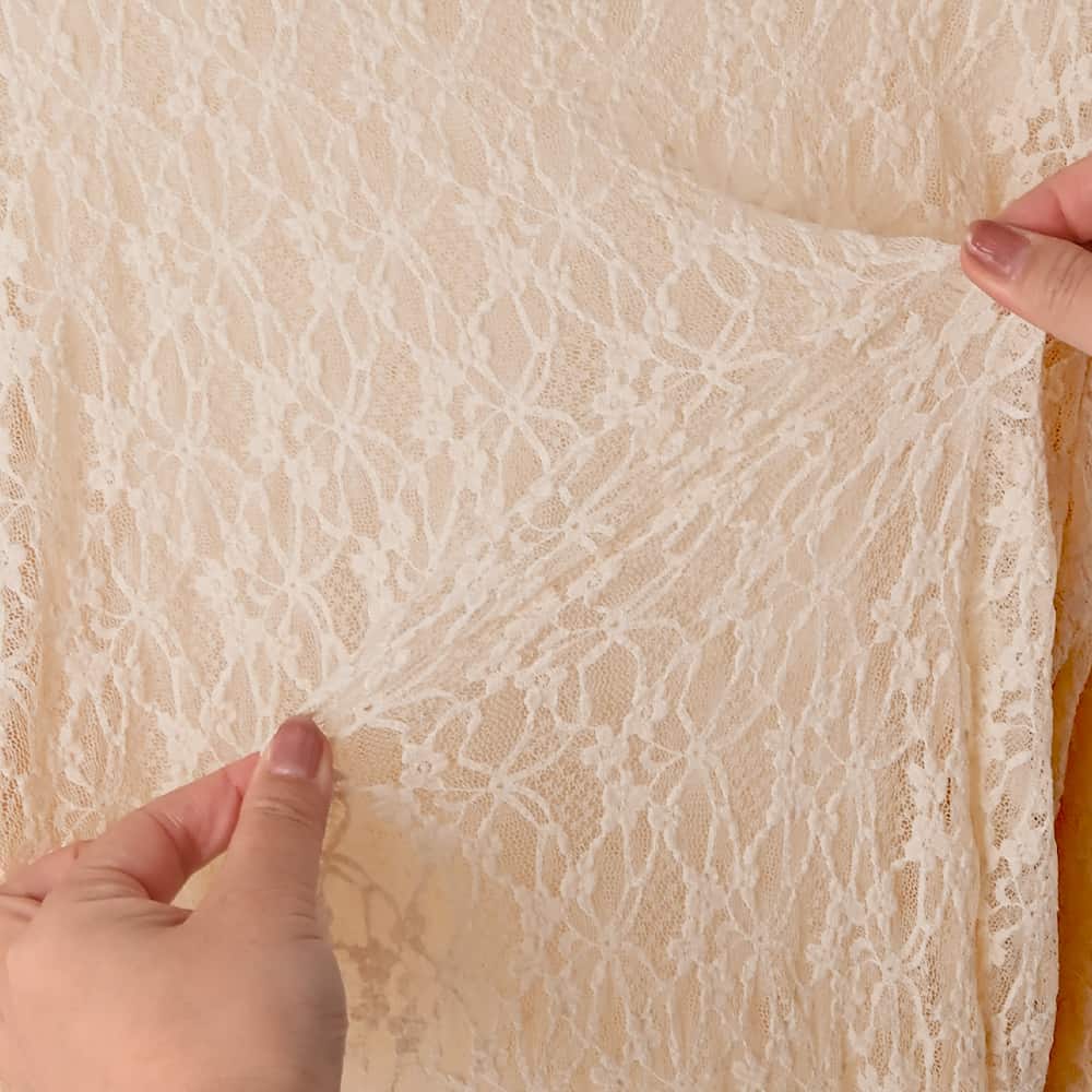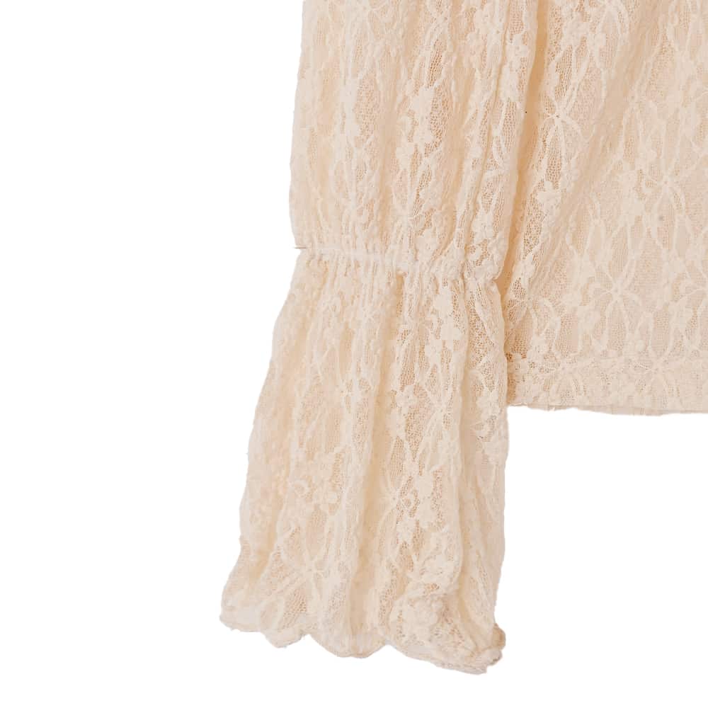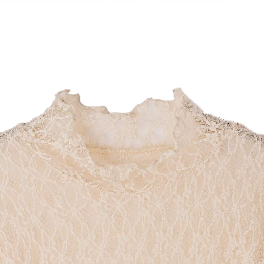 コレは画期的、欲しい!のお声が多数『袖口での重ね着』に着目したレアitemしかもゴム入りでどんな袖丈にも対応◎レース生地のフレア袖インナートップス◆11/13インスタライブご紹介商品◆アーカイブのご視聴はこちらから→【11/13ライブ】【この商品の詳細】◆例えば半端な袖丈(8分袖など)のお洋服などを長袖に見せたいときに活躍する、袖口レイヤード用のストレッチレーストップス。首元・袖口、トップスのデザインによっては裾の複数ポイントからレースをチラ見せできる、オシャレな重ね着アイテムです。◆ただ袖丈が長いだけではなく、袖口から14-15cm程度の位置にゴムを内蔵したのが大きなポイント。これによりあらゆる袖丈に対応しながら、好きなバランスでレースの見せ具合を調節できるようになっています。もちろんストレスを感じないよう、ゴムの締め具合はキツすぎず・ゆる過ぎずになるよう設定しています。◆冬場はトップスやジャケット、ワンピースに合わせて活用しますが、暖かい時期ならベストやジレ、サロペットやジャンパースカートのインナーにしても◎ 持っていると何かと使えそうな、シーズンレスに活用できるインナーです。【近しい商品との比較】対象商品:商品番号235643/下に着るメロウレーシィートップス◆デザイン:あちらはベーシックな長袖(指の根元が隠れるくらい)ですが、こちらは袖丈がより長く、袖口がフレアになっています。また、あちらはボトルネックですがこちらはスタンドネックです。高さは伸ばすと同じくらいですが、ボトルネックの方が下がりやすい(下げやすい)です。◆柄:あちらはストライプ柄系レースですが、こちらはよく見ると花柄という感じのアッサリとした花柄です。◆サイズ感:どちらも伸びるため問題にはなりませんが、こちらの方がゆったりとしています。とくにアームホールや二の腕、ウエスト周りはあちらの方がピッタリとしています。着丈もこちらの方が6-7cm程度長いです。◆肌触り:大体似たような感じですが、こちらはもう少しハリ感があることでしっかり感があるように感じ、さらにもう少しサラッと感が強くなっています。◆透け感:どちらも同じような感じです。◆暖かさ:どちらも同じような感じです。◆用途:あちらは袖口からフレア袖を出したらイマイチな服に向いています(袖口がリブ袖でピッタリとしていたり、カフス袖や袖口がキュッとすぼまっているもの)。こちらは袖口が広くとられたものや、半端な袖丈のものを長い袖丈に見せたいときなど、袖口のレイヤードを目的とする着こなしに向いています。【その他の仕様などの情報】◆着用時期:10-4月が目安◆サイズ感:一般的なMサイズで伸びる『ゆるフィット』(Lサイズ体型にも対応)◆丈感:前は脚の付け根が隠れる丈感/背面はヒップの大部分が隠れる程度の長さ◆シルエット:ストレート◆首元:スタンドネック◆肩幅:普通だが問わないタイプ(よく伸びるため)◆アームホール:普通(とくに狭くも広くもない一般的な開き加減)◆袖幅:普通(その人の腕の太さにゆるフィット)◆袖丈:長袖(指先がちょこんと出る長さ)◆袖口:フレア袖+その上にゴム◆厚み:薄手◆柔らかさ:柔らかさとハリ感が共存◆肌触り:サラッとした感じ◆着用ジワ:できにくい◆毛羽立ち:できにくい◆伸縮性:あり◆光沢感:なし◆透け感:あり◆スリット:なし◆ボタンやファスナー:なし(かぶり着タイプ)◆手洗い:可能◆アイロン:不要◆スチーマー:使用OK【お色について】◆ブラック:定番的な通常のブラックです。◆ホワイト:一般的な白レースのお色。イエロー味などの色味感は無いクリアな発色のホワイトです。◆バニラ:オレンジライトベージュ、という感じの赤味があるバニラ色。ベージュとは異なり肌着見えせず、白黒では合わないニュアンスカラー系によく馴染みます。実はオシャレさんこそ欲するツウ好みな絶妙カラーです。【肌が過敏な方への対応力】とくに硬さなどの刺激が気になる生地ではありませんが、冬場に肌が過敏になってしまう方や、化繊でかゆくなる方には影響が出ることもあるのかもしれません。その場合は中にコットン素材のインナーを着るなどしてご対処ください。着る前に肌を化粧水で濡らし、クリームで水分にフタ(保湿)をしてから洋服を着るのもお薦めです。【お知らせ事項】お素材上、袖口のメロウ処理にバリ(メロウ線から飛び出た繊維)が出やすいお洋服です。着用して目立つようなものではありませんが、気になる場合ははみ出した部分を糸切りハサミで丁寧に取り除いていただいてもOKです。※その際、メロウの本線を切らないようにご注意ください。※素材の特性となりますため、予めご了承いただきますようお願いいたします。【SNS用ハッシュタグ】#236018袖口から出すレーシィーインナートップス(このハッシュタグでInstagramなどSNS内で検索をしますと、こちらをお持ちのお客様のご投稿があれば、簡単に見つけてご覧いただくことができます)