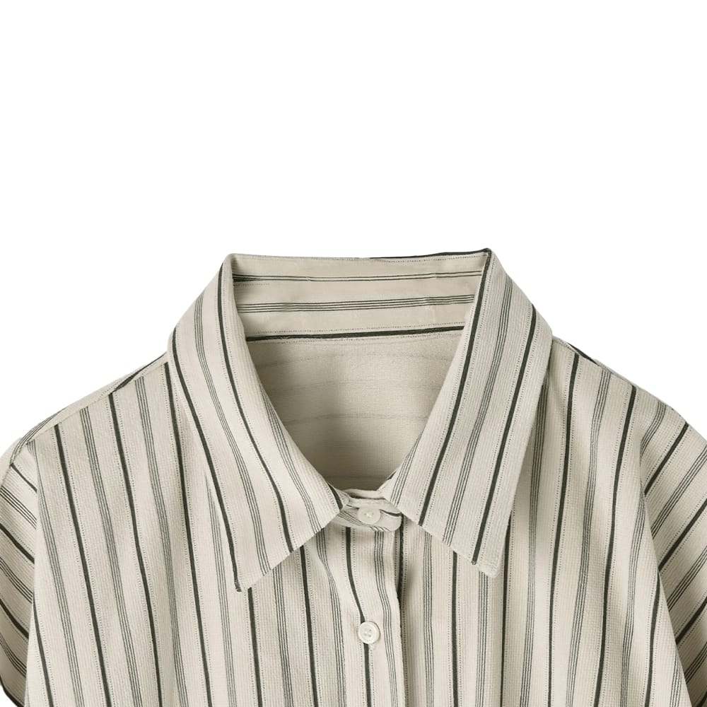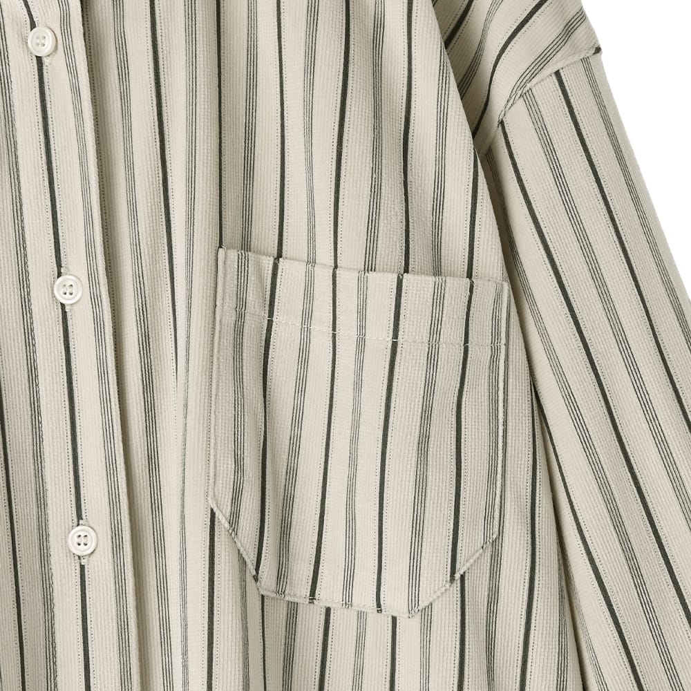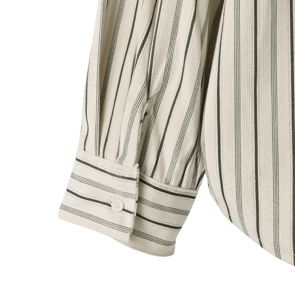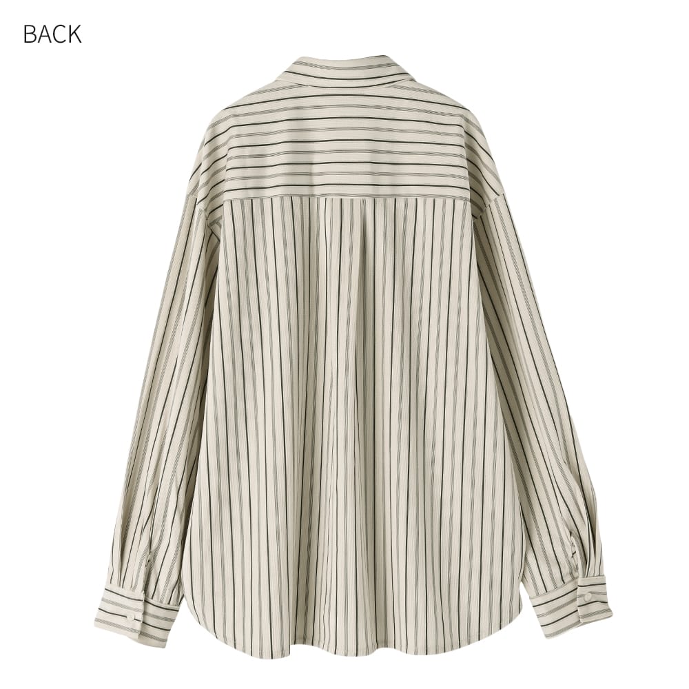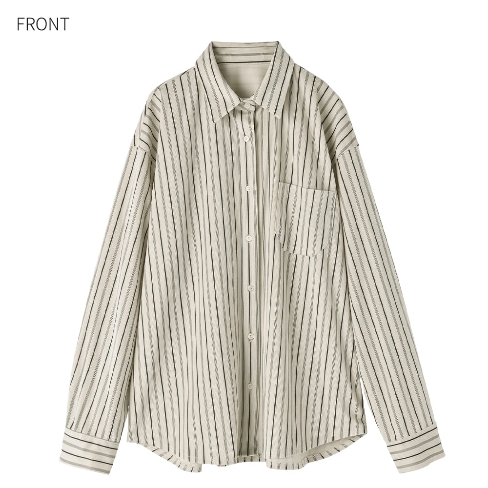 質感も色合いも雰囲気たっぷりで見逃せないベルベットを薄くしたようなオシャレ生地のシワにならない暖か変則ストライプ柄シャツ◆1/15インスタライブご紹介商品◆アーカイブのご視聴はこちらから→【2026/1/15ライブ】ーいつものデリより生地やデザインに凝った、ワンランク上のLUXE(ラグゼ)ライン。【このシャツの特徴】パッと見た感じは普通のシャツ生地に見えつつ、よくよく見ると&触ると珍しい生地であることがわかる、とてもオシャレなストライプ柄シャツ。ベロアのような温もり感がある素材で、ほんのりと暖かな着心地や、柔らかくしなやかな動きが楽しめます。特筆すべきは『ベロアのようだけど厚みがまったく無い』ことで、身体をスッキリと見せる効果に優れて重ね着をしてもスッキリ。普通のシャツと同様に使えてオシャレさだけが増したような、イイとこ取りの素敵なお素材でできています。◆冬から着ていても寒々しさの無い質感。かといって春に重たいわけでもなく、長期間で活用できる使い勝手の良い生地です。◆シャツとしては暖かい着心地なので、寒い時期も嬉しい一枚。ニットやパーカーなどの下に着る際も、普通のシャツより1ポイント上の暖かさで重ね着スタイルを楽しめます。◆シャツを着ているとは思えない、柔らかな動きでストレスフリーな着心地。どこかクッタリとしながらも見た目のフォルムはキレイにキマる、しなやかさの中にコシを備えた優秀素材です。◆生地だけでなく柄も凝っていて、極細の4本線+太線+点線で構成されたオシャレなストライプ柄というのが素敵。単調ではなくメンズのブランドネクタイにあるような、雰囲気のあるストライプになっています。◆ただ線がペタッとプリントされているのではなく、組織のある凹凸ならではの奥行きがある柄感が◎ 普通にサラッと着るだけでも、『なんかひと味違う…』というオシャレさが出てしまいます。【さらにプラス情報】◆暖かさ:普通のシャツ生地のシャツよりはほんのりと暖かさがあります。かといって春に暑いほどでもありません。◆季節感:パッと見は季節感がない生地なので、どのシーズンに着ていても素敵です。触るとベロア風の温もり感を持つことがわかります。◆厚み:厚みはなく、スッキリとしています。◆サイズ感:ヘンな大きさはありませんが、適度にゆったりとしています。バストが大きい方でもまったく問題は無い、十分なゆとりがあります。◆裾:控えめなカーブラインで前後差のある丈感。背面の方が長くなっています。※長さは下記に記載◆シワ:シワはできない生地で、アイロン掛けは不要です。◆ボトムス:スカートでもパンツでも合います。裾はインでもアウトでもOKです。◆静電気:とくに発生しやすい生地ではありませんが、程度の差はその方の帯電体質具合や合わせアイテムなどによりますのと、冬場は乾燥でどうしても…というところはありますので、もしも気になる場合はエレガードなどの静電気防止スプレー等でご対処ください。【その他の仕様などの情報】◆着用時期:10-4月頃が目安◆サイズ感:ゆとりのあるサイズ感(Lサイズ体型にも対応)◆丈感:前は脚の付け根程度の丈感/背面はヒップが隠れる程度の長さ◆シルエット:ストレート◆首元:シャツ襟◆肩幅:広め◆アームホール:やや広め◆袖幅:やや広め◆袖丈:長袖(手の甲が隠れる長さ)◆袖口:カフス+ボタン1個あり◆厚み:普通◆柔らかさ:柔らかさの中にハリ感が共存◆肌触り:しっとりと滑らかな感じ+少し温もり感あり◆着用ジワ:できにくい◆毛羽立ち:できにくい◆伸縮性:あり◆光沢感:なし◆透け感:なし◆スリット:なし◆着脱:フロントボタン開き◆ボタン:生地と同色染めの貝パール調光沢ボタン◆ポケット:左胸にあり◆裏地:なし◆手洗い:可能◆アイロン:不要◆スチーマー:使用OK【お色について】◆ナチュラル:ほんのりと温かみのあるオフホワイトのような白系カラーに、褪せたネイビーの線が入っています。色味はイエロー系ですが、それが印象として意識に入ってくるほどの色味感はありません(ごくごく微量に淡い感じです)。◆ベージュ:イエロー系ベージュにグレイッシュな色素を混ぜて、黄色味をかなり抑えたようなベースカラー。同じく色味を抜いて褪せたような、ブラウンとはわからない感じのブラウン線が入っています。色素が控えめでカッコ良さと雰囲気がある、オシャレなニュアンスベージュです。【SNS用ハッシュタグ】#236107ベルベットタッチストライプ柄シャツ(このハッシュタグでInstagramなどSNS内で検索をしますと、こちらをお持ちのお客様のご投稿があれば、簡単に見つけてご覧いただくことができます)