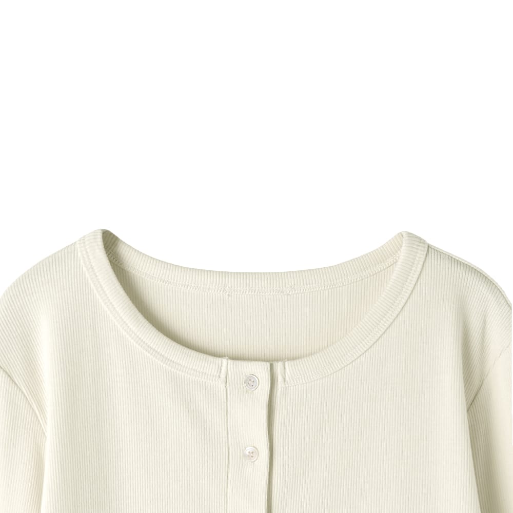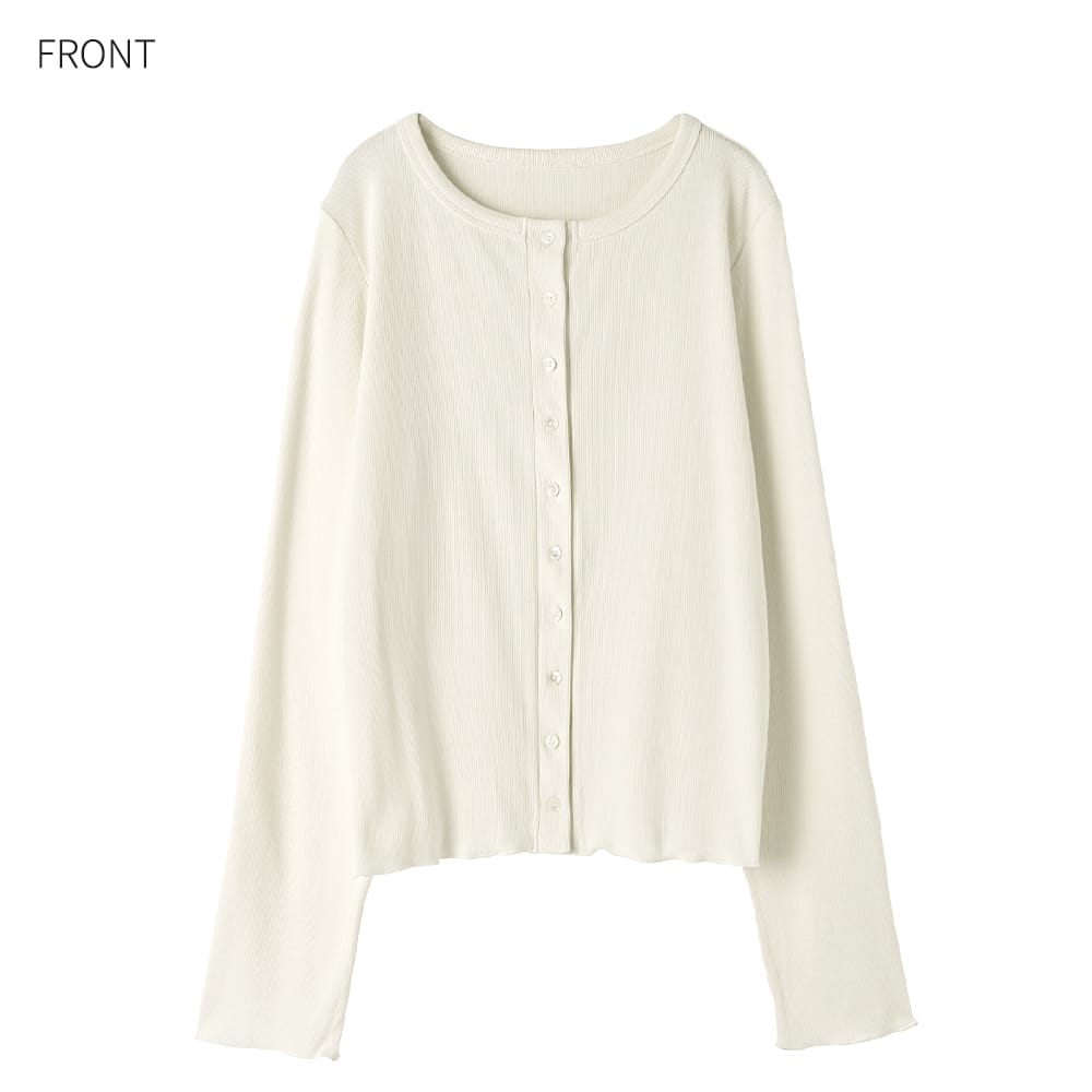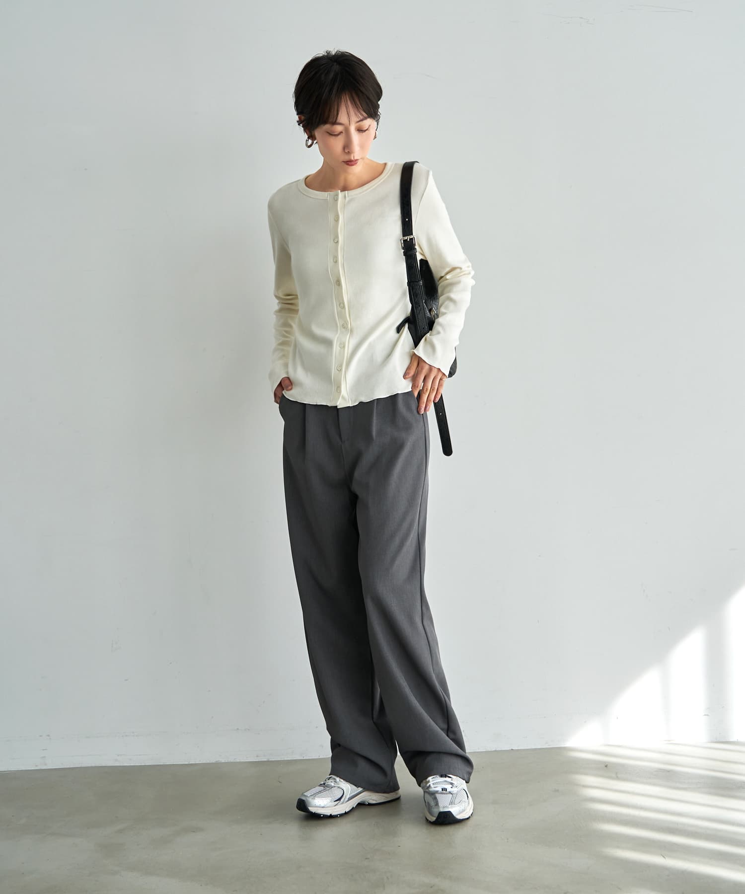 シンプルだけど『なんかイイ』存在これは使える匂いがプンプン香る、肌触り抜群の3way前開きカットソー◆1/22インスタライブご紹介商品◆アーカイブのご視聴はこちらから→【2026/1/22ライブ】【このトップスについて】◆素晴らしいカットソー生地が新登場!◆肌触りや着心地に優れたお薦め生地◆旬な前ボタン×いっぱいデザイン◆絶妙なゆとりの秀逸シルエット◆シンプルめで使いやすさ確実の予感◆端処理がメロウでさりげなくオシャレ◆トップス、羽織り、インナーの3役◆着る季節を問わない質感◆最後は飽きたら部屋着にも良い【このトップスの詳細】おそらく多くの方に「あ、この生地、好き」と感じてもらえるのではないか…とウキウキしている、当店オススメのカットソー生地を使用した長袖トップス。肌触りはどことなくスベスベしながらサラッとしていて肌離れが良く、ただ柔らかいだけではなくハリ感もあって、安心感のある着心地が叶うとても良い生地です。薄くなく・厚くもなくの生地厚も使いやすく、一枚で着てもジャケットなどの中に着てもサマになる質感。大きくはないけど絶妙なゆとりがあり、ピチピチせずに着れるところも大人の女性に心強いポイントです。◆こういうタイプのデザインでは割と珍しく、端処理がメロウというのも特徴。裾はアウトで着るのがメインとなるトップスですが、その際に直線ではないラインがさりげないオシャレ感を出してくれます。◆メロウを使うことにより、自然な女性らしさやキレイめ感も備えたデザインに。思いきりカジュアルなトップスは似合わなくなった大人の女性にも、取り入れやすいカットソーだと言えます。◆中に細身のカットソーやタンクトップなどを着て、上下のボタンをお好きなバランスで何個か開け、インナーを見せる着こなしなども楽しめます(インスタライブで実演)。◆前を開けて羽織りとして使ったり、ジャケットやサロペットなどのインナーにするのも可愛いと思います。◆ボトムスはパンツでもスカートでも◎ 暖かくなったらノースリーブのワンピースに羽織ったりするのも良さそうです。◆肌触りが良いため、傷んできたり・飽きてきたりしたらオシャレな部屋着として活用するのもアリ。最後まで着倒せるコスパの高さも優秀です。◆お好みでボトムスに裾インで着るのも、もちろん問題ありません。【さらにプラス情報】◆暖かさ:しっかりめの長袖Tシャツと同じくらいです。◆サイズ感:適度なゆとりがある普通のMサイズという感じでピッタリとせず、Lサイズの方にも概ねお楽しみいただけるかと思います。バストが大きくても問題はなく、ボタン間が開くようなことはありません(下着着用の状態のトップサイズで95cm程度までが目安)。◆静電気:とくに発生しやすい生地ではありませんが、発生の有無はその方の帯電体質具合や合わせアイテムなどによりますのと、冬場は乾燥でどうしても…というところはありますので、もしも気になる場合はエレガードなどの静電気防止スプレー等でご対処ください。◆シワ:シワは気にならない生地です。◆毛羽立ち:とくに毛羽立ちがおきるような生地ではありません。ただし動作のクセによる摩擦などにより個人差があるかもしれませんので、できた場合は毛玉取りクリーナー等でご対処ください。【その他の仕様などの情報】◆着用時期:10-5月上旬くらいまでが目安◆サイズ感:適度にゆとりのあるサイズ感◆丈感:前は下腹を覆う程度の丈感/背面は腰が隠れる長さ◆シルエット:ストレート◆首元:広めに開いたクルーネック(鎖骨が見える程度)◆肩幅:広め◆アームホール:普通(とくに狭くも広くもない一般的な開き加減)◆袖幅:普通◆袖丈: 長袖(指が半分くらい隠れる長さ)◆袖口:メロウ処理(伸縮性あり)◆厚み:普通◆柔らかさ:柔らかさの中にしっかり感も共存◆肌触り:滑らかでサラッとした柔らかさの中にハリ感もある感じ◆着用ジワ:できにくい◆毛羽立ち:できにくい◆伸縮性:あり◆光沢感:なし◆透け感:なし(アイボリーは僅かにあり)◆スリット:なし◆着脱:フロントボタン開き(フルオープン可能)◆ボタン:白蝶貝パール風光沢ボタン ◆裏地:なし◆手洗い:可能◆アイロン:不要◆スチーマー:使用OK【お色について】◆ブラック:定番的な通常のブラックです。◆アイボリー:真っ白ではなく、少し温かな色味感のあるニュアンスホワイト。クリーム色というほどの強いイエロー味や目立つ赤味はありません。【SNS用ハッシュタグ】#236118メロウ裾カーデ型テレコトップス(このハッシュタグでInstagramなどSNS内で検索をしますと、こちらをお持ちのお客様のご投稿があれば、簡単に見つけてご覧いただくことができます)