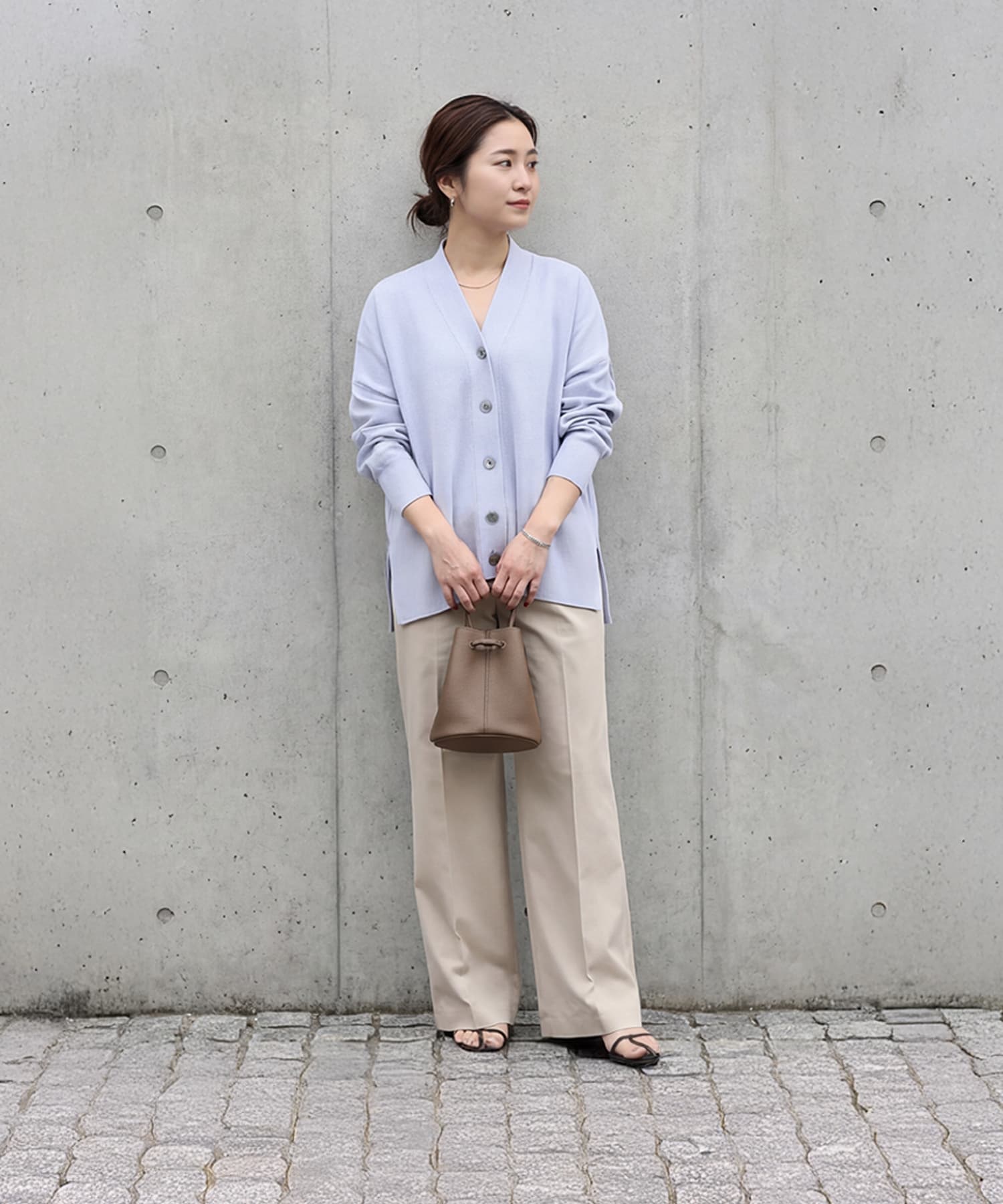 【綿85%で肌に優しい爽やかタッチ】ジャケットのようなハリ感と高級感スポンディッシュで軽やかな着心地サラッとした春夏素材カーディガン◆3/12インスタライブご紹介商品◆アーカイブのご視聴はこちらから→【2026/3/12ライブ】【secectionシリーズが始動】国内のメジャーな大人ブランドやショップのアイテム制作を手掛けている、老舗メーカーさんが企画生産するアイテムをSTYLE DELI視点でセレクトしたnewシリーズ。ネットショップならではの買いやすい価格帯とは少し異なりますが、優れた品質で大人に相応しい雰囲気を持つアイテムを好む方に向けてご用意したシリーズです。その中でも、店頭で試着をしなくても失敗しにくく、着やすくてお薦めできるもの・高額過ぎないものを厳選。そうすることでオシャレの幅が広がって良いかなと考えましたので、STYLE DELIのアイテムとMIXして、大人ならではのオシャレをお楽しみいただければと思います。※こちらはセレクト商品になりますので、STYLE DELIのネームタグは付いておりません。また、他店や他ブランドでも取り扱いがあることがございます。【このカーディガンの特徴】◆軽いのにジャケットのようなしっかり感◆スポンディッシュ系の弾力がある素材◆ハリ感のあるソウバリ編み春夏ニット◆サラッとした肌離れの良い着心地◆人気のコットン系(綿85%)◆見てすぐにわかる高級感◆着るとテントライン風の立体感あり◆明るい季節にぴったりな色合い◆ゆったりとしたサイズ感◆肉感を拾わず体型カバー効果◎◆シンプルで着回しやすいデザイン◆毛羽立ちやシワができにくい◆流行りに関わらず長く使える【このカーディガンの詳細】◆温度感:暖かい日はこれが外歩き用の羽織りになるような、ジャケット程度の暖かさがあるカーディガン。しっかりとしているため夏は着れませんが、季節感を限定する素材ではなく秋冬も使用可能です。この上にコート類を着用することもできます。◆フォルム:横幅がゆったりとしたストレートフォルム。余剰生地が多めなので、着ると動きが出て、横から見るとテントラインのような立体感を持つ、オシャレな形になります。◆生地:糸は春夏向けでサラッとした肌触り/チクチク感なし/柔らかさよりはハリ感が目立つ/ソウバリ編みでしっかりとしている/スムースなハイゲージ編みで品の良さあり/春夏用ニットジャケットのような厚み/着心地に重さはなし/スポンディッシュ系の質感で弾力あり/毛羽立ちや静電気はおきにくいほう/シワになりづらい/素材は春夏だがしっかり感があるため秋冬も活用OK◆雰囲気:セレクトショップ系/コンサバではないキレイめ感/大人ブランドの店頭で2万円代で売っている感じの質感/相応の高級感あり/幅広い大人に支持される質感/プチプラカーデには到底出せない雰囲気/大人だからこそ着こなせる質感ながらも、若作り感やミセス感は皆無/職場やホテルでのお茶など、品と華が欲しいが気張りたくないシーンにも対応◆商品名:体型を気にせずに、気負わず着れるカバー力に優れることから『リラックス』をイメージし、そこから名前を付けました。【さらにプラス情報】◆シワ:とくに気になるような生地ではなくアイロン掛けは不要ですが、スチーマーをかけるとこの高級感がしっかりとキープされます。◆一枚で着用風の可否:ある程度の骨格や肉付きがあれば、インナーや谷間を見せずに『素肌にVネック風』の着こなしができます。華奢な方などはインナーが少し見えるかもしれません。◆着こなし:前を開けても閉じても素敵なデザインです。ハリ感が強いため肩掛けや腰巻きには向きません。◆合わせアイテム:スカートでもパンツでも良く、ワンピースやジャンパースカート、サロペット合わせもOK。中にシャツなどを重ねるのもOKです。【その他の仕様などの情報】◆着用時期:夏以外◆サイズ感:ゆったりとしたサイズ感(Lサイズ体型にも対応)◆丈感:前は脚の付け根程度の丈感/背面はヒップがギリギリ隠れる長さ◆シルエット:ワイドなストレート◆首元:Vネック(中心は鎖骨下4-5cm程度の開き加減)◆肩幅:問わないタイプ(ドロップショルダー)◆アームホール:広め◆袖幅:広め◆袖丈:長袖(指が半分隠れる長さ)◆袖口:少し長めのリブ編み◆袖のたくし上げ:可能◆厚み:しっかりめ◆柔らかさ:柔らかさよりはハリ感が強い◆肌触り:サラッとして接触冷感系/肌離れの良さ◎◆着用ジワ:できにくい◆毛羽立ち:できにくい◆伸縮性:あり◆光沢感:なし◆透け感:なし◆スリット:両サイド裾にあり◆着脱:フロントボタン開き◆ボタン:黒蝶貝系パール光沢ボタン(ブラック系)◆ポケット:なし◆裏地:なし◆手洗い:可能◆アイロン:不要◆スチーマー:使用OK【お色について】◆アイボリー:着たときの印象は『クリアな白のカーディガン』。本当に真っ白なものと並べると少し深みのある、肌馴染みが良い白(=ニットでよく使われる定番の白)です。イエロー味などはありません。◆ラベンダーブルー:水色の中に僅か