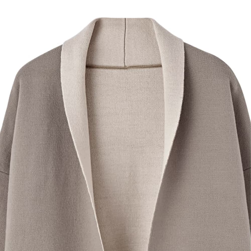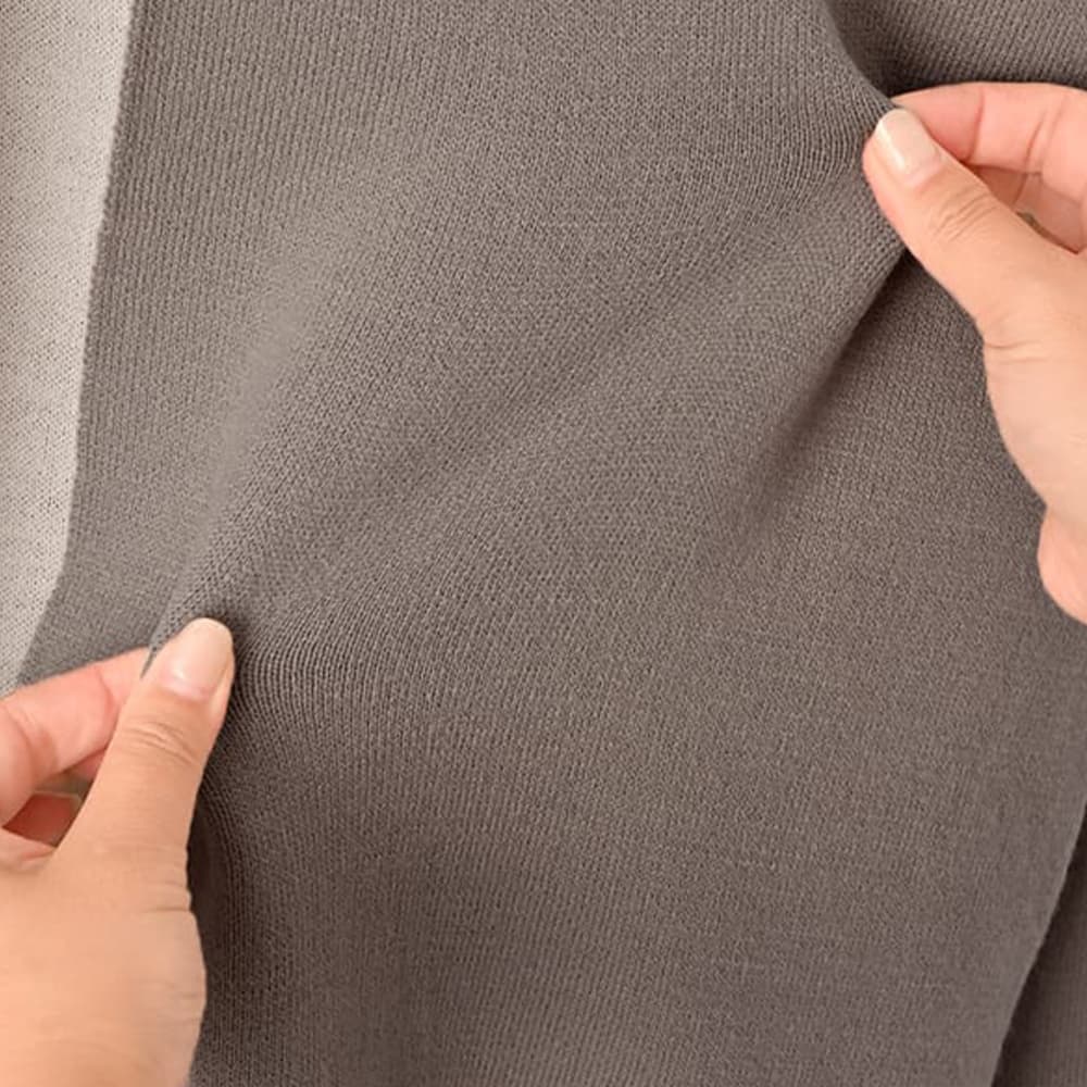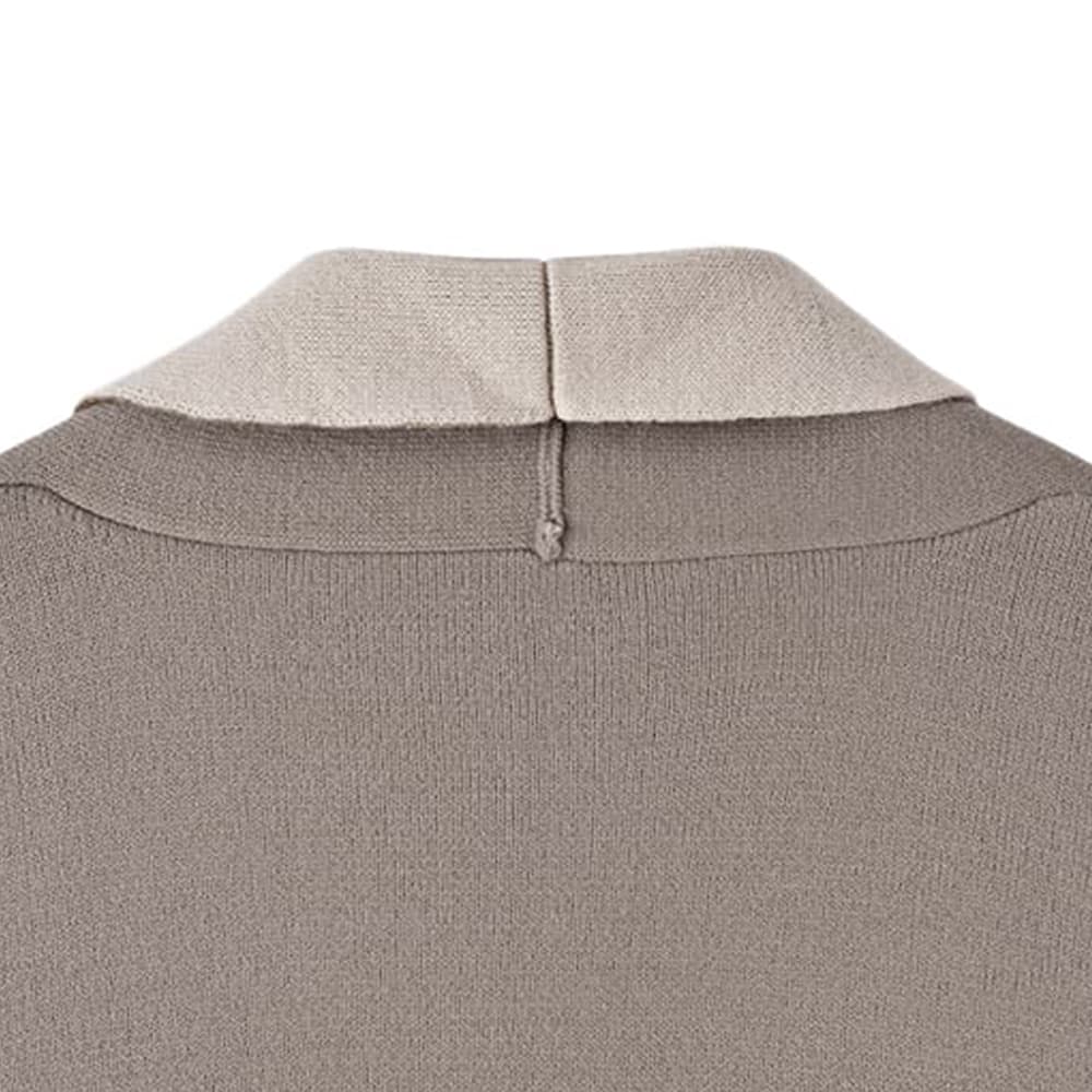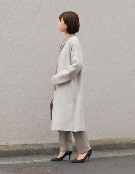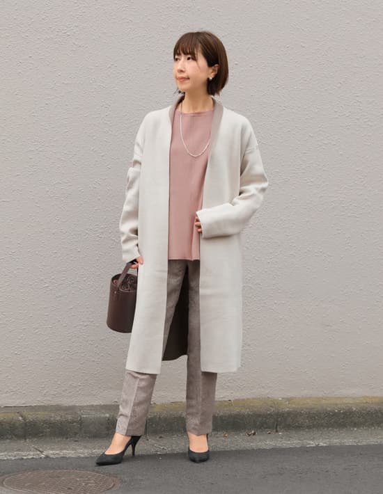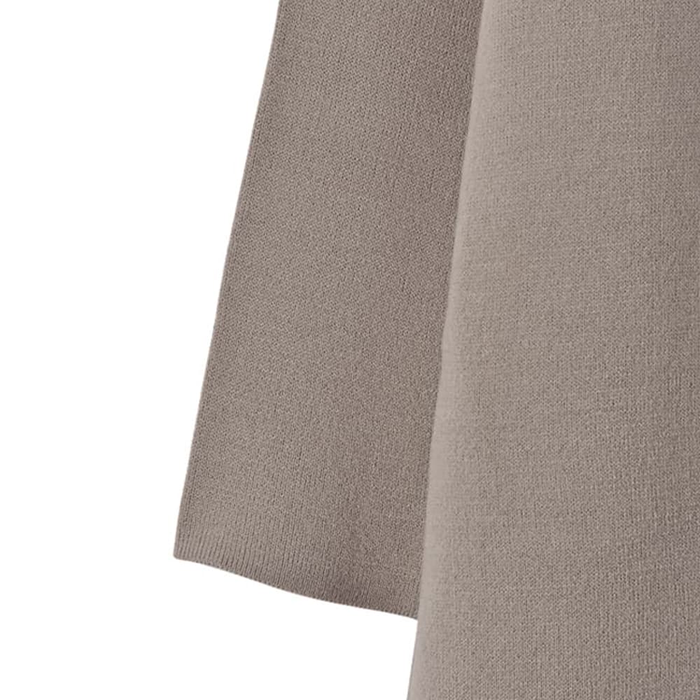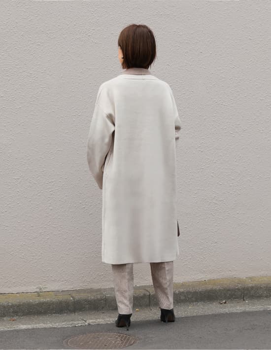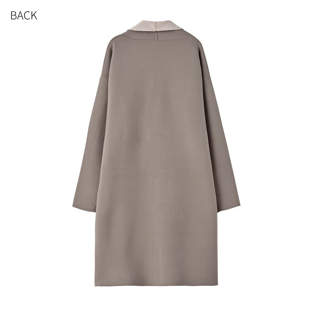 ーシンプルコーデがお好きな方にお薦めー気軽にサッと羽織れるアウターならコレ!スッキリとした軽量・高級感ニットガウン【このアイテムについて】◆ササっと羽織る気軽なアウターとして活躍する、スッキリとしたニットガウン。秋口や春先などの『コートを着るほどでもないけど少し肌寒い』時期に活躍する羽織りアウターです。◆生地は高級ショップでもよく使われるダブルフェイス編みで、両面ともに主役になれる質感(=裏側という概念が無い)というのがオシャレ。リバーシブルではありませんが、裏側の色を少し変えた配色デザインにしているため、動くたびにチラチラ見えてアクセントになります。◆編み地の表面はスッキリとフラットなハイゲージ編み。襟やボタンなどの飾りも無く、とにかくスッキリとしています。そのためシンプルに徹した洗練コーデを作ったり、ボタンやファスナーなどのディテールがある服と合わせる際に、うるさくならずに便利です。◆裏地はありませんが滑りの良い編み方をしており、中に着ている服とは噛まずに快適な着用が可能。編み糸の間もしっかりと詰めているので風を通しにくく、見た目よりも暖かさがある着心地になっています。【こんな方にお薦め】◆シンプルで大人っぽい格好が好き◆軽くてスッキリとしたアウターが欲しい◆暑がりなので暖か過ぎないアウターが欲しい◆車移動が多いからコートだと邪魔◆どちらかといえばパンツ派【さらにプラス情報】◆サイズ感:ゆったりとした感じで、アウターとして様々なお洋服に羽織るのに不足がない大きさです。細身の方からややふくよかな方まで、体型および身長も問わずにご使用いただけます。◆雰囲気:大人っぽくシンプルで洗練された感じ。(社長が直々に大量材料買い付けを行った特別企画品なので)買いやすい価格ですが素材は良く、高そうなものを着ているように見える高級感があります。◆暖かさ:ブルゾンやトレンチコート程度。◆重さ:とくに重さを感じず気軽に着れるため、重たいアウターが苦手な方にとても人気があります。◆肌触り:チクチク感とは無縁のスムースな肌触り。サラッとしながら柔らかさや温かみもある、心地良いタッチです。◆毛羽立ち:とくに毛羽立ちやすい生地ではありません。よほど摩擦が集中すれば毛羽立つこともあるのかもしれませんが、ニットの中ではかなり強い方です。もしも気になる場合は毛玉取りクリーナー等でご対象ください。テスコムのものは毛玉未満の毛羽立ちも取れて、お値段も手頃なのでお薦めです。◆静電気:しっかりとしているためあまり影響は受けない傾向にありますが、合わせるものやその方の帯電体質具合によって左右されますし、冬場は乾燥でどうしても…というところはありますので、気になる場合はエレガードなどの静電気防止スプレーでが対処ください。◆丈伸び:ニットの中では丈伸びがおきにくいタイプ。厚みのあるコート用ハンガーなどに掛ければハンガー保管も可能です。たたみで保管をしてもシワになりにくく、どちらでもOKです。◆シワ:とくにシワができやすい素材ではありませんが、気になる場合はアイロンよりもスチーマーの方が向いており、手軽に伸ばすことができます。ニット類のスチーマー掛けは縦方向に動かすと丈伸びの原因となりますので、横方向に動かすのがお薦めです。◆前留め:ボタン等の留め具は無く、羽織りタイプのトッパー型デザインです。お客様の中にはブローチなどで留めたり、ベルトをする方もいらっしゃいます。◆合わせアイテム:スカートでもワンピースでも合いますが、パンツは一番カッコいいです。Iラインでスッキリとまとめるのが素敵なので、ボリュームのある膨らみフォルムのスカートなどを避ければ大概は合います。丈感も特に問わず、ロング丈のものとも問題なく合わせることができます。◆補足情報:ブリックのみ、プロデューサーの個人的趣味によるアソビで、裏側は柄編みになっています。表のレンガ系レッドに良く馴染む配色で、ミッソーニ風の複数色を使用した編み地が楽しめます。程よく個性あるデザインがお好きな方にはぜひお薦めです。【着方について】◆襟部分は折り返して裏側のカラーをチラ見せすることもできますし、見せないこともできます。◆袖口を折り返して、そこから配色を見せてもポイントになります。◆襟を立てると首の後ろがスッポリと隠れて暖かく、強風時や自転車の際なども暖かくて便利です。【その他の仕様などの情報】◆着用時期:Gジャンやトレンチコートと同様◆サイズ感:ゆったりめのサイズ感(Lサイズ体型にも対応)◆丈感:膝が隠れる程度の丈感◆シルエット:ストレート◆肩幅:問わないタイプ◆首元:ノーカラー(外側に折り返して薄い襟を作ることも可能)◆袖丈:長袖(手の甲が隠れるくらい)◆袖幅:広め◆アームホール:広め◆厚み:やや厚手◆重さ:550グラム程度◆伸縮性:あり◆光沢感:なし◆透け感:なし◆スリット:なし◆ボタン