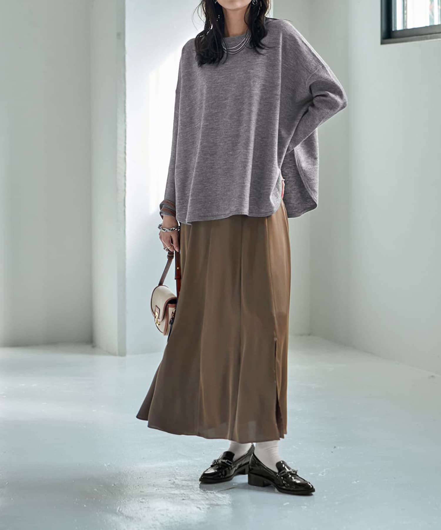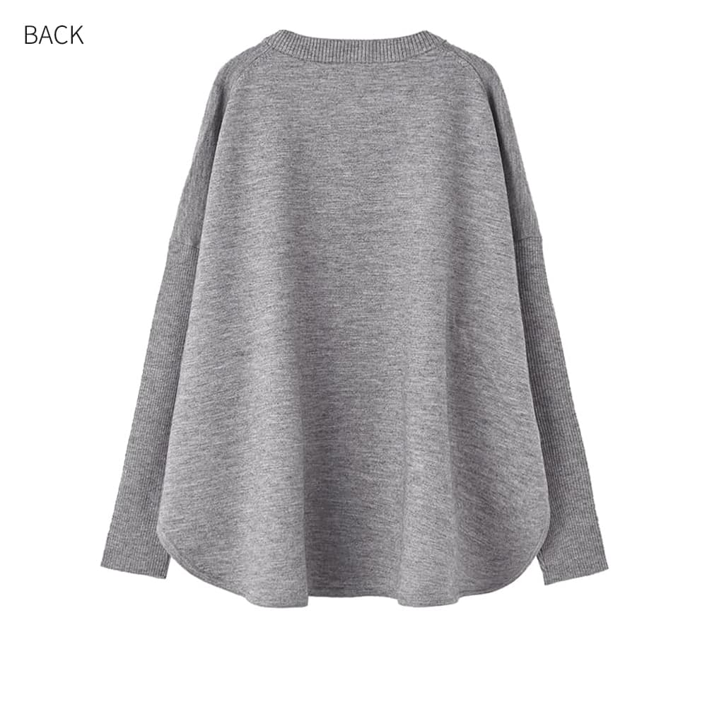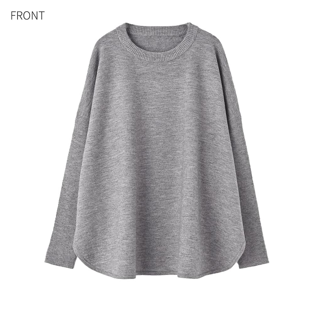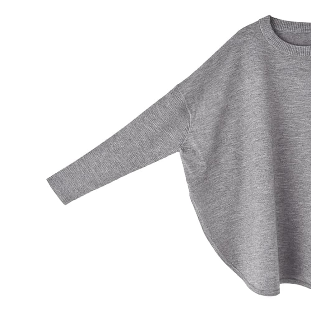 シンプルなのに着ると抜群に可愛い!そういうところが大人の日常に合う、強弱が効いたシルエット自慢のニット【このニットトップスについて】◆身幅が大きいことで生まれる、独特なシルエットの可愛さが主役のニットトップス。前も横もカワイイけど、とくに後ろ姿のシルエットが抜群にオシャレ!とご好評をいただいています。◆ゆったりとした身頃に対して、袖幅はジャストサイズに仕上げたところもポイント。さらに編み地もリブ編みに切り替えて強弱を作り、『大きい人』にならない見た目のメリハリ感を持たせています。◆こういったトップスはドルマンスリーブである場合が多くアウターに困ることがありますが、冬なのでアウターを選びにくくならないよう配慮。ドルマンではない袖形状に設計し、実用的な形に仕上げています。◆裾は両サイドに深めのスリットを持つラウンド形状。ゆったりとした大きさの中にヌケ感を作り、全身のバランスをとりやすくしています。これにより、パンツでもスカートでもボトムスを選ばず合わせられる使いやすい一枚になっています。◆体型カバーもできますし、シンプルなのに普通過ぎずに『さりげなくオシャレ』というところが◎ 大人のデイリーに適した感じのお薦めトップスです。【さらに追加情報】◆編み地:身頃部分はシンプルなハイゲージ編み。袖部分のみリブ編みに変えて、見た目の変化と細見え効果を出しています。◆温度感:厚手でも薄手でもなく、冬を通して春先まで着やすい質感。冬限定のテクスチャーではなく、ロングシーズンで使える素材です。中に防寒インナーを着れば、真冬でも快適に過ごせます。◆肌触り:サラサラ感とふんわり感に加えて、わずかな硬さ(ハリ感)みたいなものが混在した生地。チクチクしないサッパリ系の肌触りで、しっかりしているのに軽い着心地です。◆毛羽立ち:とくに毛羽立ちがおきやすいニット地ではありません。◆静電気:その方の帯電体質具合や合わせアイテムの素材にも左右されますが、冬は乾燥でどうしても…というところはありますので、気になる場合はエレガードなどの静電気防止スプレーでご対処ください。【その他仕様などの情報】◆着用時期:10-4月が目安◆サイズ感:かなりゆったりとしたサイズ感◆丈感:脚の付け根が隠れる程度の丈感/背面はヒップのほとんどが隠れるくらいの長さ。◆シルエット:ワイドストレート◆首元のデザイン:自然な開き感のクルーネック◆肩幅:問わないタイプ(ドロップショルダー)◆アームホール:広い◆袖幅:普通◆袖丈:長袖(手の甲が隠れる長さ)◆袖口:リブ編み◆厚み:薄過ぎず安心感のある厚さ◆柔らかさ:柔らかさの中に多少ハリ感あり◆着用ジワ:できにくい◆毛羽立ち:できにくい◆伸縮性:あり◆光沢感:なし◆透け感:なし◆ボタン:なし◆ファスナー:なし◆ポケット:なし◆裏地:なし◆手洗い:可能◆アイロン:不要◆スチーマー:使用OK【お色について】◆ネイビー:青味が強い・弱い、明るいなどのクセはとくに持たない、深みのあるベーシックな紺色です。◆グレー:薄いグレーと濃いグレーの糸が混ざった明るい発色の杢グレーです。【SNS用ハッシュタグ】#235216ワイドボディニットトップス(このハッシュタグでInstagramなどSNS内で検索をしますと、こちらをお持ちのお客様のご投稿があれば、簡単に見つけてご覧いただくことができます)