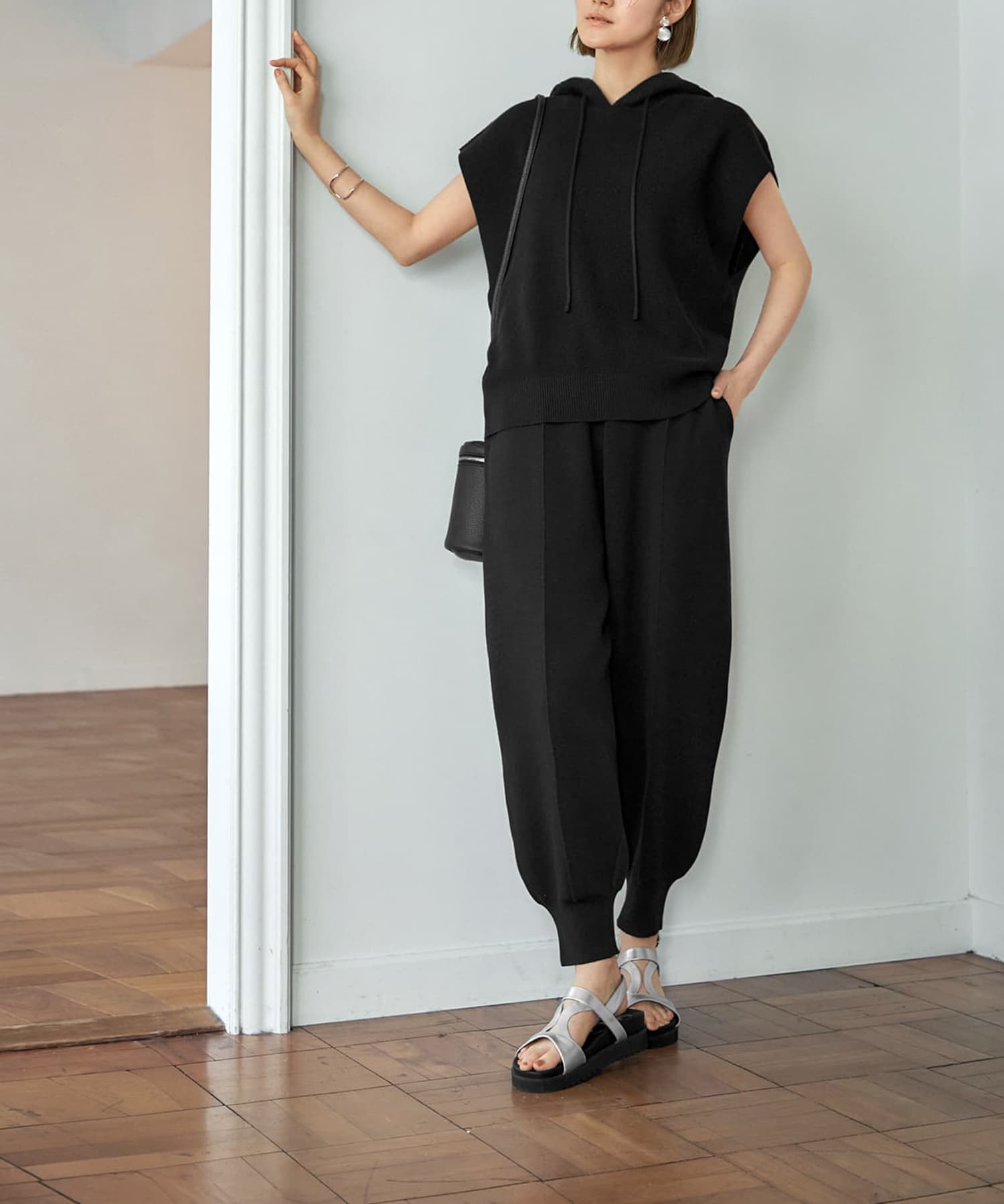 【さらに買いやすい価格になりました】暑くないキレイめな大人フーディー重ね着をしてもカワイイ3シーズン仕様【このトップスの特徴】◆こだわりのSofty Cotton素材シリーズ◆夏に気持ちの良いサッパリとした肌触り◆軽量で通気性の良いニット素材◆暑さを感じないフード付きデザイン◆トップスとしてもベストとしても使える◆ゆったりめのサイズ感◆カジュアル過ぎない雰囲気◆スカートにもパンツにも合う◆ジャケット合わせもカワイイ◆手洗い可能◆とくに流行りとは無関係なデザイン【素材について】『真夏に心地良い肌触り』をテーマに製作した、ソフティコットンシリーズ。サッパリとしたタッチが夏に気持ち良いコットンニットですが、コットンだけだと硬さや重さが出てしまうため、適量のレーヨンをブレンドすることで着やすく・扱いやすくした快適お素材です。それによりコットンならではのサッパリ感と、レーヨンが生む柔らかなしなやかさを両立することを実現。大量の素材生産により通常よりも買いやすい価格となっておりますので、ぜひこの質感をお楽しみいただければと思います。【こちらのフ―ディーは】『夏でも着れる暑くないフ―ディー』を目指し、いく通りかの着こなしに使えるデザインで製作。フレンチスリーブトップスとしてもカワイイですし、下にカットソーなどを着てベストとしても使えるので、春夏秋と3シーズンで活躍します。フード付きのトップスがあれば、陽射しが強いときにかぶって頭皮を守れたり、急な雨のときに髪を隠したりの対応ができて便利。熱がこもらない素材でサラッとしており、頭部や首元、首後ろが暑くならないのもポイントです。◆温度感:パッと見はしっかりとした生地に見えますが、編み目を詰めていない編み方なので編み目間の通気性が良く、軽くて涼しい着心地になっています。◆雰囲気:スウェットのようなカジュアル感が出ないところが特徴。ニットならではのキレイめ感で大人っぽく着ることができます。◆編み地:表面に凹凸を付けたワッフル編み。サーマル生地風の編み地でのっぺりとしないオシャレさがあり、凹凸で肉感を拾いづらい安心感もあります。◆サイズ感:身体のラインが出ないゆったりめのサイズ感。Lサイズ体型の方にも気負わずお楽しみいただけます。【デザインについて】◆袖丈:着ると短めの半袖丈になるノースリーブ構造。身幅が広いためそのようになります。◆着かた:中に何かしらのインナー(タンクトップ等)を着て着用するタイプで、アームホールの開きはやや大きめに設計。そのため下にTシャツやカットソー、シャツなどを着て、ベスト風に着ることもできます。◆フード:敢えてボリュームを出さずにスッキリと見えるよう設計。身体の厚み感を増やすことなく、フードの可愛さが楽しめます。◆端処理:フードの端処理がリブ編みというのも、少し珍しくて可愛いポイント。柔らかめの生地に対してフチがしっかりとするため、ナヨナヨとヨレずに安っぽさを回避し、キレイな形をキープします。◆紐:カジュアルな質感の別資材ではなく、同じ糸を紐状に編んだものを付けて大人っぽさをプラス。長めの紐をたらんと垂らして着るのがデフォルトですが、お好みで途中を結んで短くしてもOKです。◆裾:キュッとすぼまらないよう、緩めに編んだリブ編み。ウエストにはり付かず、自然に下に落ちるようデザインしています。【さらにプラス情報】◆ボトムス:パンツでもスカートでも合います。同シリーズのジョガーパンツ合わせでセットアップ風に着るのも素敵です。(※フ―ディーとジョガーパンツは編み方が異なり表面感が違いますが、色は同じです)◆保管:この素材の特性として、軽量なのでハンガーにかけておいても丈伸びの心配はほぼありません。少しは伸びるかもしれませんが気にするほどではないと予測ができます。※肩の形が崩れないよう、スポンジ付きのハンガーを2本重ねするなどして厚くし、肩部分の生地にかかる負担を軽減するのがお薦めです。【その他の仕様などの情報】◆着用時期:3-10月頃が目安◆サイズ感:ゆとりのあるサイズ感(Lサイズ体型にも対応)◆丈感:前は下腹が隠れる丈感/背面は腰が隠れる長さ◆シルエット:ストレートに近い形◆肩幅:問わないタイプ◆アームホール:広め◆袖丈:短めの半袖/長めのフレンチスリーブ◆厚み:薄手寄りの普通◆柔らかさ:柔らかめ◆肌触り:サッパリとした感じ◆着用ジワ:できにくい◆毛羽立ち:できにくい◆伸縮性:あり◆光沢感:なし◆透け感:なし(ホワイトもあまり気になりません)◆ボタンやファスナー:なし(かぶり着タイプ)◆手洗い:可能◆アイロン:不要◆スチーマー:使用OK【お色について】◆ブラック:通常の定番ブラックです。◆シアン:グリーンの中にブルーを少しブレンドして、雰囲気を出したお色です。◆ホワイト:一般的な白ニットのお色。とくにクリーム色がかっていたり等のクセはありません。【SNS用ハッシュタグ】#235355ソフ