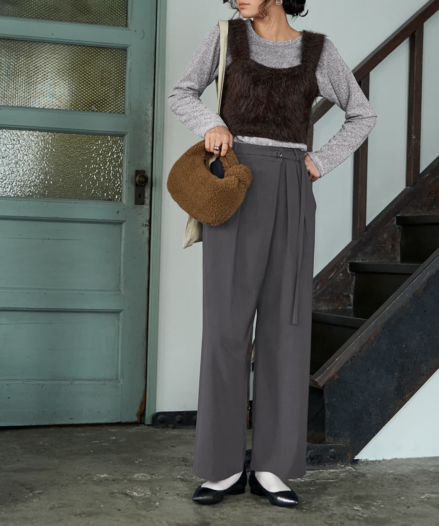 これなら気軽にトライできると好評!不安を取り除いた使いやすいビスチェ【このビスチェのポイント】◆胸が大きくても強調せず、太って見えない素材とフォルム。◆小さくないかな?大きくないかな?の心配ナシ。よく伸びてピチピチせず、サイズ感フリーな安心感。◆ビスチェ初心者でも使いやすい、クセの無いシンプルなデザイン。◆長時間の着用でもまったく苦しくならない、エアリーでストレスフリーな着心地。【このアイテムの特徴】◆シャツやブラウスに重ねたり、ワンピースに重ねたりして、手持ちのお洋服を味変できる便利なアイテム。ヤクニット風の毛足がある糸を使用したニットビスチェです。 ◆シンプルなお洋服も、これを足すことでイッキに今っぽく・オシャレ感が増し増しに。視線を上に集めてくれるため、全身で見たときに頭身バランスが良くなるという利点もあります。◆使用している糸は違うのですが、当店で長年人気のふわふわシャギーニットシリーズの特性に似ていて、・しっとりと身体に添う感じがあり膨張しない・よく伸びてピチピチにならない・毛が抜けにくい・毛羽立ちがおきない・チクチクしない・シワができない・薄手でもホンワリと暖かいなどの特徴を備えた、イイとこどりのニット生地になっています。◆薄手でとても軽量なので丈伸びしづらく、ハンガー掛けで保管ができるのも便利(細いハンガーは除く/型崩れの原因になります)。たたみで保管をしても、小さく場所をとらずにシワを気にせず使用できるため、その方のスタイルに合わせてストレスのかからない方法で保管ができます。【その他使用などの情報】◆着用時期:10-3月上旬が目安◆サイズ感:ゆるーく・なんとなくフィットするサイズ感◆丈感:ジャストウエストくらいの丈感。◆厚み:薄手ながらも毛足でふんわりしていて温かみがある◆柔らかさ:柔らかい◆着用ジワ:できにくい◆毛羽立ち:できにくい◆伸縮性:あり◆光沢感:なし◆透け感:なし◆ボタンやファスナー:なし(かぶり着タイプ)◆裏地:なし◆手洗い:可能◆アイロン:不要◆スチーマー:使用OK【お色について】◆ブラック:通常の定番的なブラックです。◆グレー:ライトグレーとダークグレーの中間のような明度のグレーです。 ◆ブラウン:赤味と黄味のバランスが取れた、ニュアンスのあるブラウンカラー。【SNS用ハッシュタグ】#235512ヤク風ニットビスチェ(このハッシュタグでInstagramなどSNS内で検索をしますと、こちらをお持ちのお客様のご投稿があれば、簡単に見つけてご覧いただくことができます)