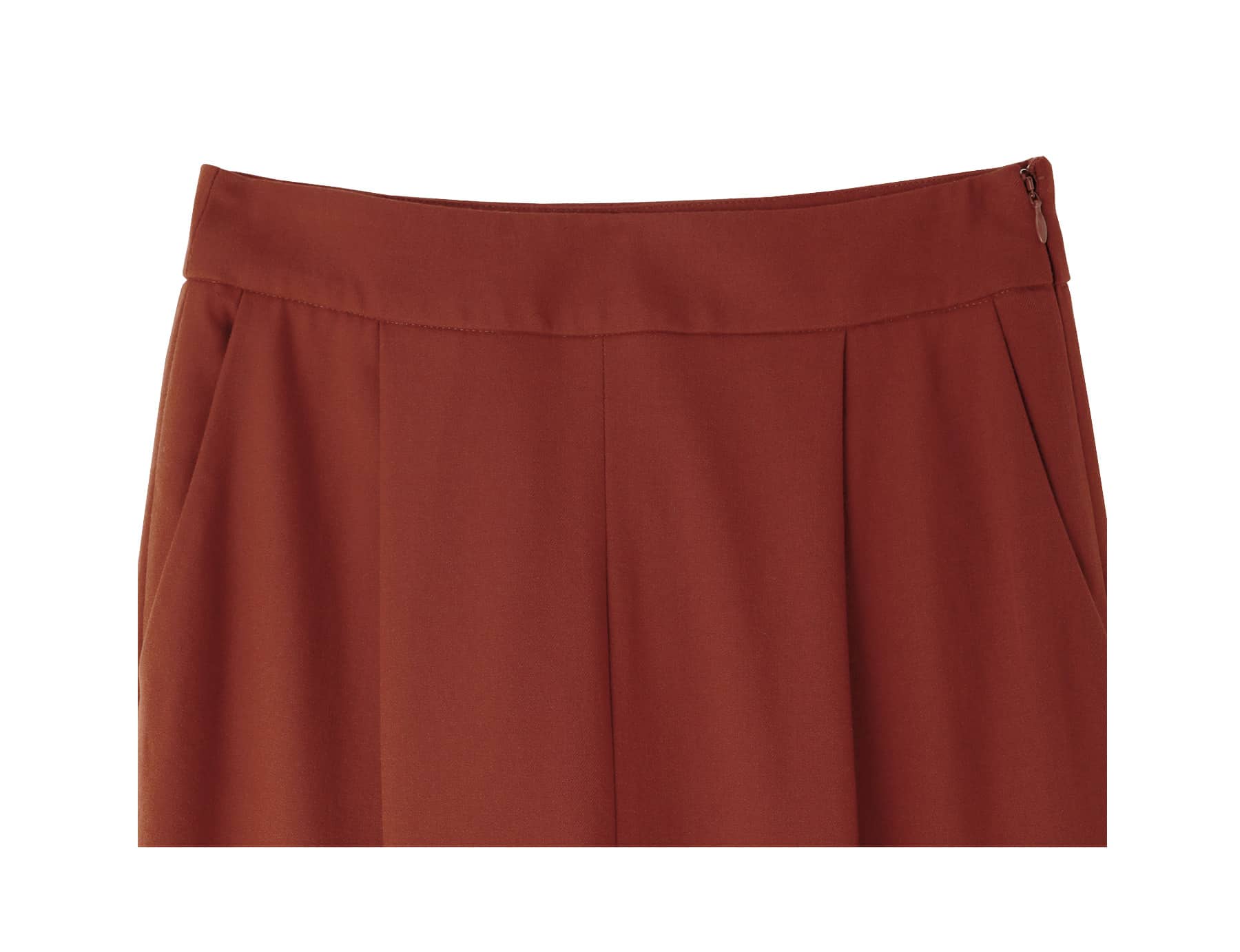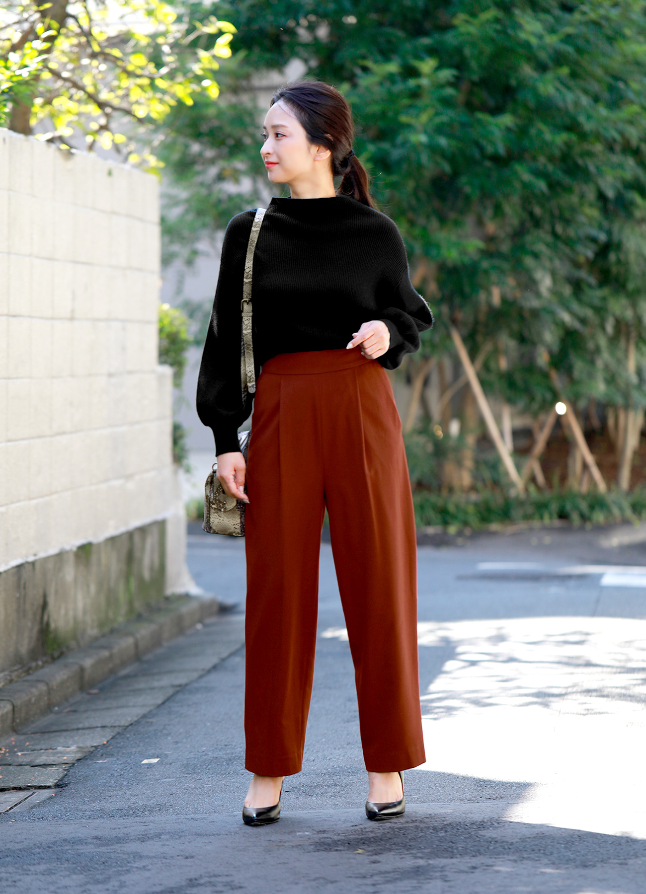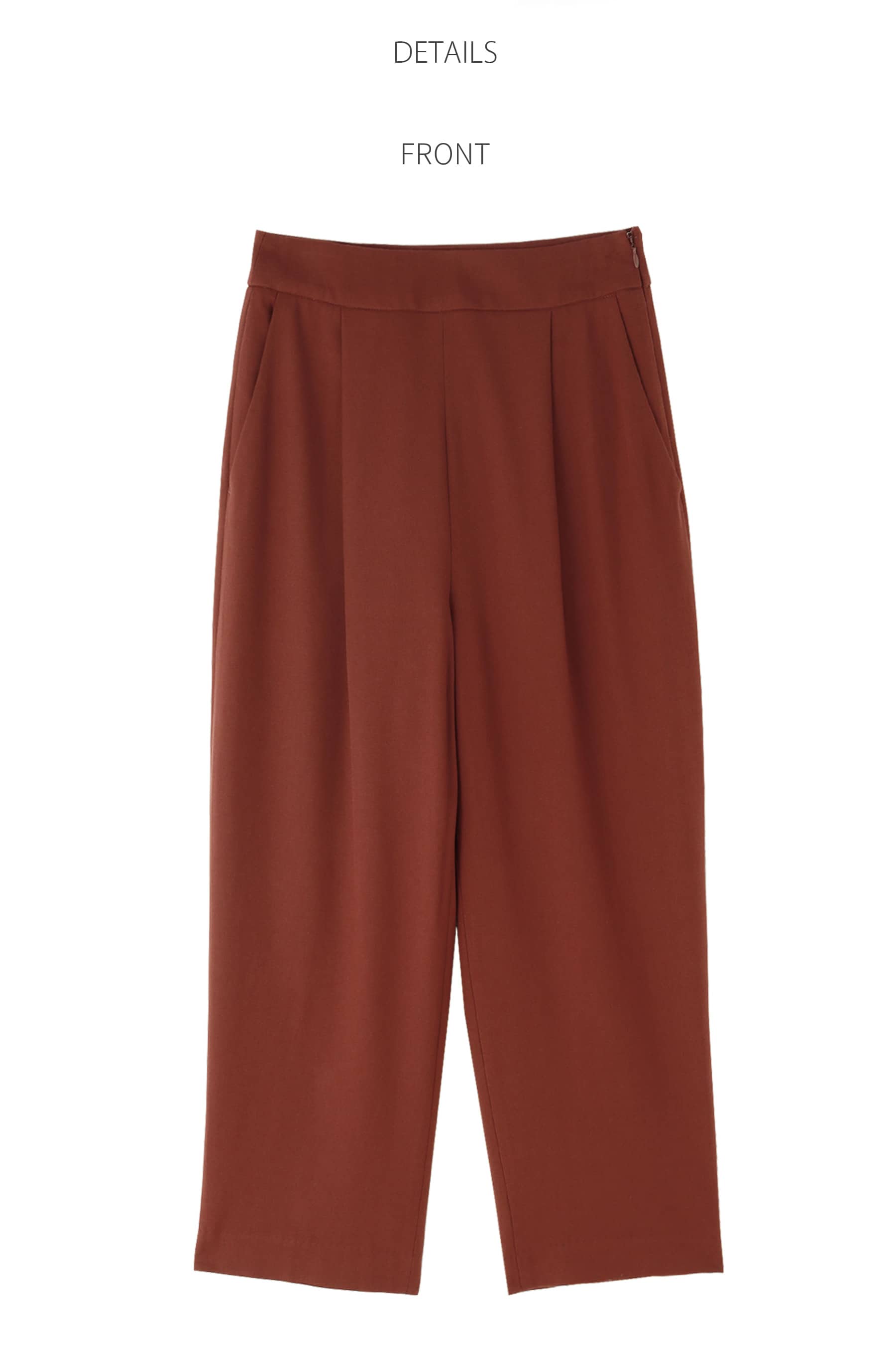 【このパンツの特徴】◆ゆったりとした脚幅を持つ、太いラインのテーパードパンツ◆フロントタック使いで立体感を出したデザイン◆甘さの無い雰囲気で、カッコ良いスタイリングが好きな方にも◎◆身長やお好みに合わせて選べる2種類の着丈サイズをご用意。ある程度の身長がある方が01サイズを選ぶと、くるぶし上程度の半端丈パンツとしても楽しむことができます。◆中にタイツを穿きやすいよう、裏地を付けています。◆左脇ファスナーあり◆ご自宅で手洗いが可能(※下記ご注意事項をご確認ください)【生地について】合繊で冬の質感を出した、ストレッチ入りの冬用生地を使用。ぶ厚さはありませんがしっかりとしており、冬に快適に穿ける暖かさがあります。生地自体はシンプルな定番系でスッキリとした印象。そのため存在感の強いトップスや、柄モノやミックスニット等と合わせることができる着回し力を持っています。※裏地はサラサラ・スベスベとした、タイツとの滑りの良さを考慮した生地が付いています。◆透け感:なし◆伸縮性:控えめにあり【お色について】◆テラコッタ:穿くだけでオシャレに見える、深みのあるオレンジ系ブラウン。◆ブラック:定番の通常ブラックです。【お手入れついて】※ご自宅で手洗いは可能ですが、質感の美しさや耐久性維持のためにはクリーニングがお薦めです。※オシャレ着であることを十分にご考慮の上、お手入れをお願いいたします。デリケート衣類用洗剤および柔軟剤の使用、色移り防止のため単独洗いがお薦めです。※濃いお色は、最初のうちは水に浸けると染料が多めに浮き出ますので、必ず単独洗いをしてください。※お湯、脱水機、乾燥機のご使用はお避けください。※仕上げやシワのお手入れにはスチーマーがお薦めです。※お洗濯やお手入れは自己責任でお願いいたします。お手入れにまつわるトラブルが生じましても、ご返品・ご交換・ご返金の対象外となりますので予めご了承くださいますようお願いいたします。仮に『書いてある通りにやった』ということでも、恐れ入りますがその事実確認が困難なことから保障はできかねます為、免責とさせていただきます。