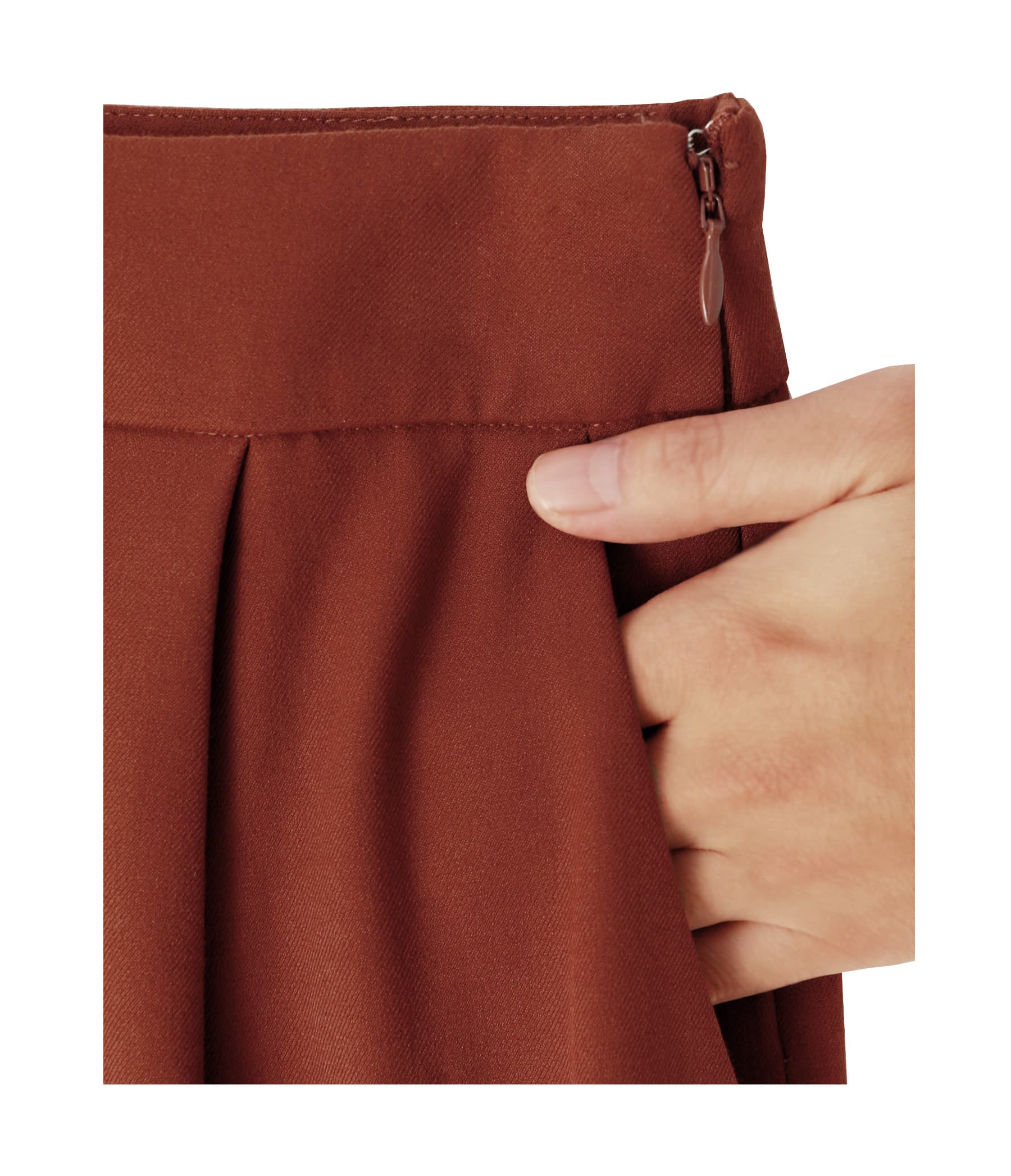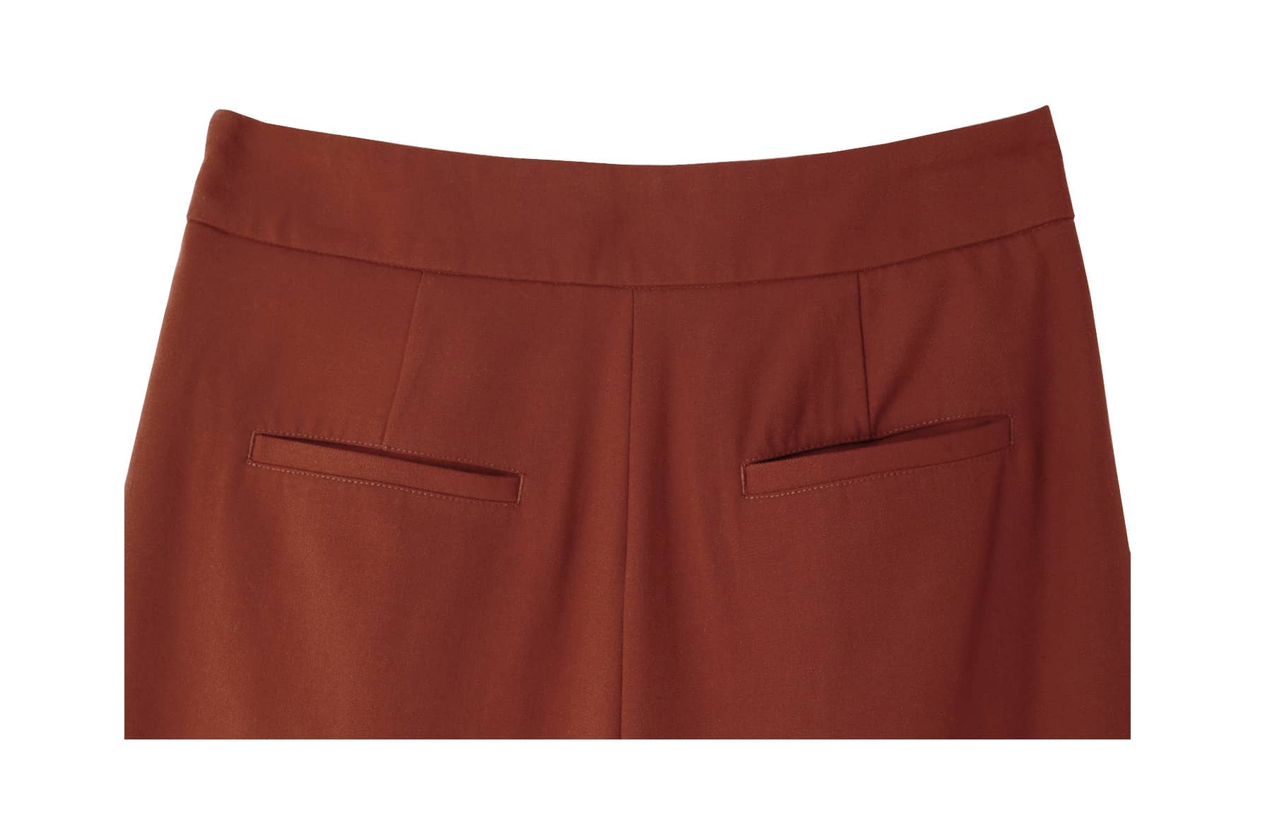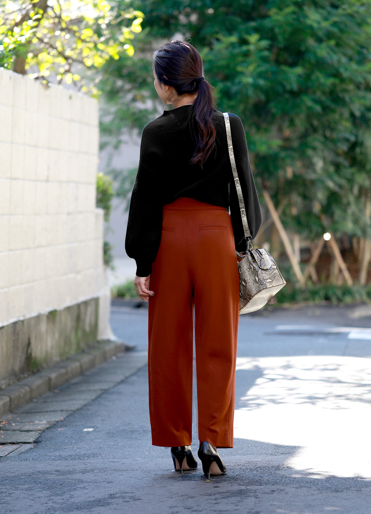 【このパンツの特徴】◆ゆったりとした脚幅を持つ、太いラインのテーパードパンツ◆フロントタック使いで立体感を出したデザイン◆甘さの無い雰囲気で、カッコ良いスタイリングが好きな方にも◎◆身長やお好みに合わせて選べる2種類の着丈サイズをご用意。ある程度の身長がある方が01サイズを選ぶと、くるぶし上程度の半端丈パンツとしても楽しむことができます。◆中にタイツを穿きやすいよう、裏地を付けています。◆左脇ファスナーあり◆ご自宅で手洗いが可能(※下記ご注意事項をご確認ください)【生地について】合繊で冬の質感を出した、ストレッチ入りの冬用生地を使用。ぶ厚さはありませんがしっかりとしており、冬に快適に穿ける暖かさがあります。生地自体はシンプルな定番系でスッキリとした印象。そのため存在感の強いトップスや、柄モノやミックスニット等と合わせることができる着回し力を持っています。※裏地はサラサラ・スベスベとした、タイツとの滑りの良さを考慮した生地が付いています。◆透け感:なし◆伸縮性:控えめにあり【お色について】◆テラコッタ:穿くだけでオシャレに見える、深みのあるオレンジ系ブラウン。◆ブラック:定番の通常ブラックです。【お手入れついて】※ご自宅で手洗いは可能ですが、質感の美しさや耐久性維持のためにはクリーニングがお薦めです。※オシャレ着であることを十分にご考慮の上、お手入れをお願いいたします。デリケート衣類用洗剤および柔軟剤の使用、色移り防止のため単独洗いがお薦めです。※濃いお色は、最初のうちは水に浸けると染料が多めに浮き出ますので、必ず単独洗いをしてください。※お湯、脱水機、乾燥機のご使用はお避けください。※仕上げやシワのお手入れにはスチーマーがお薦めです。※お洗濯やお手入れは自己責任でお願いいたします。お手入れにまつわるトラブルが生じましても、ご返品・ご交換・ご返金の対象外となりますので予めご了承くださいますようお願いいたします。仮に『書いてある通りにやった』ということでも、恐れ入りますがその事実確認が困難なことから保障はできかねます為、免責とさせていただきます。