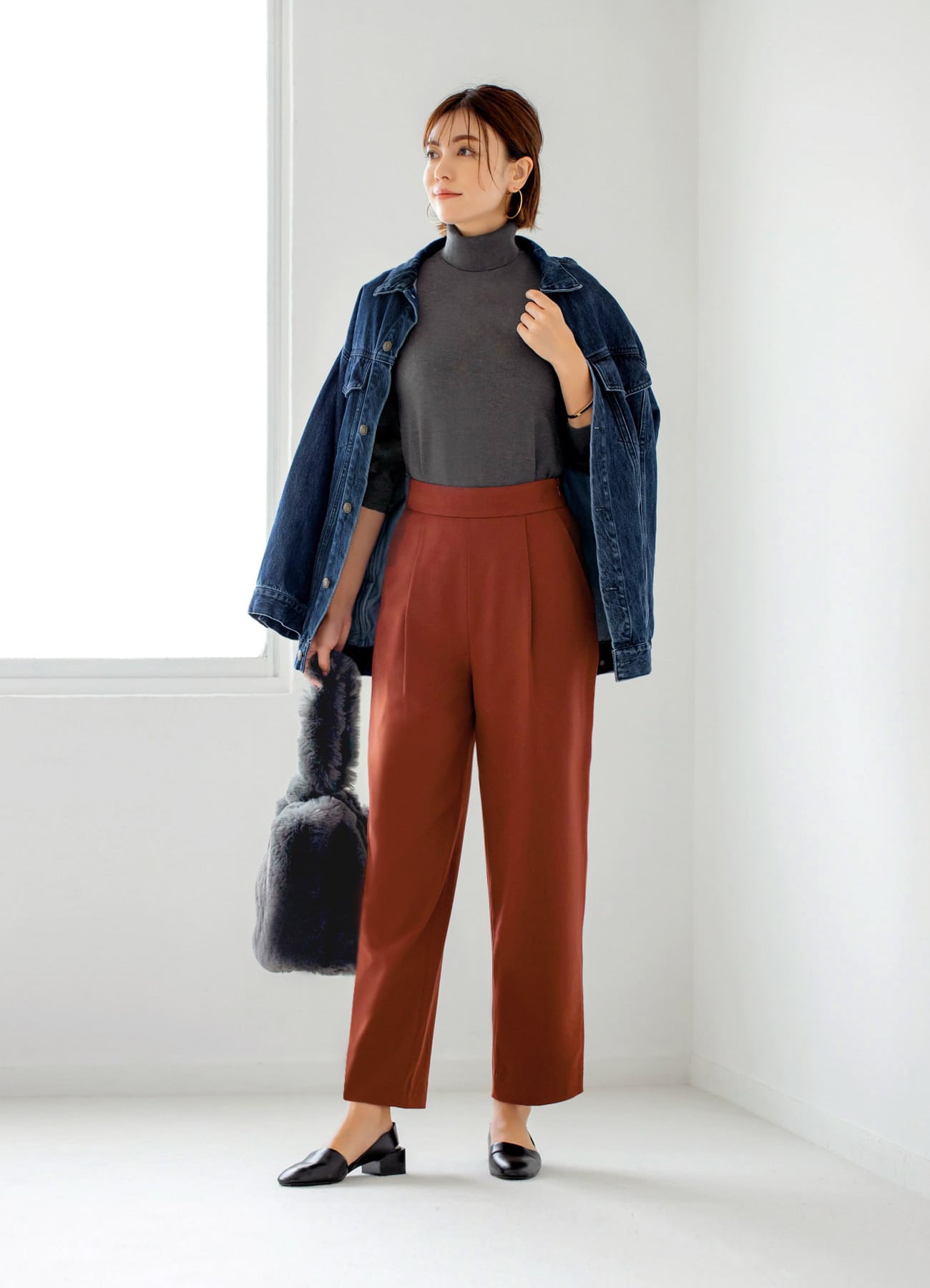 クールなキレイめカジュアルに。太めシルエットが今っぽい、冬用テーパードパンツゆとりをたっぷりと持たせた太めシルエットが、今っぽくてオシャレなテーパードパンツ。ワイドパンツ感覚で穿ける、脚の太さを気にせずにトライできるゆったりとしたパンツです。冬用スーツにも使用されるような暖かさがありつつ、スッキリとした表面感がスタイリッシュな印象の生地を使用。単色カラーで柄モノやミックス生地などとも似合う着回し力の高さがあり、カジュアルからキレイめカジュアルに対応します。(※そこまできちんと感のあるデザインではありませんが、服装が自由めな職場であればお仕事にもOK。という感じのパンツです)