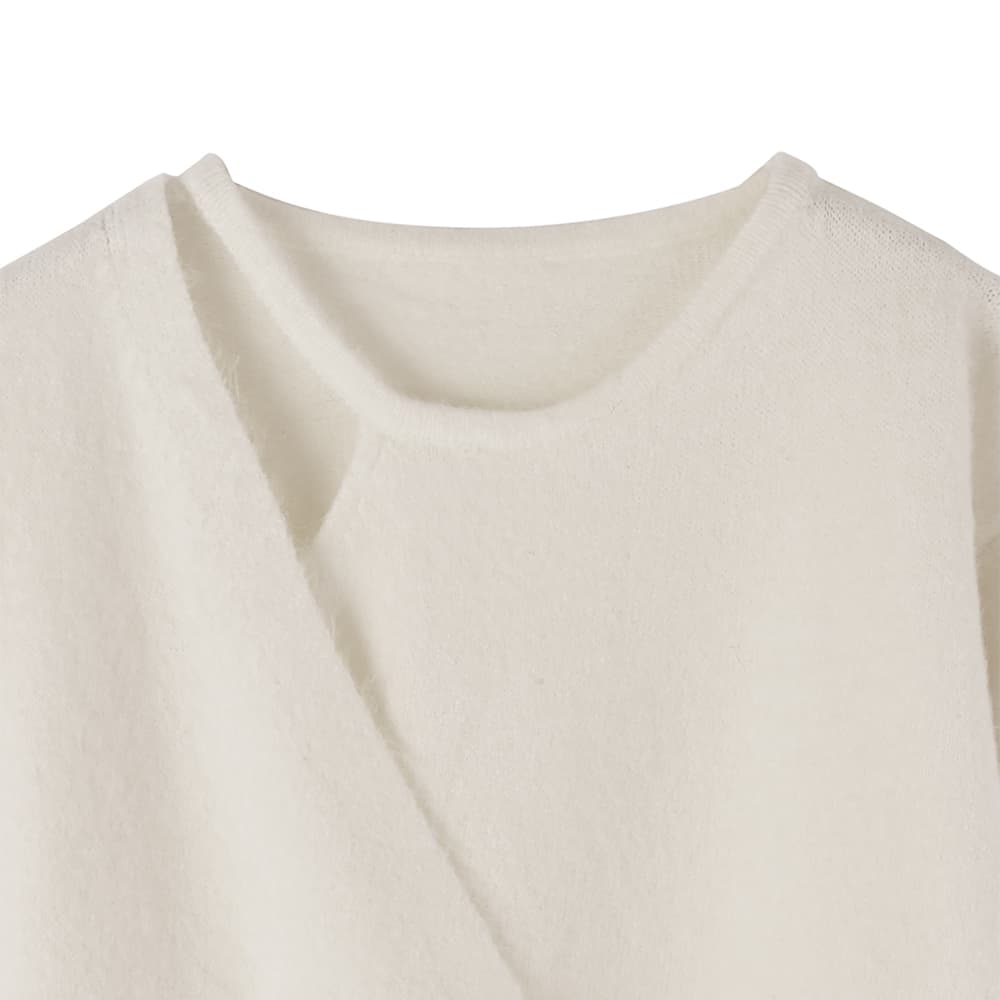 ニットだったら挑戦できちゃう!旬なアシンメトリーデザイントップス◆10/17インスタライブご紹介商品◆ここ最近よく見かける、部分的に空間を効かせたアシンメトリーデザイントップス。旬なデザインなので着るだけで今っぽい雰囲気になり、手持ちボトムスをブラッシュUPさせるのにも役立ちます。こういったデザインはカットソーでもよく見かけますが、その場合は身体に割とフィットすることが多いため、背中のお肉や胸下のお肉、二の腕が気になる大人にはちょっと緊張があるかも…という心配も。それに対してニットの場合は身体へのフィット性がほとんど無いため、大人に優しい着心地ということで気負いなくトライすることができます。◆ピッタリとしないジャストサイズフォルム。適度なゆとりがあります。◆ほど良く開いたクルーネック。鎖骨が見える程度に開いており、詰まった感じになりません。◆裾はインしない前提のデザインなので、裾インが苦手な方にもお薦め。スカートにもパンツにも似合います。◆左裾をボタン3個で留めたカシュクールデザインベース。ボタンは外せますが、開けて着ることはできないので外す機会はあまり無いかな…という飾りとしてのボタンです。◆開きは下着の見えない位置にあるため、下着は普通に着けて大丈夫です。◆中に防寒インナーを着たい場合は、デコルテの開きが深いものを選べばOK。もしくは色をある程度考えて、敢えてコーディネートのように見せるのもアリです。【生地について】◆チクチク感のない、もっちり&ほんわり質感です。◆ハイゲージニットの中ではやや厚手でしっかり感あり。暖かさのある着心地で、冬っぽい質感。3月上旬頃まで使えるイメージです。◆毛羽立ちやすい生地ではありませんが、摩擦や静電気が強いとできる可能性もあります。ピリングができた場合は毛玉取りクリーナーでご対処ください。【お知らせ事項】撮影サンプルは仮ボタンですが、お届けするものには正しいものが付いています。【商品の特徴】◆着用時期:秋冬メイン◆サイズ感:適度なゆとりのあるサイズ感◆丈感:下腹が隠れる程度の丈感◆シルエット:様々なボトムに合わせやすいシルエット◆首元のデザイン:カシュクールデザイン◆厚み:厚すぎず、薄すぎない生地厚◆柔らかさ:柔らかい◆着用ジワ:できにくい◆毛羽立ち:摩擦の集中と着用頻度により、たまにおきることがあります(できた場合は毛玉取りクリーナー等でご対処ください)◆伸縮性:あり◆光沢感:なし◆透け感:なし◆ボタン:フロント下腹部にあり◆ファスナー:なし◆ポケット:なし◆裏地:なし◆手洗い:可能◆アイロン:不可【お色について】◆ブラック:通常の定番ブラックです。【SNS用ハッシュタグ】#235542片側ホルターカシュクールニットトップス(このハッシュタグでInstagramなどSNS内で検索をしますと、こちらをお持ちのお客様のご投稿があれば、簡単に見つけてご覧いただくことができます)