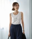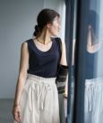 長らくお待たせいたしました!待望の日本製タンクトップの新作モデルが、長い時間をかけてついに出来上がりました◆5/29インスタライブご紹介商品◆アーカイブのご視聴はこちらから→【5/29夜ライブ】長年ご好評をいただいてきた日本製タンクトップの生地廃盤に伴い、今年は生地と一緒にデザインもリニューアル。バインダー(襟ぐりの縁取りをしているカーブ形状の生地部分)が太い最近のトレンド要素を取り入れて、今っぽい雰囲気のデザインにしました。そして今回は今まで同様のリブ生地タイプに加えて、こちらのフライス生地タイプもご用意。お好みに合わせて選べる選択肢が広がりました。どれも同じように見えて、かなり印象に差が出るのがタンクトップというアイテム。こだわりの詰まった旬な雰囲気と、日本製ならではの着心地をぜひお楽しみください。◆デザインのこだわりバインダー使いをワキぐり(アームホールの端処理)にも取り入れ、程よくデザイン性のあるタンクトップに仕上げました。その太さや角度にもミリ単位でこだわり、ベストなバランスを追求。日本製生地ならではの上品さがあるため、トータル的な印象としてカジュアルになり過ぎないところもポイントです。下に着けたブラジャー等の下着が、肩やワキぐりから見えにくいように設計してあります。◆フライス生地とは通常はTシャツの首元などに使うことが多い、カットソーの中でもさらなる伸縮性と耐久性に優れた編み方によるカットソー生地の一種。適度にしっかりとしていて・動きに対する柔軟な対応力があり、カットソーというよりはニットに近い編み方というか伸び方というか…をお手元でビヨビヨ伸ばすと感じていただけると思います。フラットな表面感のタンクトップを作るにあたり、この生地の特性があれば身体にペッタリとはり付かず、肉感を程よくカバーできるから良いだろうな、と考えて採用いたしました。◆襟ぐりの開き加減鎖骨下6-7cm程度まで開くタイプの、デコルテが見える開き加減。胸の谷間からは3cm以上離れて襟ぐりが位置するため過剰な露出感は無く、現実的に使いやすい開き加減になっています。※寸法は普通体型を基準に測定した目安です。◆ワキの開き加減ブラジャーが隠せる程度の開き加減にしていますが、リブ生地タイプよりは少し広めです。また、ワキ肉が見えにくいように角度を設計していますので、気にならずにご着用いただけると思います。フライス生地は身体にピッタリとはフィットしないので、ご体型によっては多少見えたりもするかもしれませんが、気になるほどではないと思います。何か(例:シャツやカーディガンなど)の中に着るのであればなおさら問題はありません。◆背面の開き加減肩から6-7cm程度下の一般的な開き加減。とくにハイバックでもなく、広く開いている感じでもない、使いやすいタイプです。◆生地の特徴リブ生地と言うのは凹凸があることで『じゃばら』のようによく伸びますが、フラットなのにそれと同じような可動域を持つのがフライスの特徴です。例えばピチピチとしたサイズ感のトップスを着た際、カットソー素材よりもニット素材の方が締め付け感が緩いものですが、フライスはその感覚に近いものがあります。どこかニット寄りな伸び方をするため、しっかりとしているのに身体から浮いている感じというか、独特のユルさで締め付け感のないラクな着心地を叶えてくれます。・見た目や肌触りは普通のカットソー(またはしっかとしたTシャツ)生地という感じですが、上記のように独特な着心地を持っています。・生地はしっかりとしていますが硬い感じではなく、身体にフィットし過ぎず、なんか微妙にいつも肌から浮いているようなリラックス感があります(フィット感はリブ生地の方が強いです)。・触感が柔らかい感じではないものの、動きは柔らかいという複雑な質感。しっかりとはしていますが厚ぼったさは無く、ウエストに裾インしたり・重ね着したりの普段使い全般に支障はありません。◆同時発売/リブ生地タイプとの差・表面感:リブ生地が縦方向の凹凸を持つのに対し、フライス生地は完全にフラットです。・サイズ感:生地の質に合わせて微妙な寸法調節はしていますが、着た時のサイズ感は同じような感じです。アームホールのフィット感(狭さ)はリブ生地の方が上で、フライスの方がゆとりがあります(生地の特性によるものです)。・厚み:フライス生地の方が厚み自体は少し上ですが、代わりにリブ生地には凹凸があるため、結果として着たときの安心感は同じような感じになります。・選び方:リブ生地ではないタンクトップが欲しいというときにフライスを選ぶような感じです(※例えばリブ編みのカーディガンのインナーにリブ編みのタンクトップだとしつこいな、というようなとき)。ほか、単純に見た目的なお好みだったり、リブ生地のタンクトップは持っているからフラットな生地のものを買っておこうかな、と