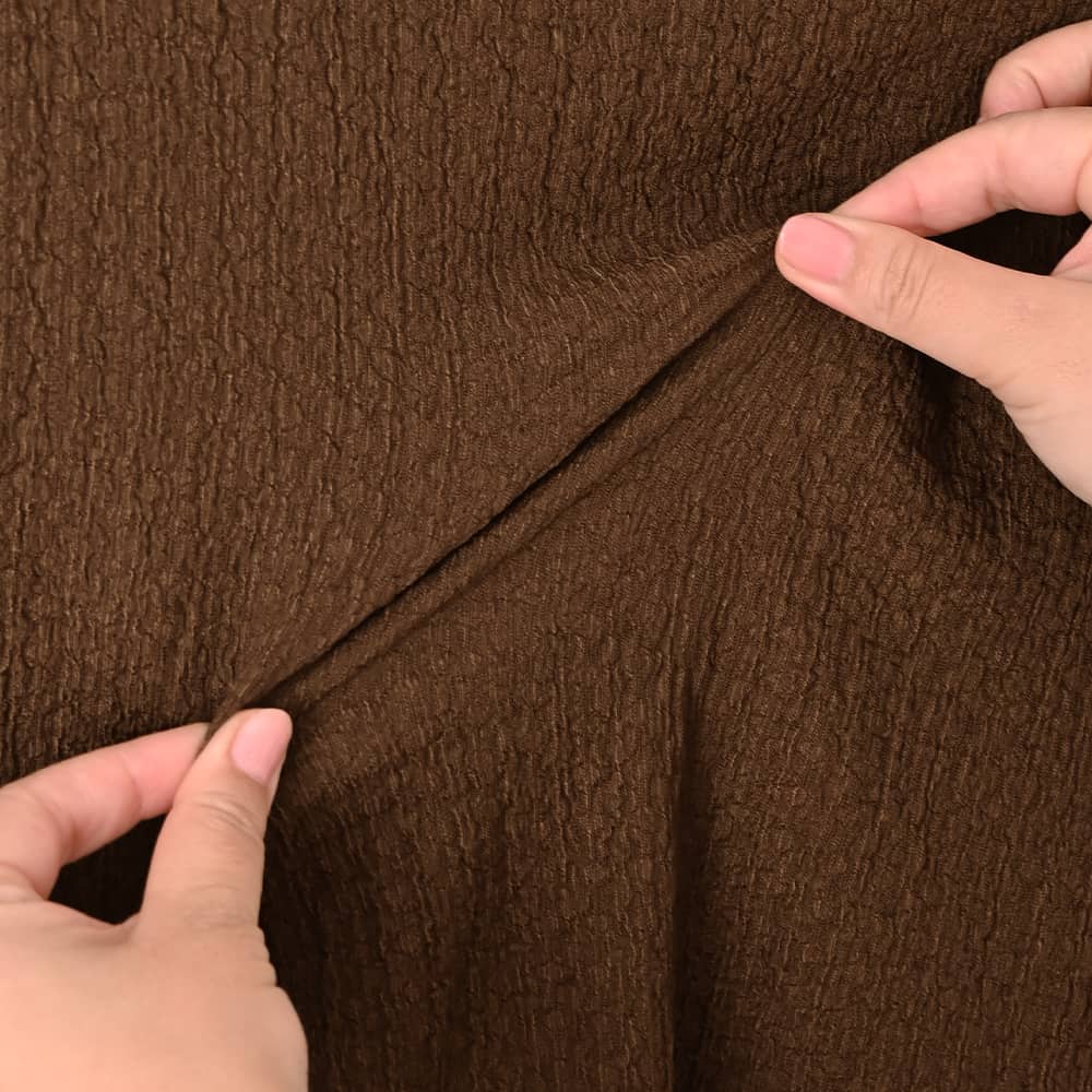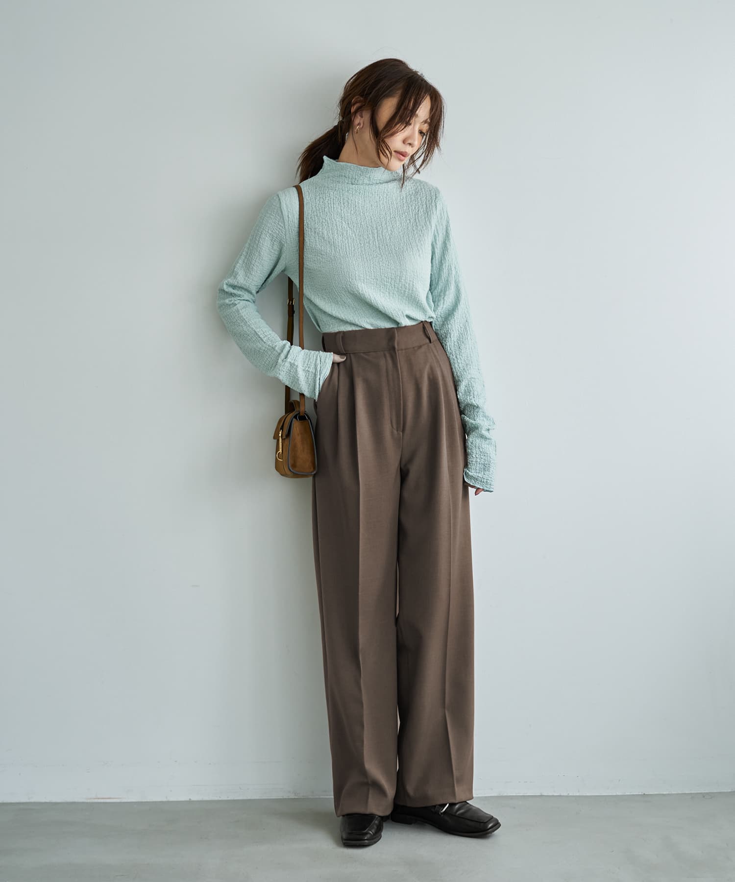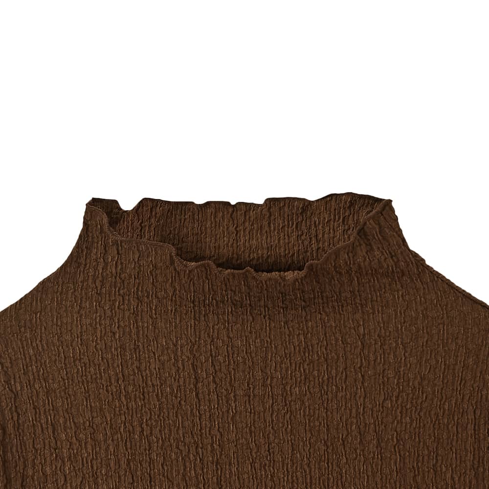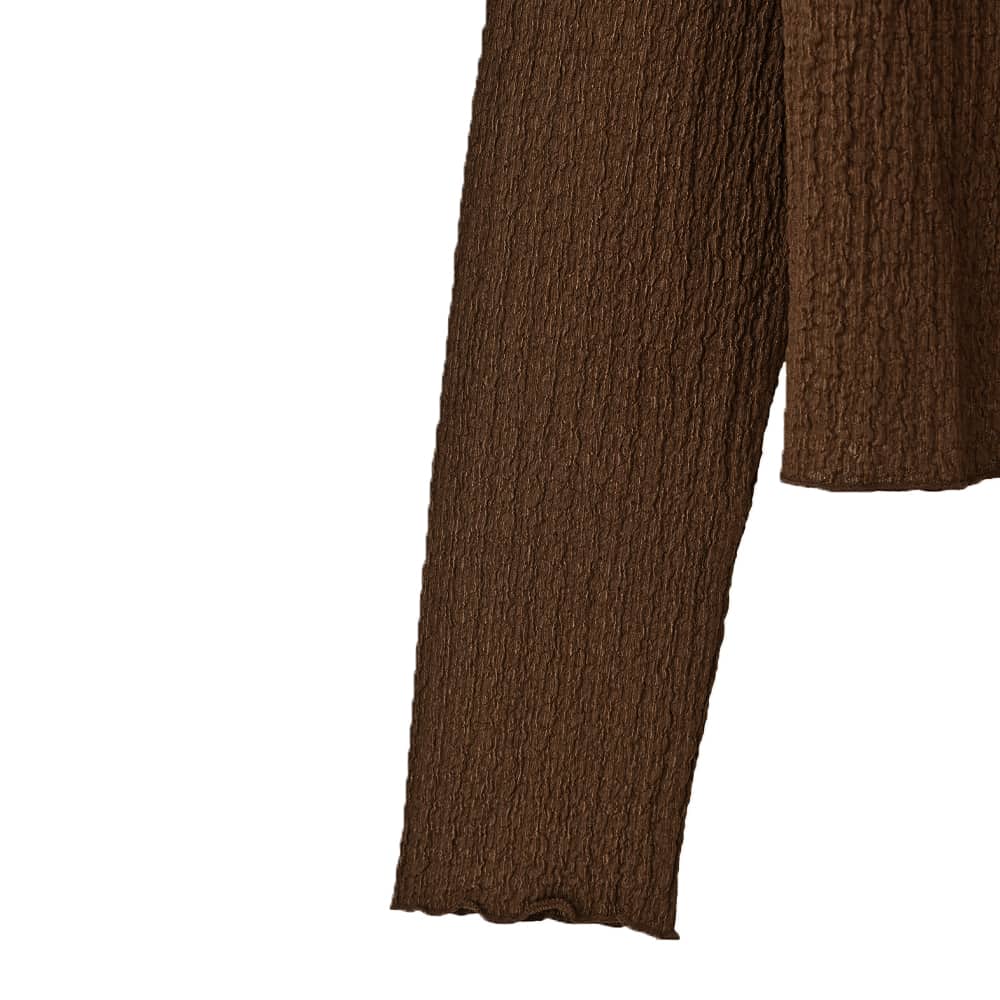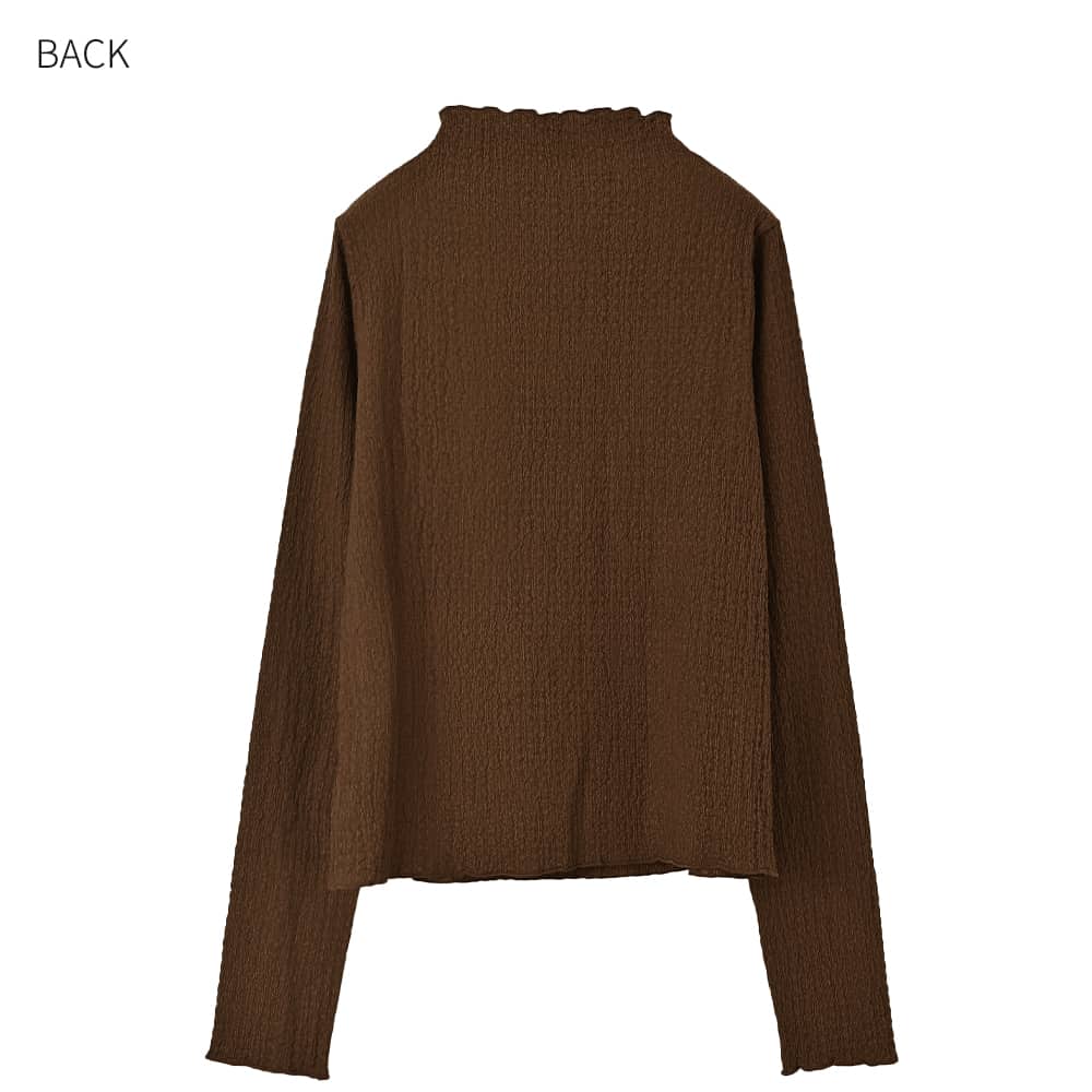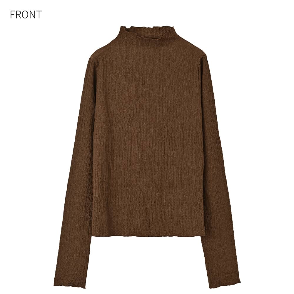 【こんなインナーを待ってました!】ゆったりとしているインナーって新鮮裾出しで重ね着ができる画期的フォルム凹凸がオシャレな表面加工生地トップス◆10/16インスタライブご紹介商品◆アーカイブのご視聴はこちらから→【10/16ライブ】【この商品の特徴】◆トップス&インナーの両用で使えるアイテム◆クシュクシュとした凹凸質感のある生地◆ゆったりとしたサイズ感◆腹部にフィットしない裾のフォルム◆全体的によく伸びる素材◆長い袖丈◆高さの無い、首が見えるハイネック◆構造としてはボトルネック◆薄手の割にけっこう暖かい◆これの下に防寒インナーを着用も可能◆とても軽くすぐに乾く◆サラッとした肌離れの良い質感◆洗えてシワにならずアイロン不要【この商品の詳細】◆凹凸のあるクシュクシュとした表面感がカワイイ、ボトルネックのカットソートップス。これをトップスとして主役にできる安心感がありつつ、何かの下に着ることもできる生地厚になっています(=インナーとしても活躍)。◆インナー系トップスとしてはシルエットにゆとりがあり、身体にピッタリとしないところが大きな特徴。お腹周りもゆったりとしているため、ボトムスに裾を入れずに着用する際もウエスト周りがボコボコせず、キレイにかぶせることができます。◆袖丈や丈感が長めなところもこのトップスのポイント。例えば袖丈が短めなトップスやジャケットなどの袖口から袖を見せる重ね着をしたり、ベストやビスチェの裾からこのトップスの裾を見せたり…といったレイヤードスタイルが楽しめます。※10/16のインスタライブで実演しておりますので、アーカイブ動画をご覧ください。◆これらの特徴により、既存のインナー系トップスではできなかった着こなしが作れるところが大きな魅力。従来のものは身体にフィットするのが基本なので裾出しレイヤードなどにはあまり活用できませんが、これはシャツのように裾を使用した着こなしができるのが画期的です。◆このゆったり感があることで、中にヒートテックなどの防寒インナーを仕込める点も優秀。冬に薄手の服は脇役にまわりがちですが、これ自体が意外に暖かさがあることに加えて防寒インナーも仕込めるため、冬もトップスとして主役にすることが可能です。【こんなものと重ねます】ニットなどのプルオーバー系、ジャケット系、カーディガン系、シャツ系、ベストやジレやビスチェ、サロペットやジャンパースカート、デザインによってはワンピースなど。【さらにプラス情報】◆暖かさ:やや厚手のシャツやしっかり生地の長袖Tシャツと同じ程度。薄手の長袖Tシャツやシアー系シャツなどよりはぜんぜん暖かいです。◆伸縮性:生地全体がとてもよく伸びます。◆首元:ハイネックになるボトルネックです。ボトルネック(=首元に切り替えが無く、ボディから一体続きでハイネックになっているもの)の特徴として鎖骨位置で生地が溜まり(あるいはたるみ)ますが、それが普通の状態です。◆端処理:パイピング処理でメロウ状になっています。表面の凹凸に合わせて、自然にフリルのような動きが出ていてカワイイです。◆袖丈:伸ばすと指先まで隠れるほどの長さがあります。手首位置にクシュクシュと生地を溜めて、作業しやすい袖丈に調節することもできます。たくし上げも可能です。◆ボトムス:丈がきもち長めなので、裾出しの場合はパンツがお薦め。裾をインすればスカートにもOKです。◆シワ:シワはまったくできません。たたみで保管しても大丈夫です。◆静電気:とくに発生しやすい生地ではありませんが、その方の帯電体質具合や合わせアイテムなどに加え、冬場は乾燥でどうしても…というところはありますので、もしも気になる場合はエレガードなどの静電気防止スプレー等でご対処ください。ペチコート類を入れるのも脚へのはり付き防止に有効です。【その他の仕様などの情報】◆着用時期:10-4月が目安◆サイズ感:ゆとりのあるサイズ感(Lサイズ体型にも対応)◆丈感:前は太ももにかかる丈感/背面はヒップがギリギリ隠れるくらいの長さ◆シルエット:ストレート◆肩幅:問わないタイプ(よく伸びるため)◆アームホール:普通(とくに狭くも広くもない一般的な開き加減)◆袖幅:やや広め◆厚み:やや薄手-普通◆柔らかさ:柔らかさの中にハリ感が共存◆肌触り:サラッとして肌離れが良い◆着用ジワ:できない◆毛羽立ち:できにくい◆伸縮性:あり◆光沢感:なし◆透け感:ブラウン以外は僅かにあり(さほど気にならない程度=ホワイトに黒など、目立つ色のキャミを着ればなんとなくわかる感じ/ベージュにするとわからない)◆スリット:両サイドにあり◆ボタンやファスナー:なし(かぶり着タイプ)◆手洗い:可能◆裾上げ:お直しに出していただけます◆アイロン:不要◆スチーマー:使用OK【お色について】◆ブラウン:赤味系ではなく、少しオレンジ味とイエロー味が入った明るめのブラウン。いつもは茶色で顔がくすむタイプのイエベさんにも似