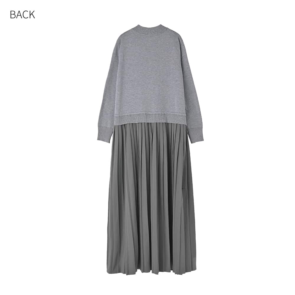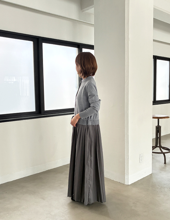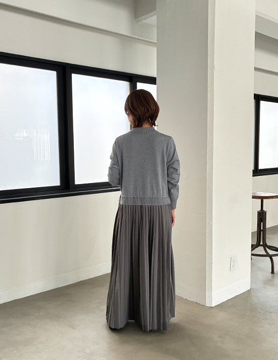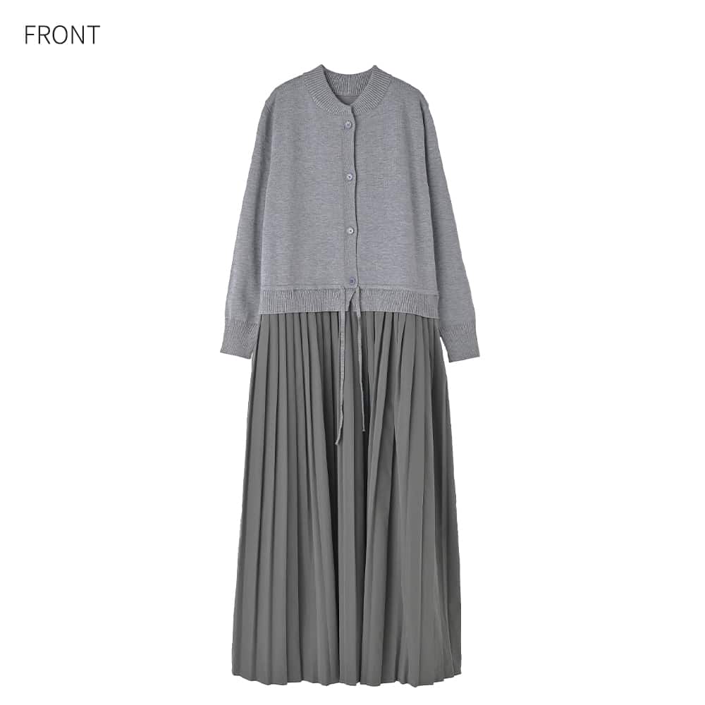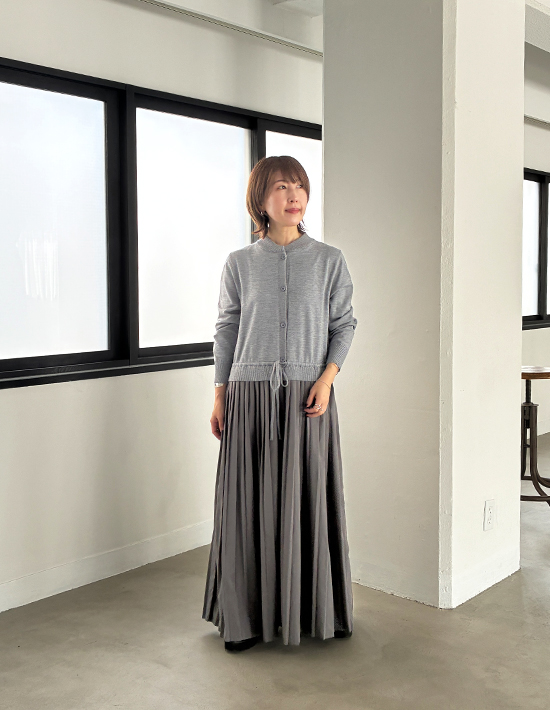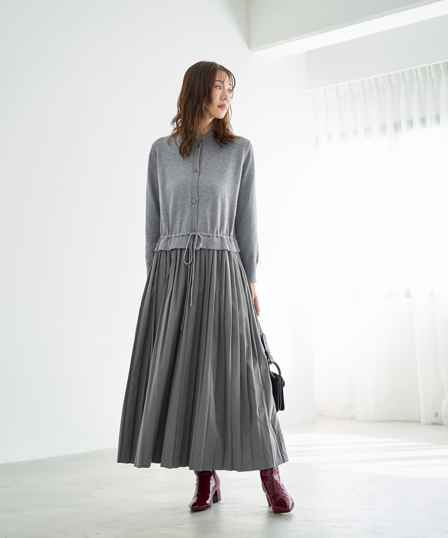 上はニット、下がプリーツスカートになっているロング丈のワンピース。前はボタン開きだったり、ウエストマークができる紐が付いていたりと、自分に似合う着こなしのバランスがとりやすいデザインになっています。