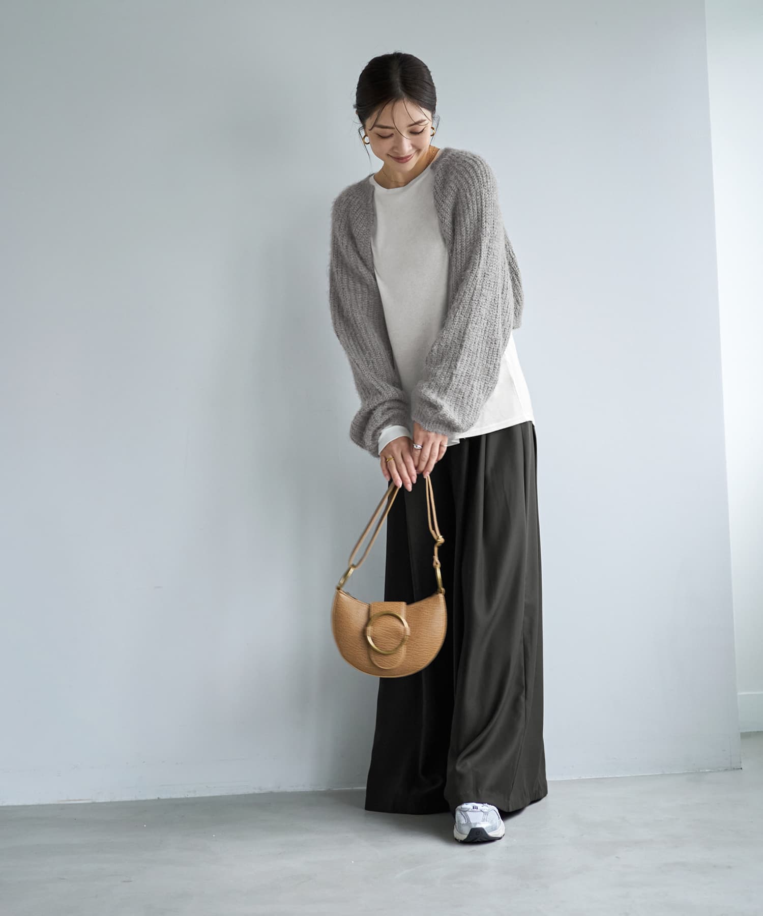 ◆ショート丈なので流行りのワイドパンツと相性が良く、その他フレアスカートやウエスト切り替えデザインのワンピース、サロペットやジャンパースカートなどとも好相性。このトップス(またはお洋服)だと少し寒いなぁ、というときにプラスして暖かさを得たり、上半身に視線を持っていきたいときなどに活躍します。